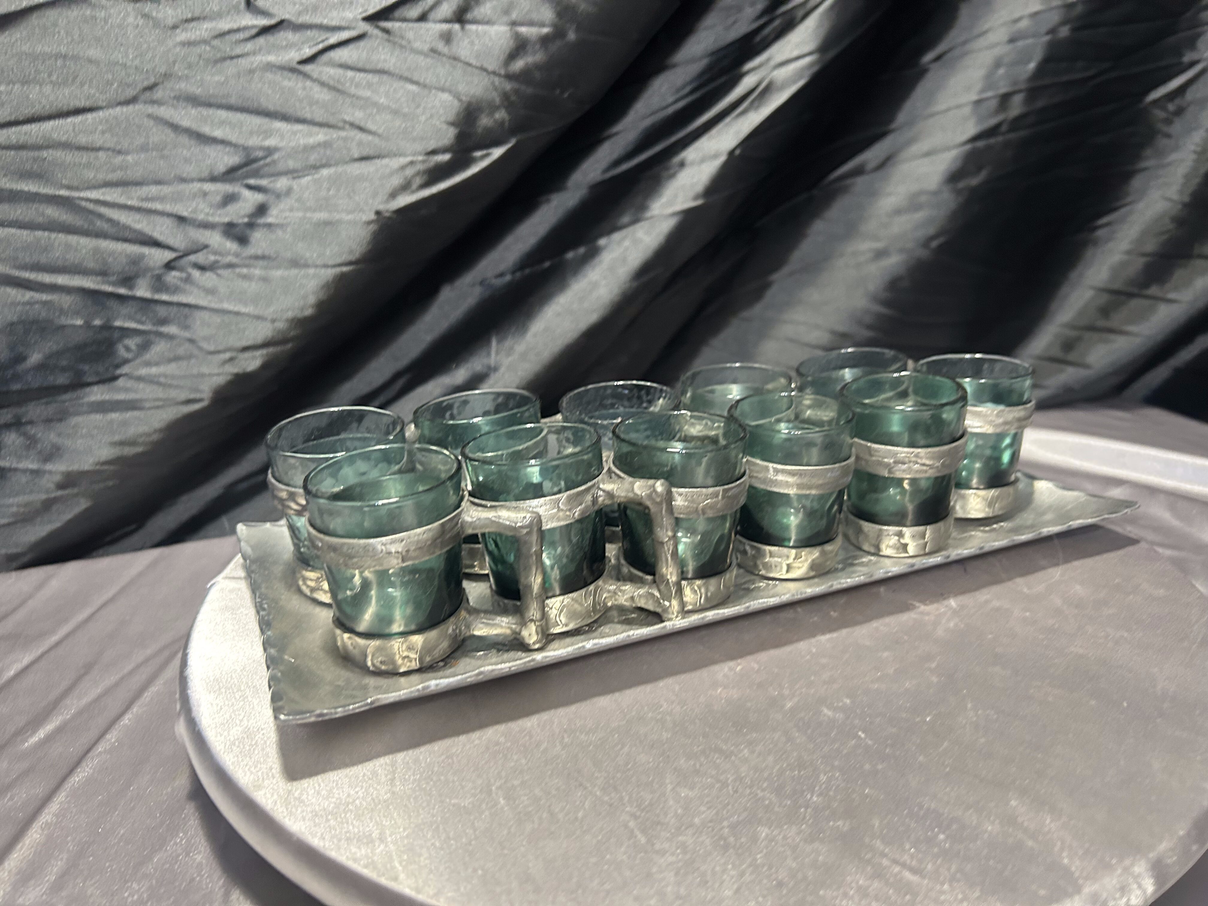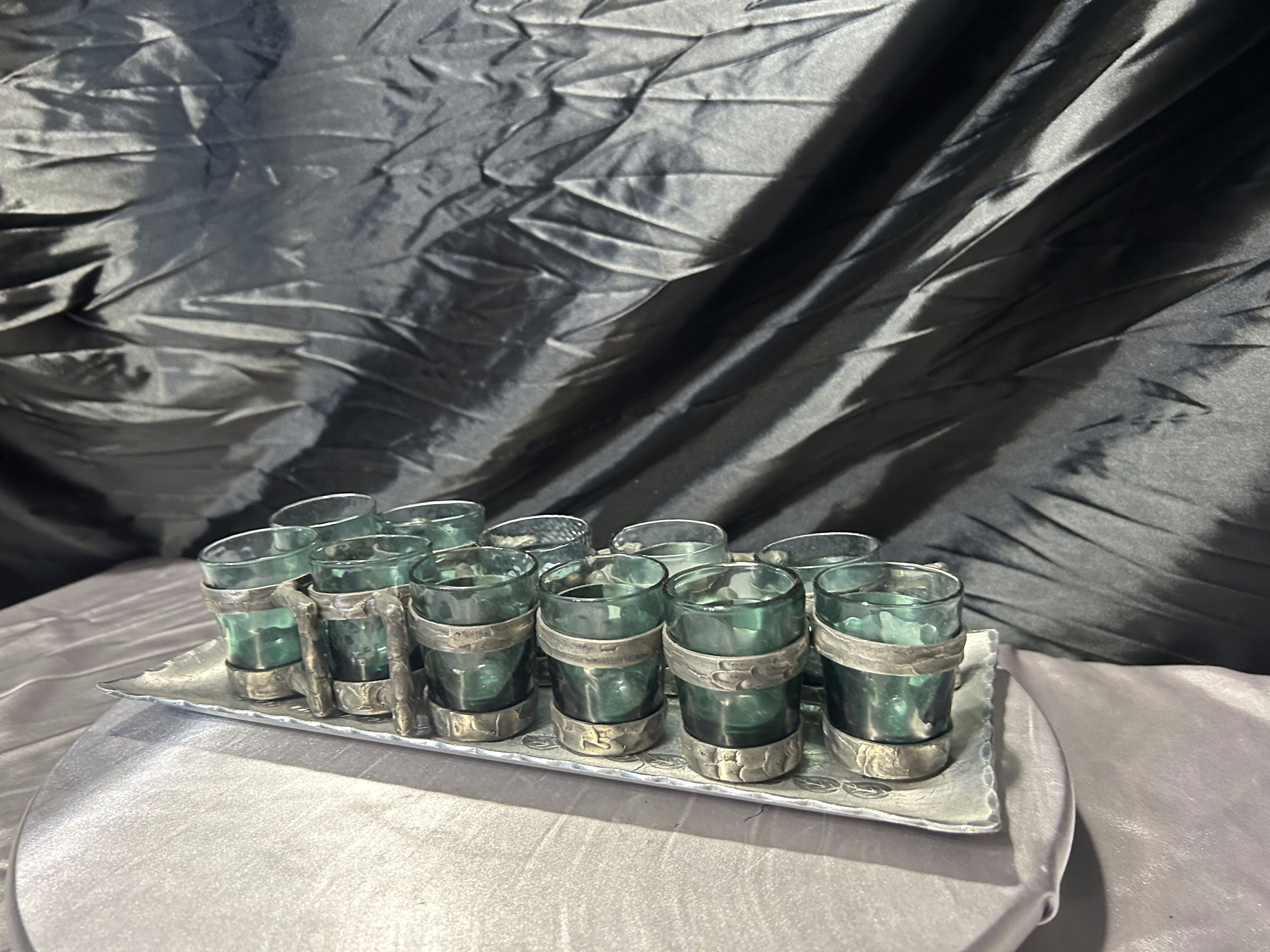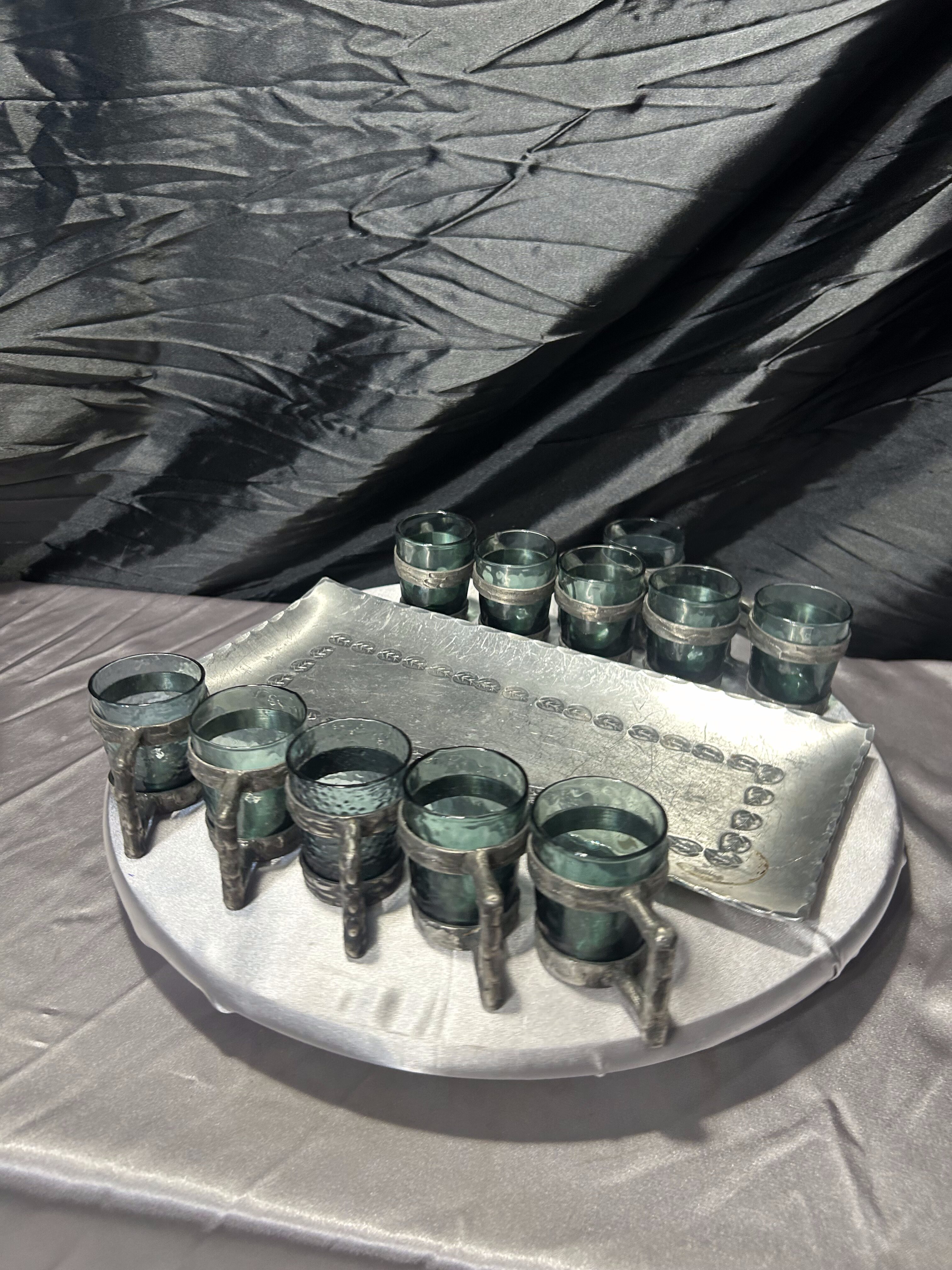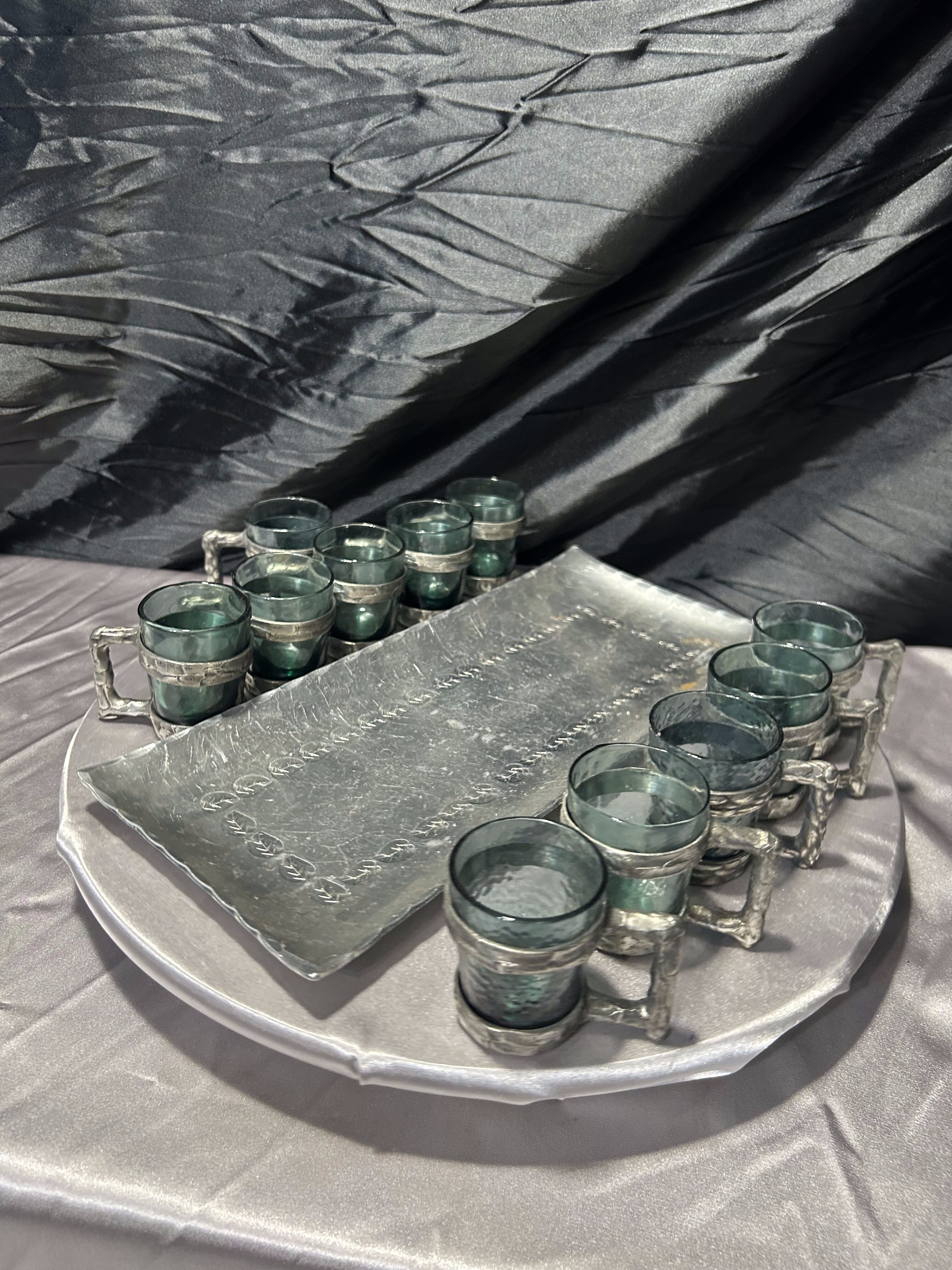 Zestaw 10 kieliszków w cynowych oprawach z tacą – sygnowany komplet