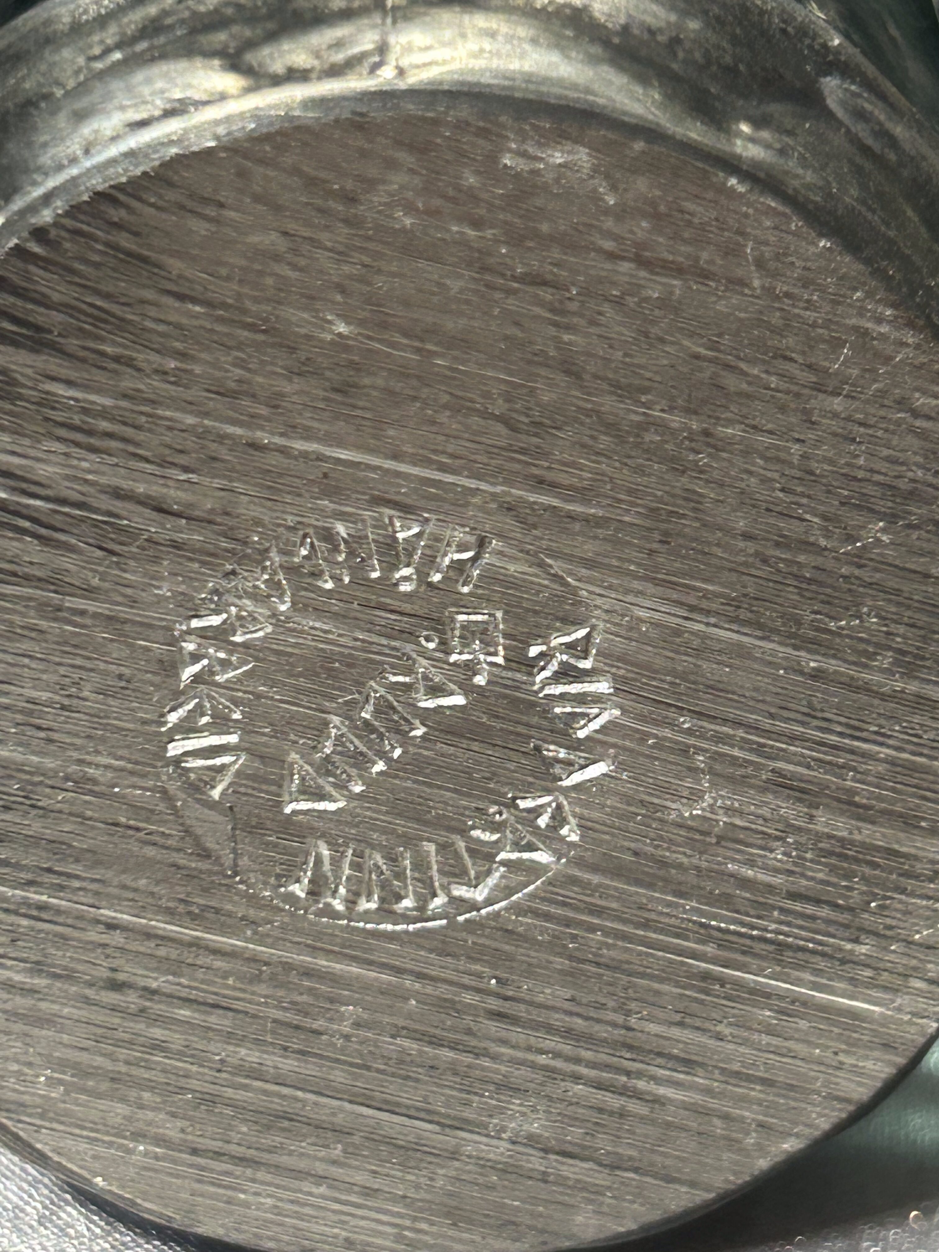 Oprawy kieliszków są sygnowane, co potwierdza ich ręczne wykonanie przez rzemieślniczą wytwórnię specjalizującą się w tradycyjnych wyrobach cynowych. Oprawy mają formę stylizowanych nóżek oplatających szkło, co nadaje całości unikatowy, niemal skandynawsko-średniowieczny charakter.
