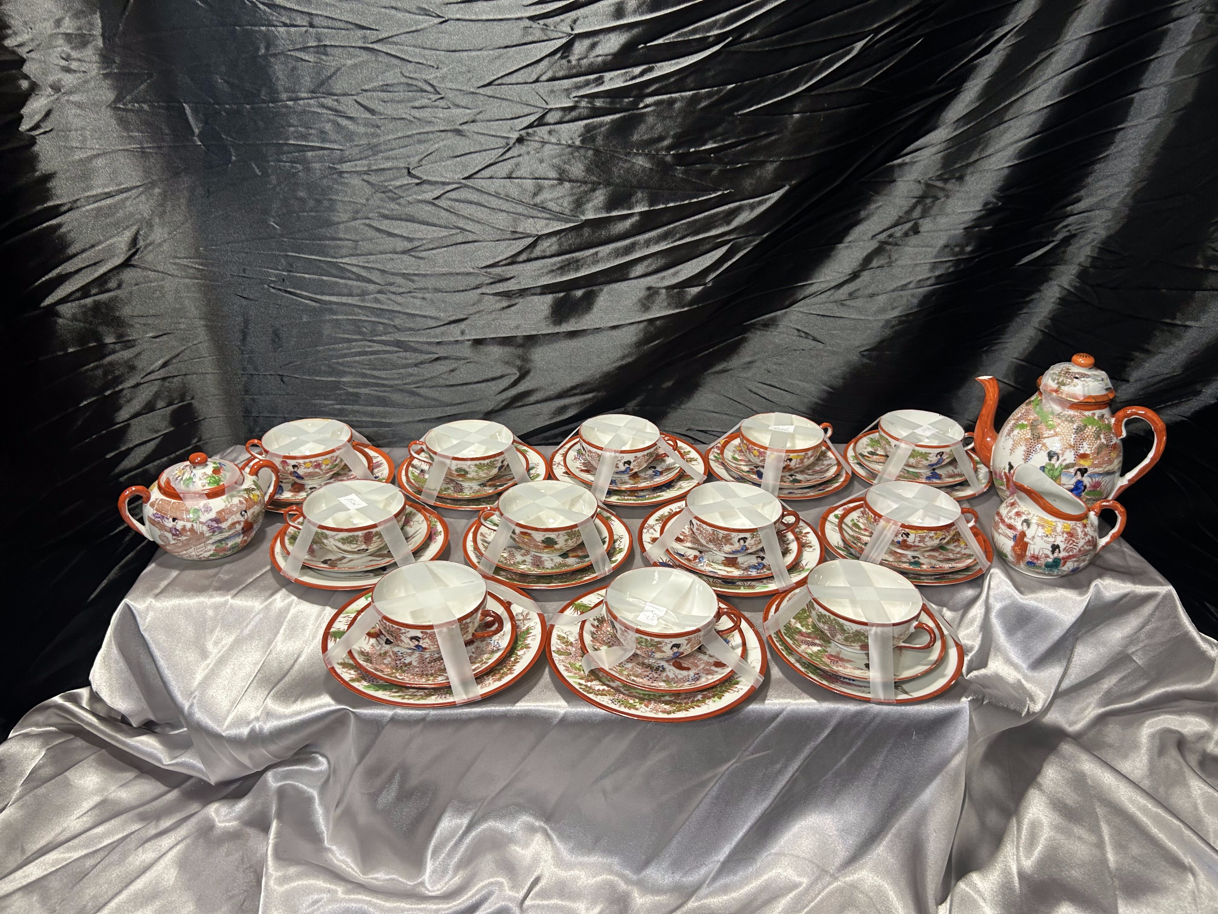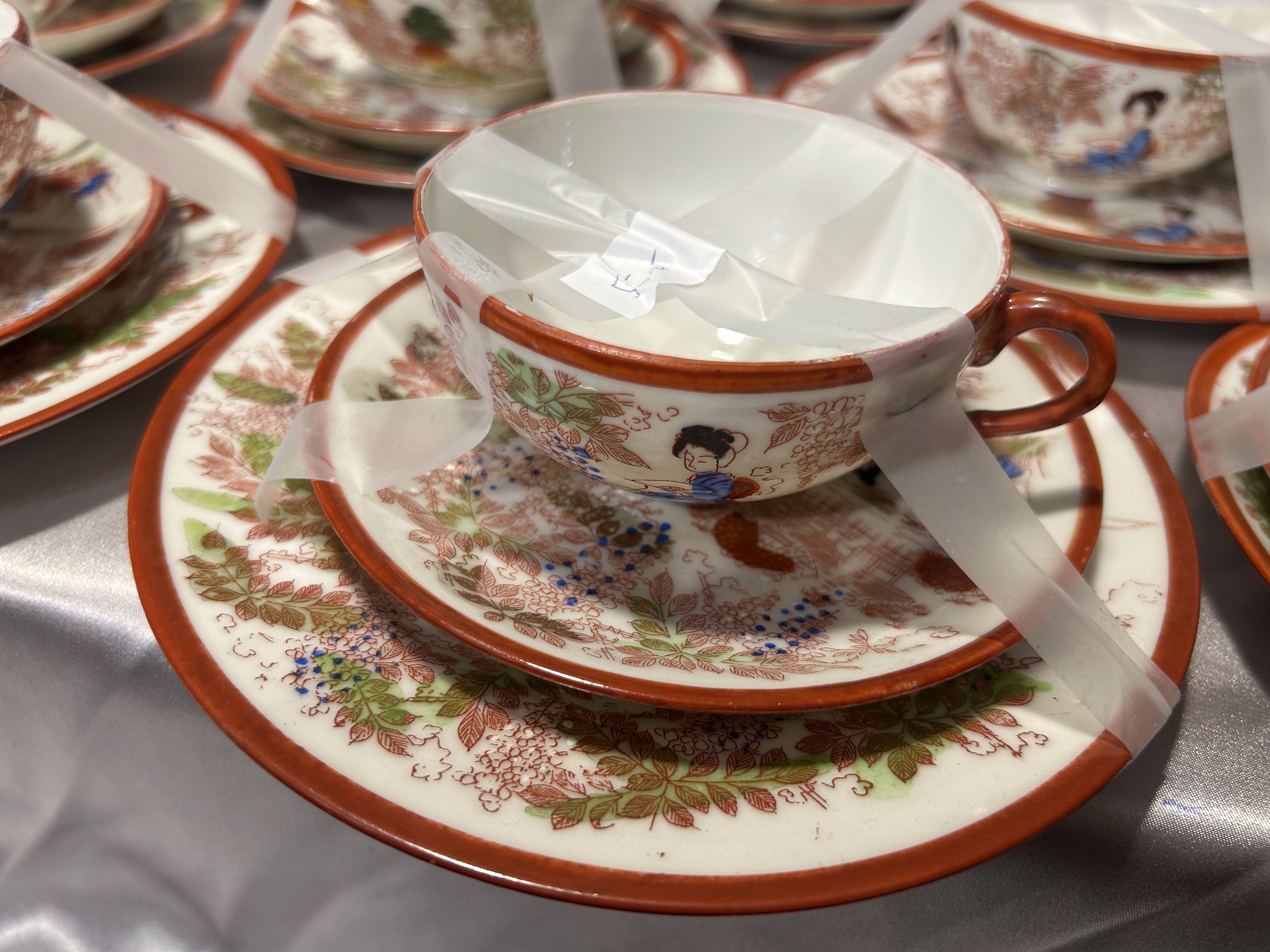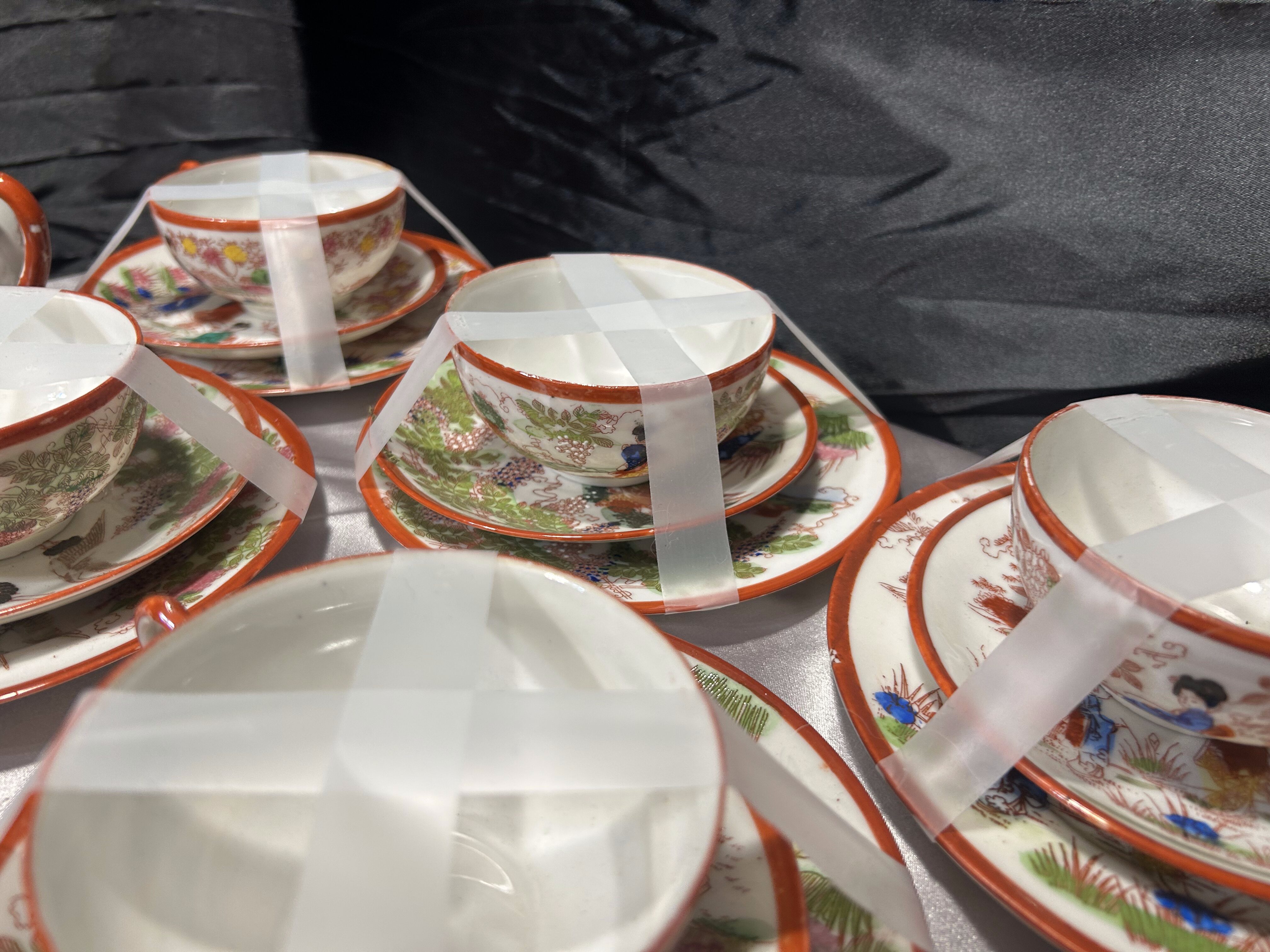 - Zestaw 12 filiżanek Trio – Japonia – porcelana orientalna – dekoracyjne sceny