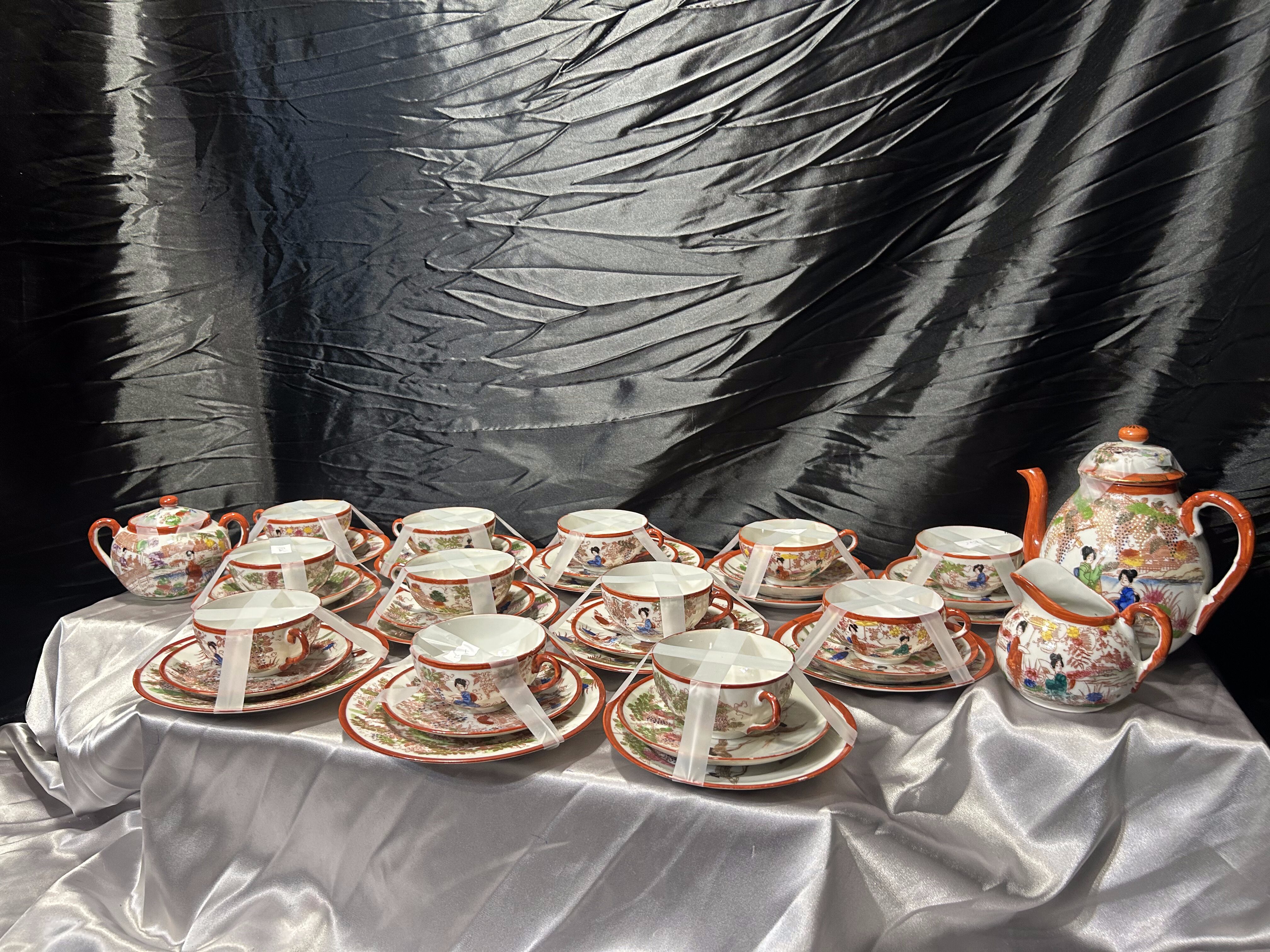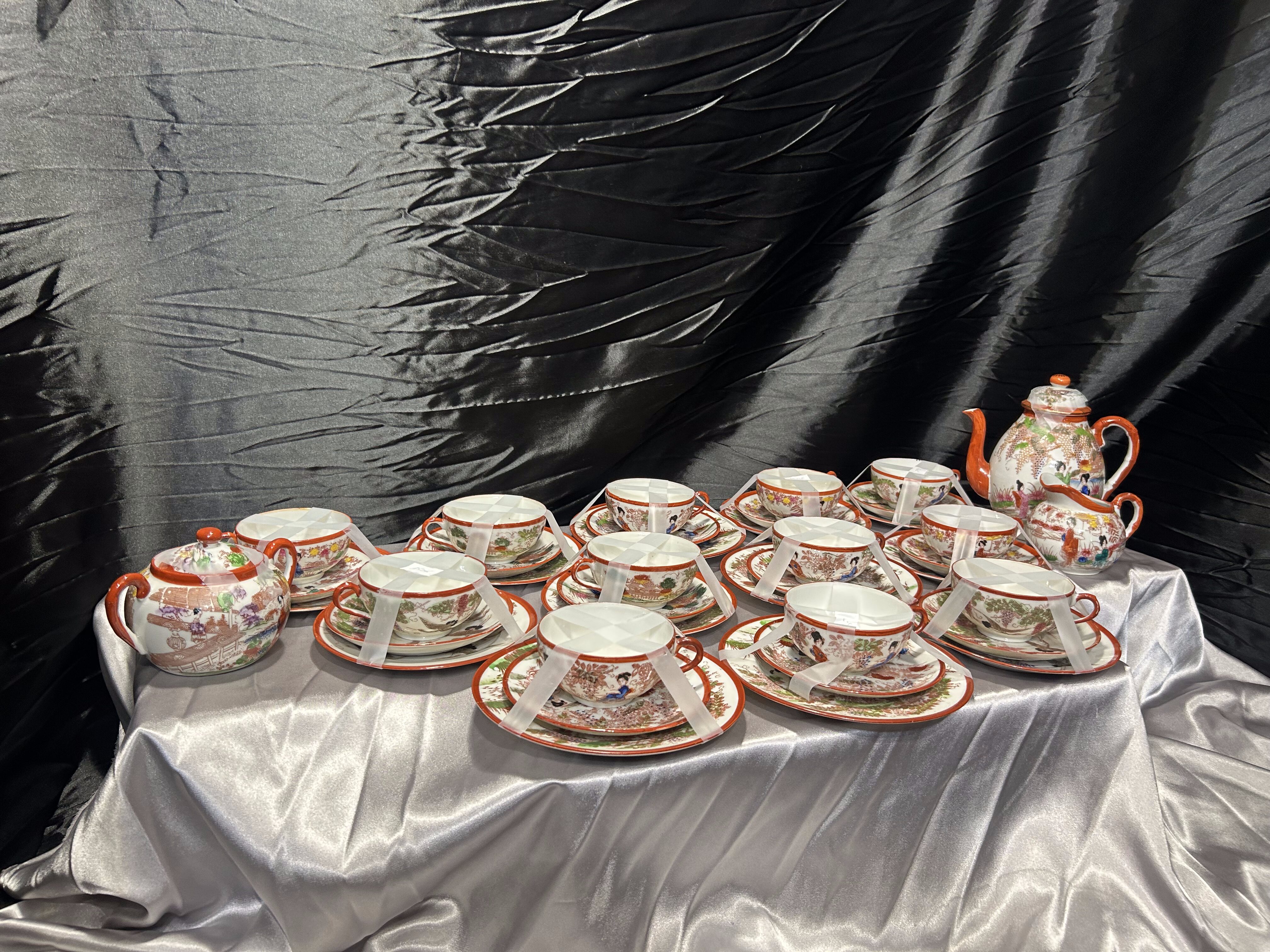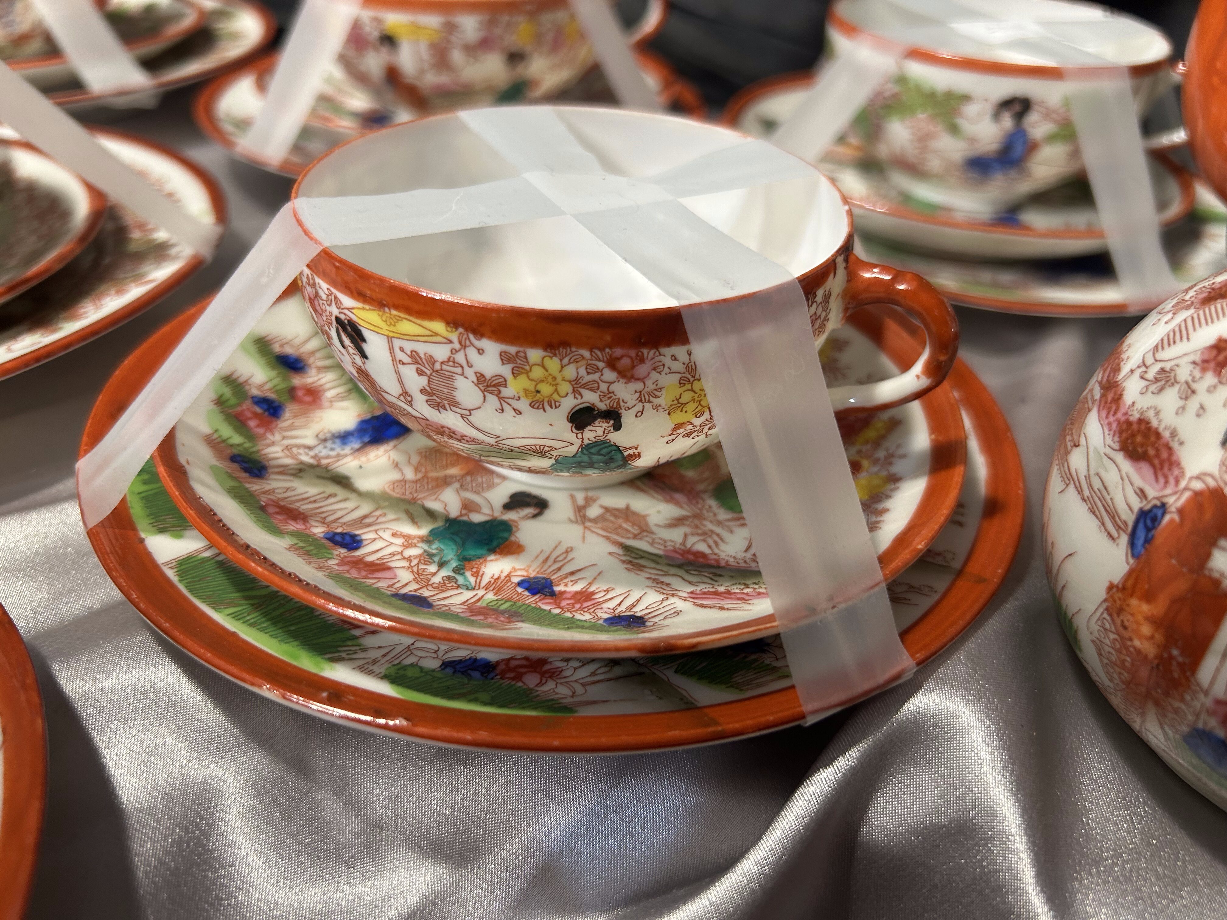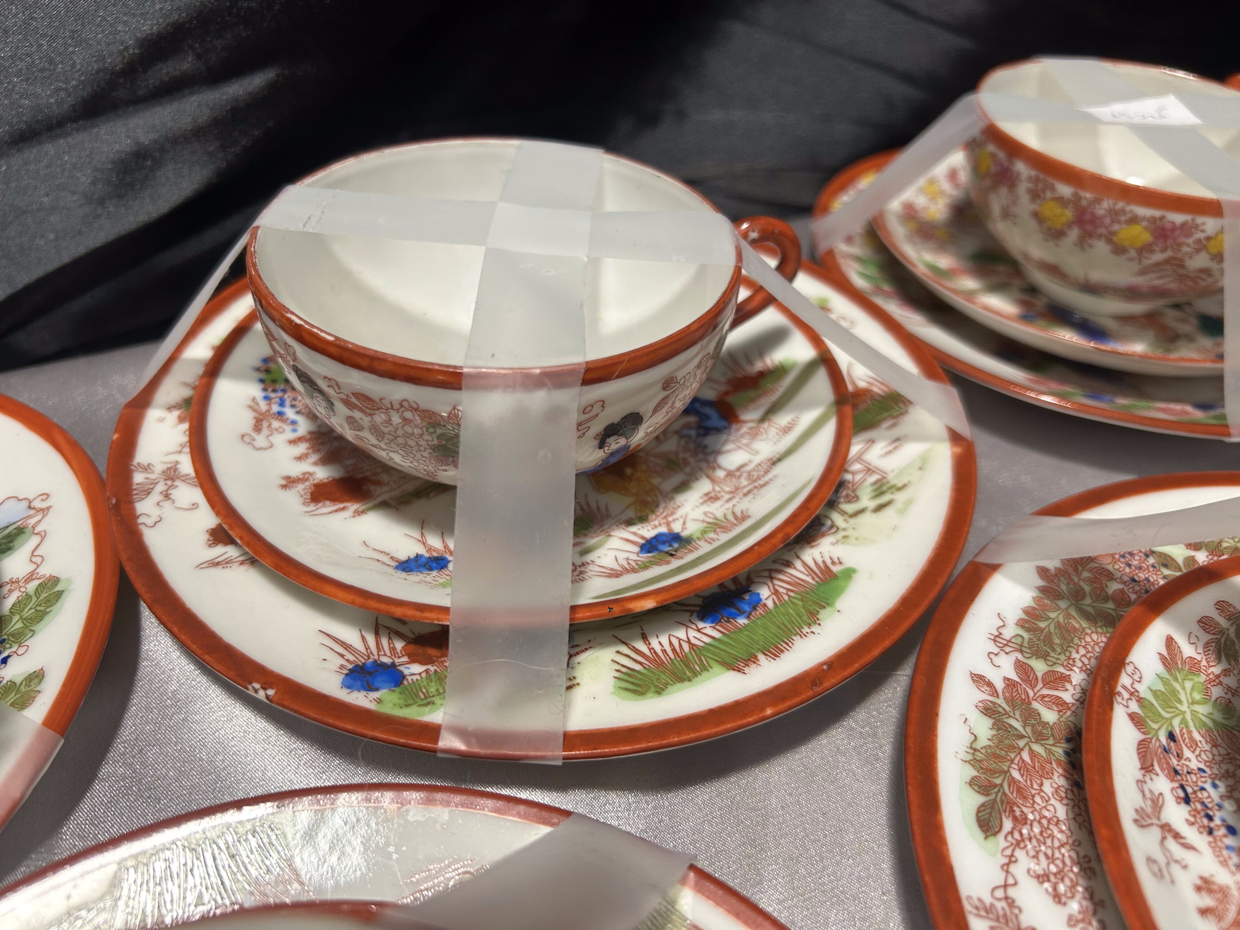 - Zestaw 12 filiżanek Trio – Japonia – porcelana orientalna – dekoracyjne sceny