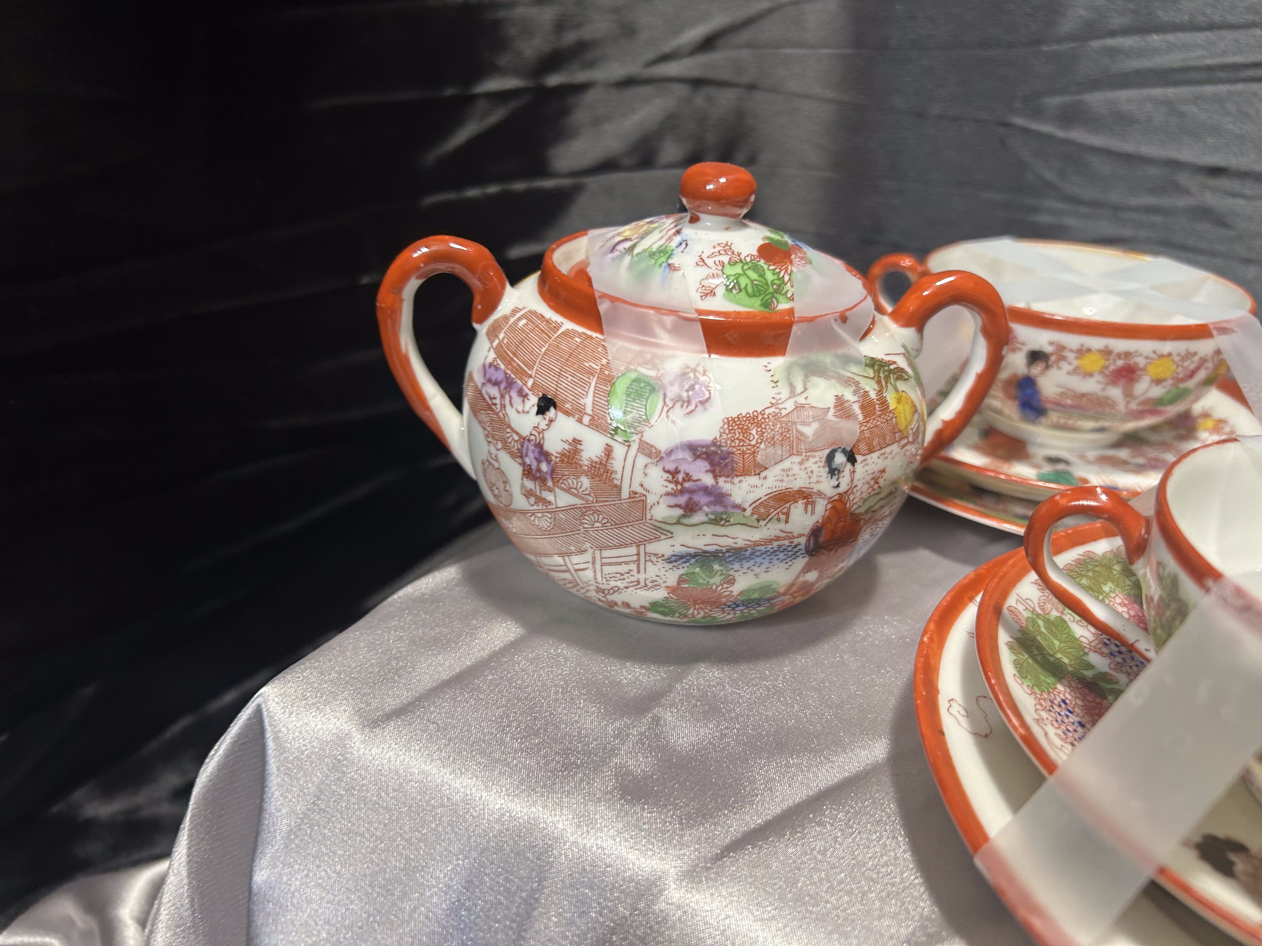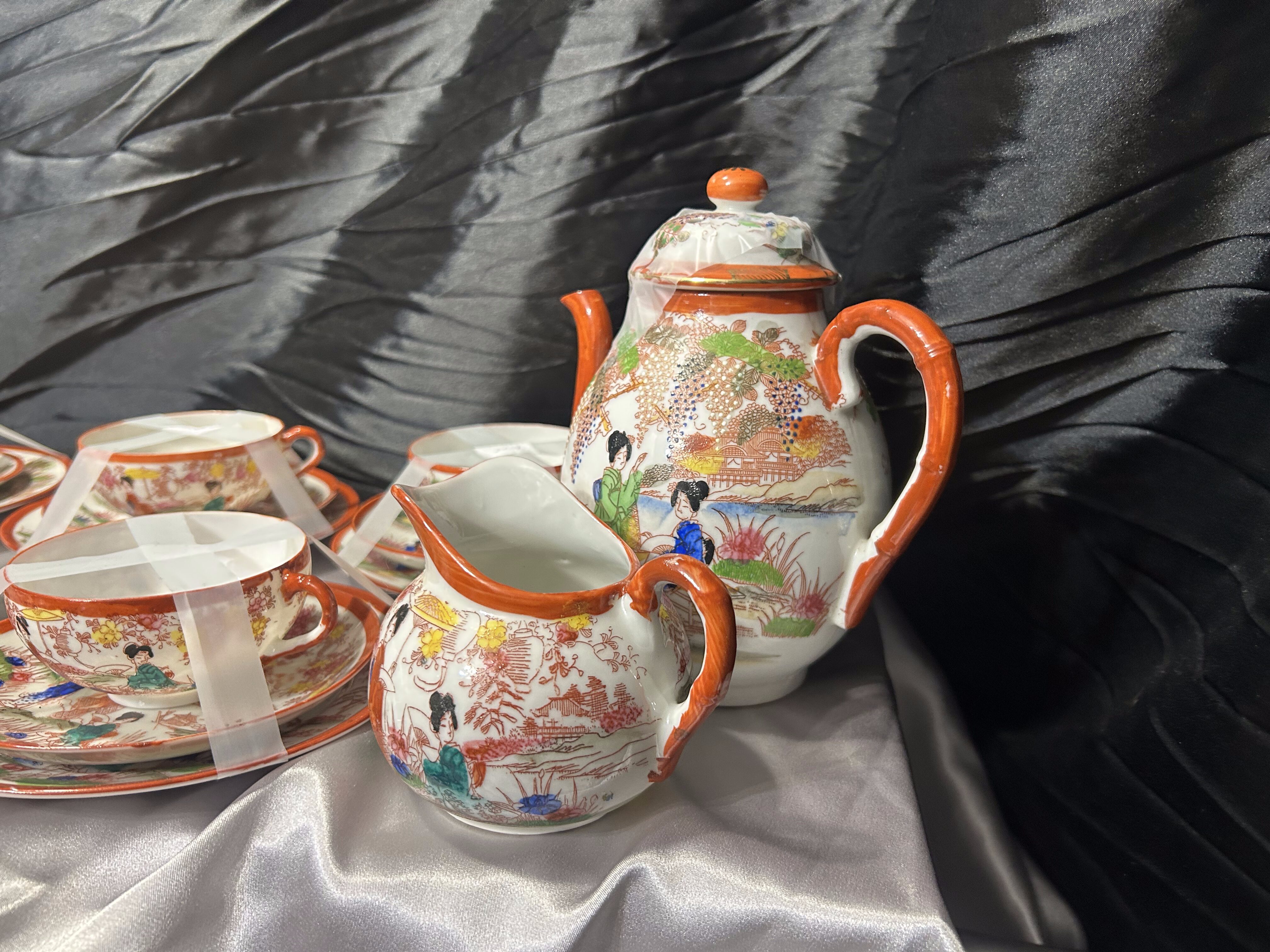 Efektowny zestaw japońskiej porcelany składający się z 12 filiżanek typu Trio, uzupełniony o dzbanek, mlecznik oraz cukiernicę. Całość zdobiona bogatymi, wielobarwnymi scenami orientalnymi, charakterystycznymi dla japońskiej porcelany eksportowej. Zestaw robi duże wrażenie wizualne – idealny zarówno do eleganckiego serwowania, jak i jako dekoracja kolekcjonerska.