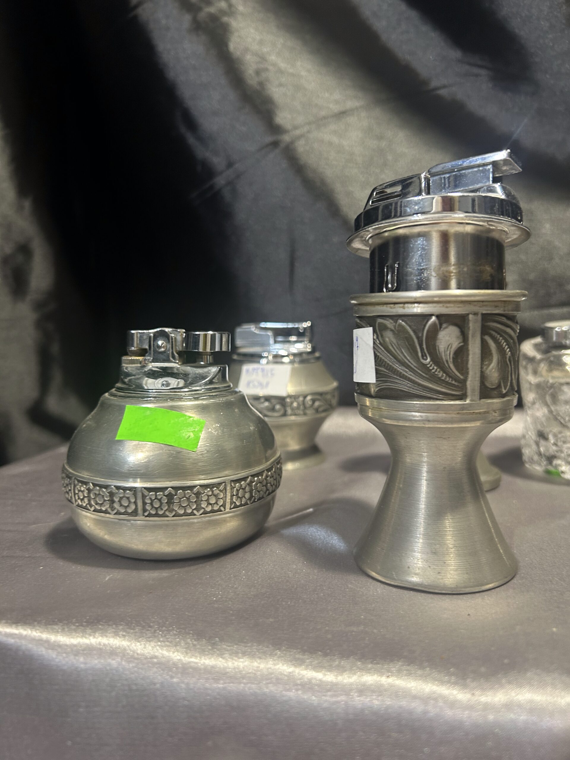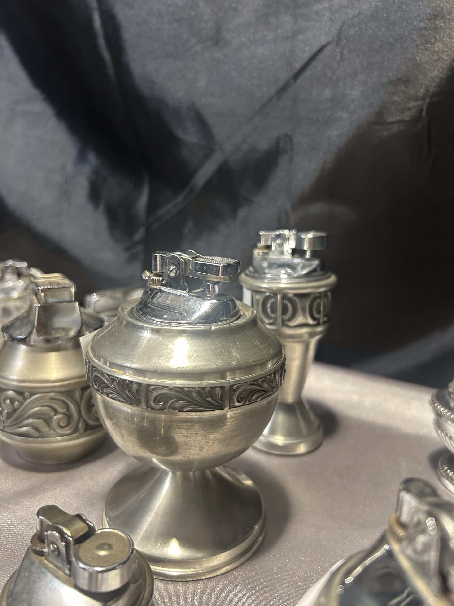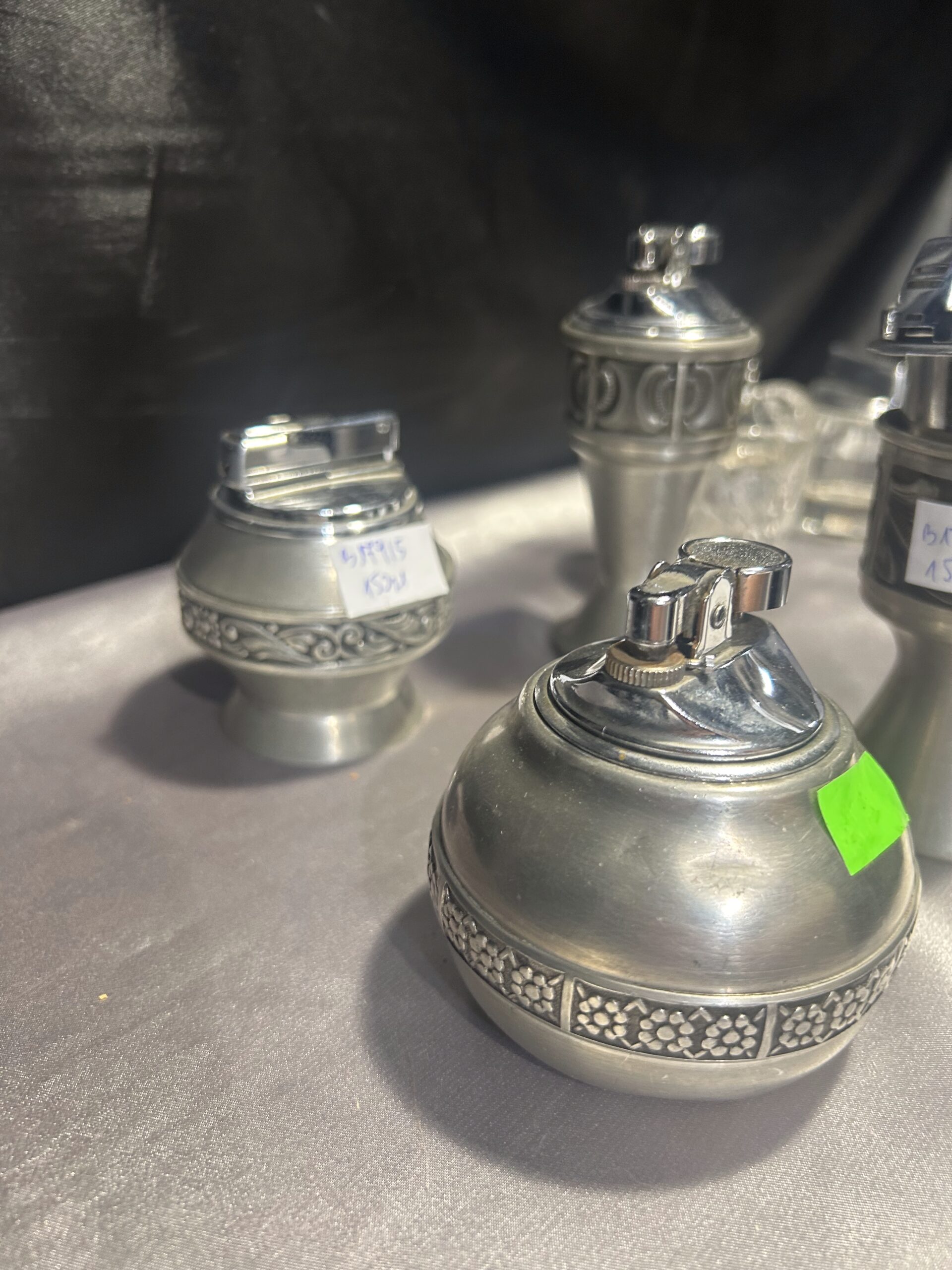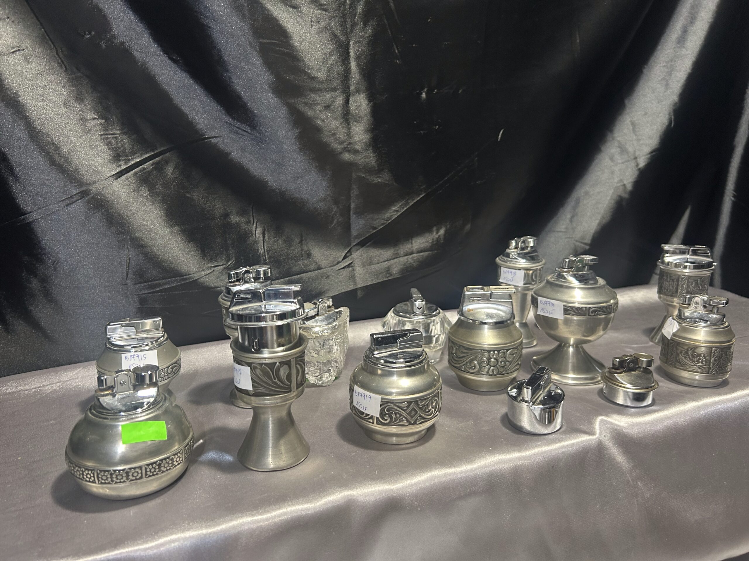 Unikalny zestaw 13 zdobionych zapalniczek, wśród których większość wykonana jest z cyny, a dwie mają elegancki, szklany wygląd. Każda zapalniczka wyróżnia się indywidualnym wzorem, co czyni ten komplet prawdziwą gratką dla kolekcjonera. Doskonały wybór dla miłośników unikatowych akcesoriów oraz osób ceniących kunsztowne detale.