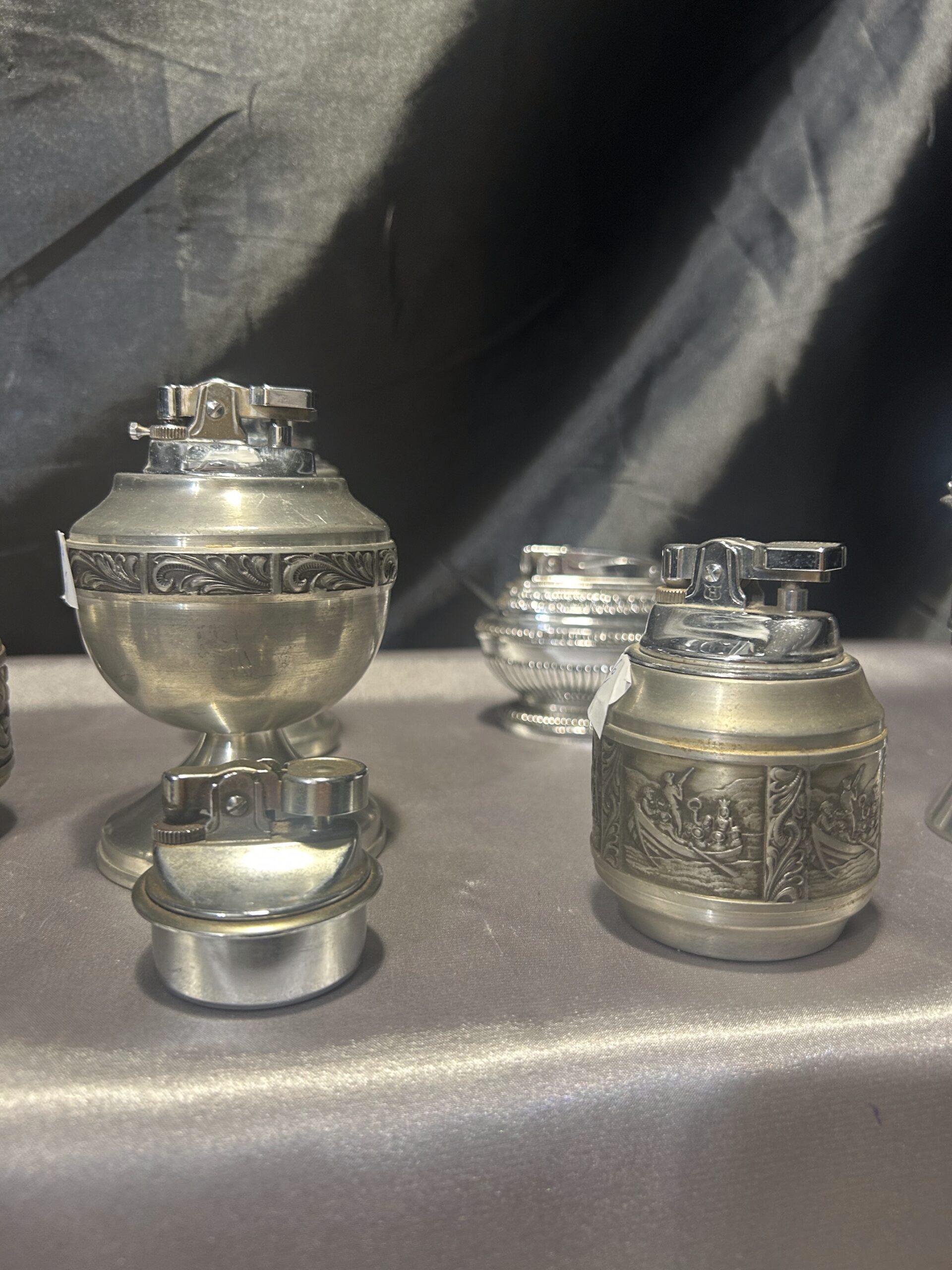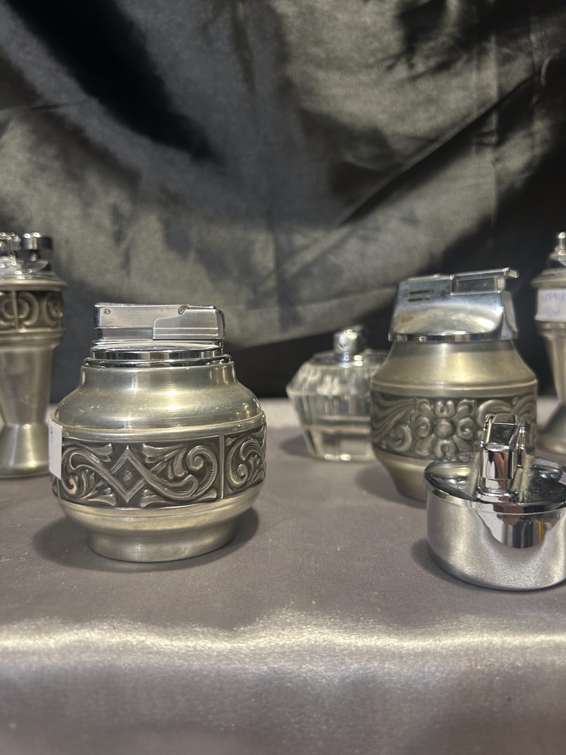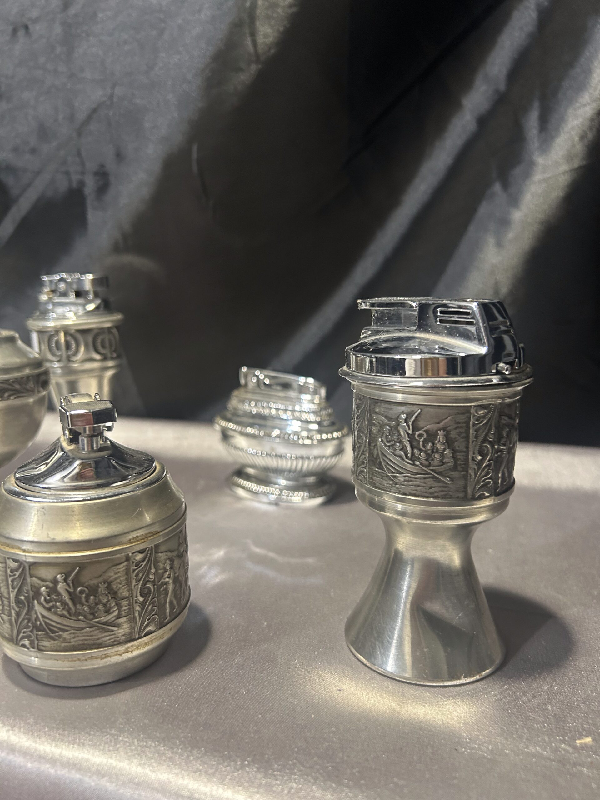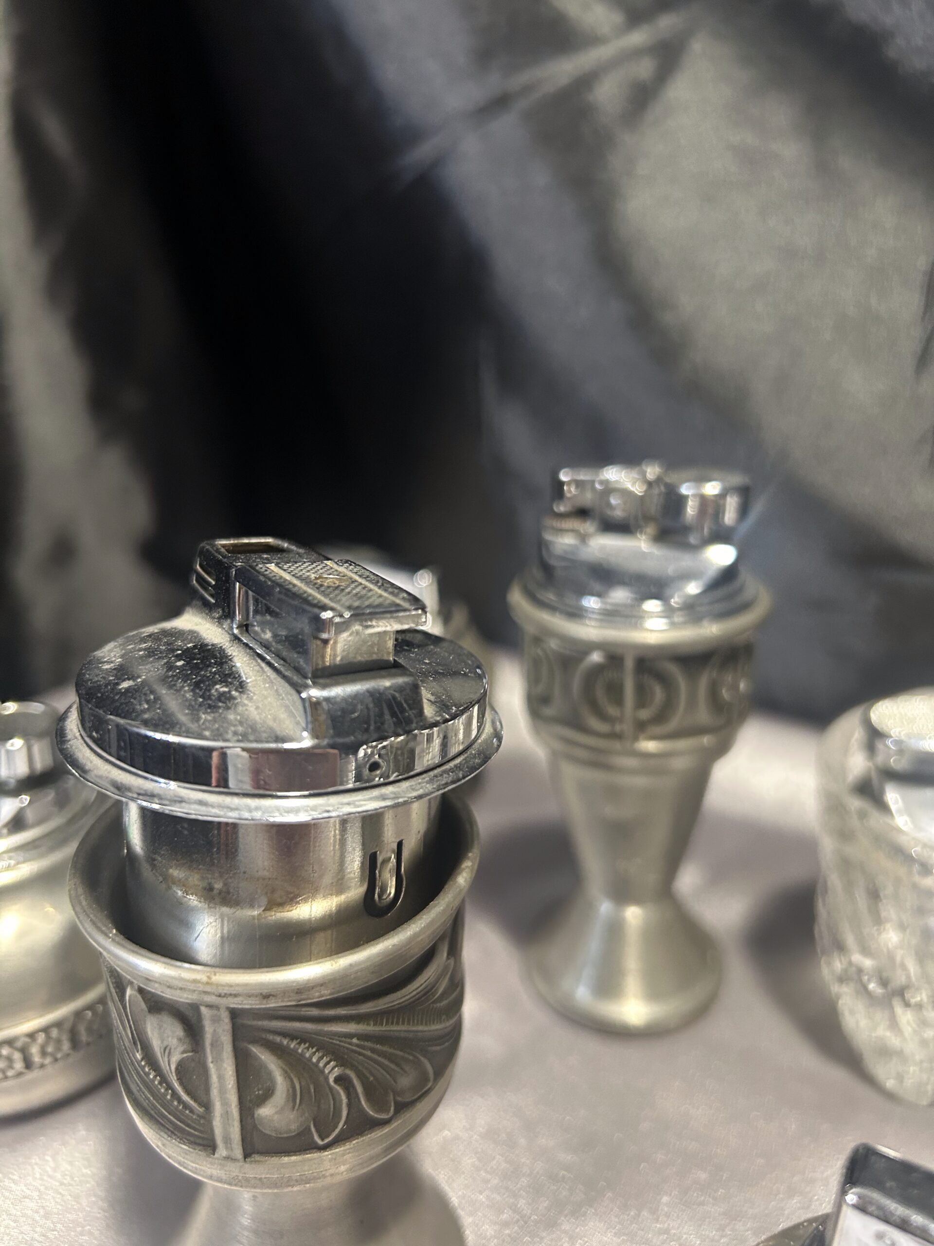 Unikalny zestaw 13 zdobionych zapalniczek, wśród których większość wykonana jest z cyny, a dwie mają elegancki, szklany wygląd. Każda zapalniczka wyróżnia się indywidualnym wzorem, co czyni ten komplet prawdziwą gratką dla kolekcjonera. Doskonały wybór dla miłośników unikatowych akcesoriów oraz osób ceniących kunsztowne detale.