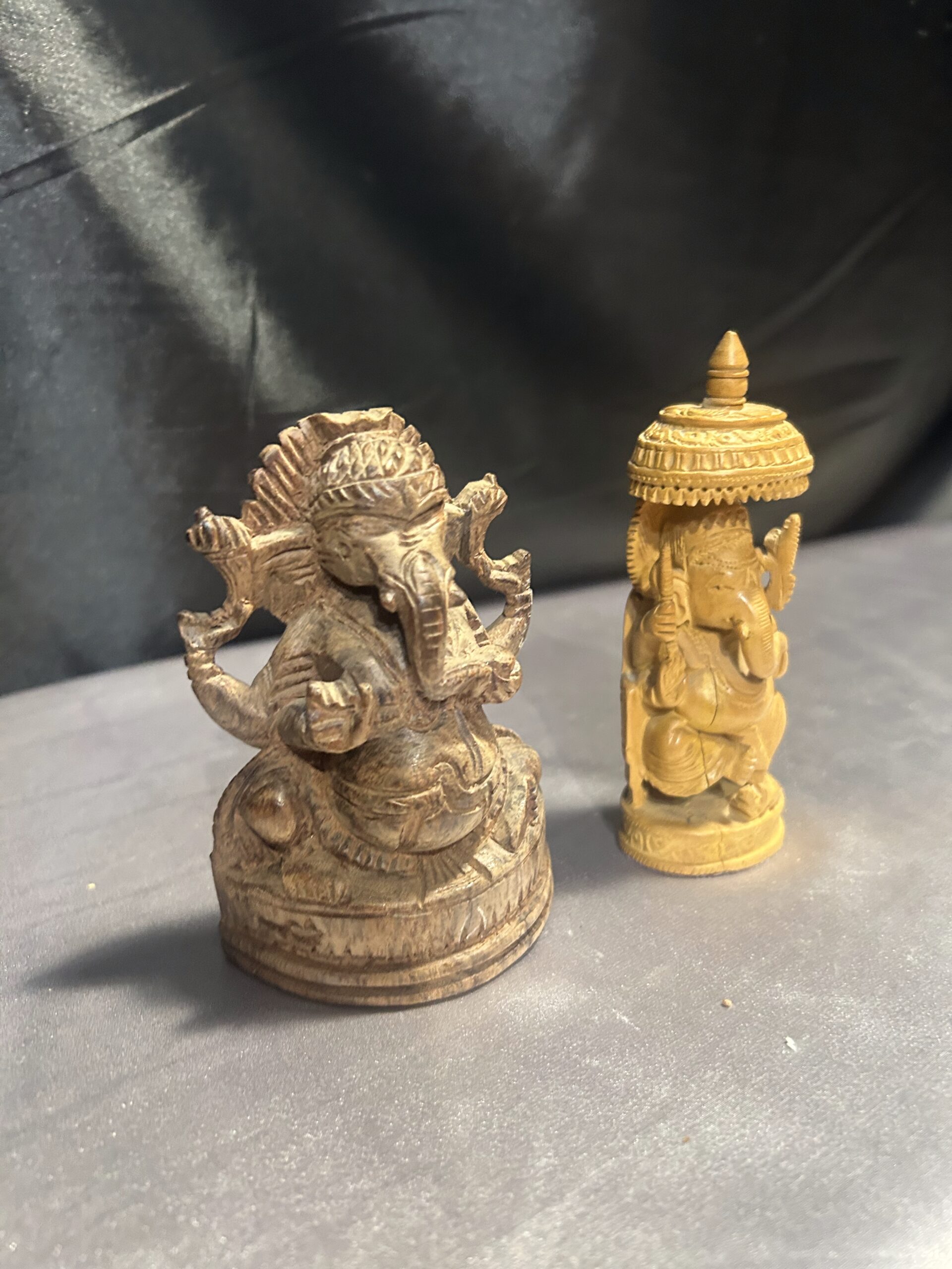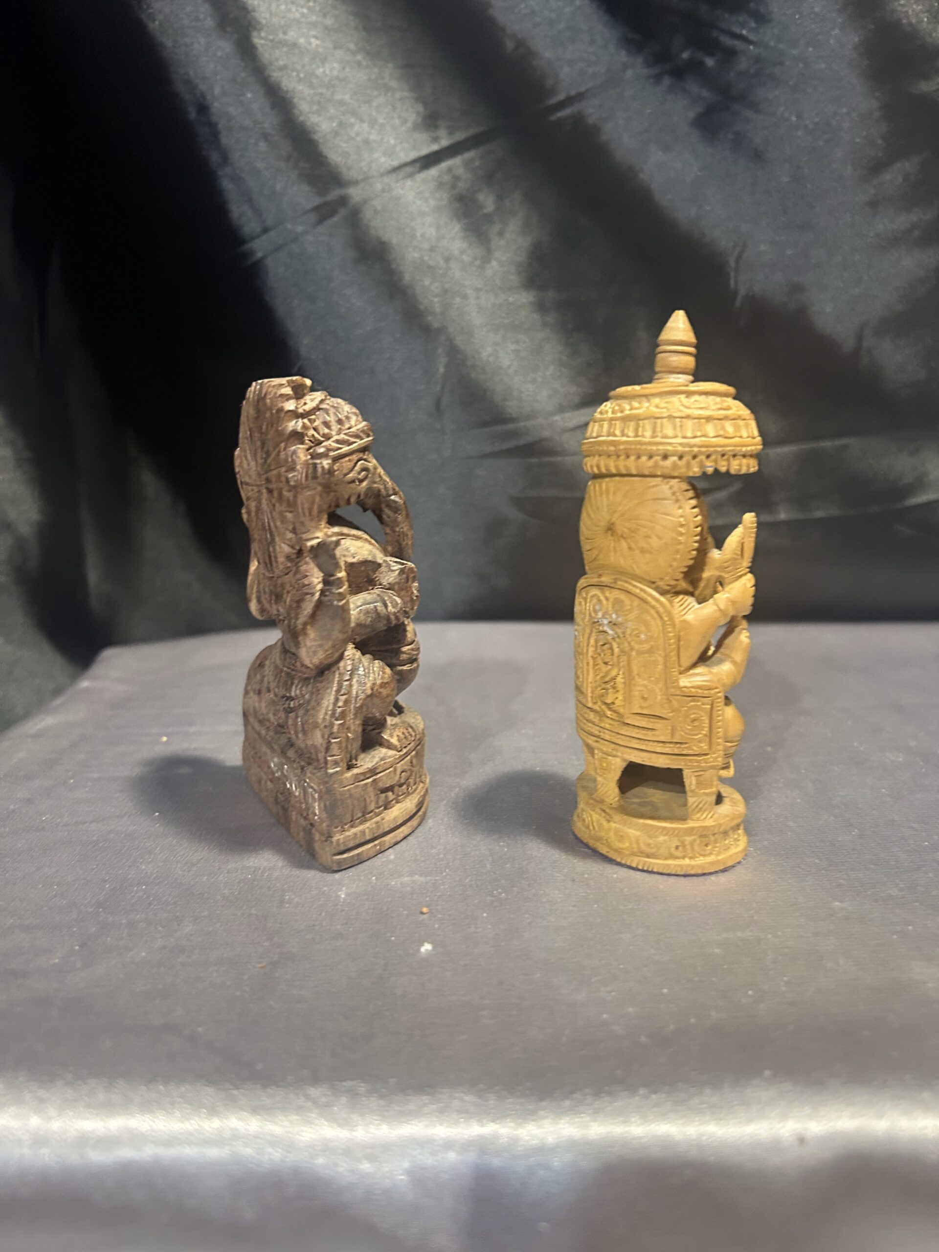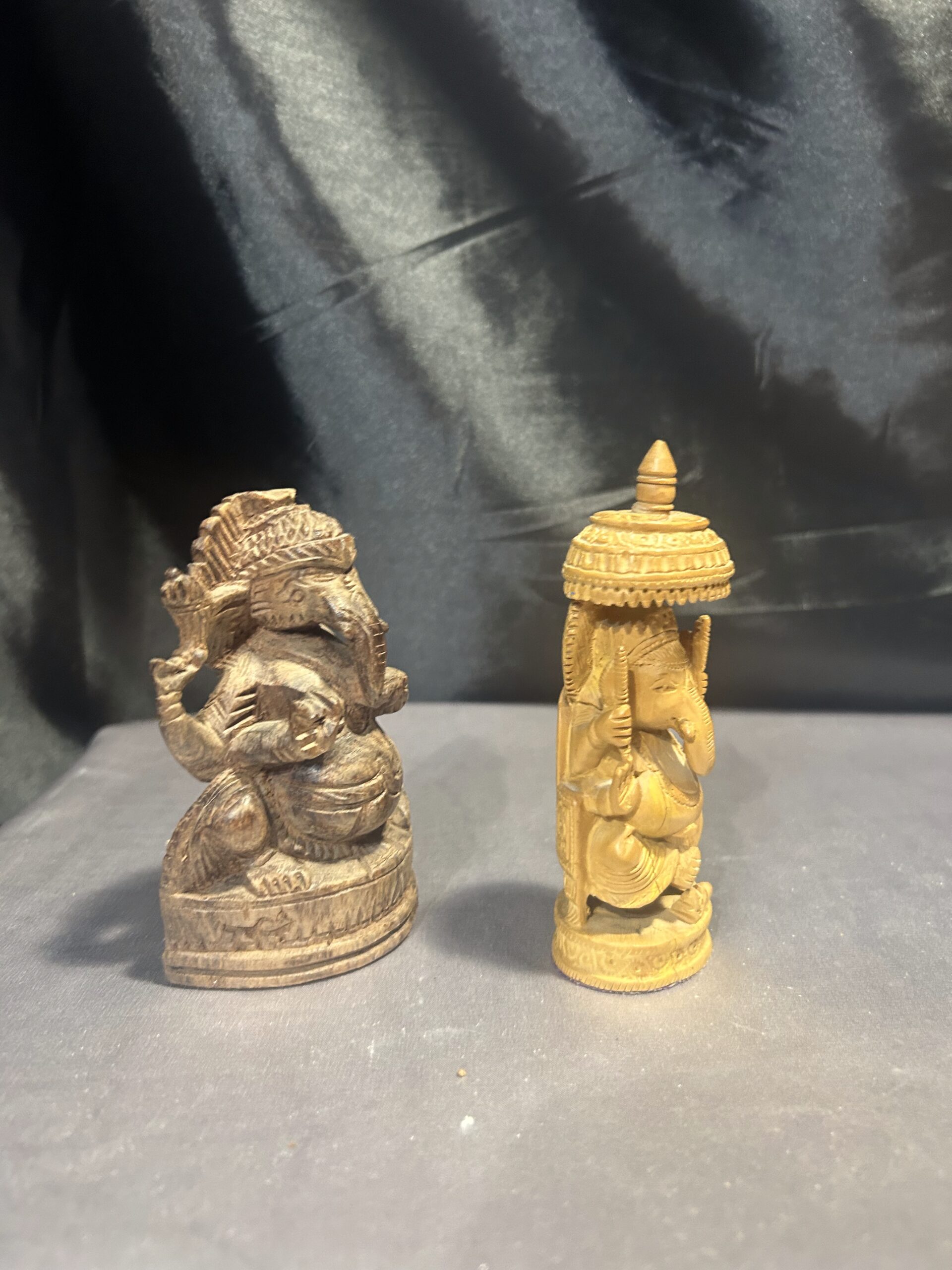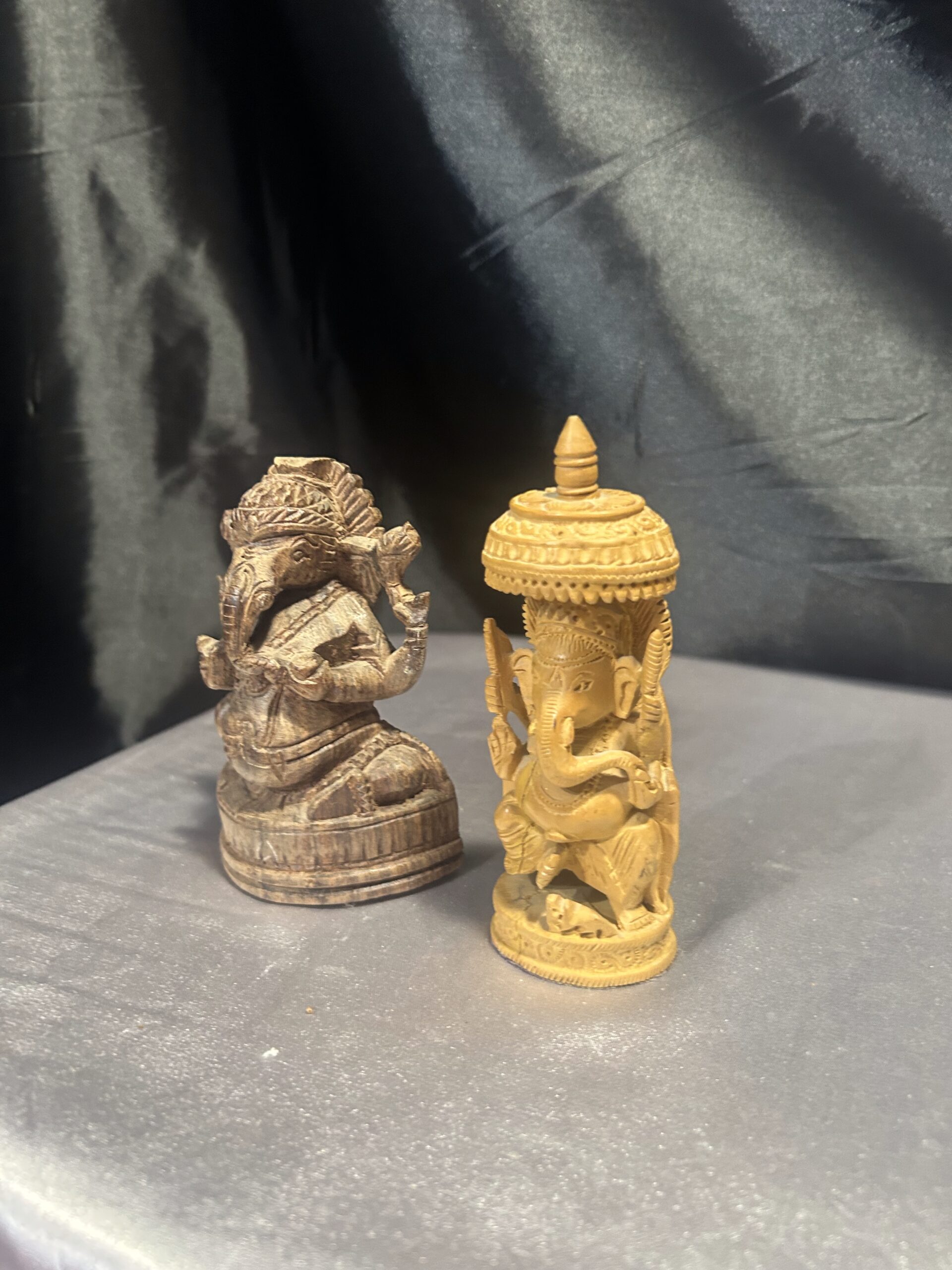 Zestaw 2 Drewnianych Figurek Ganesha – Ręcznie Rzeźbione, Jaśniejsze i Ciemniejsze Drewno