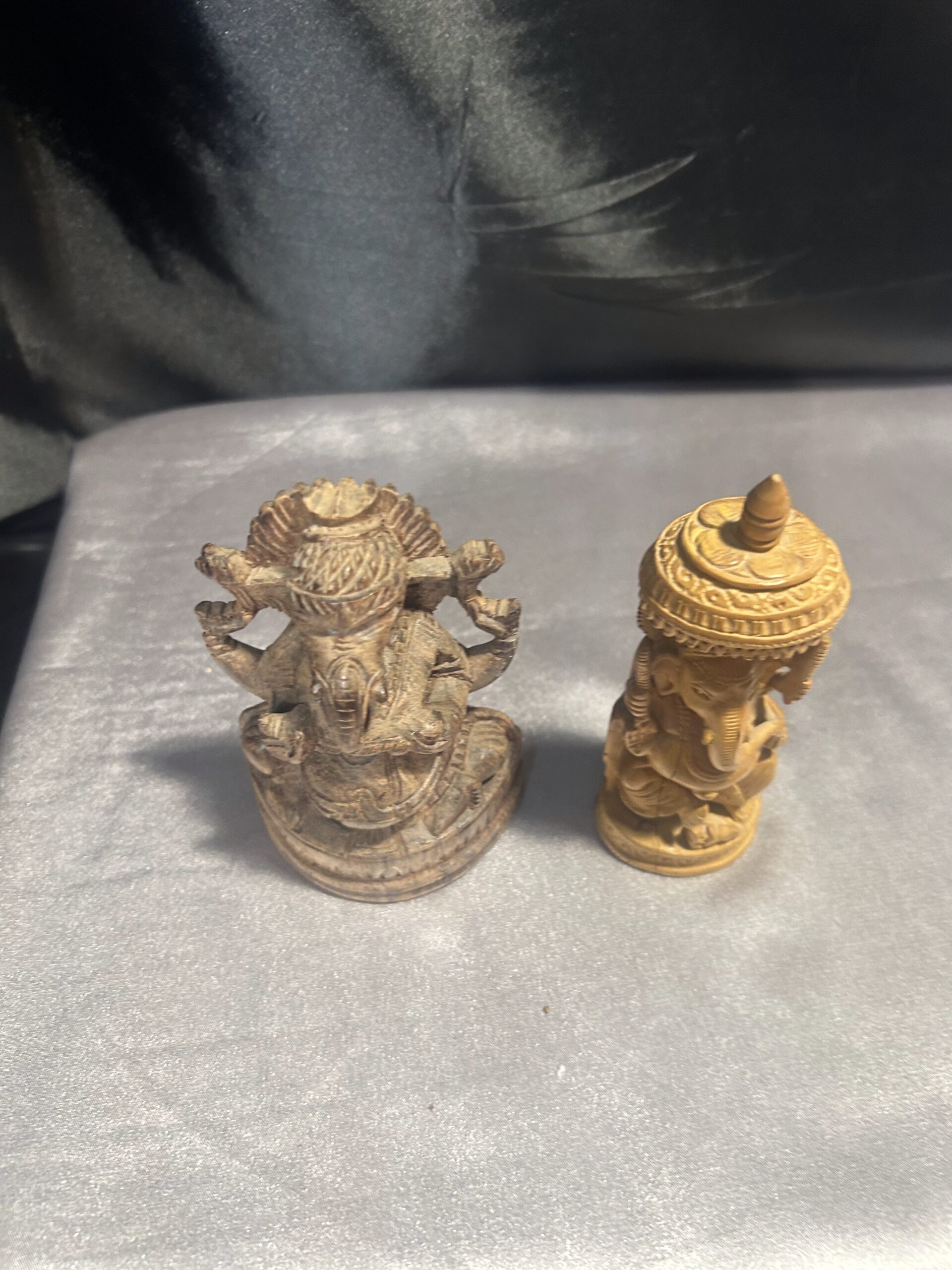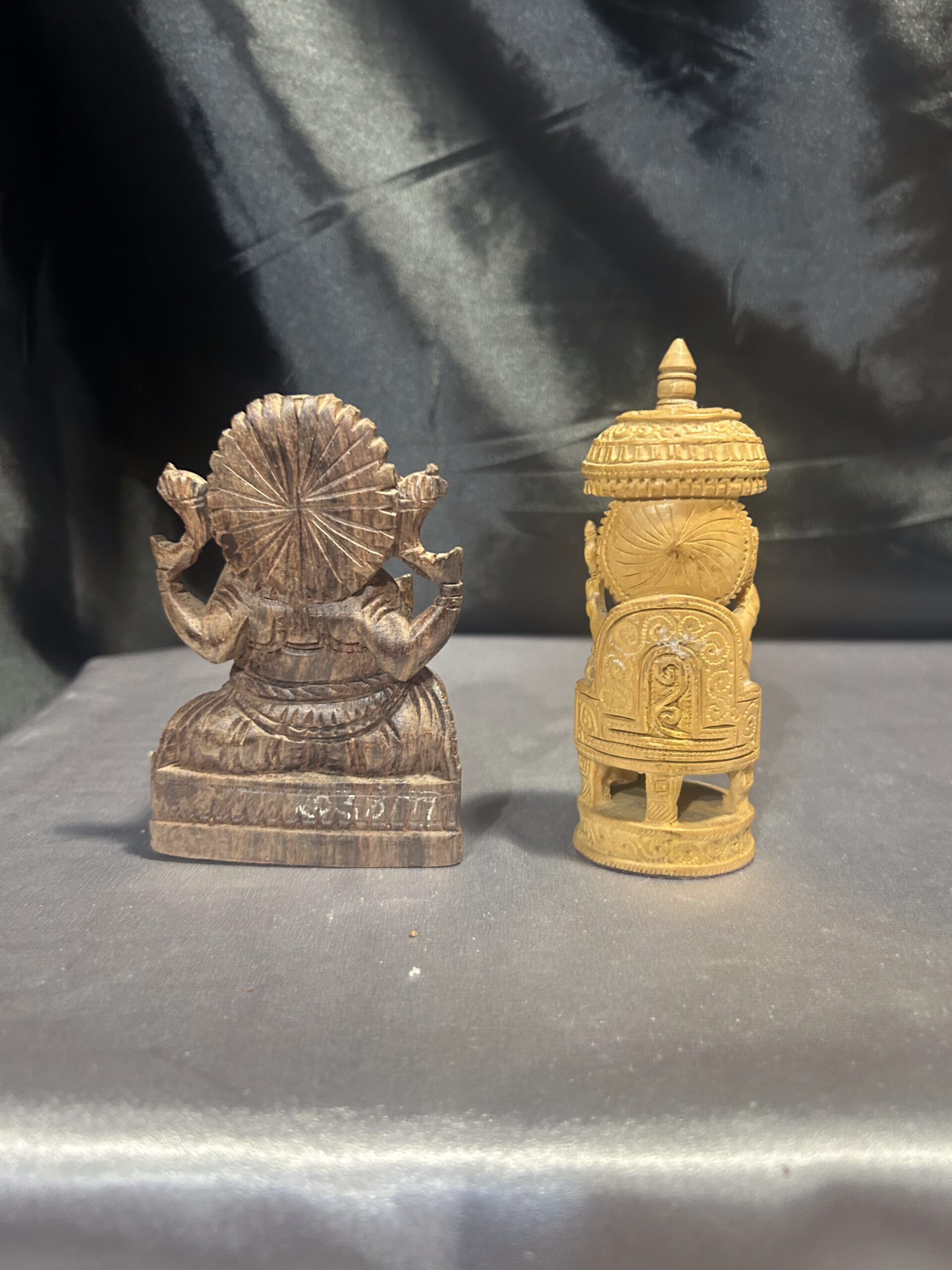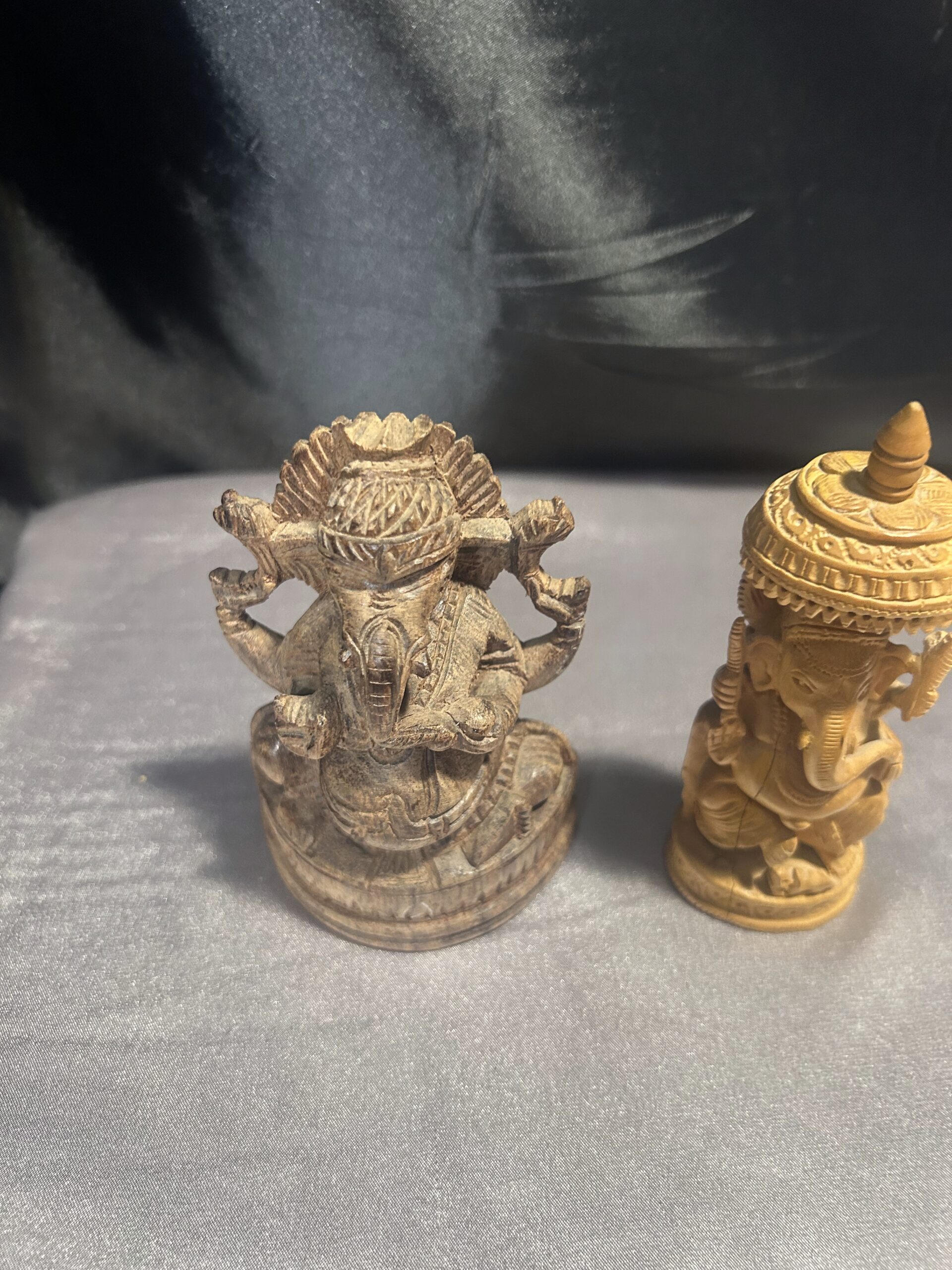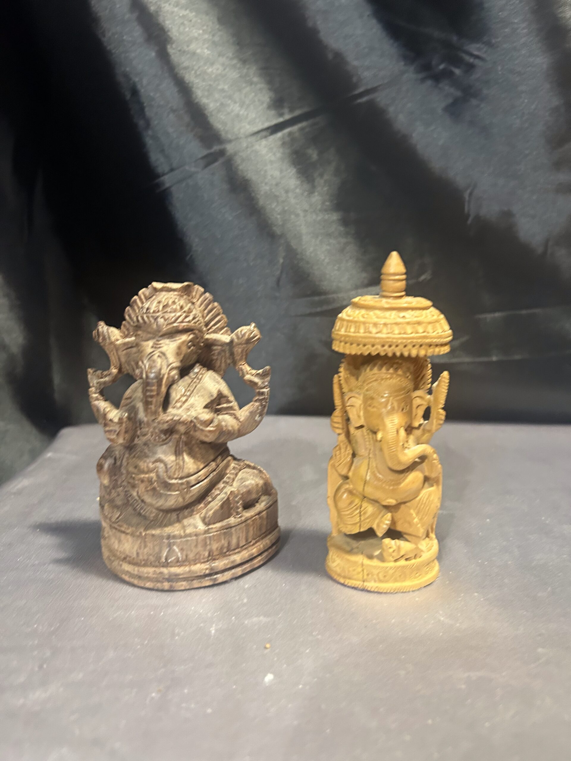 Zestaw 2 Drewnianych Figurek Ganesha – Ręcznie Rzeźbione, Jaśniejsze i Ciemniejsze Drewno