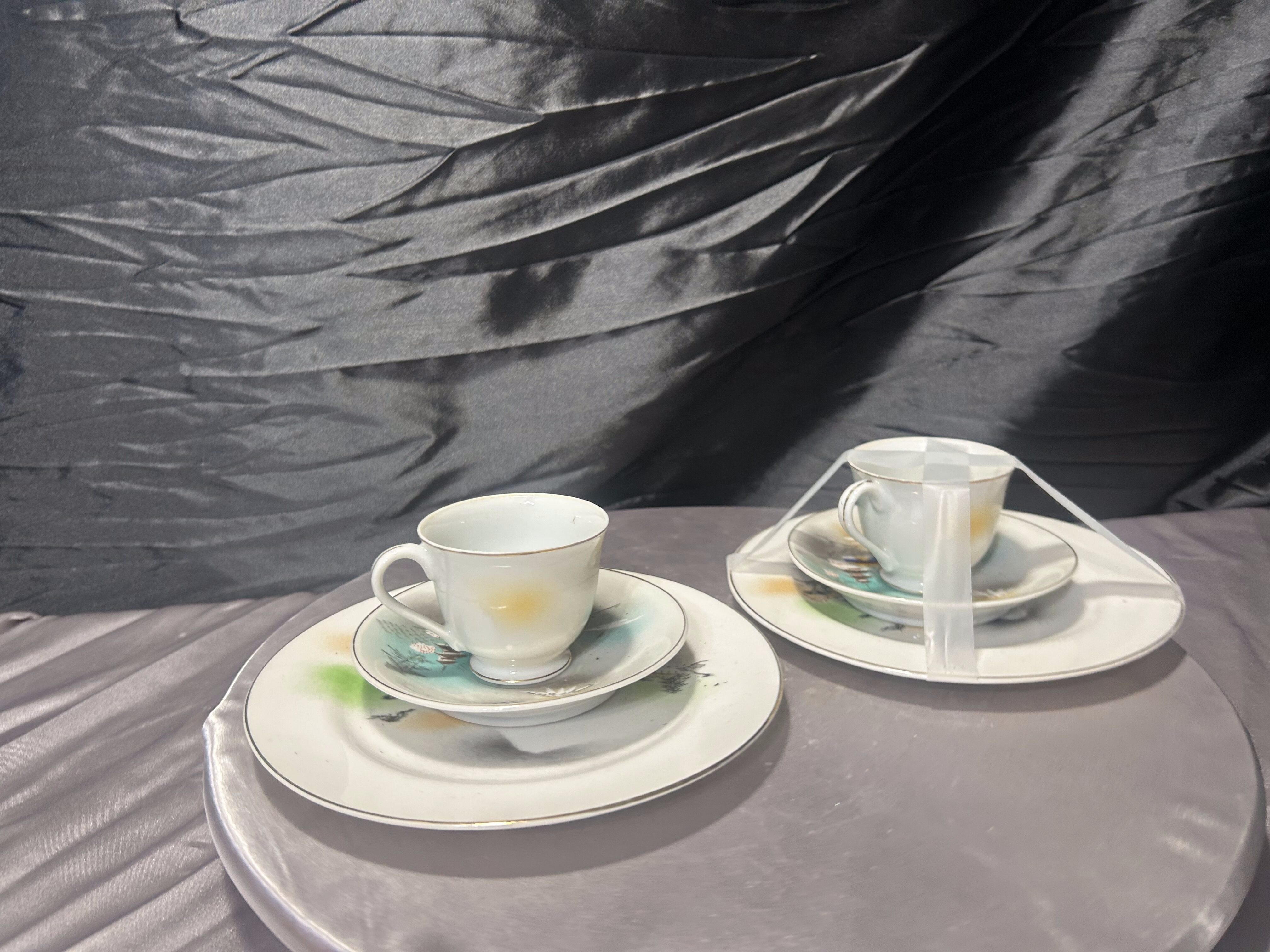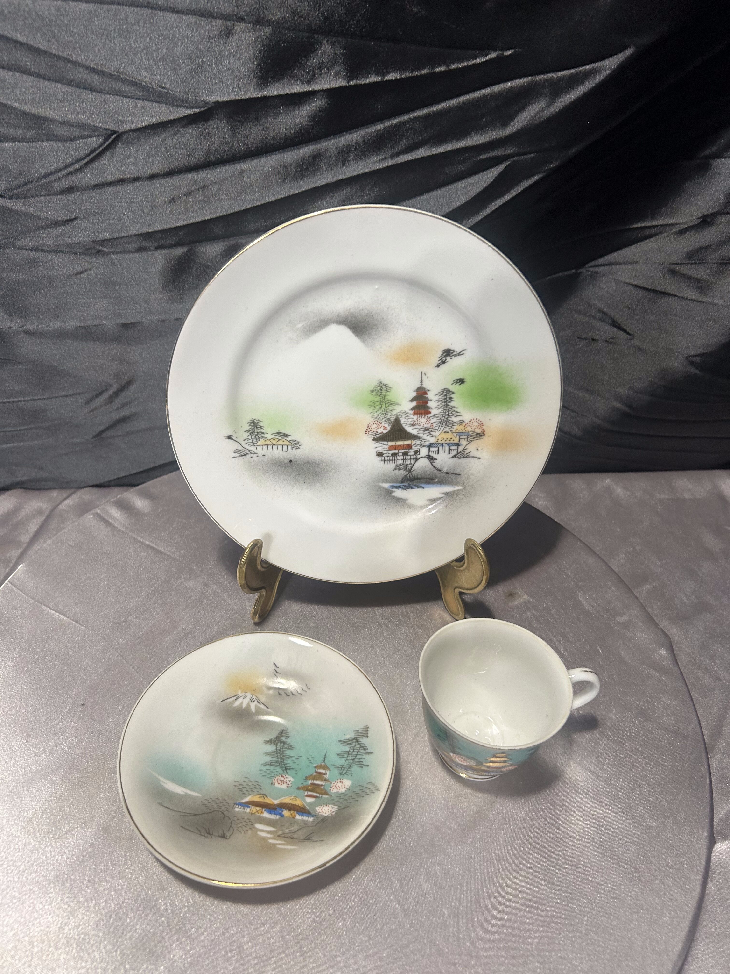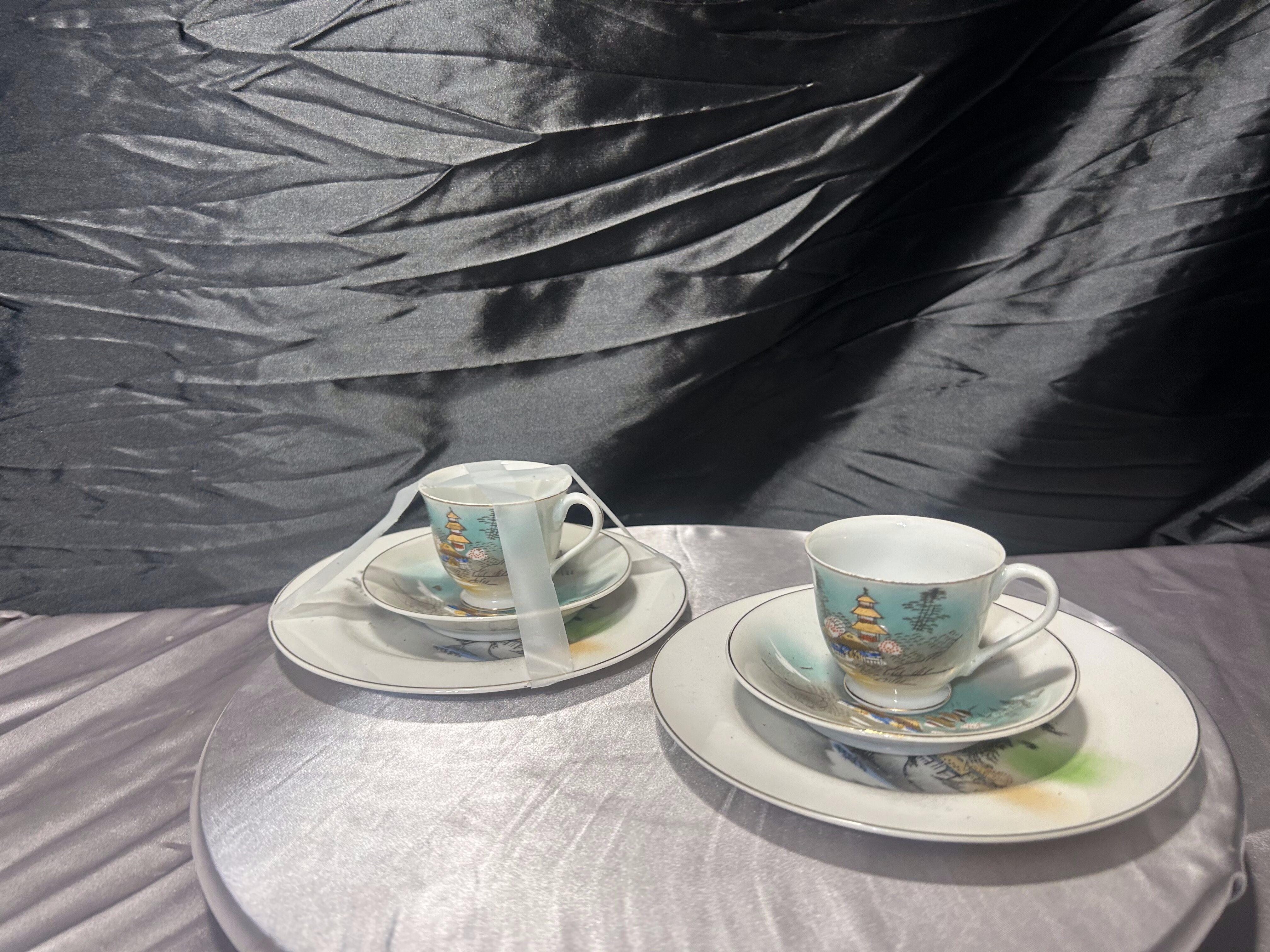 Elegancki zestaw dwóch filiżanek typu TRIO, pochodzący z Japonii, utrzymany w klasycznym stylu Kutani. Każdy zestaw składa się z filiżanki, spodka oraz talerzyka deserowego. Porcelana zdobiona subtelną sceną krajobrazową z pagodą, górami i roślinnością, z delikatnymi akcentami kolorystycznymi.