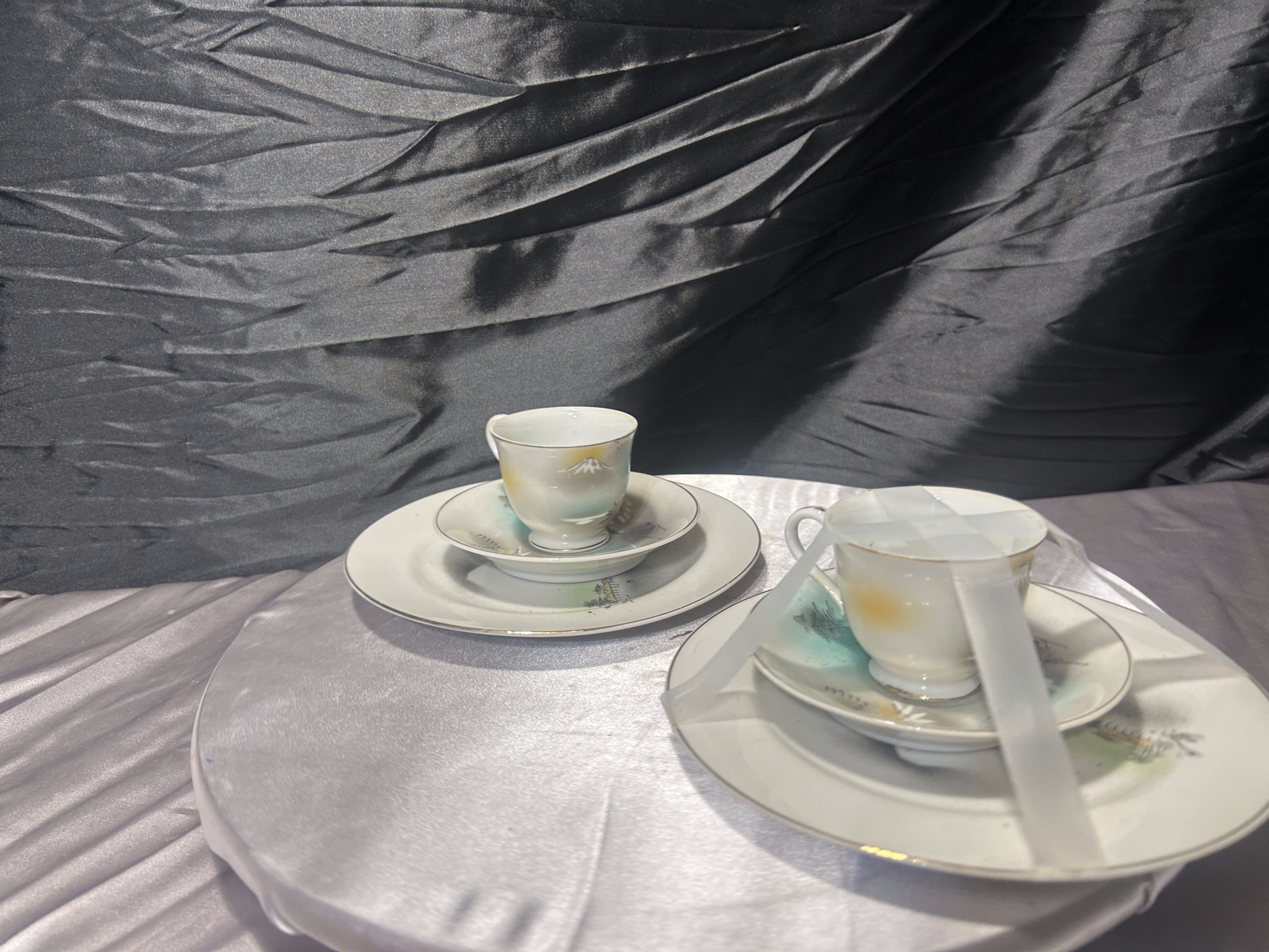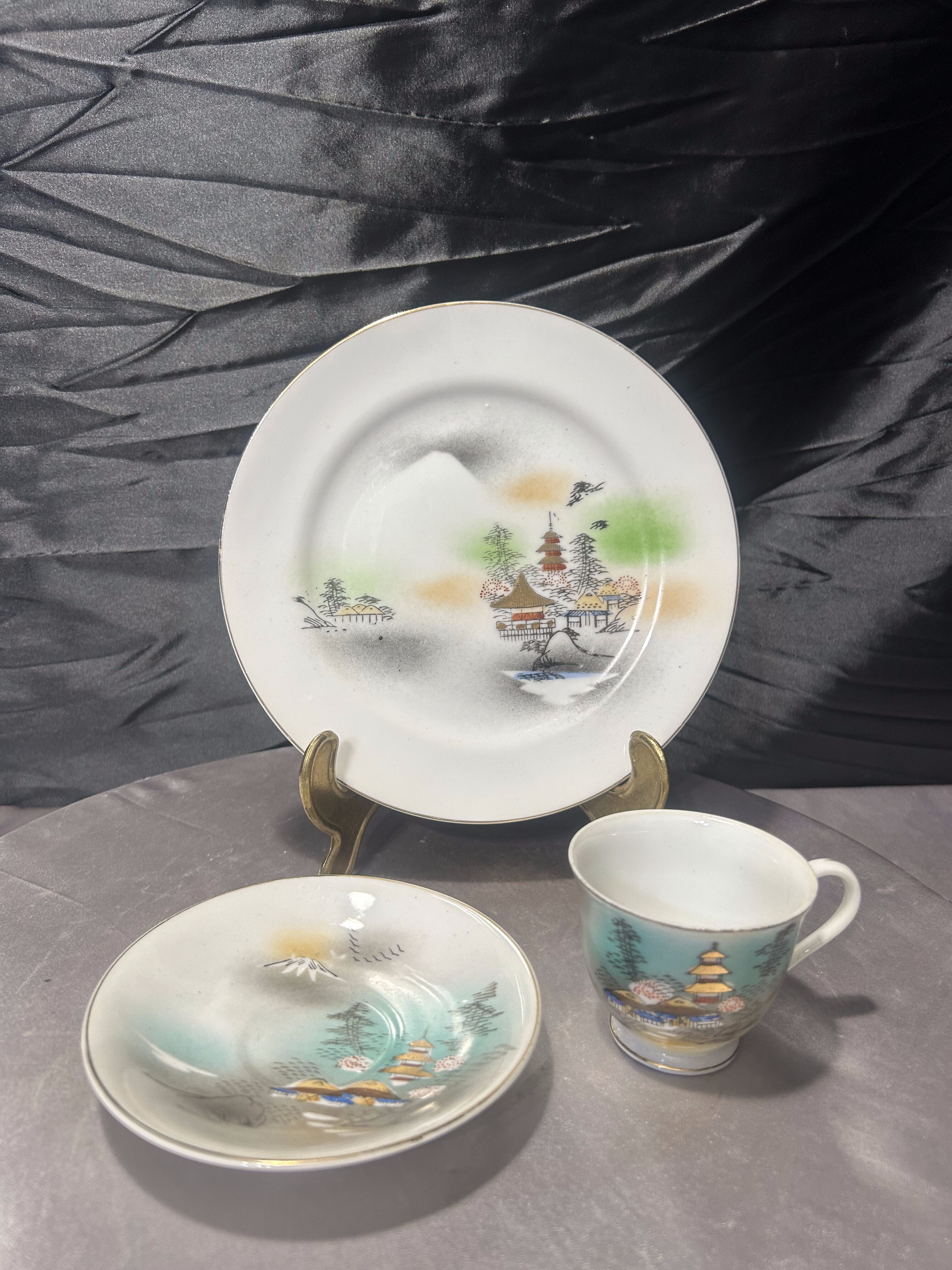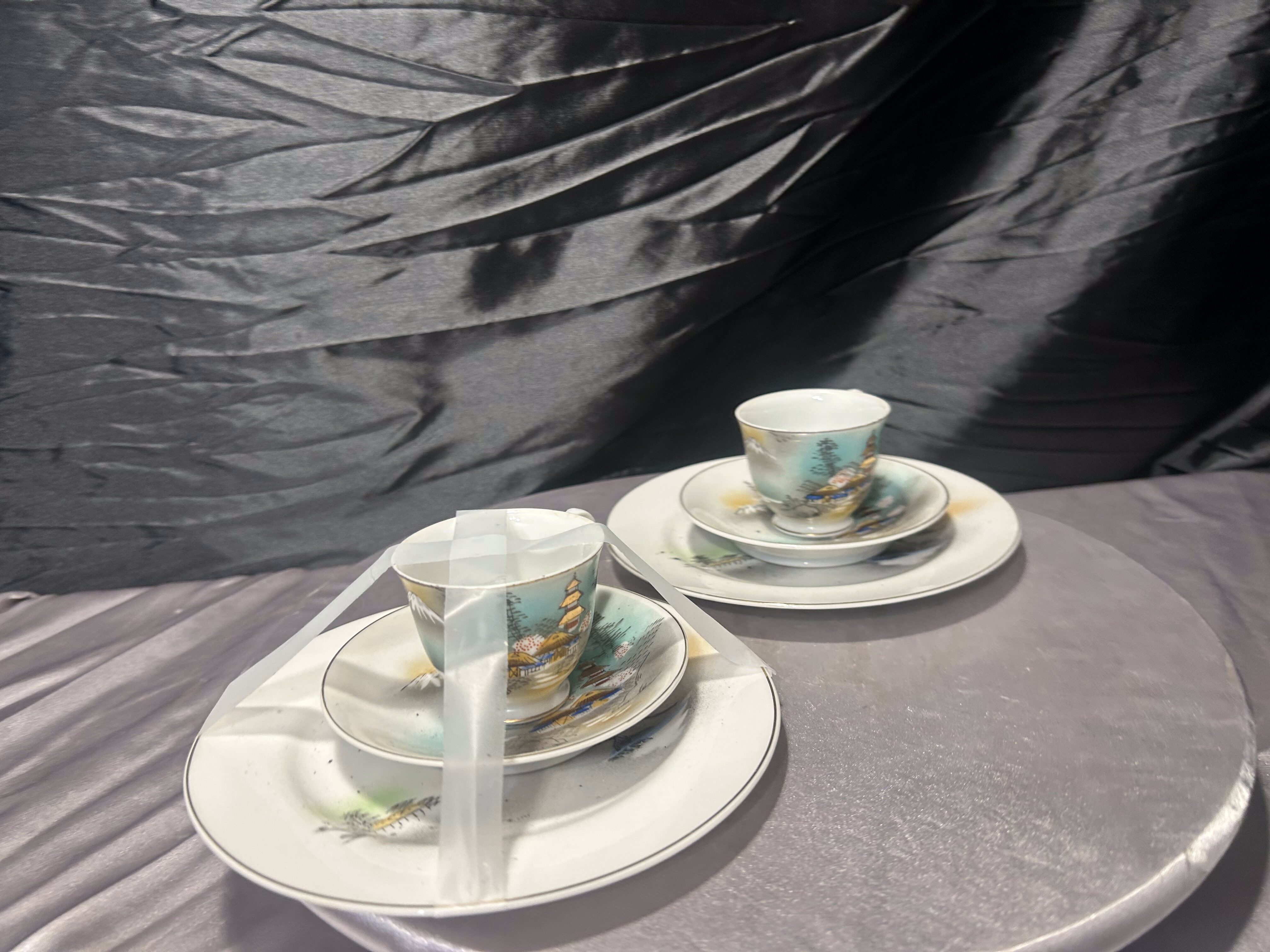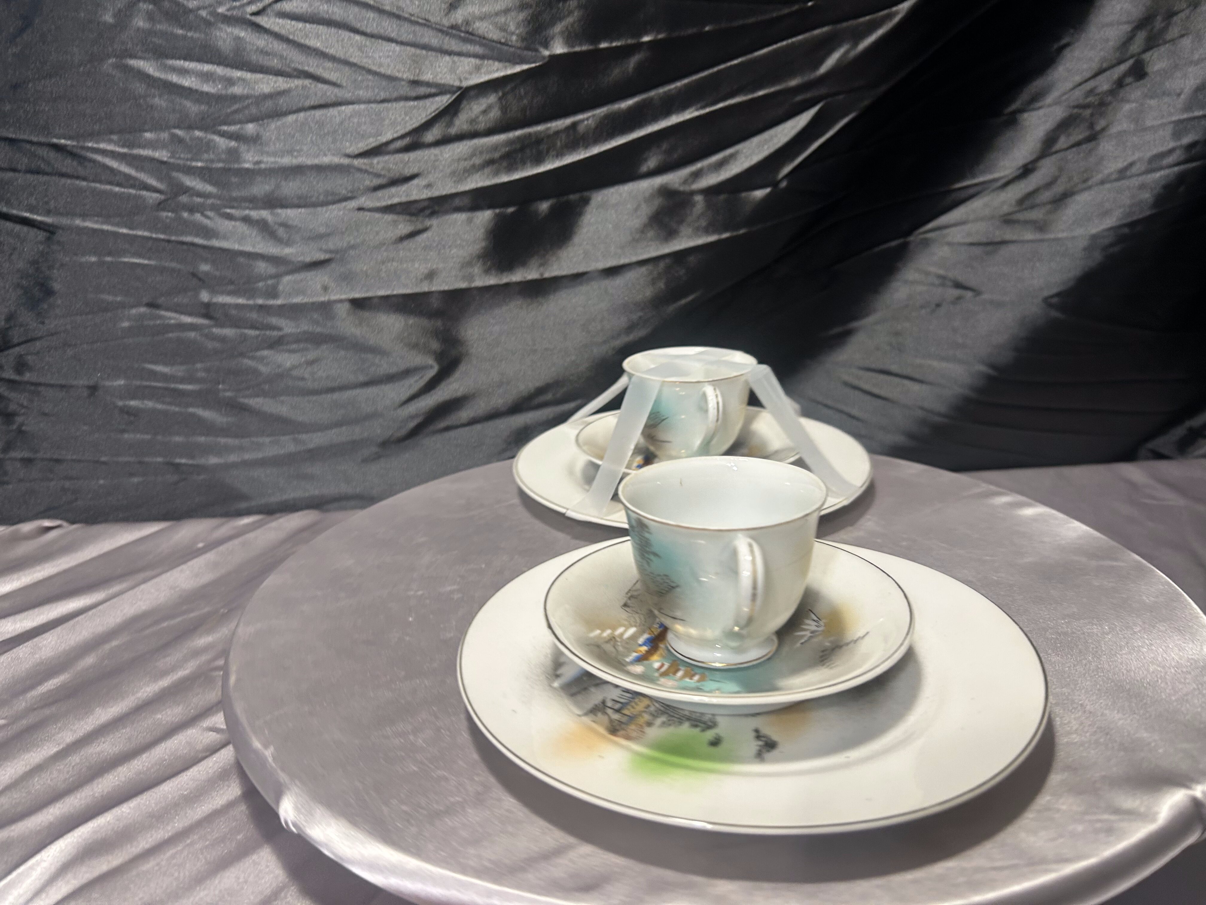 Elegancki zestaw dwóch filiżanek typu TRIO, pochodzący z Japonii, utrzymany w klasycznym stylu Kutani. Każdy zestaw składa się z filiżanki, spodka oraz talerzyka deserowego. Porcelana zdobiona subtelną sceną krajobrazową z pagodą, górami i roślinnością, z delikatnymi akcentami kolorystycznymi.