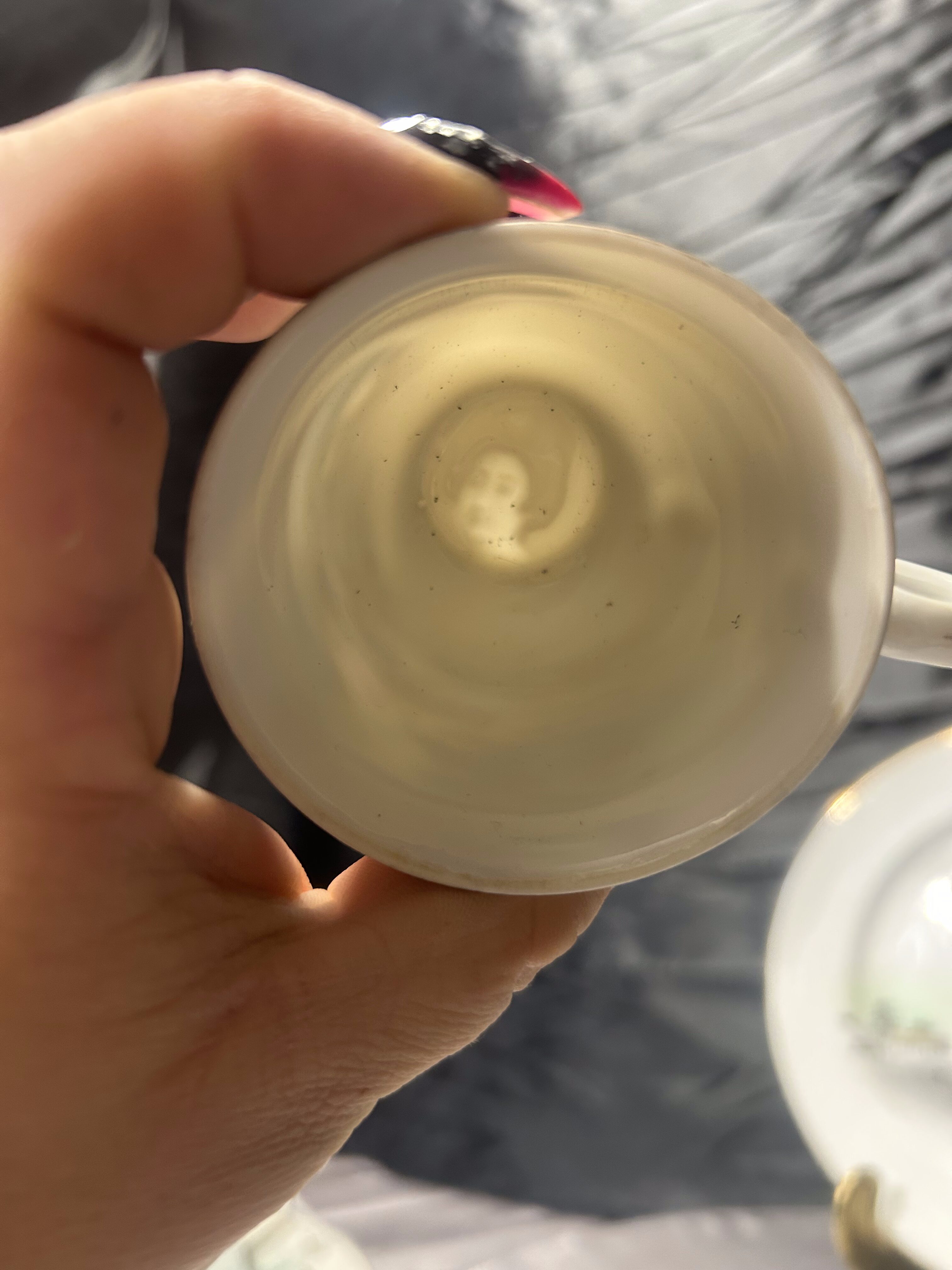 Pod światłem w filiżankach widoczny jest charakterystyczny efekt „prześwitu” typowy dla cienkiej, dobrej jakości porcelany. Całość prezentuje się bardzo elegancko i kolekcjonersko.