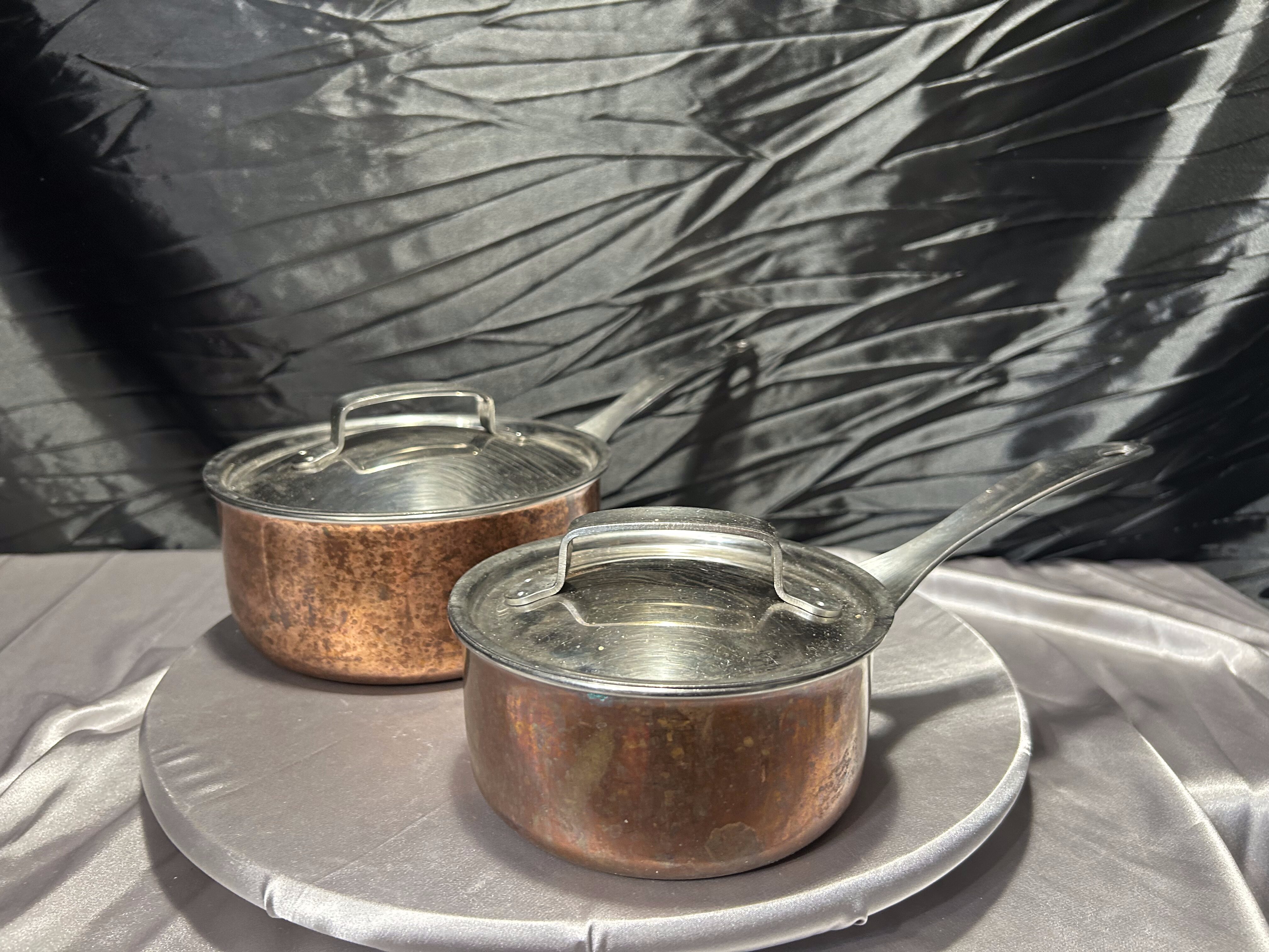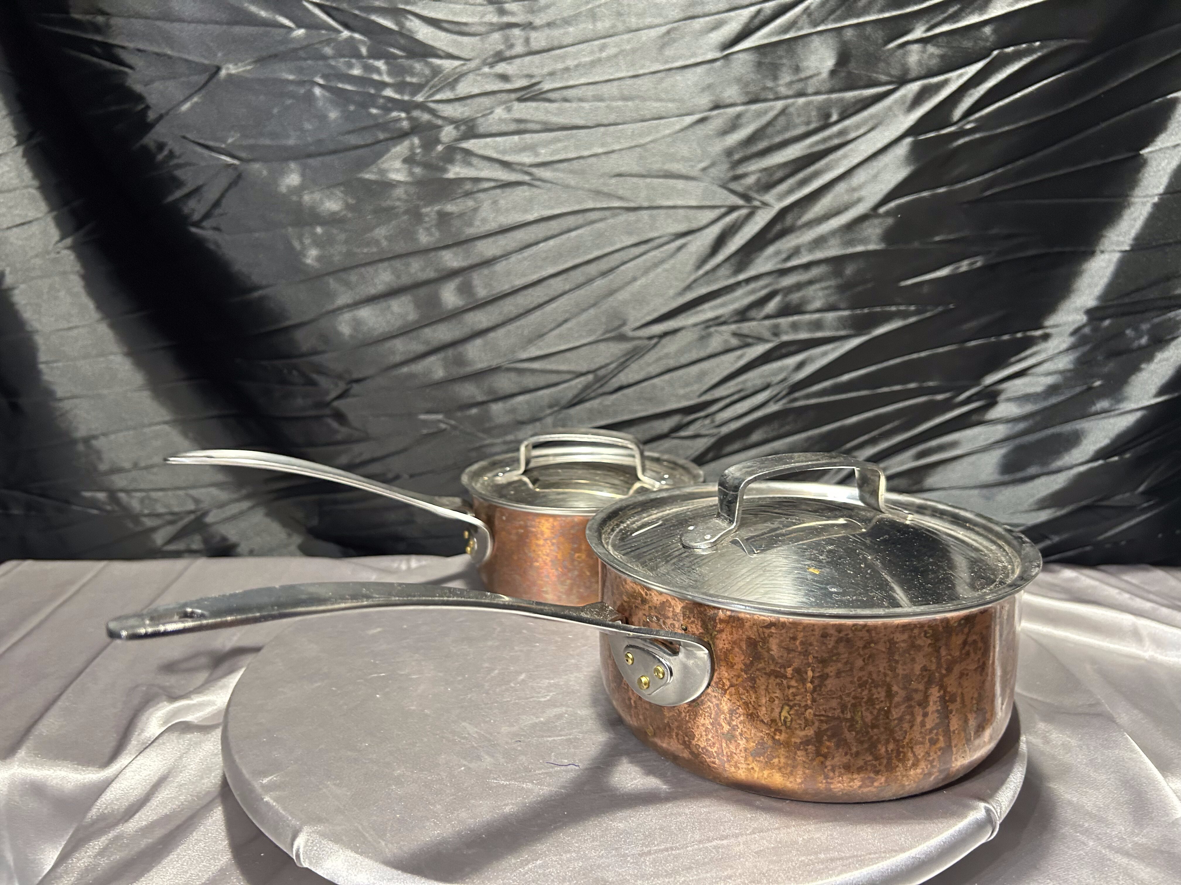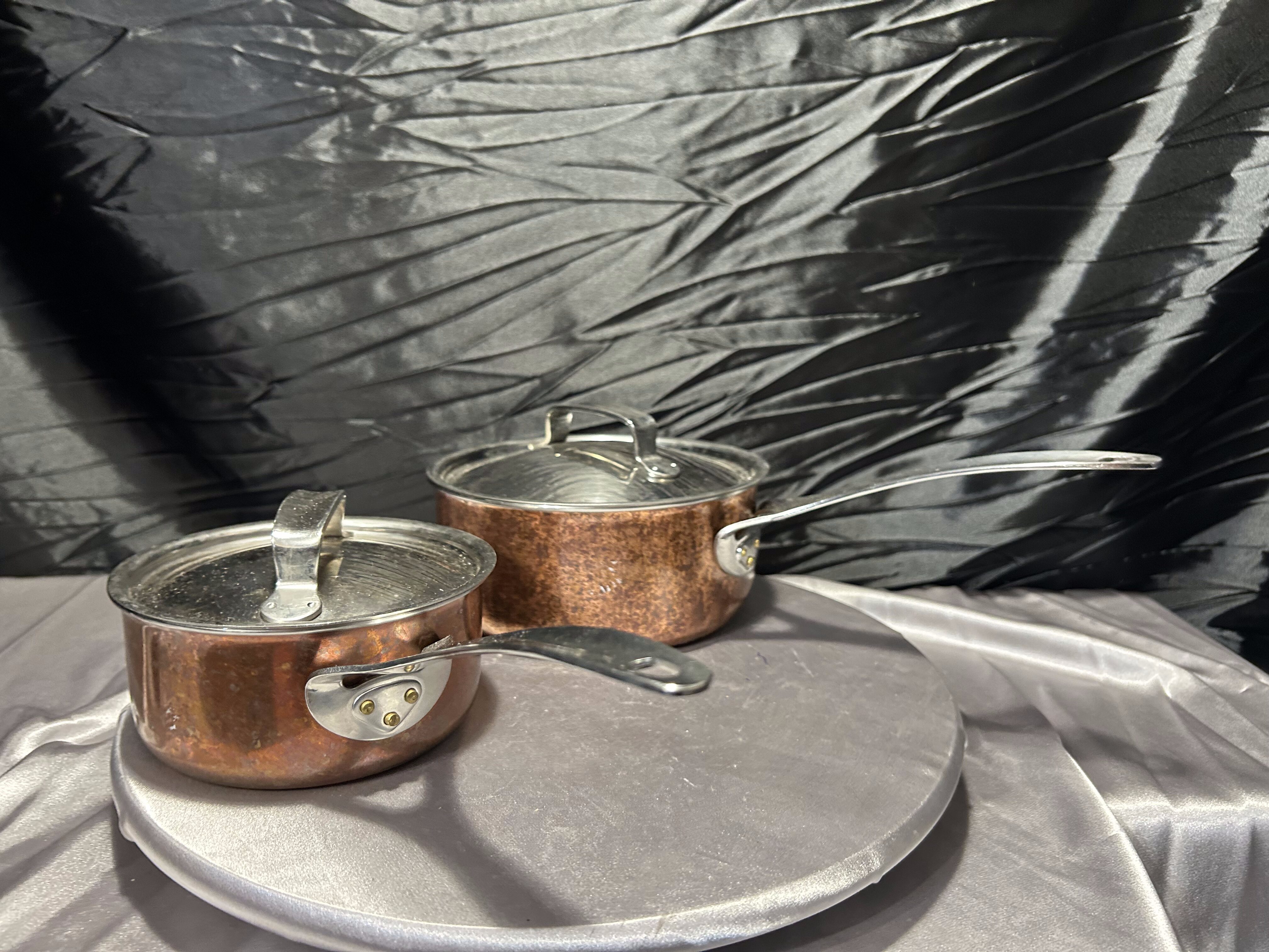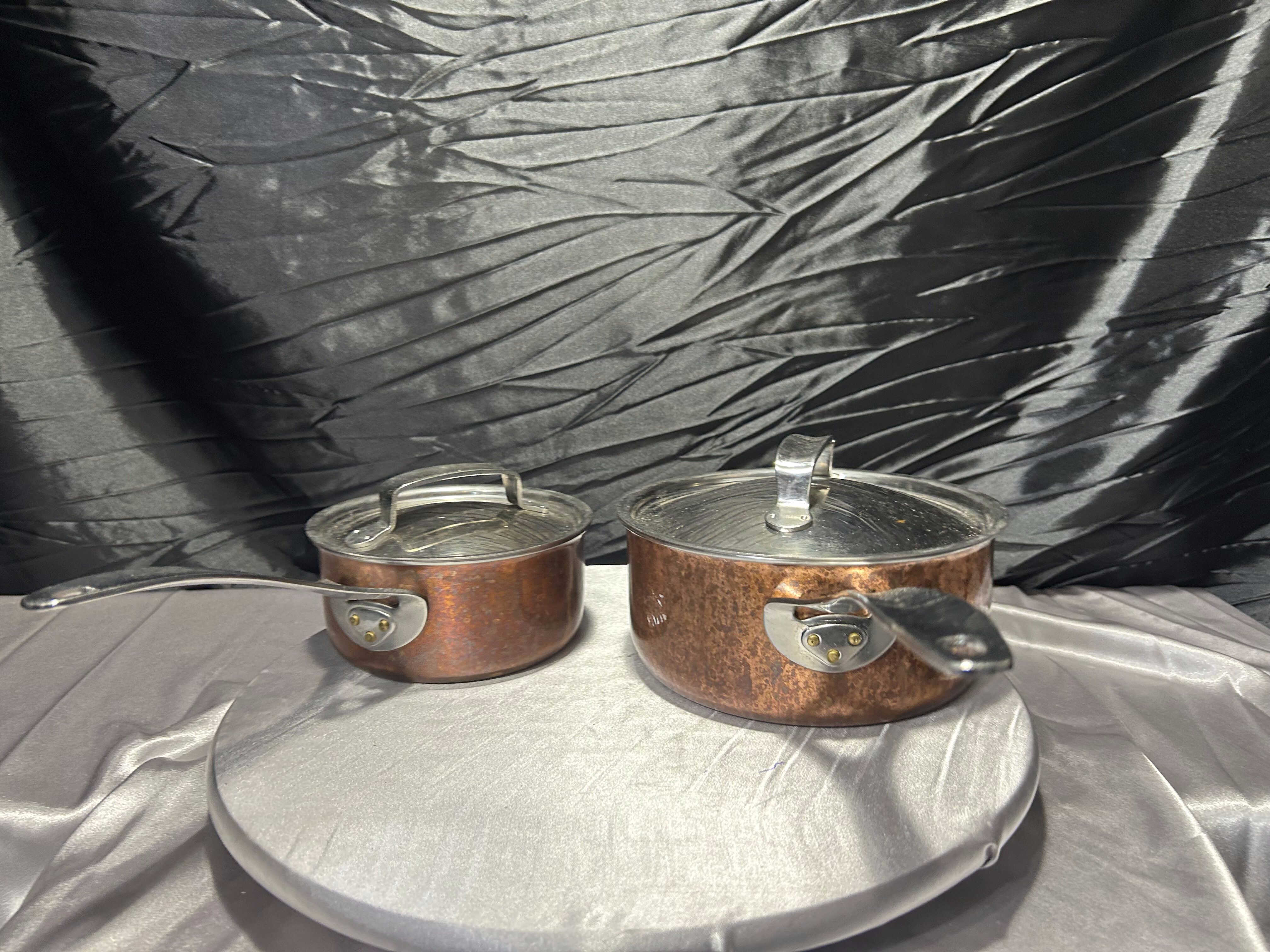 - Zestaw 2 garnków miedzianych Polaris z pokrywkami – sygnowany komplet kuchenny