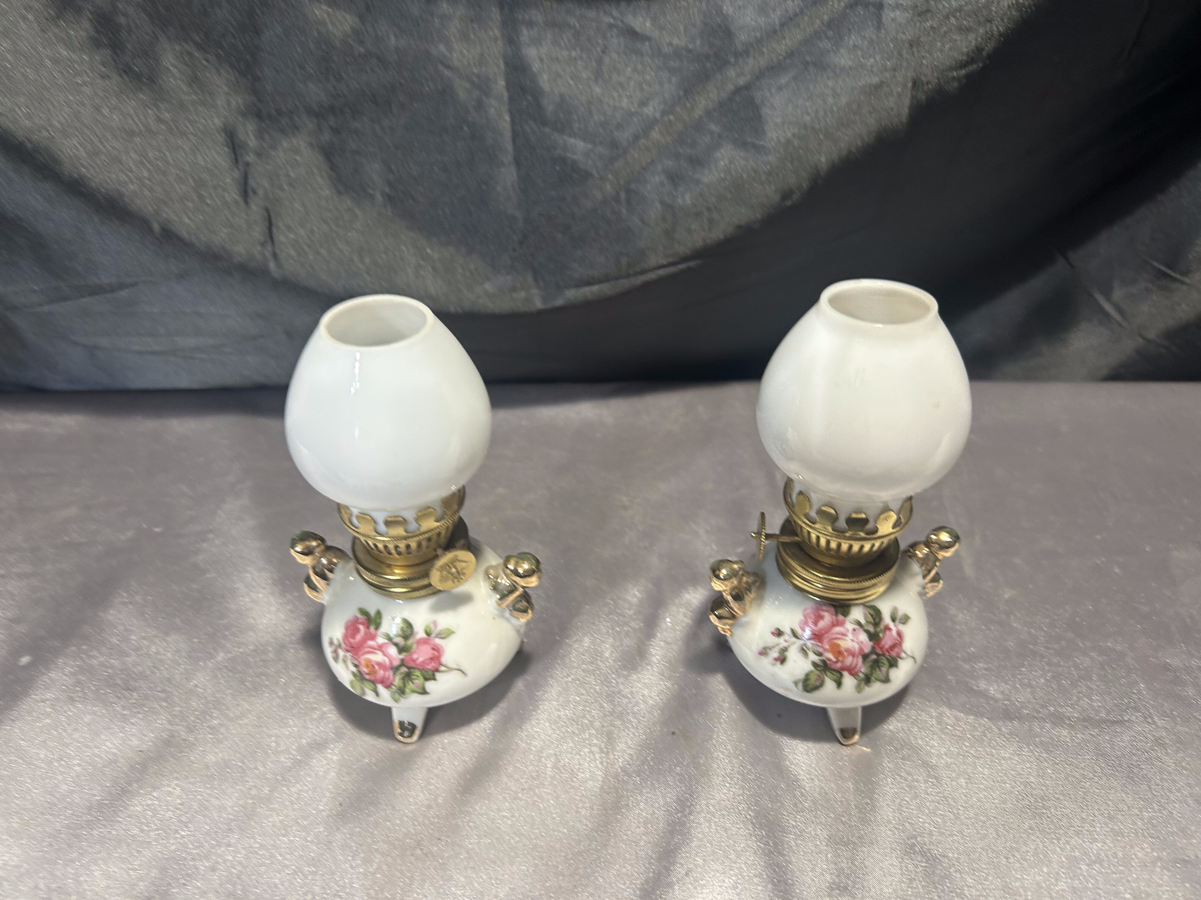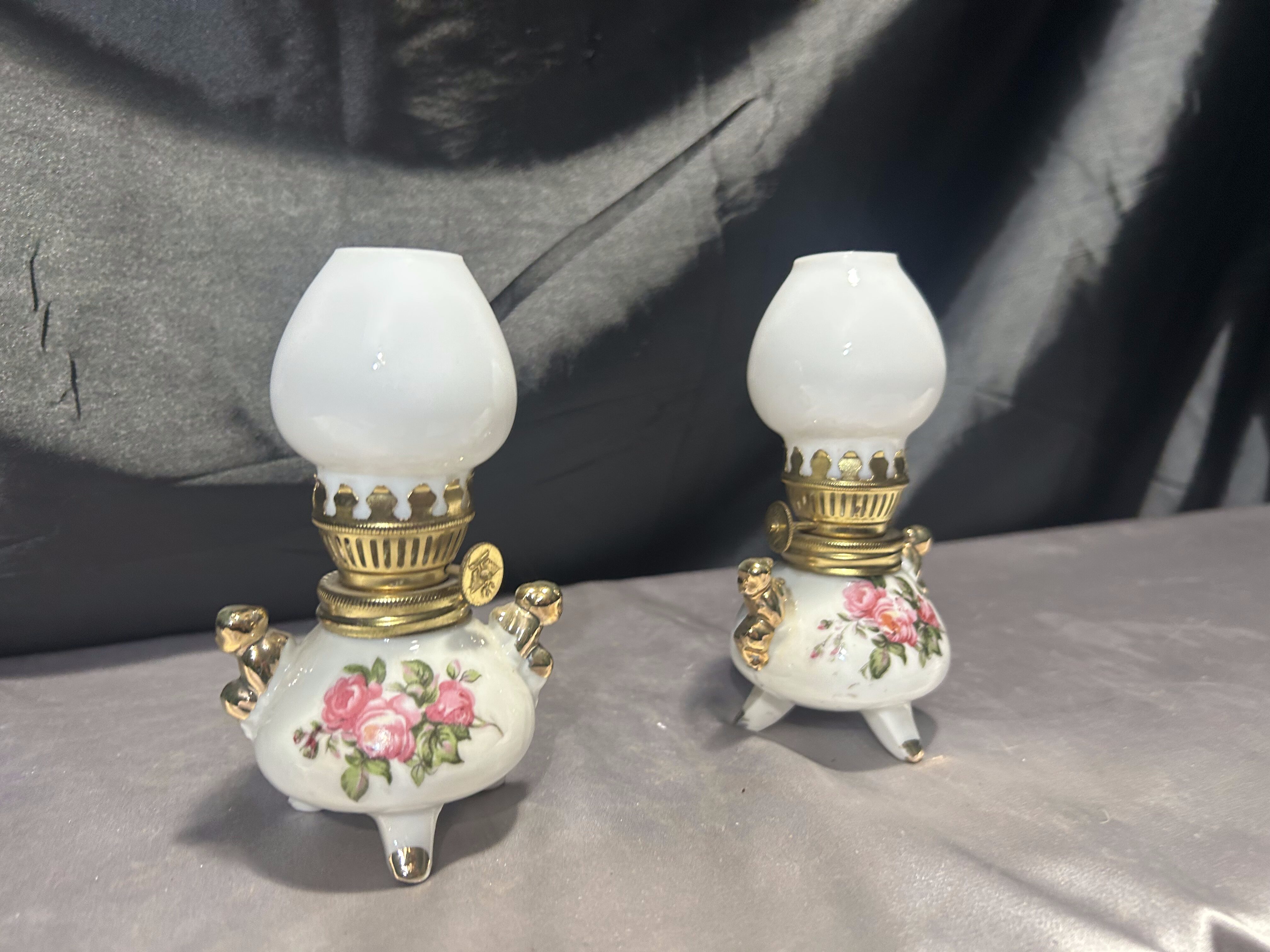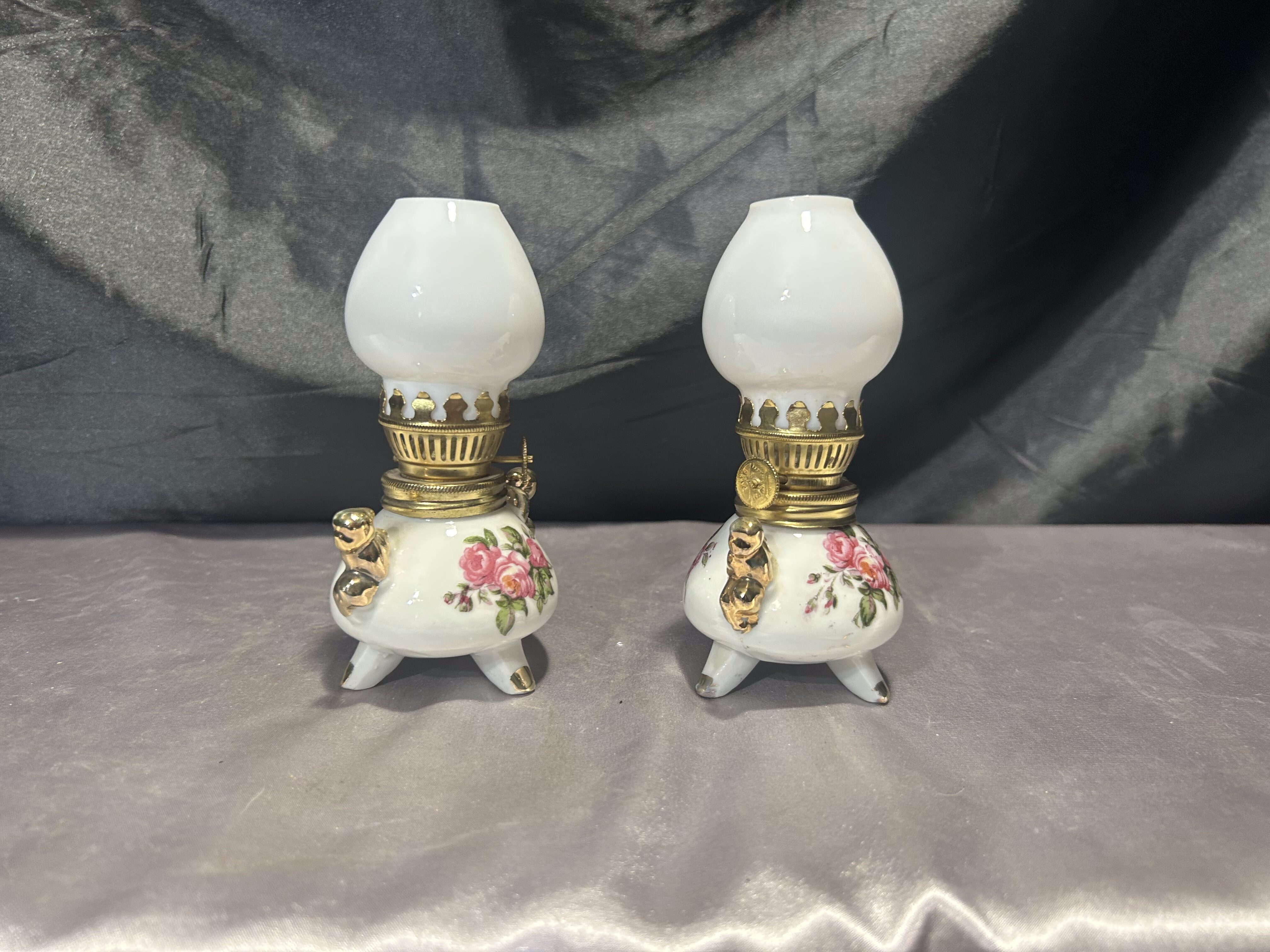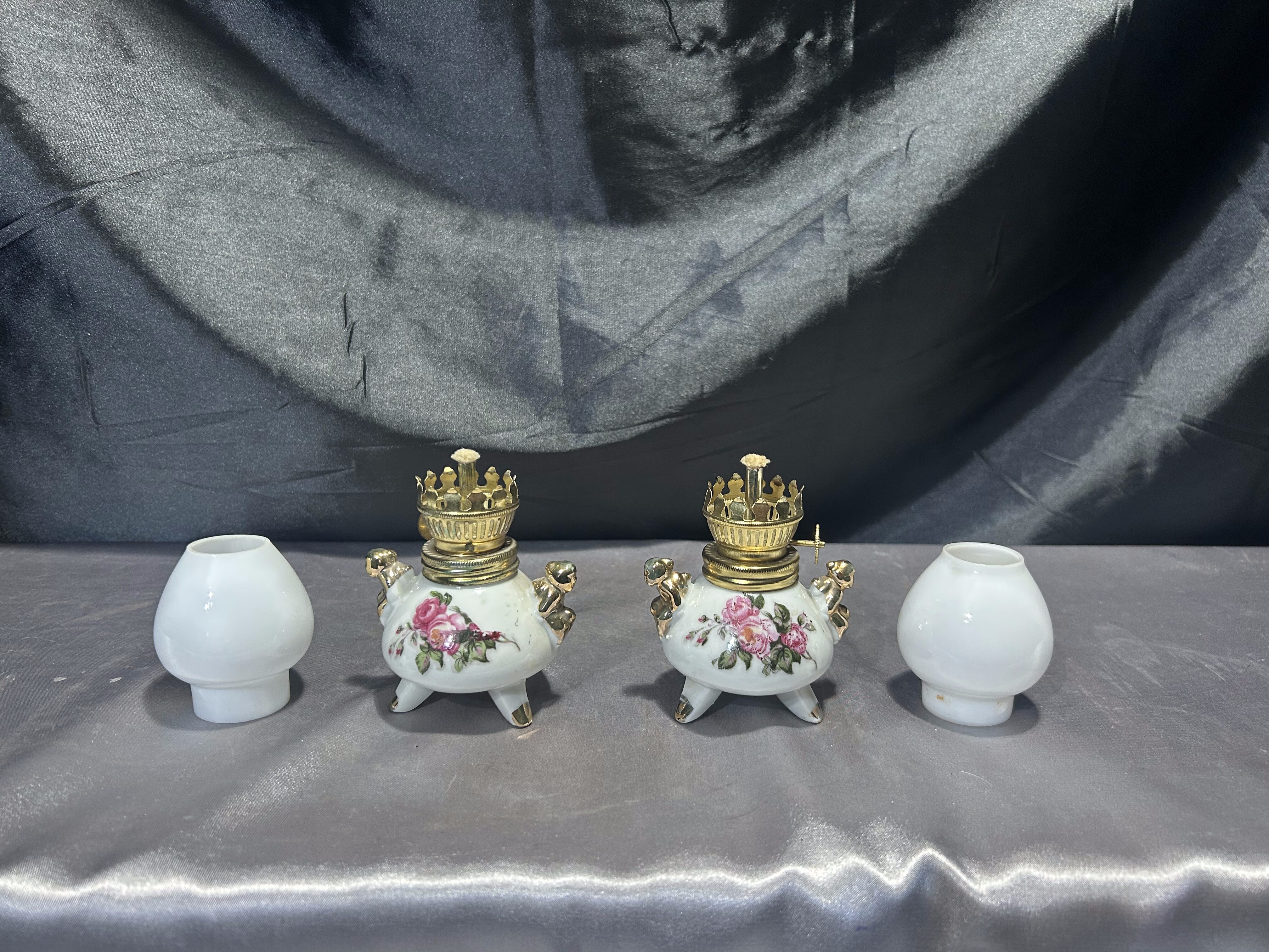 - Zestaw 2 Lamp Naftowych – Białe z Różowymi Różami i Złotymi Zdobieniami – Sprawne