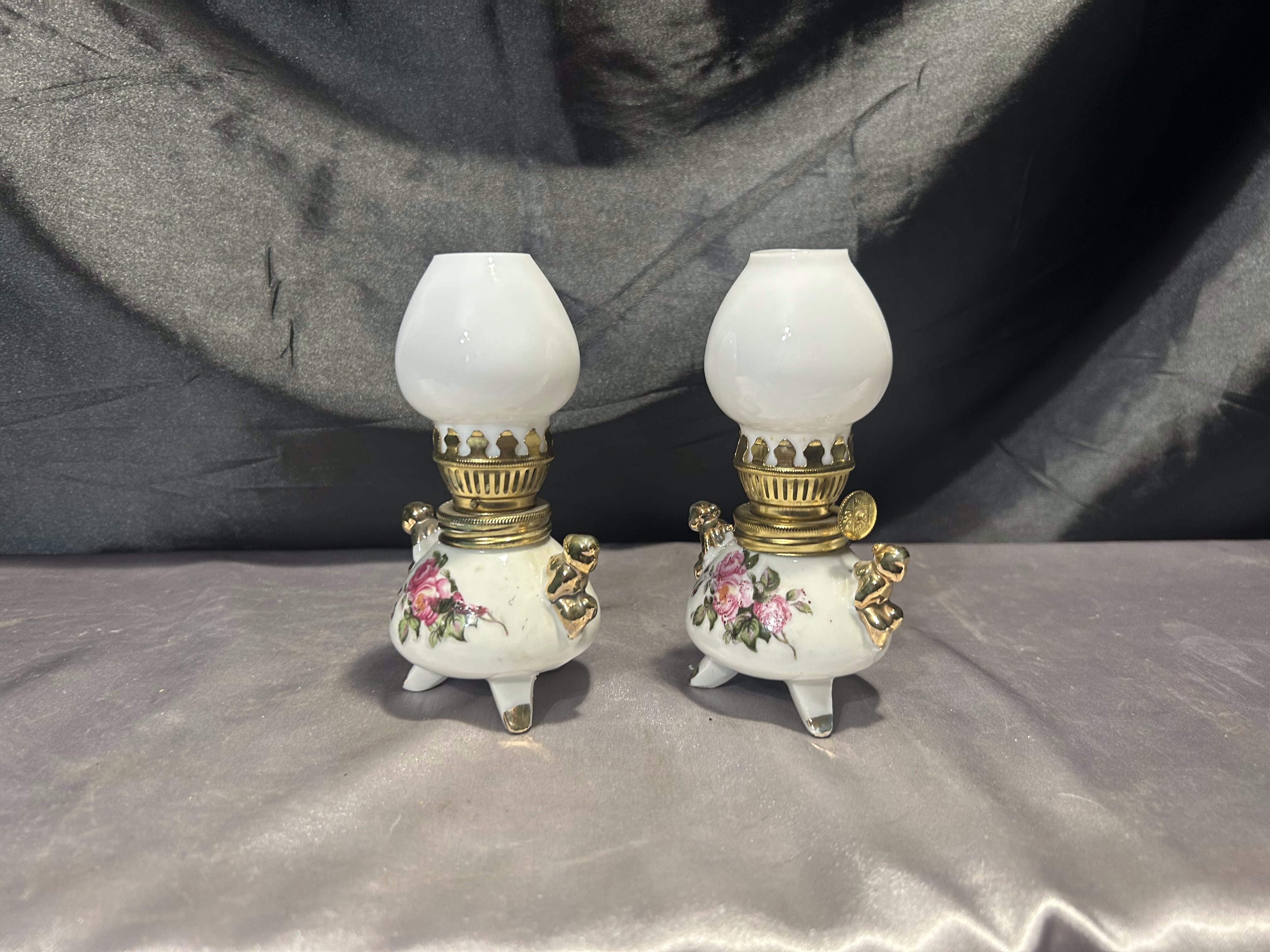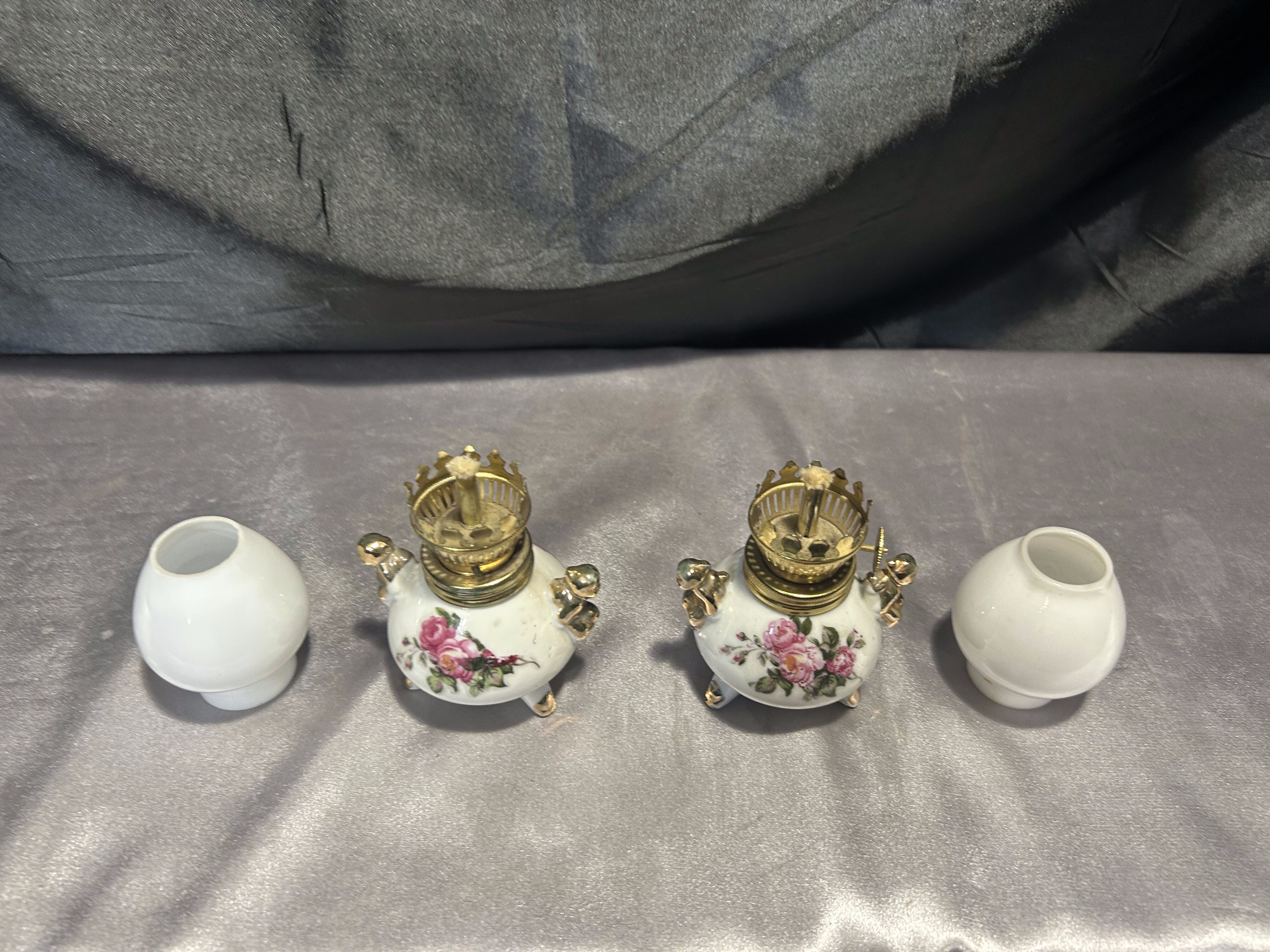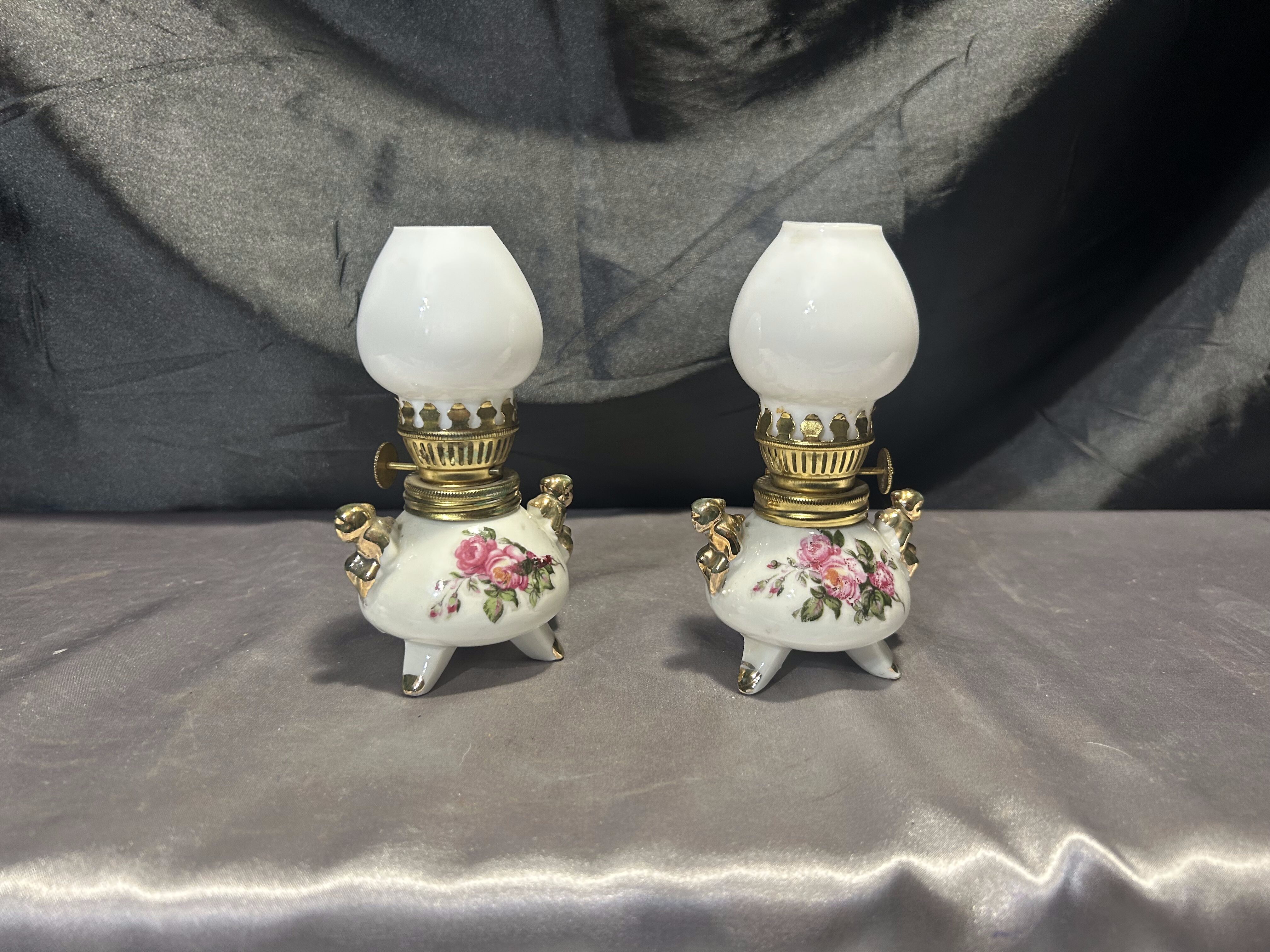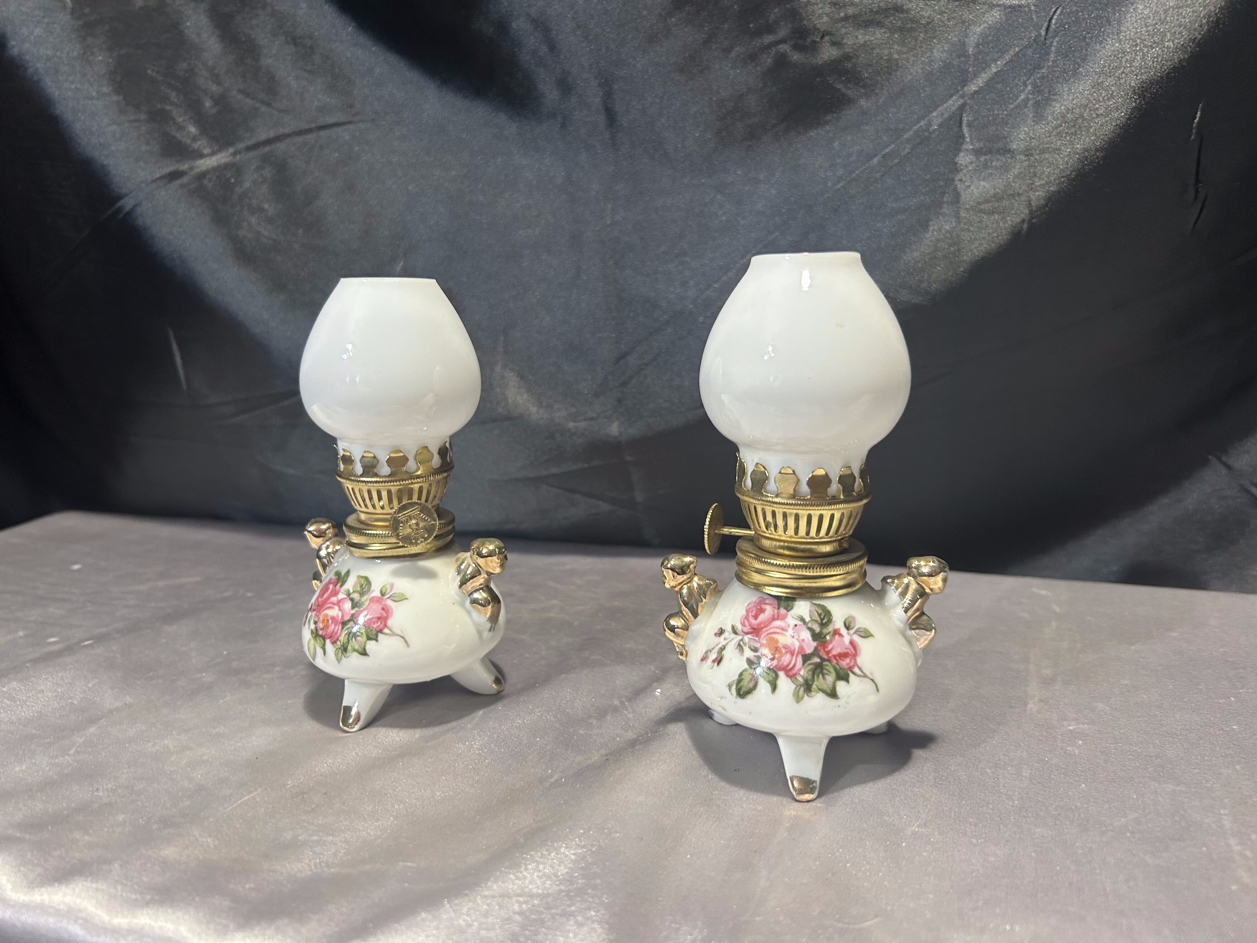 - Zestaw 2 Lamp Naftowych – Białe z Różowymi Różami i Złotymi Zdobieniami – Sprawne