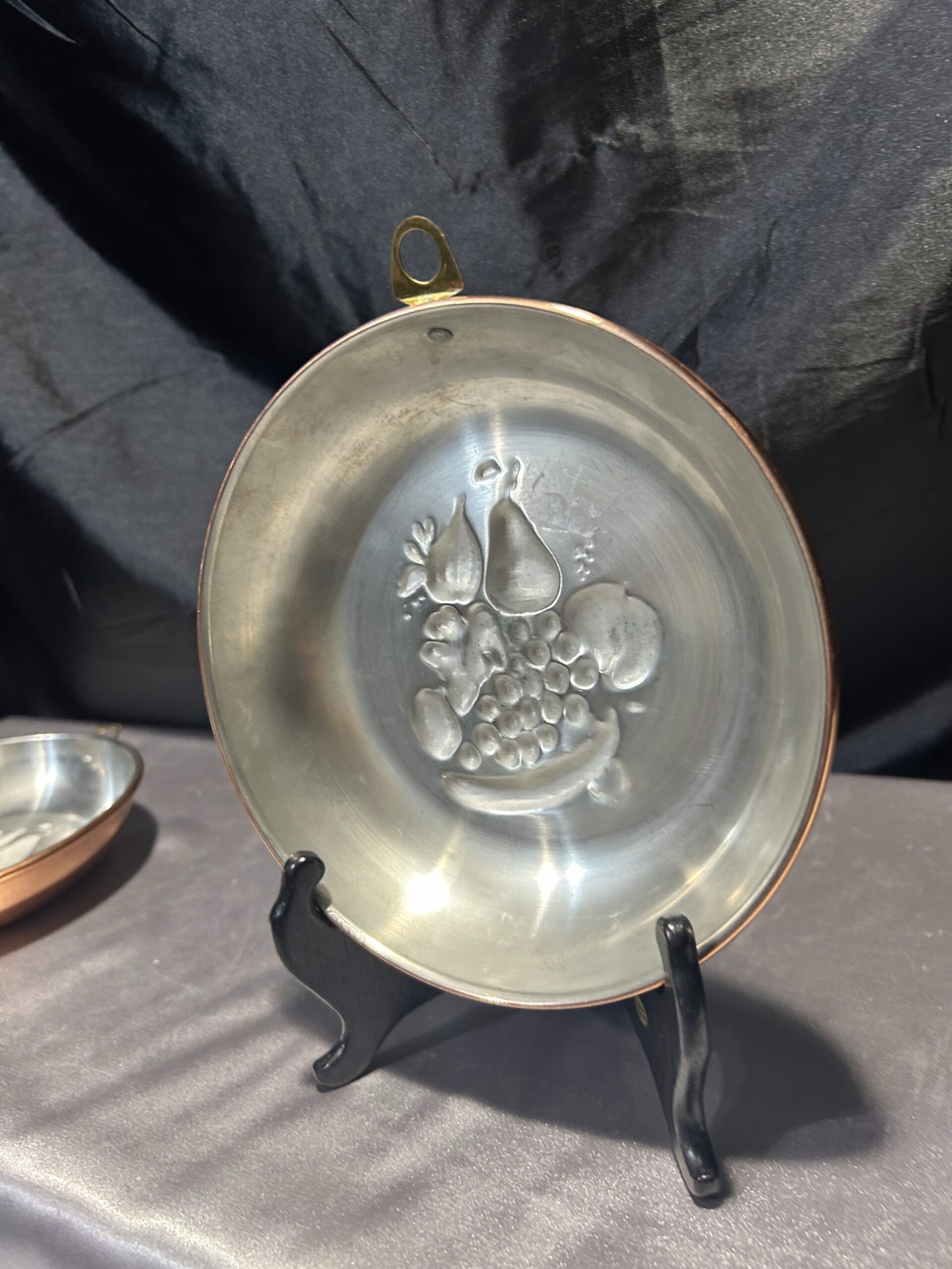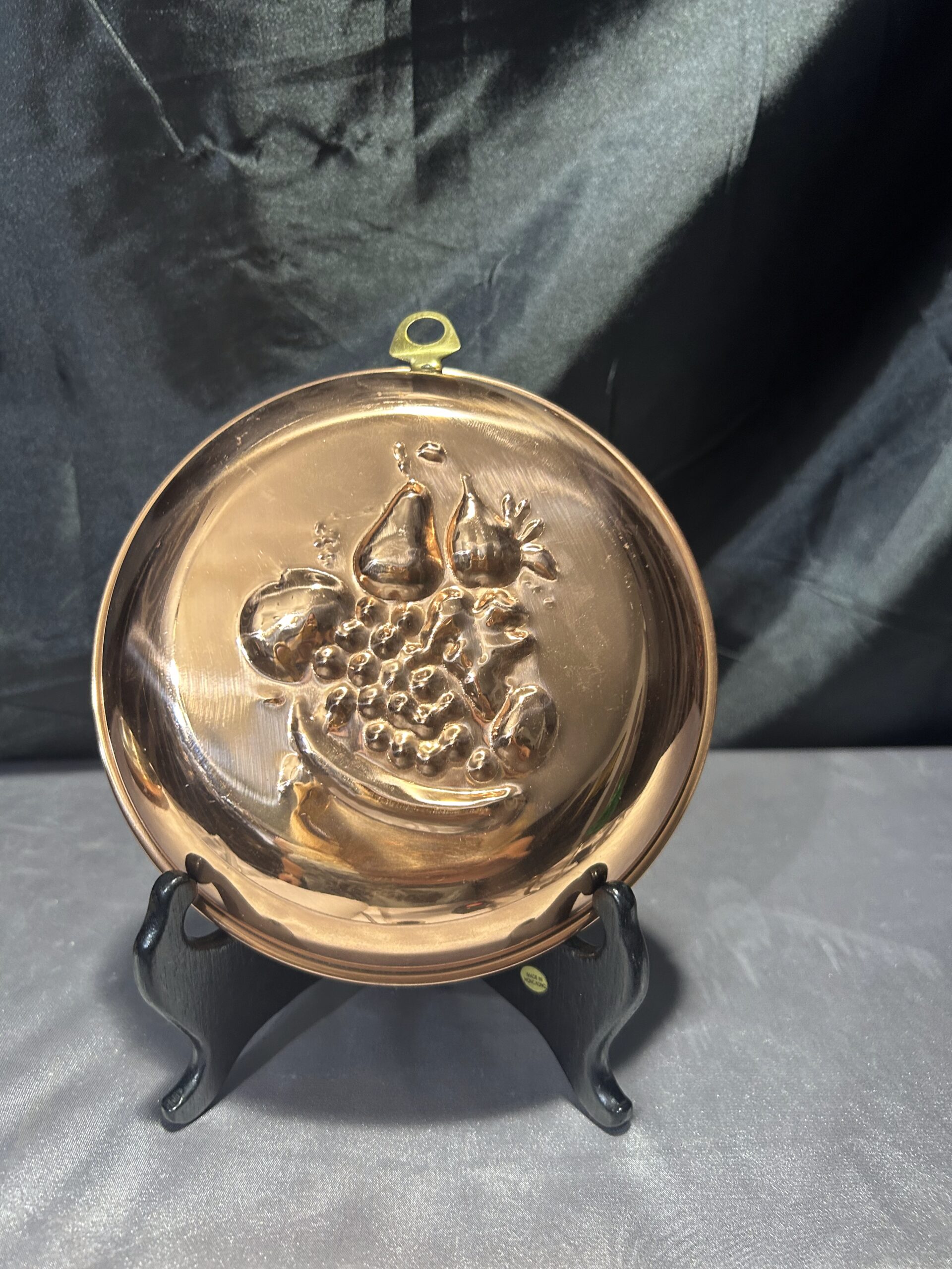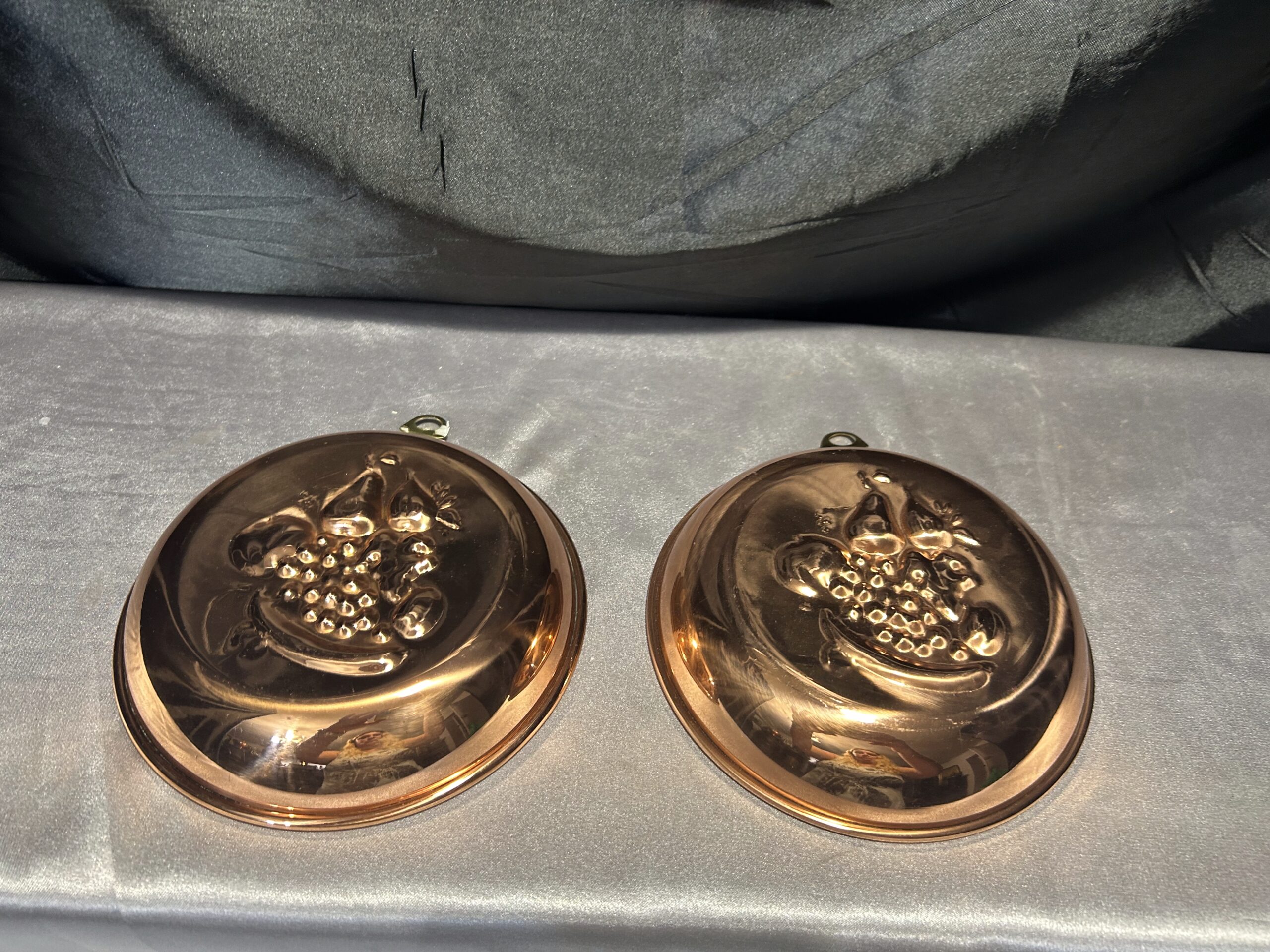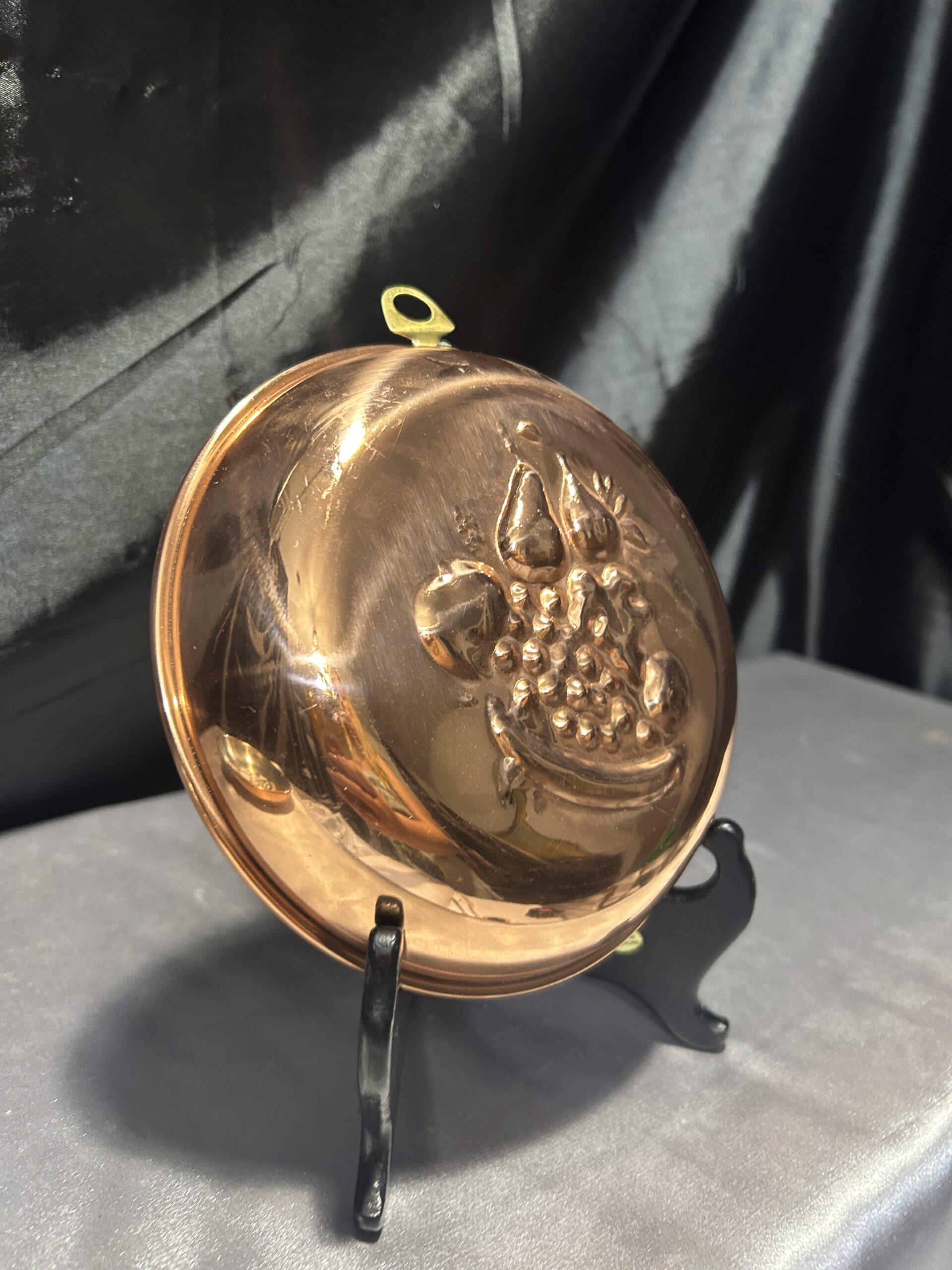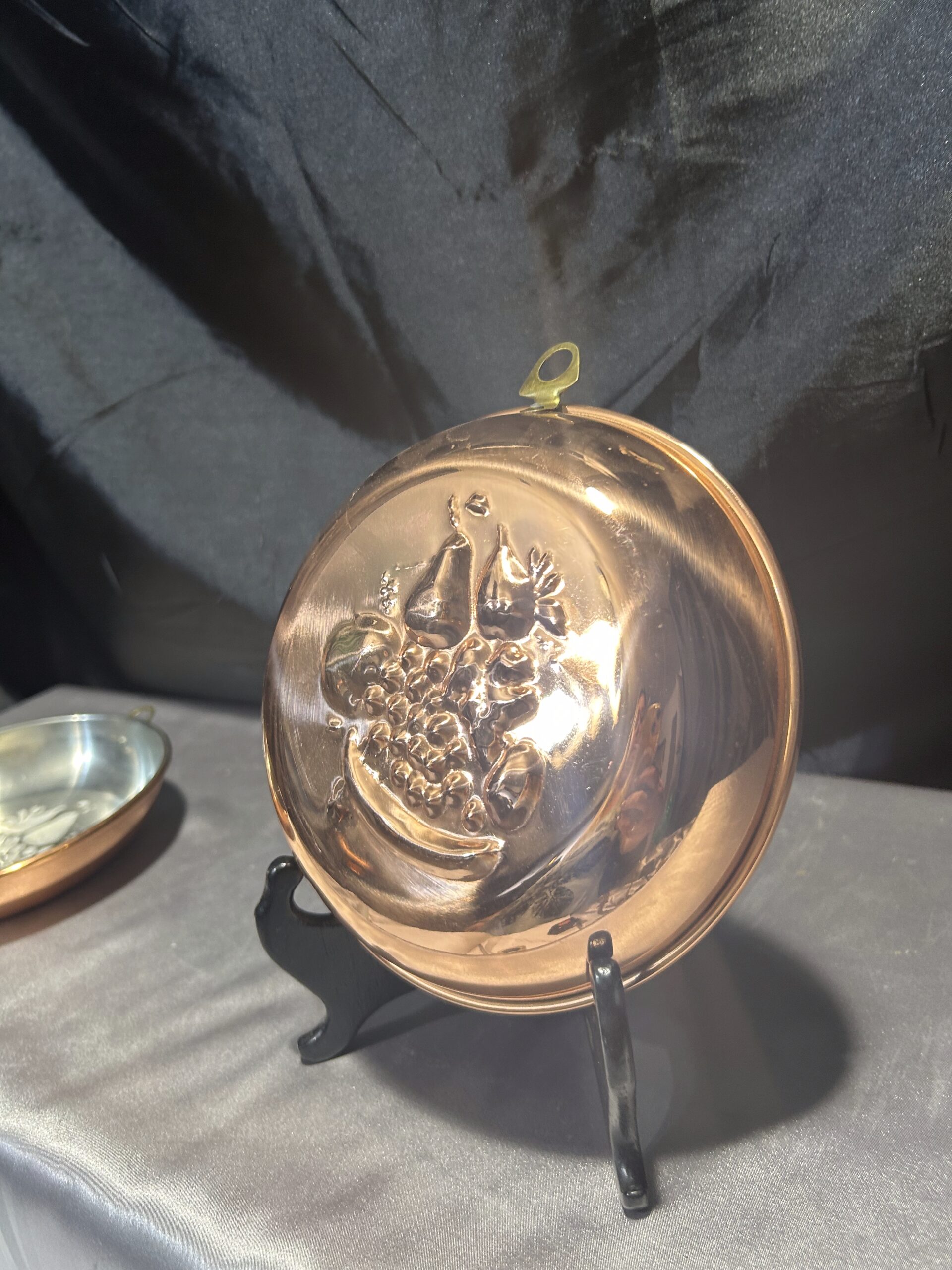 Piękny komplet dwóch miedzianych foremek na ciasto, ozdobionych misternie tłoczonym motywem owoców: jabłek, gruszek i winogron. Dzięki kółeczku foremki mogą być zawieszone na ścianie, pełniąc funkcję zarówno użytkową, jak i dekoracyjną. Ich klasyczny, elegancki wygląd sprawia, że doskonale komponują się w kuchniach urządzonych w stylu vintage, rustykalnym i retro.