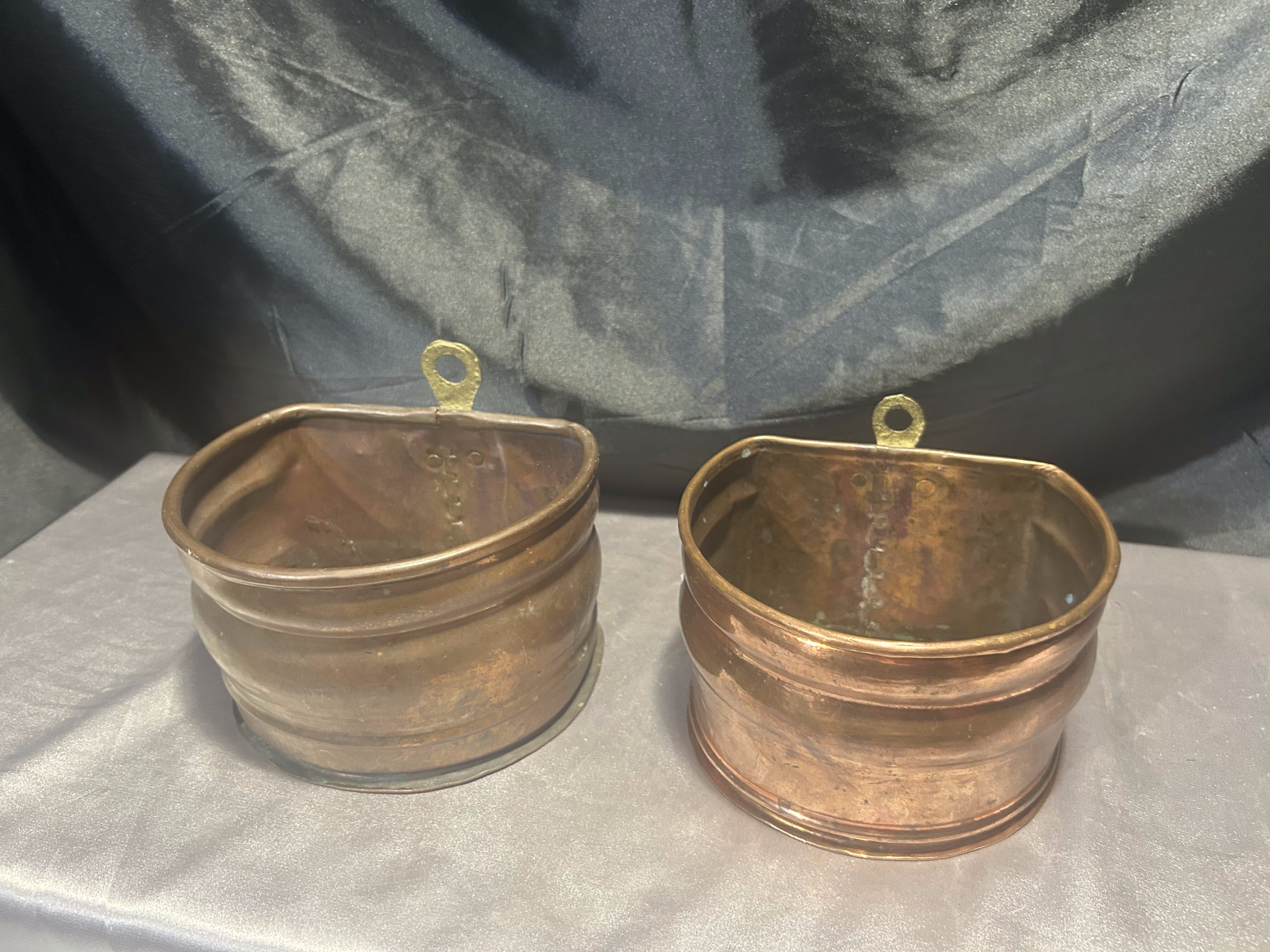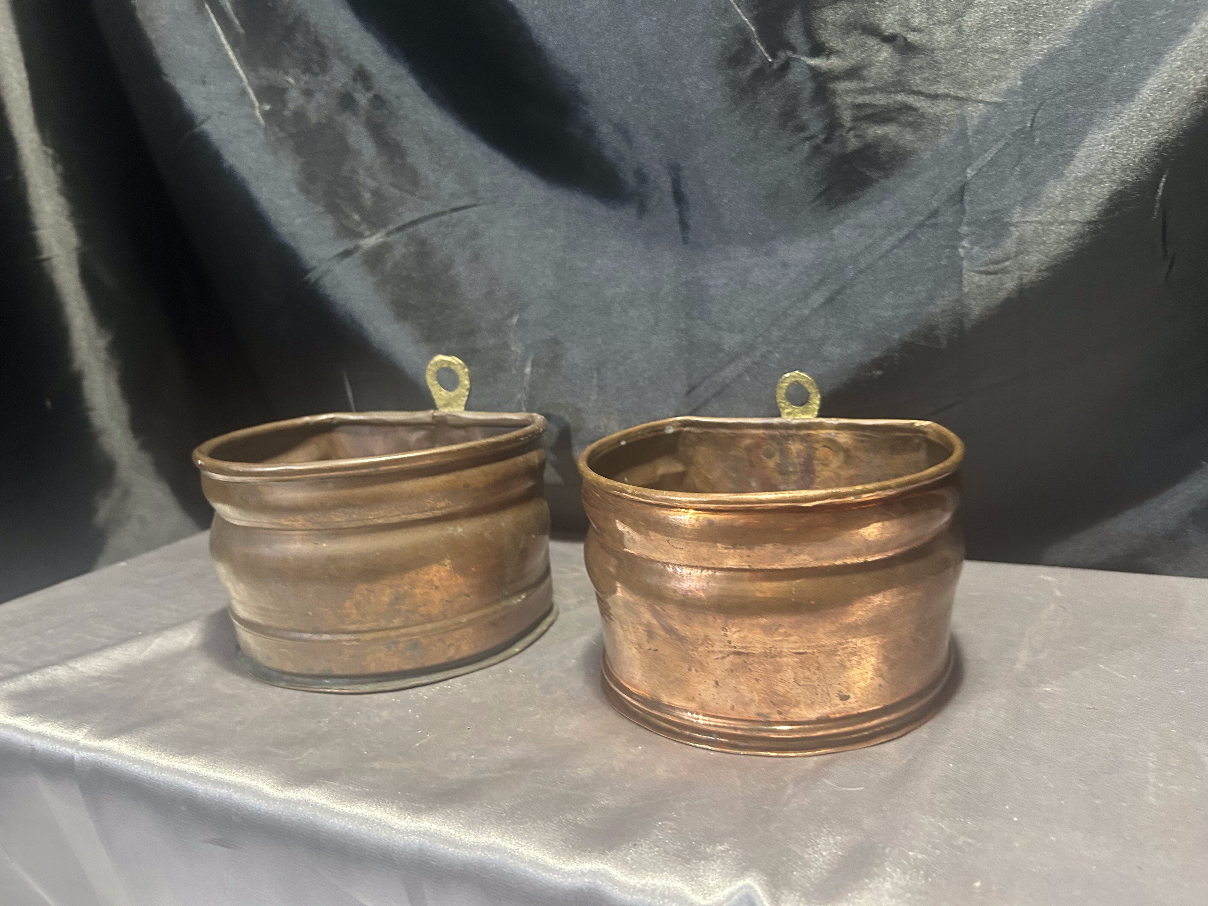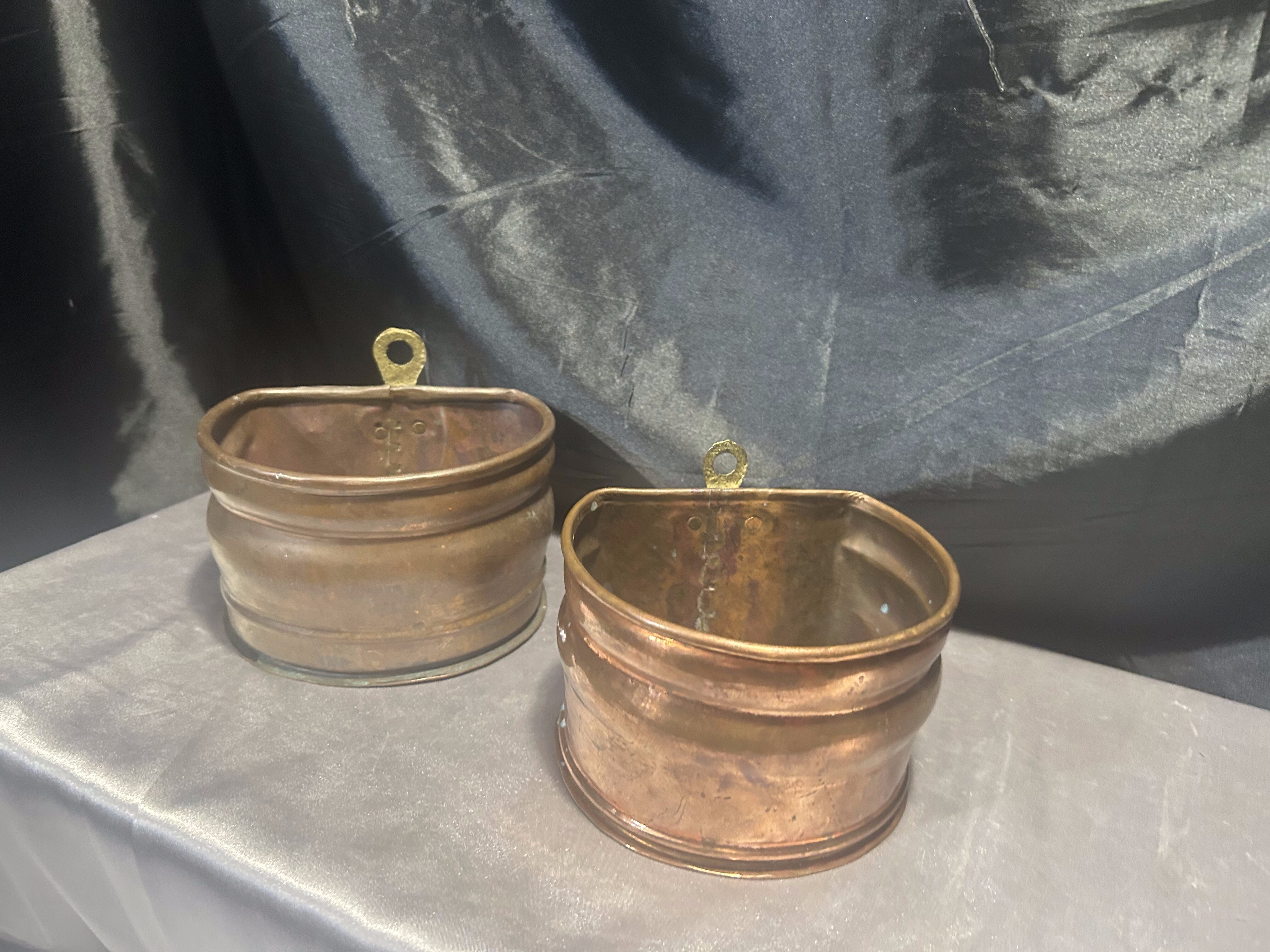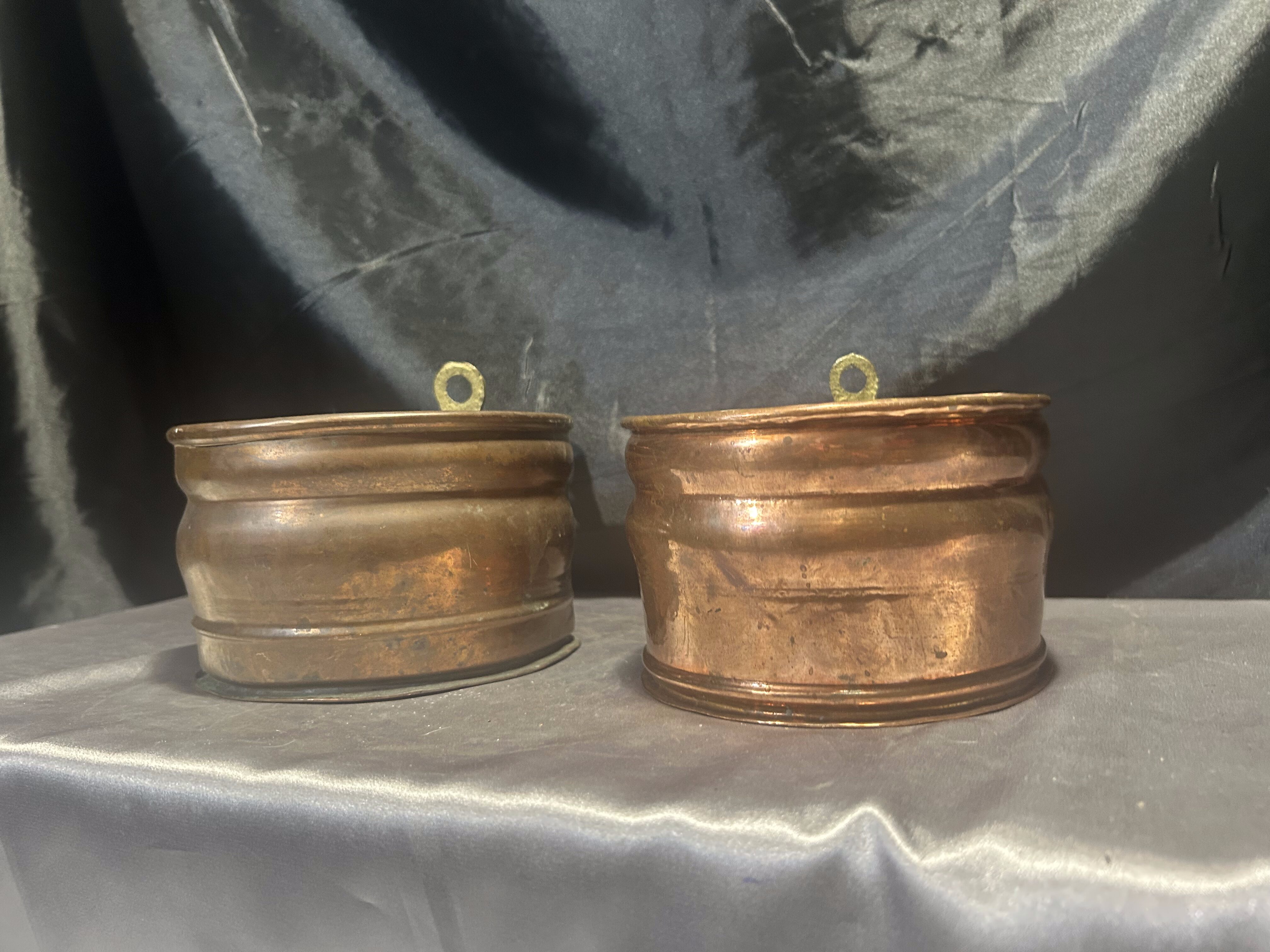 Na sprzedaż zestaw dwóch miedzianych kwietników ściennych, wyposażonych w mosiężne oczka do zawieszenia, które umożliwiają łatwy montaż na ścianie. Kwietniki różnią się nieznacznie wymiarami, ale zachowują spójny styl – idealne do ekspozycji roślin, suszonych bukietów lub jako oryginalna dekoracja ścienna.