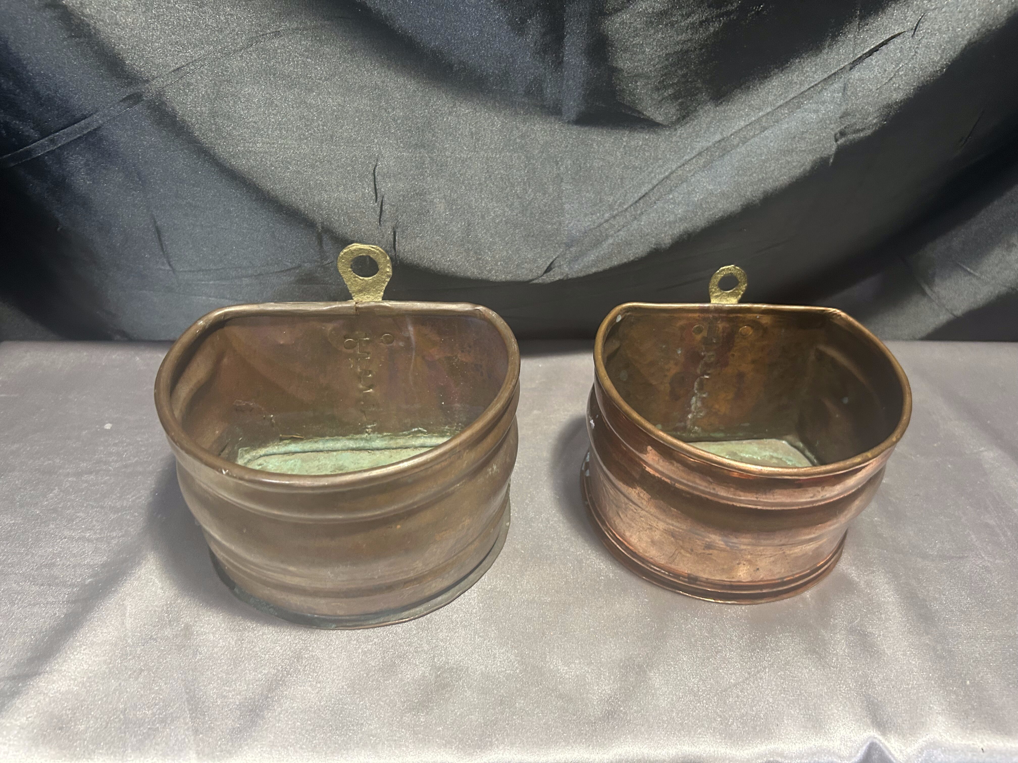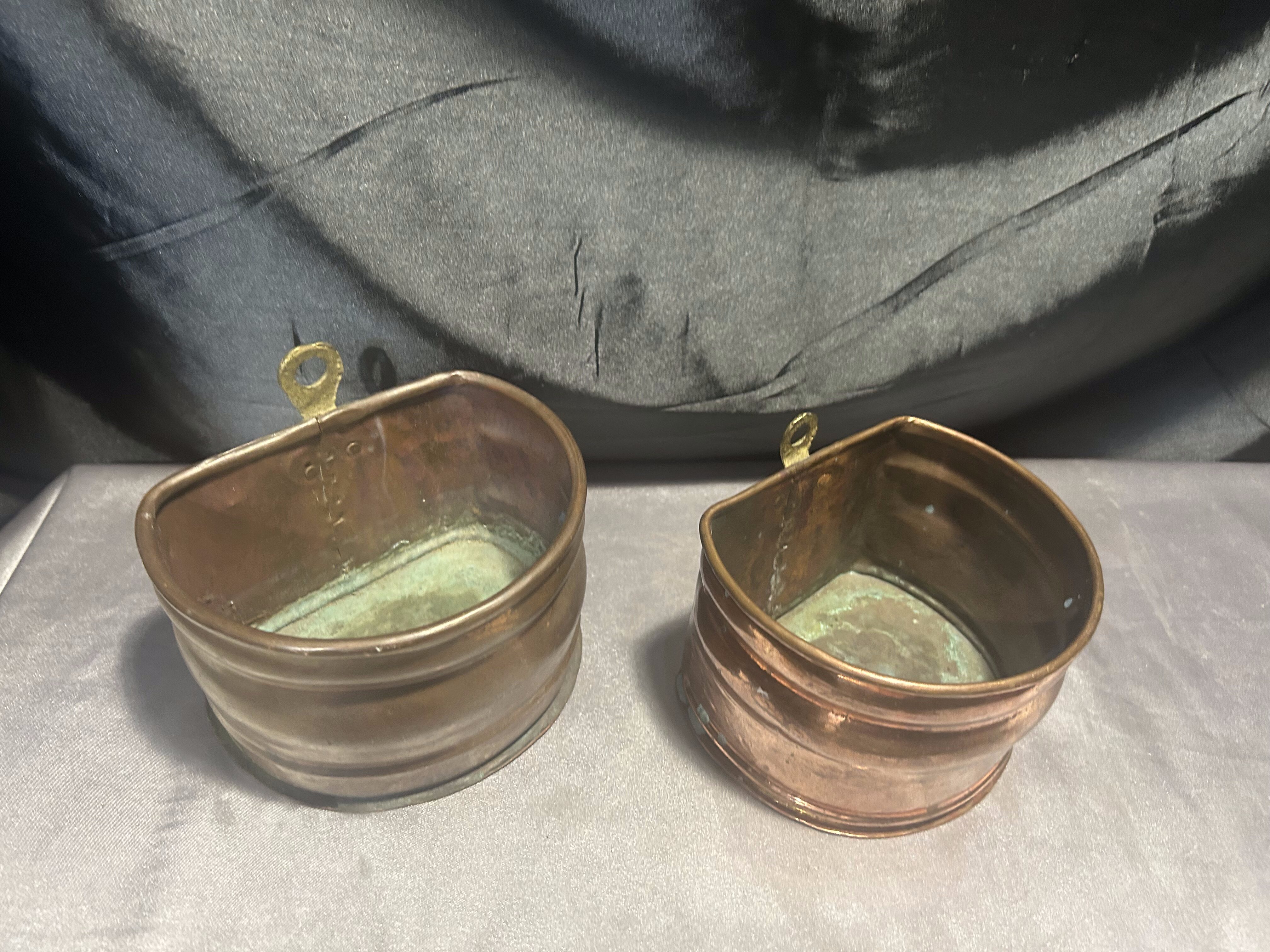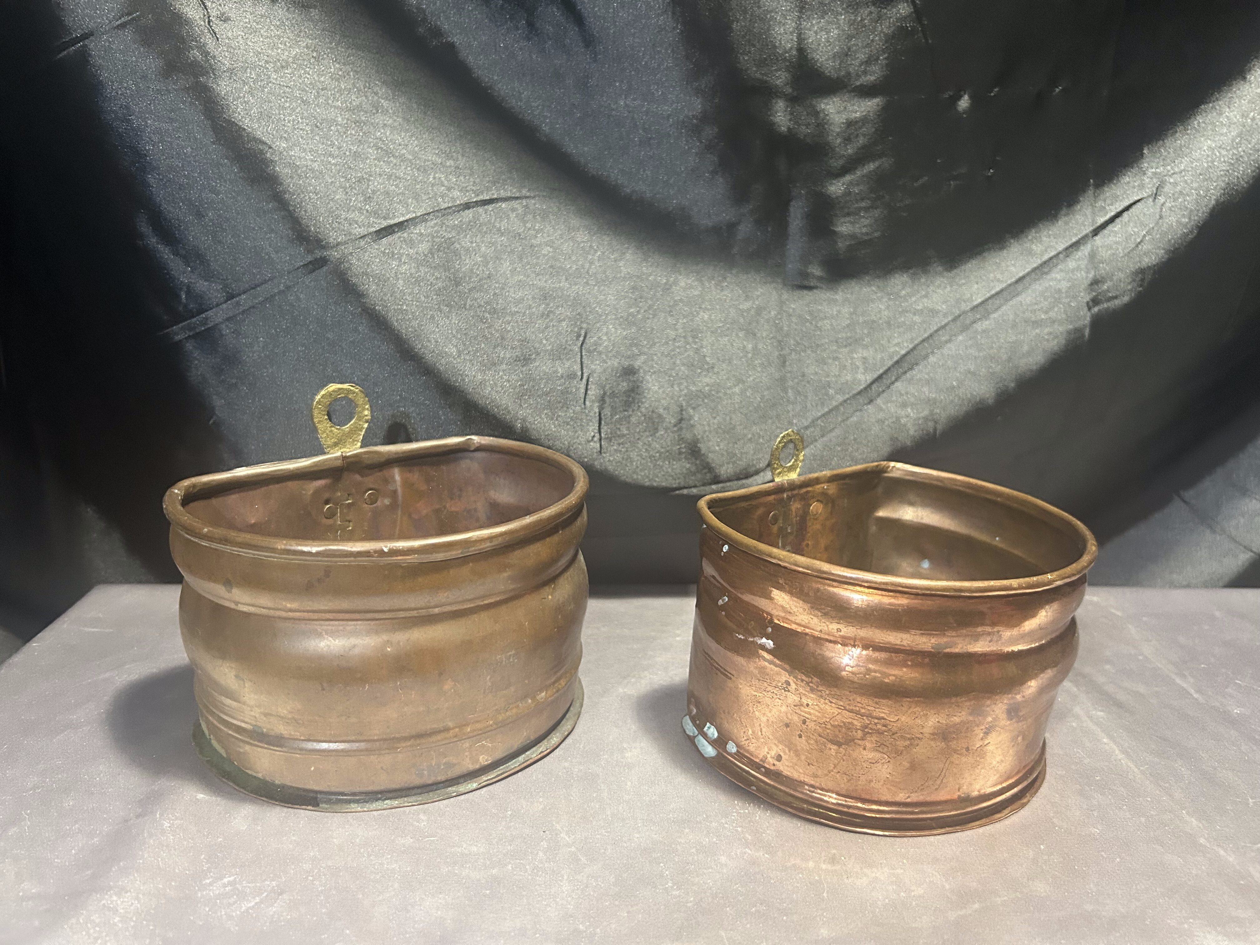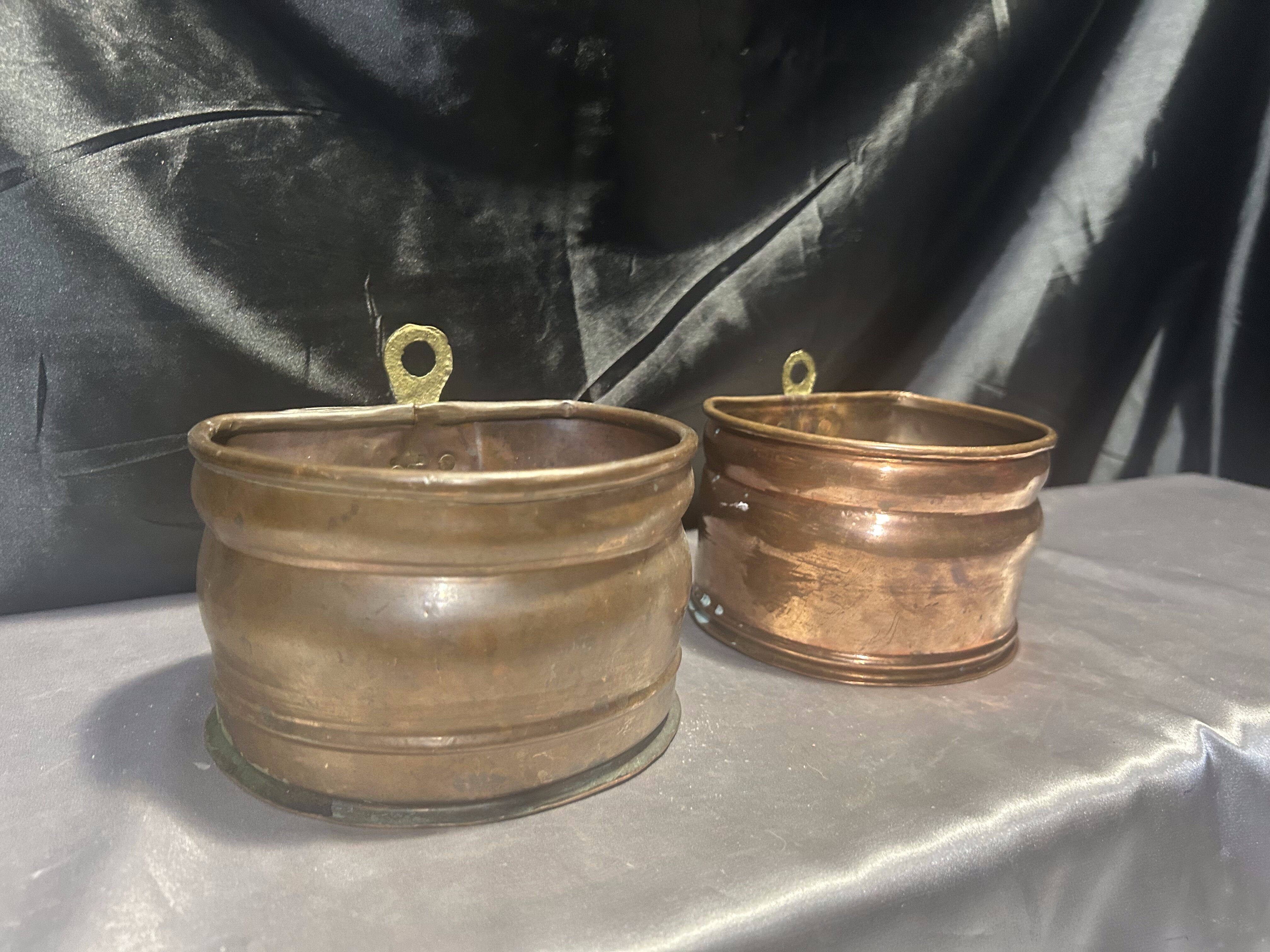 Na sprzedaż zestaw dwóch miedzianych kwietników ściennych, wyposażonych w mosiężne oczka do zawieszenia, które umożliwiają łatwy montaż na ścianie. Kwietniki różnią się nieznacznie wymiarami, ale zachowują spójny styl – idealne do ekspozycji roślin, suszonych bukietów lub jako oryginalna dekoracja ścienna.