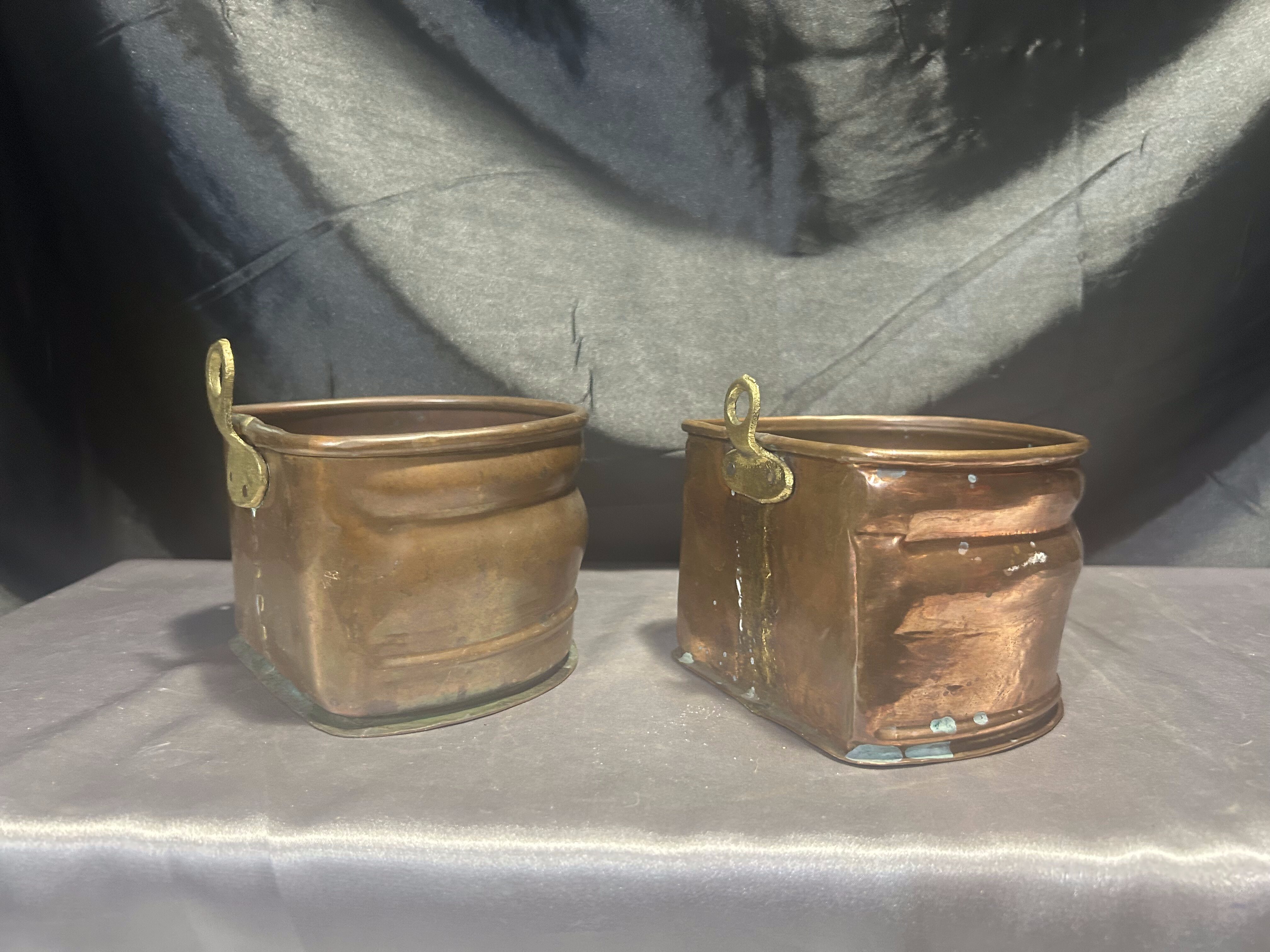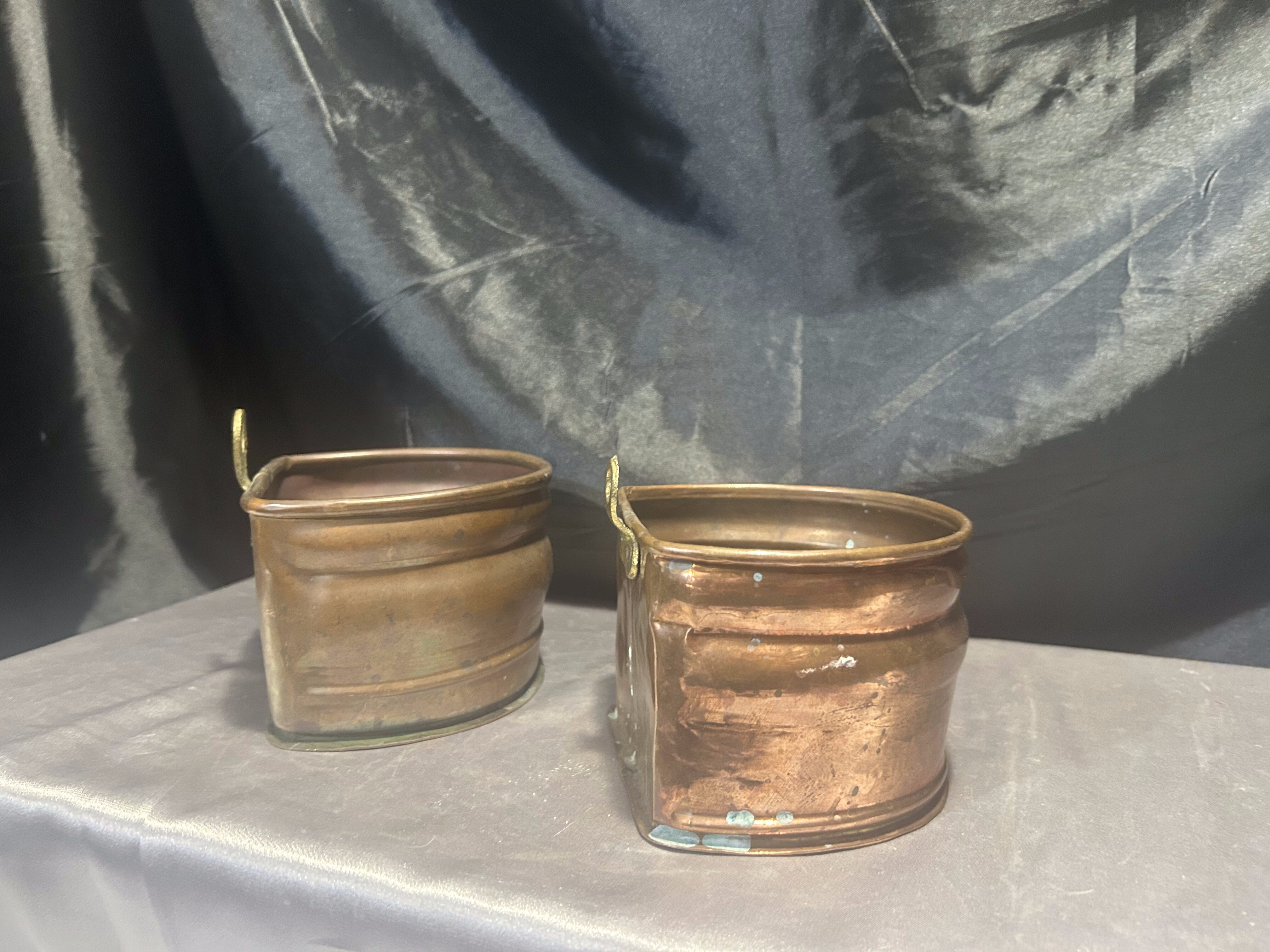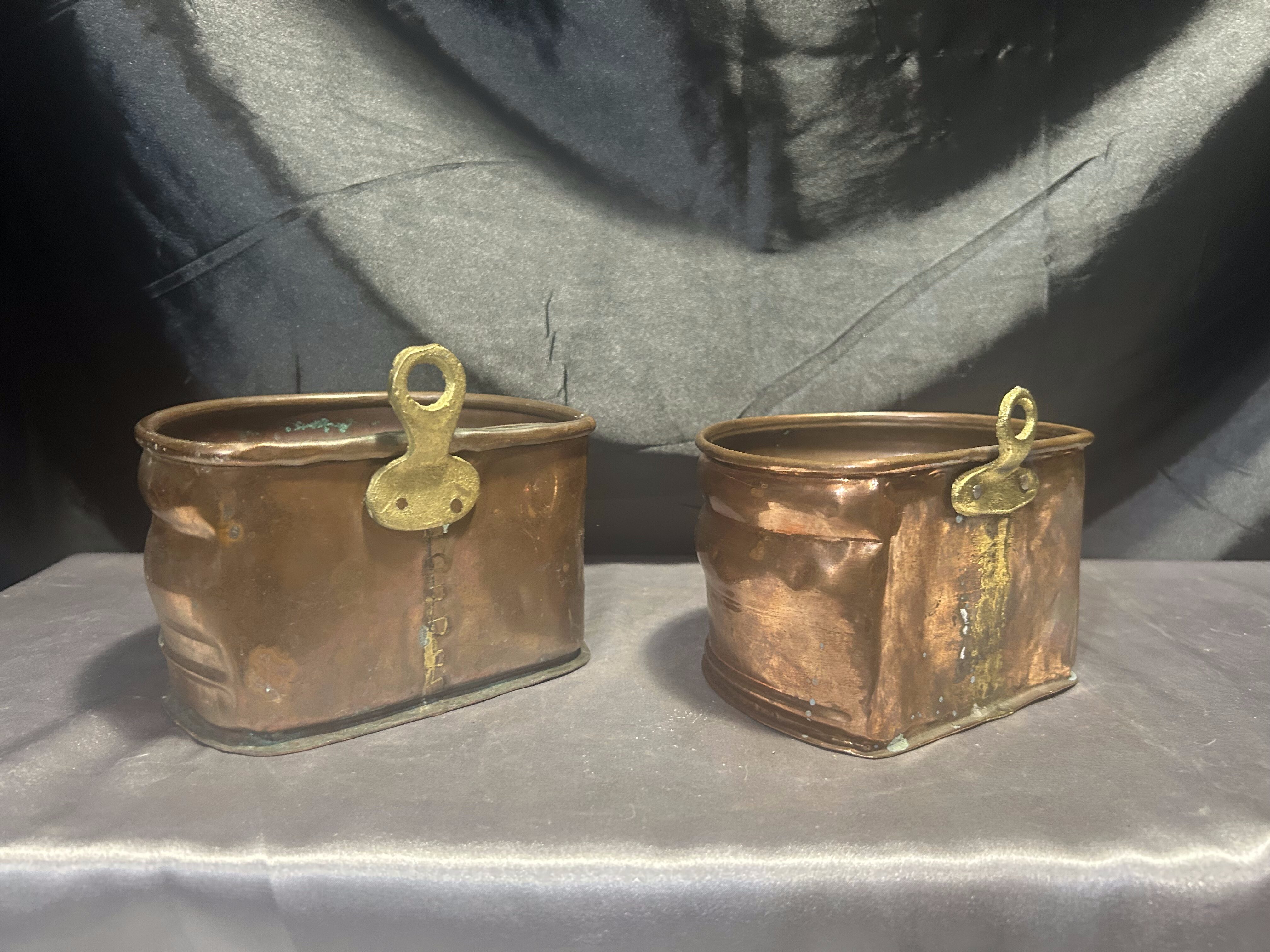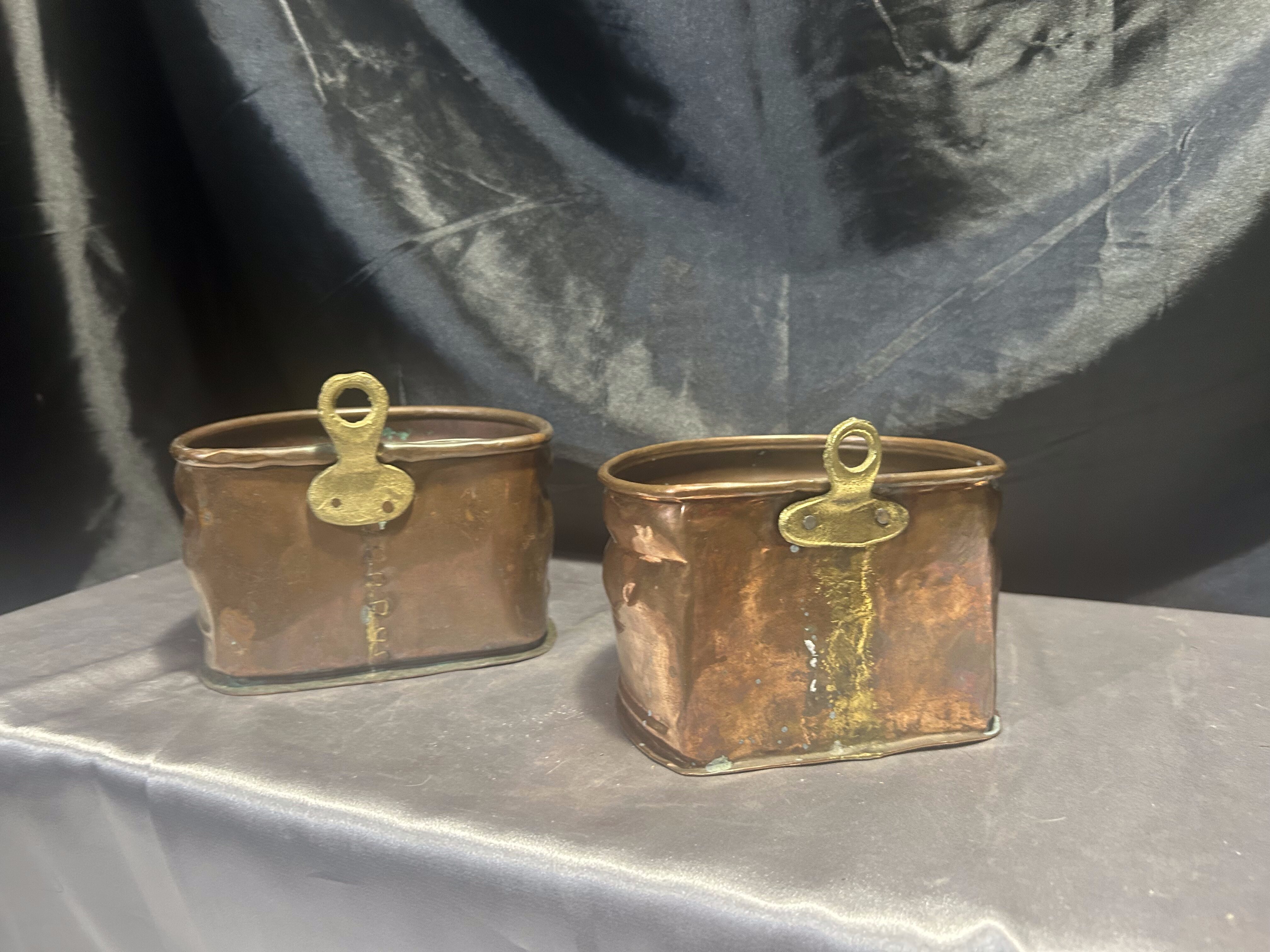 Na sprzedaż zestaw dwóch miedzianych kwietników ściennych, wyposażonych w mosiężne oczka do zawieszenia, które umożliwiają łatwy montaż na ścianie. Kwietniki różnią się nieznacznie wymiarami, ale zachowują spójny styl – idealne do ekspozycji roślin, suszonych bukietów lub jako oryginalna dekoracja ścienna.
