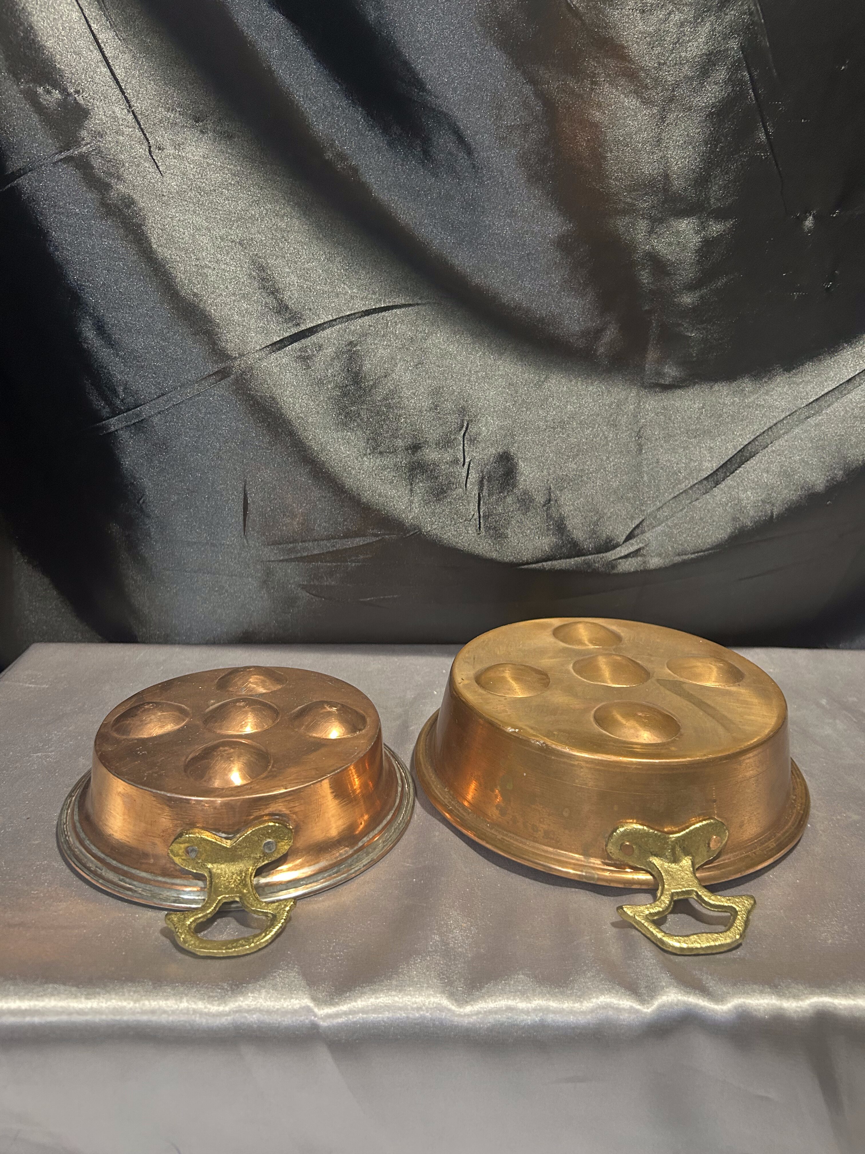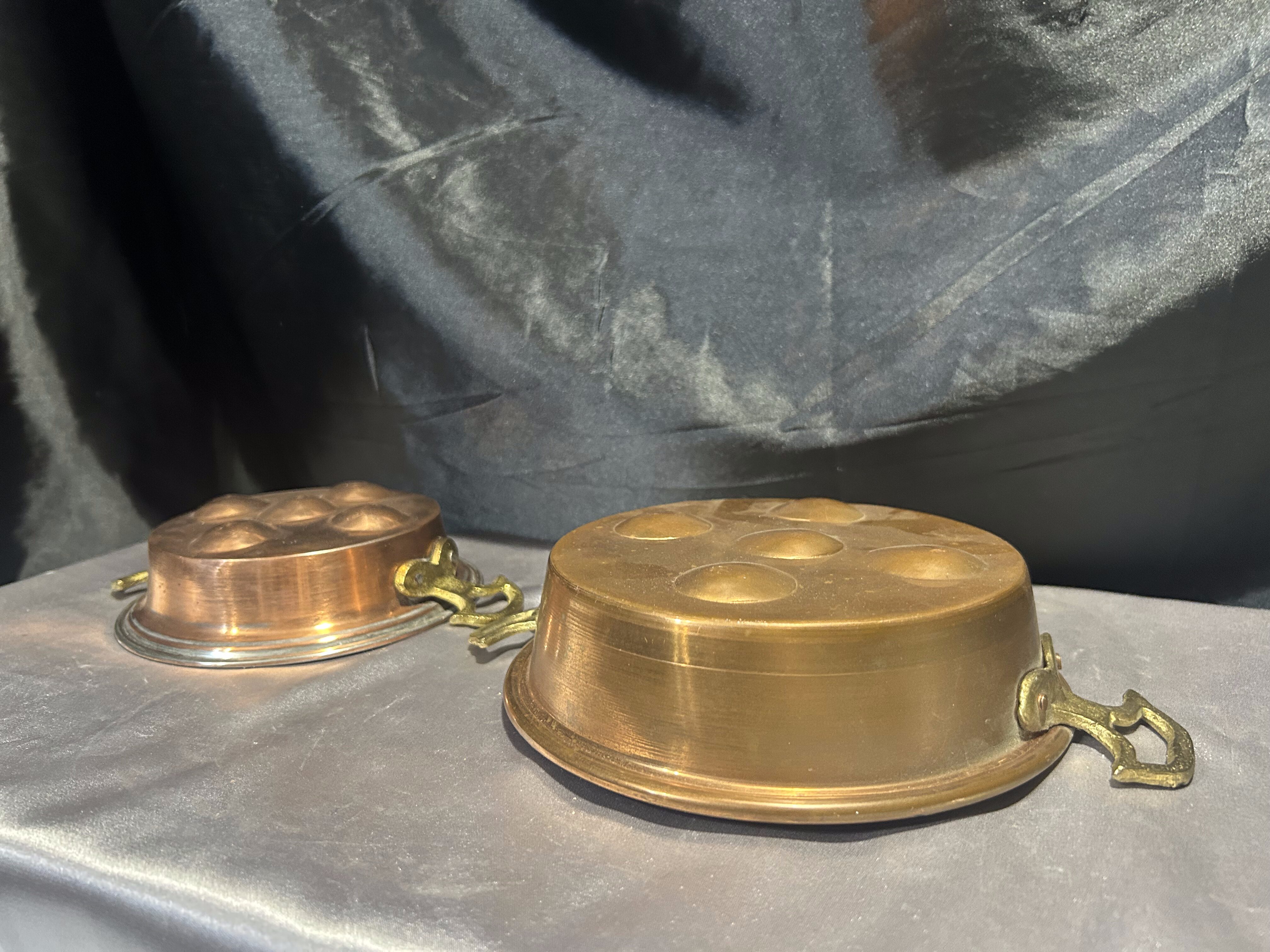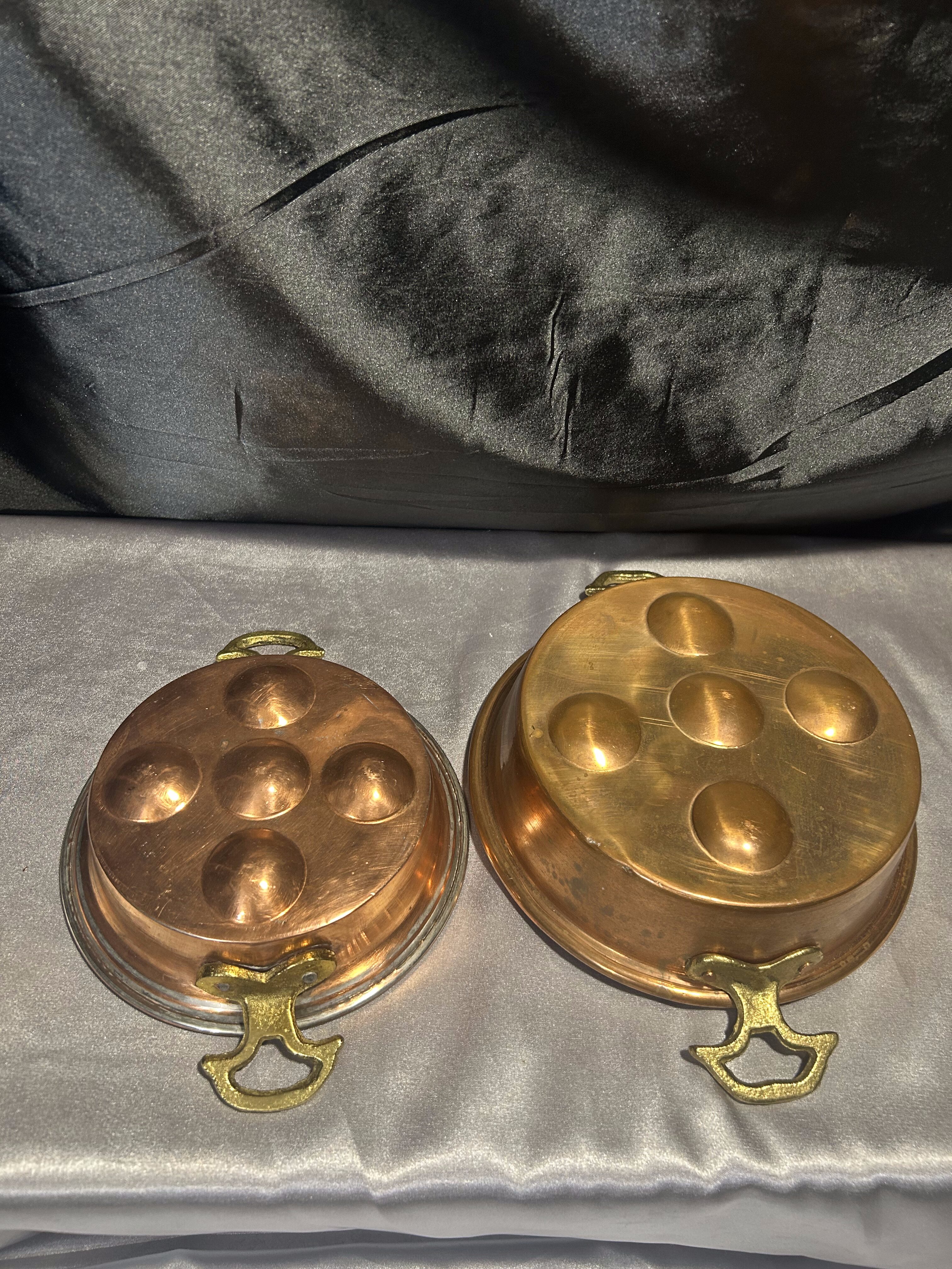 Wyjątkowy zestaw dwóch miedzianych patelni/foremek z mosiężnymi rączkami. Każda z foremek posiada pięć wgłębień, idealnych do wypieku ciasteczek, mini placuszków lub jako efektowne formy do serwowania. Różne rozmiary pozwalają na praktyczne wykorzystanie w kuchni, a dzięki ozdobnemu wyglądowi świetnie sprawdzą się także jako stylowa dekoracja kuchni.