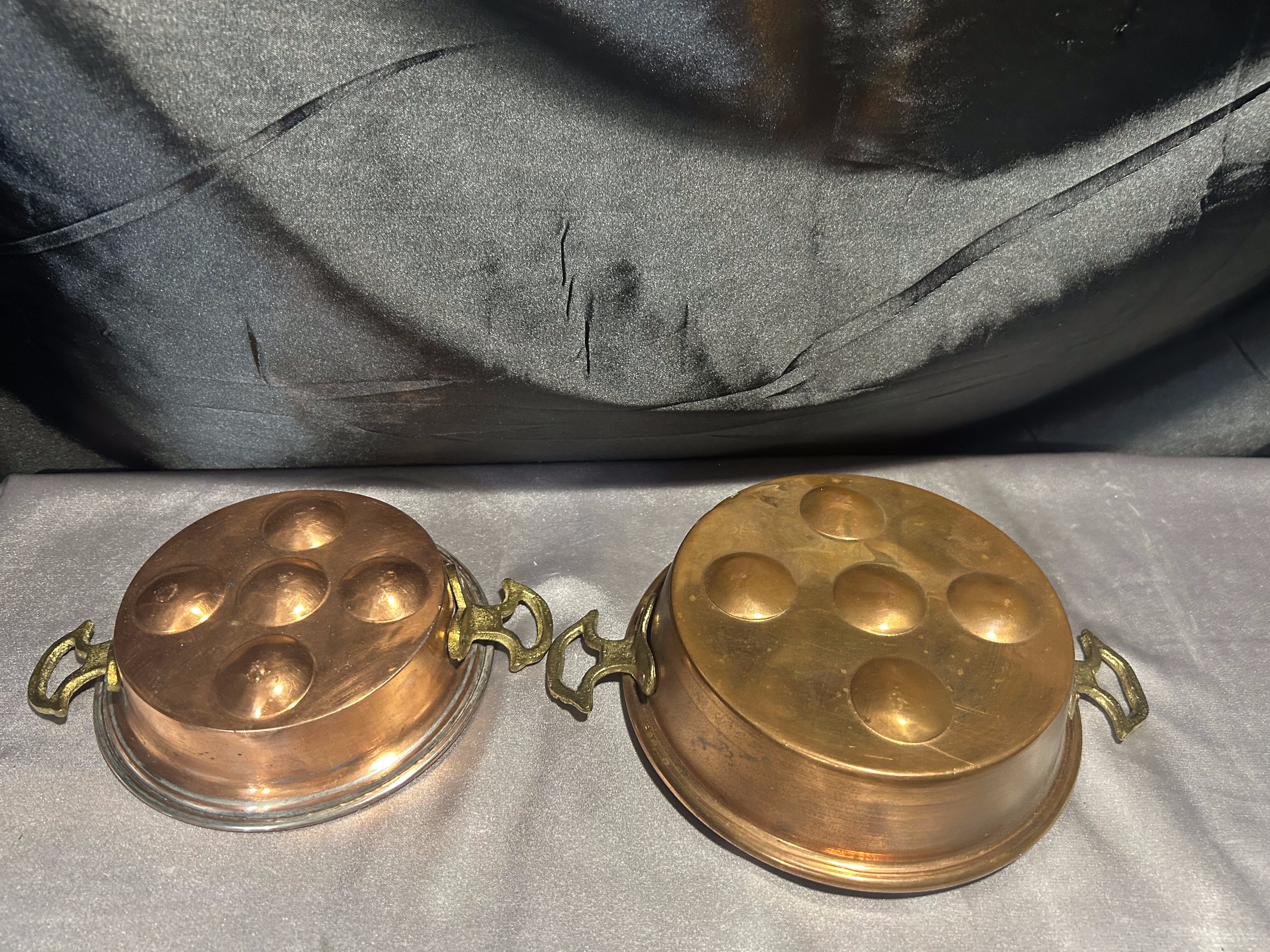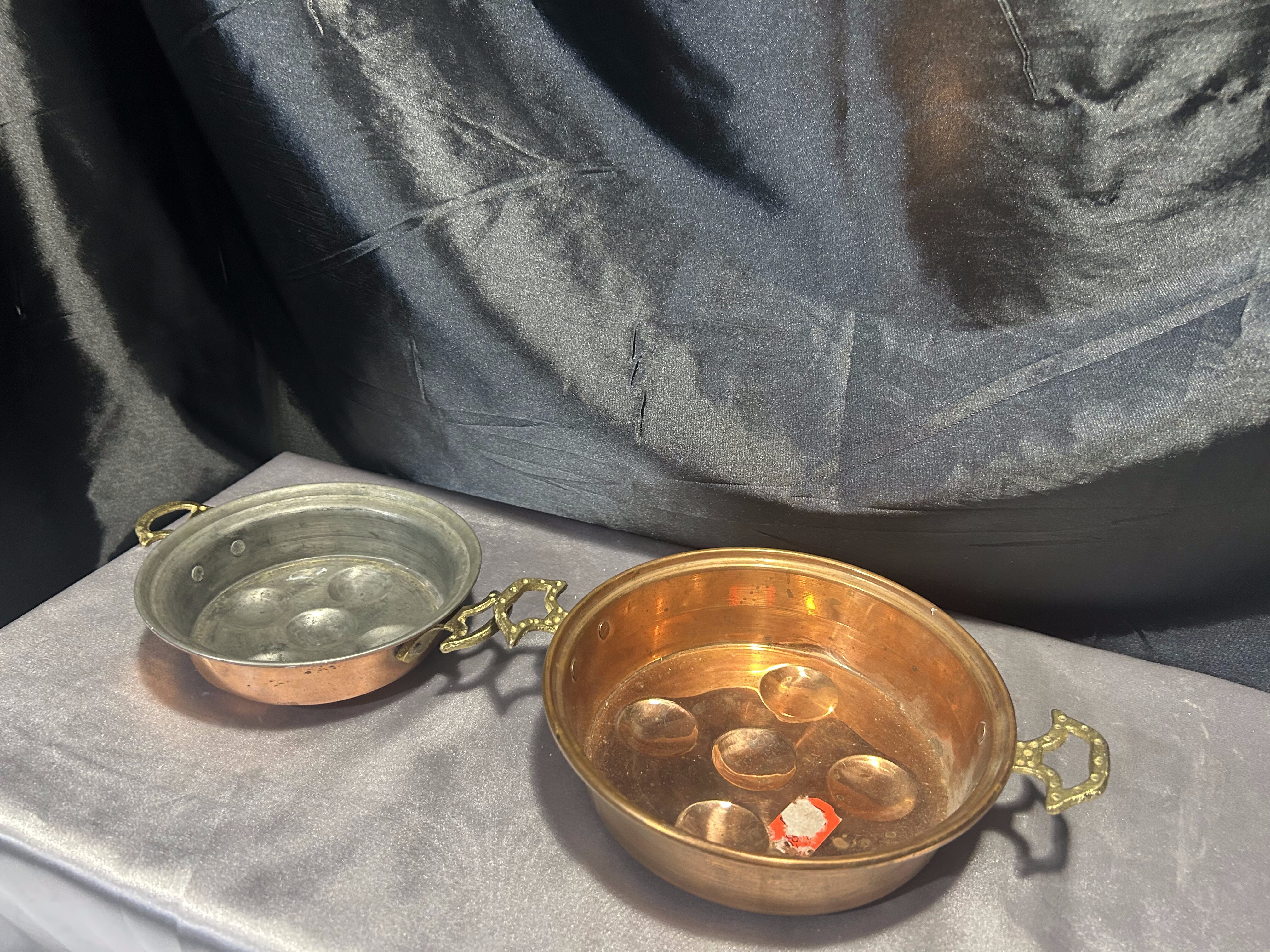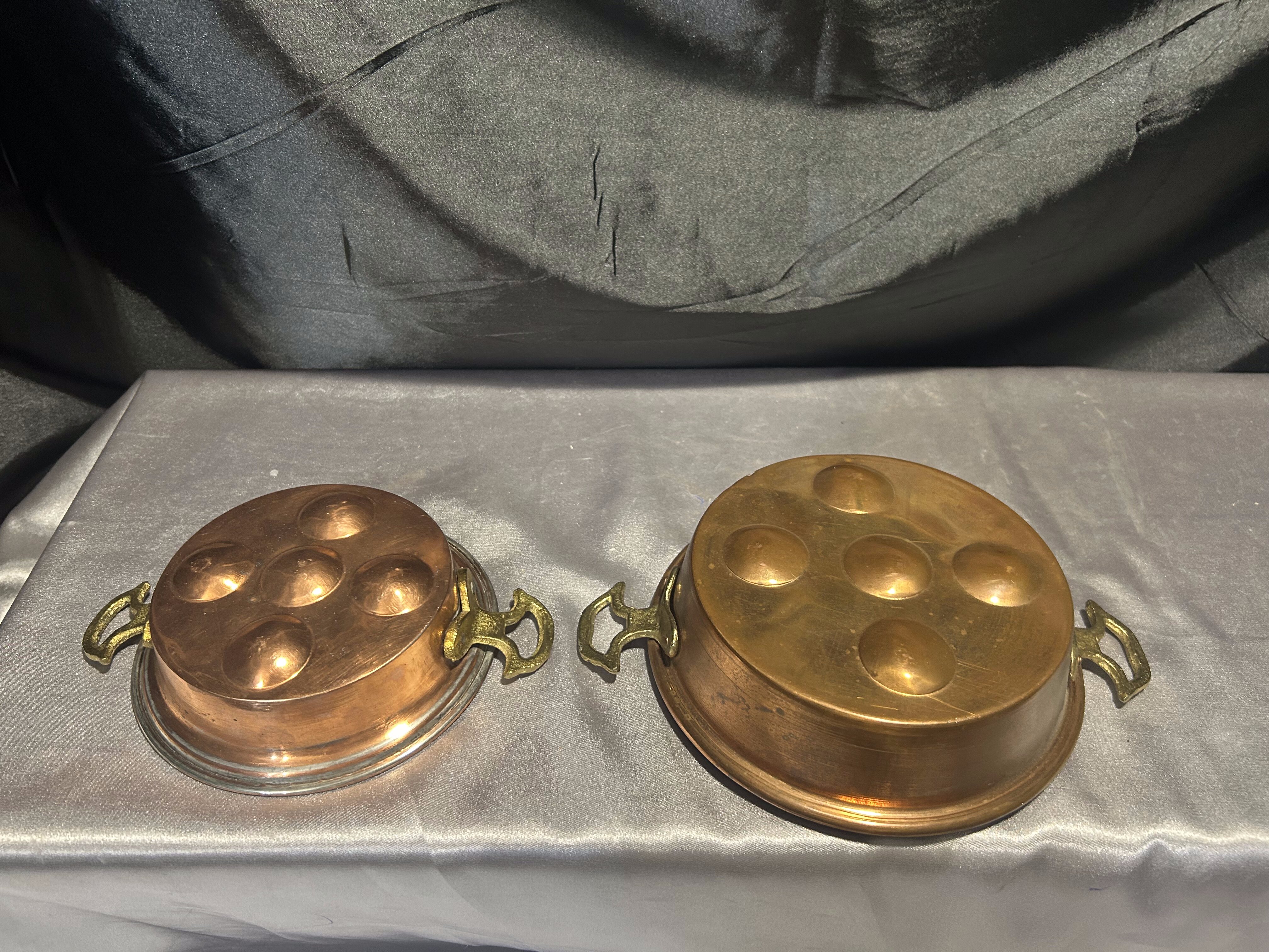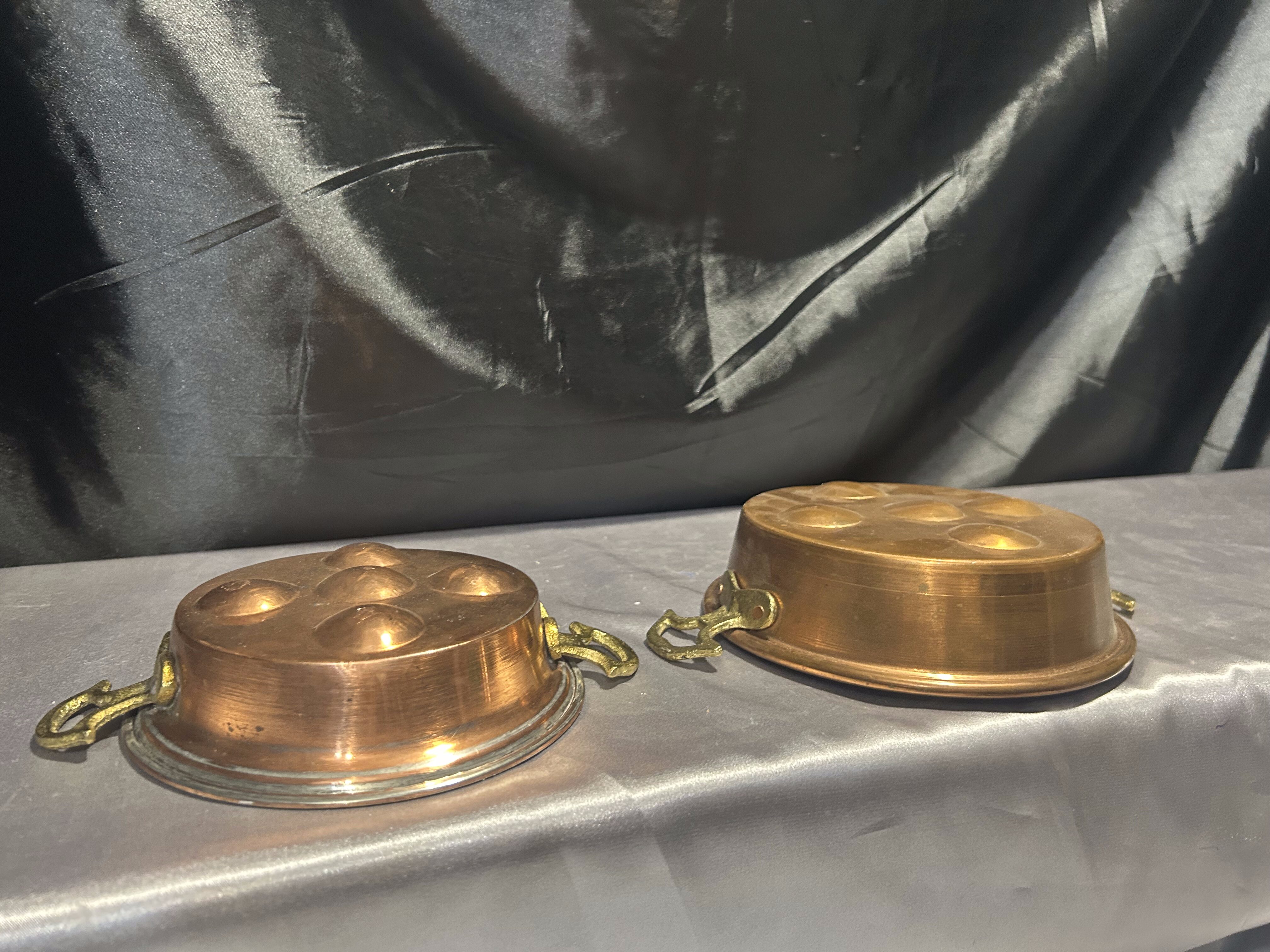 Wyjątkowy zestaw dwóch miedzianych patelni/foremek z mosiężnymi rączkami. Każda z foremek posiada pięć wgłębień, idealnych do wypieku ciasteczek, mini placuszków lub jako efektowne formy do serwowania. Różne rozmiary pozwalają na praktyczne wykorzystanie w kuchni, a dzięki ozdobnemu wyglądowi świetnie sprawdzą się także jako stylowa dekoracja kuchni.
