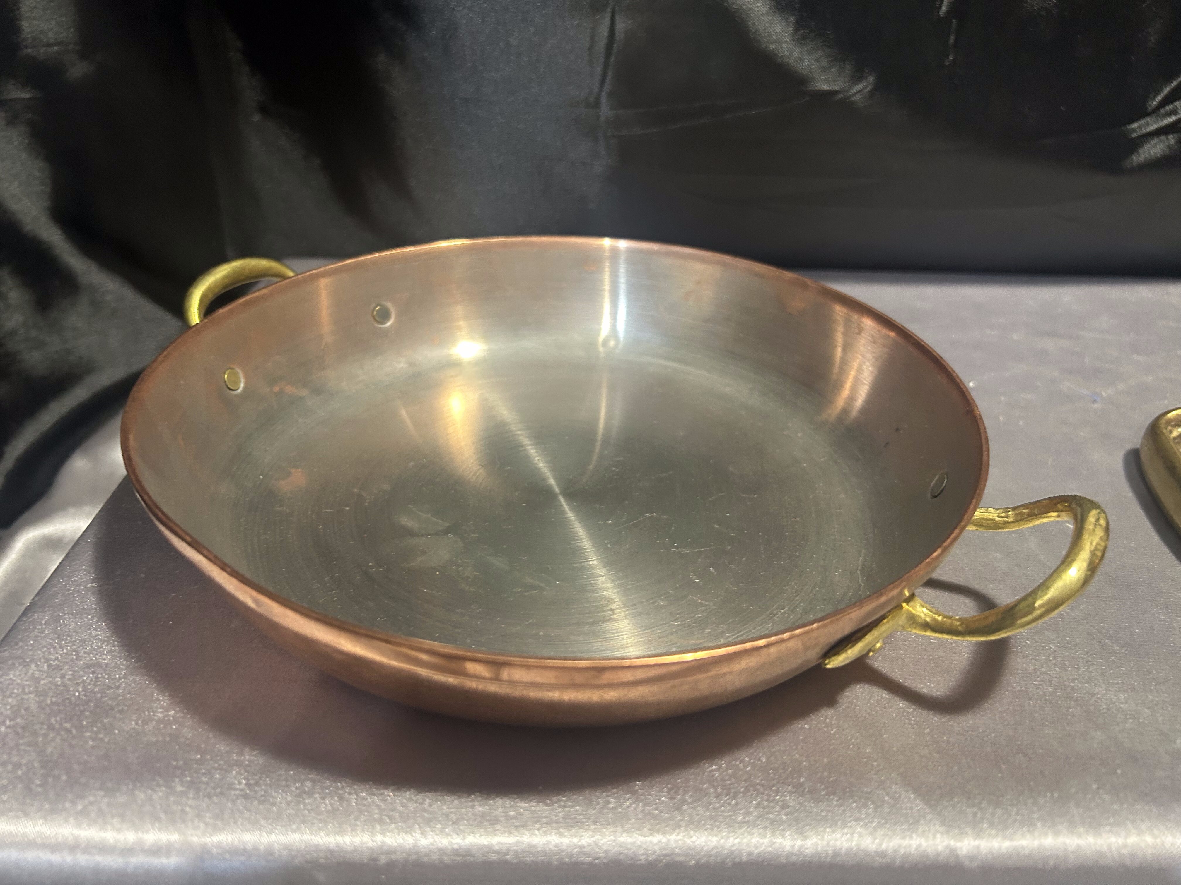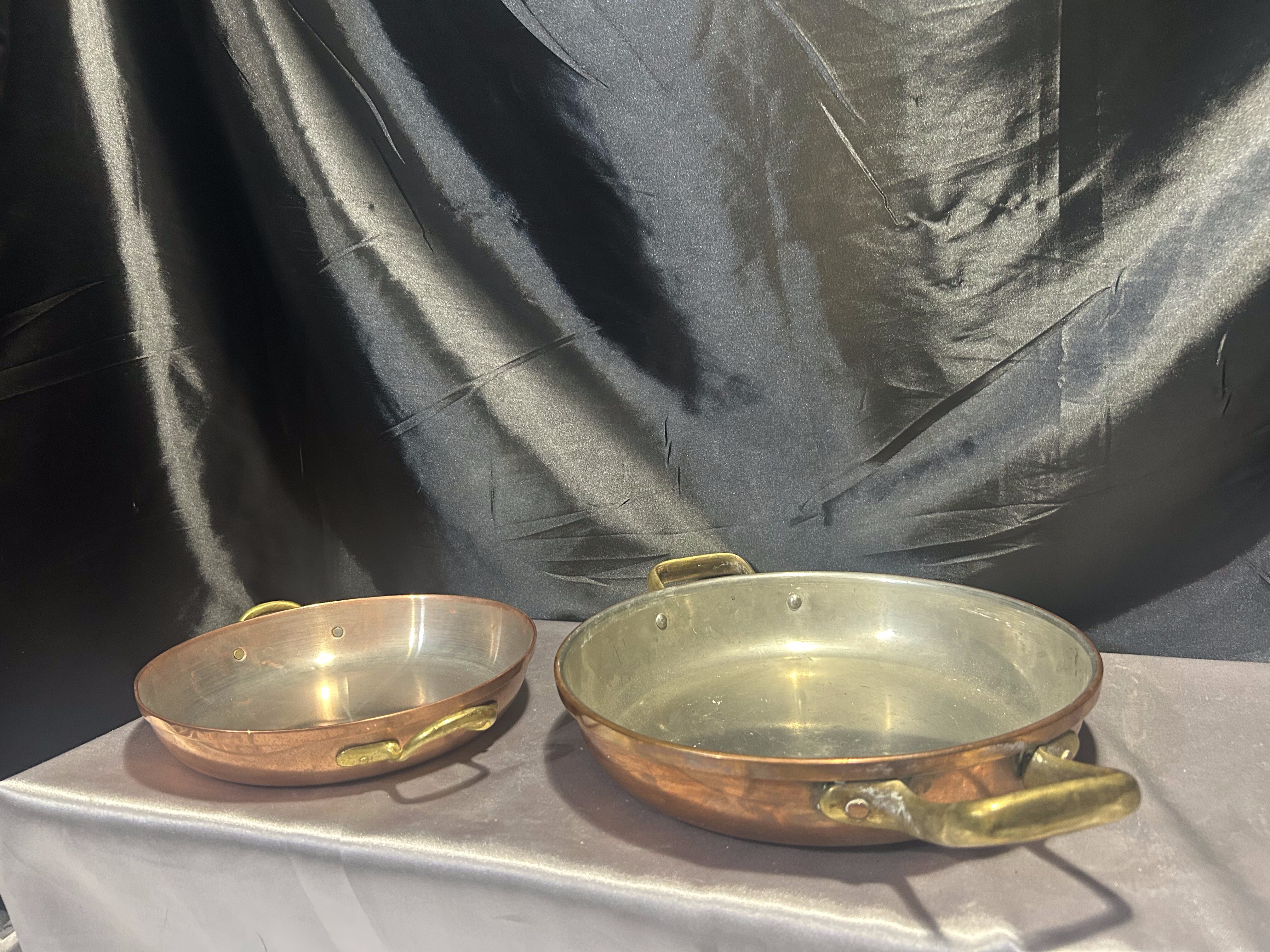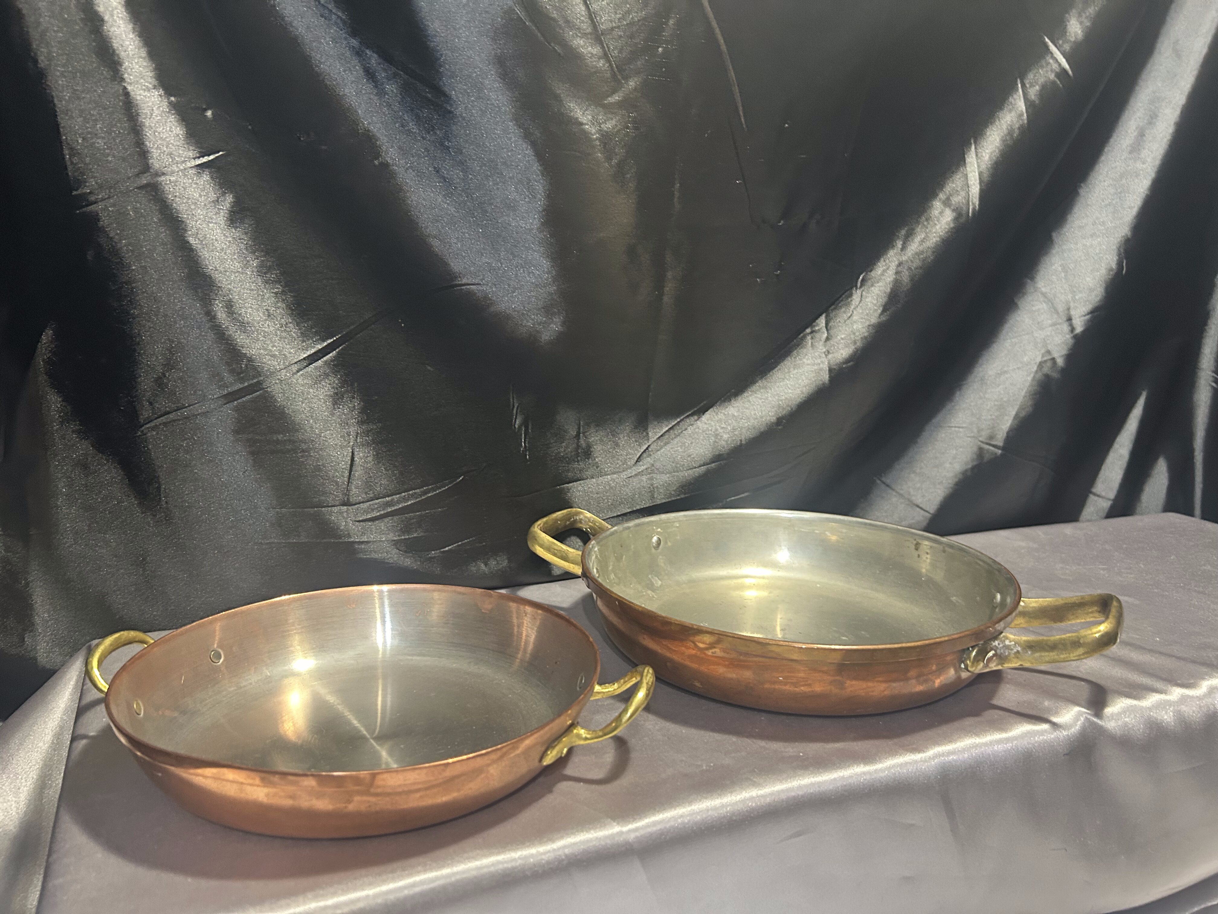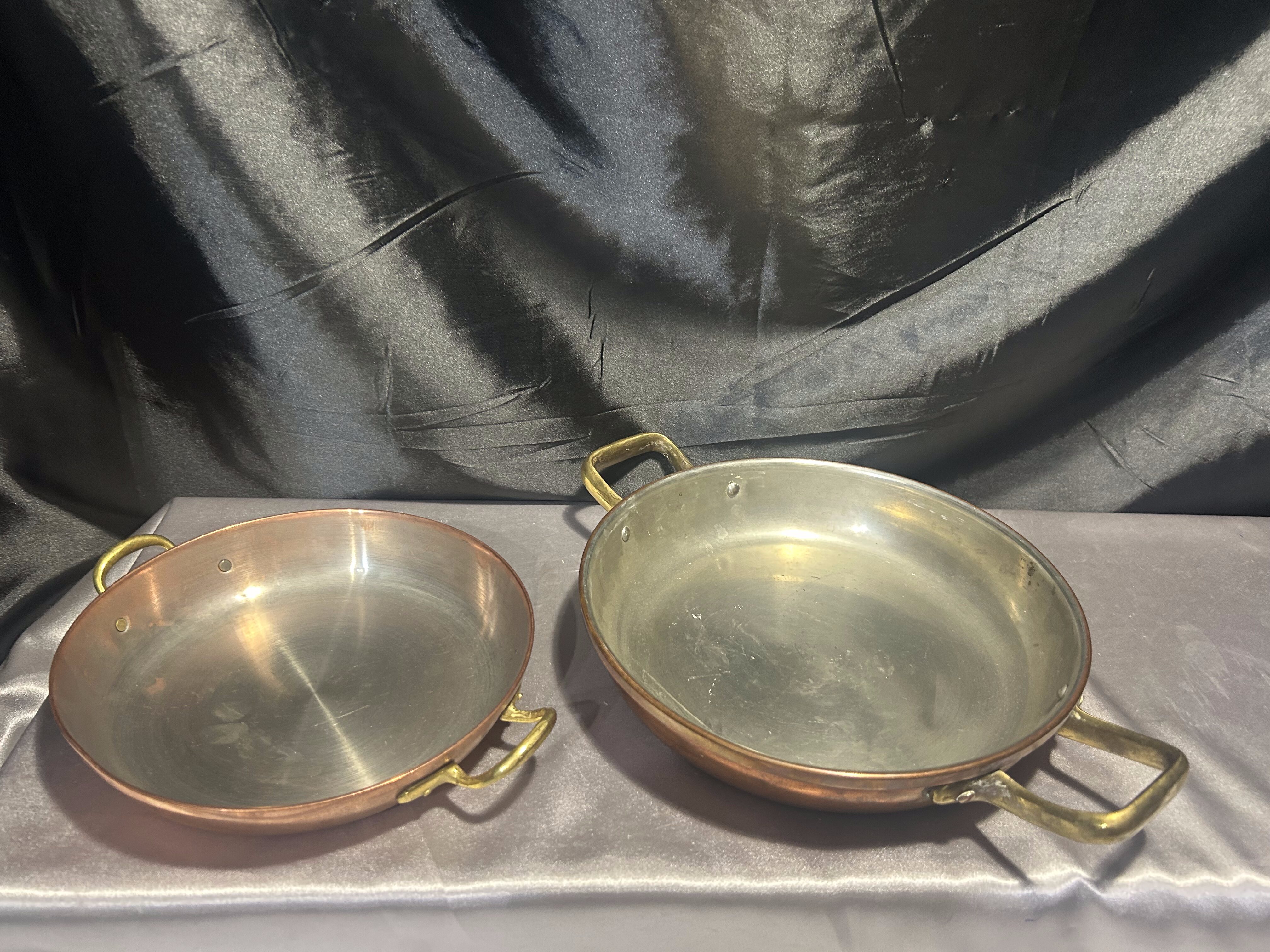 Elegancki zestaw dwóch sygnowanych miedzianych patelni, każda z mosiężnymi rączkami, doskonałych zarówno do użytku, jak i jako stylowa ozdoba kuchni. Większa patelnia stanowi główny element zestawu, natomiast mniejsza, również sygnowana patelnia, dodawana jest gratis. Całość to unikatowy komplet dla miłośników miedzianych naczyń i pięknych przedmiotów.