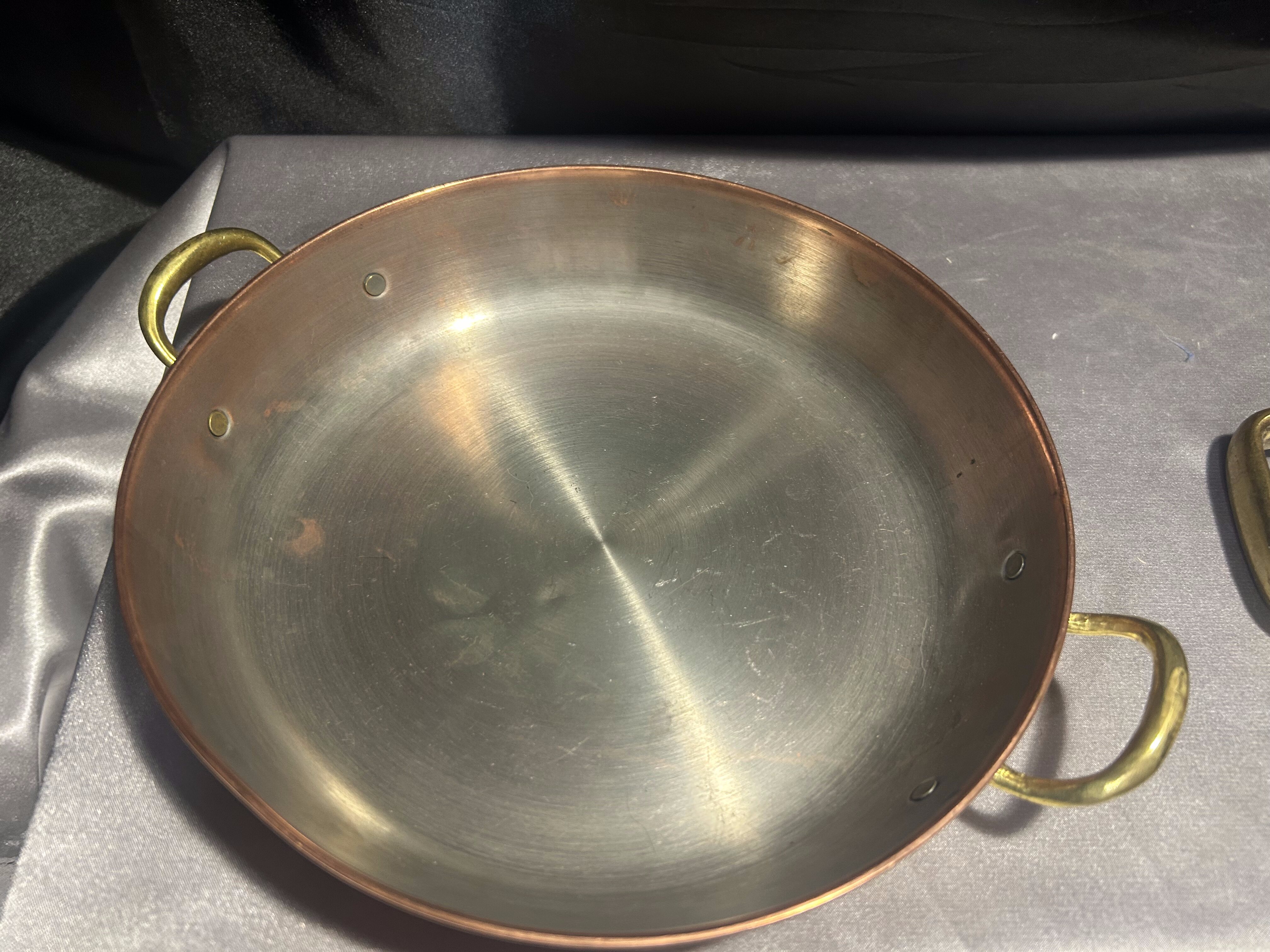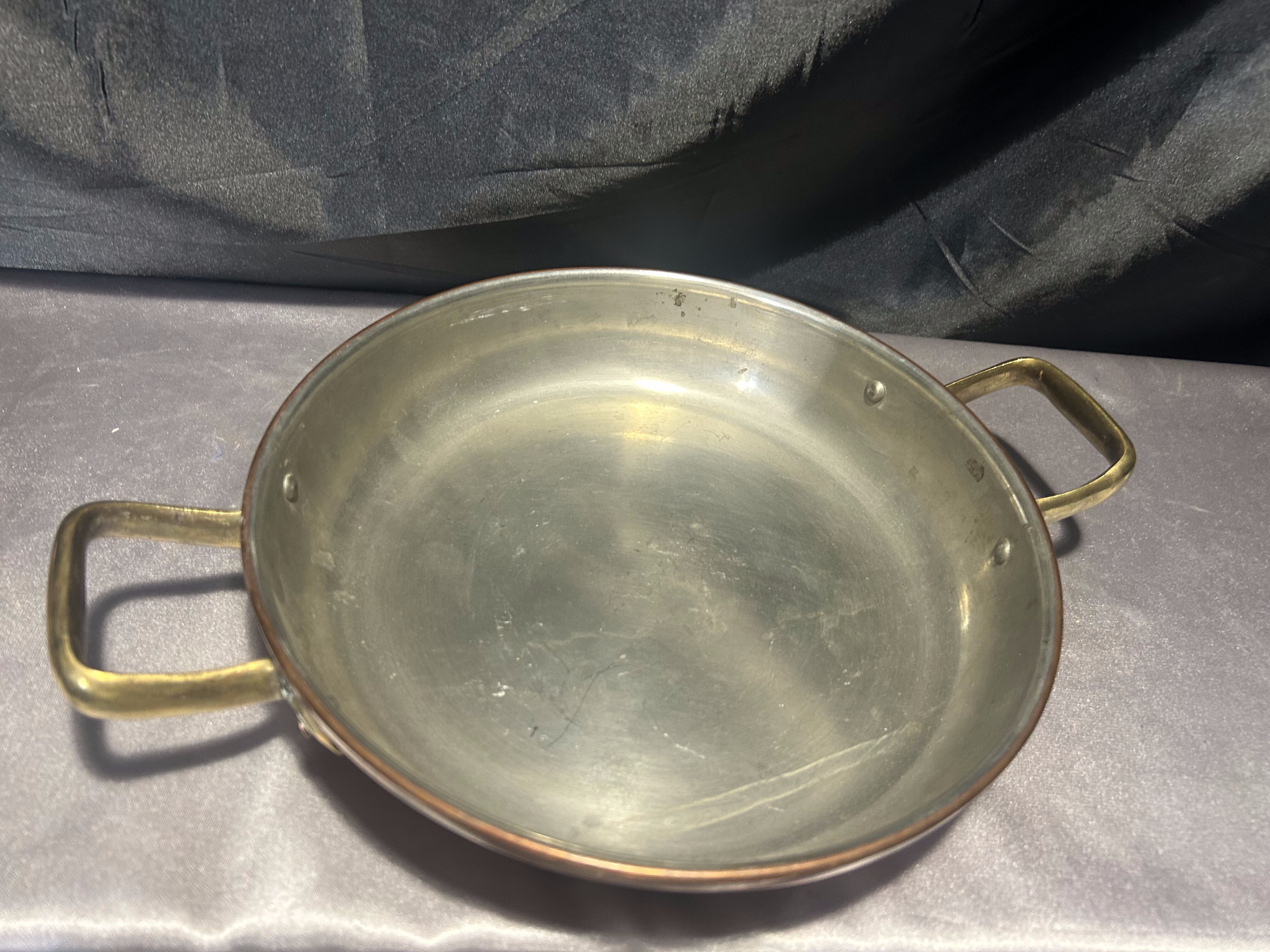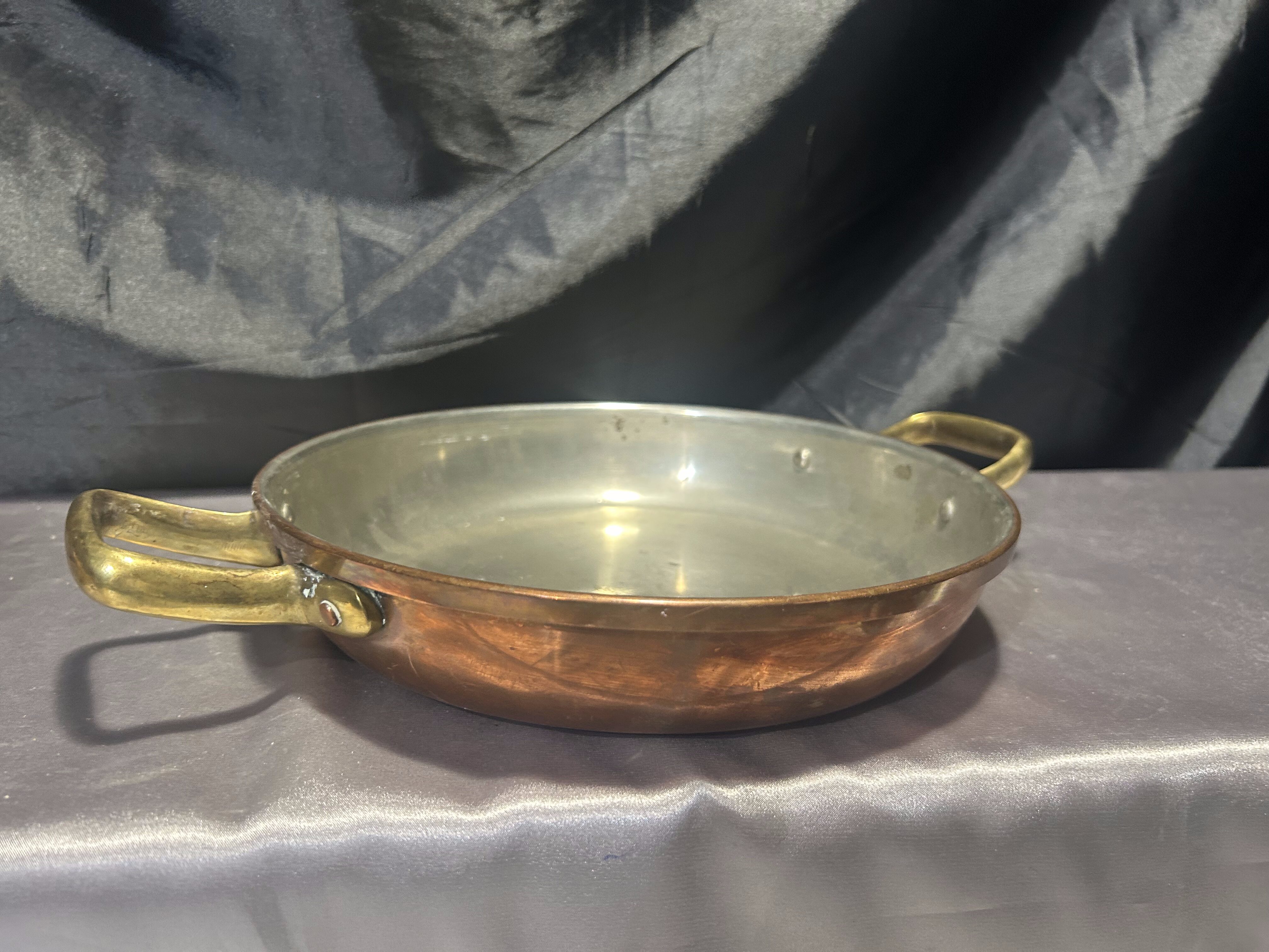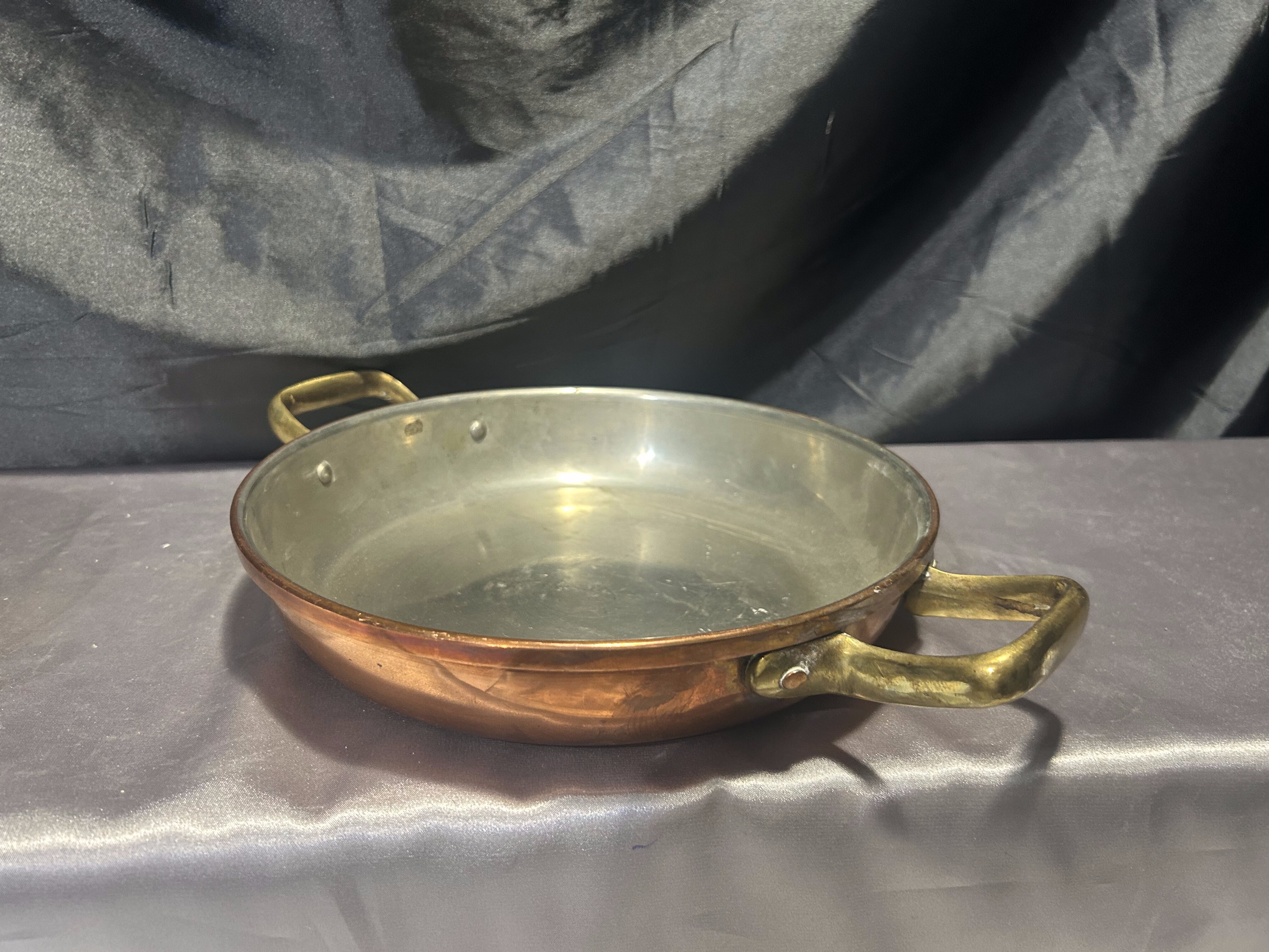 Elegancki zestaw dwóch sygnowanych miedzianych patelni, każda z mosiężnymi rączkami, doskonałych zarówno do użytku, jak i jako stylowa ozdoba kuchni. Większa patelnia stanowi główny element zestawu, natomiast mniejsza, również sygnowana patelnia, dodawana jest gratis. Całość to unikatowy komplet dla miłośników miedzianych naczyń i pięknych przedmiotów.