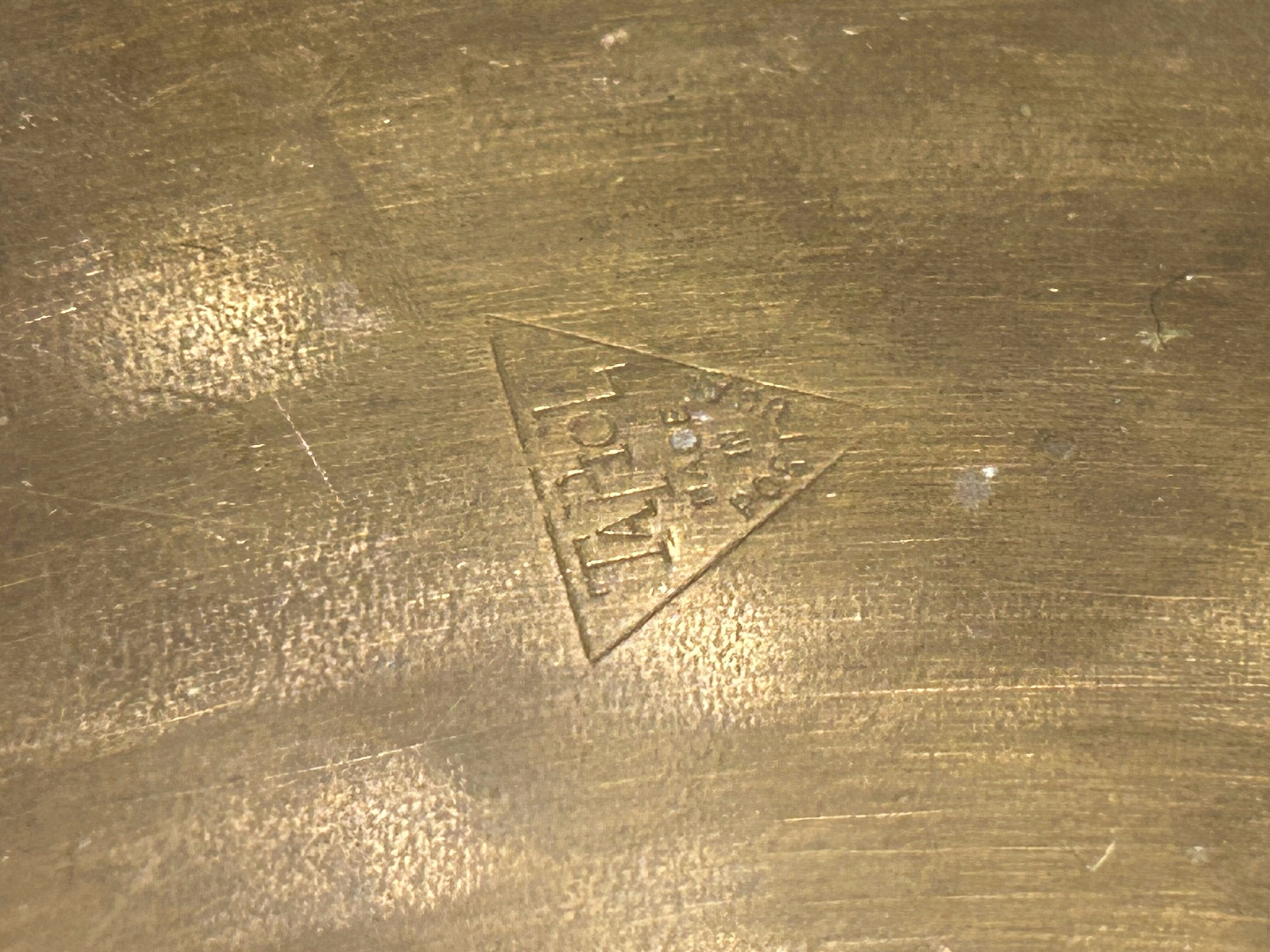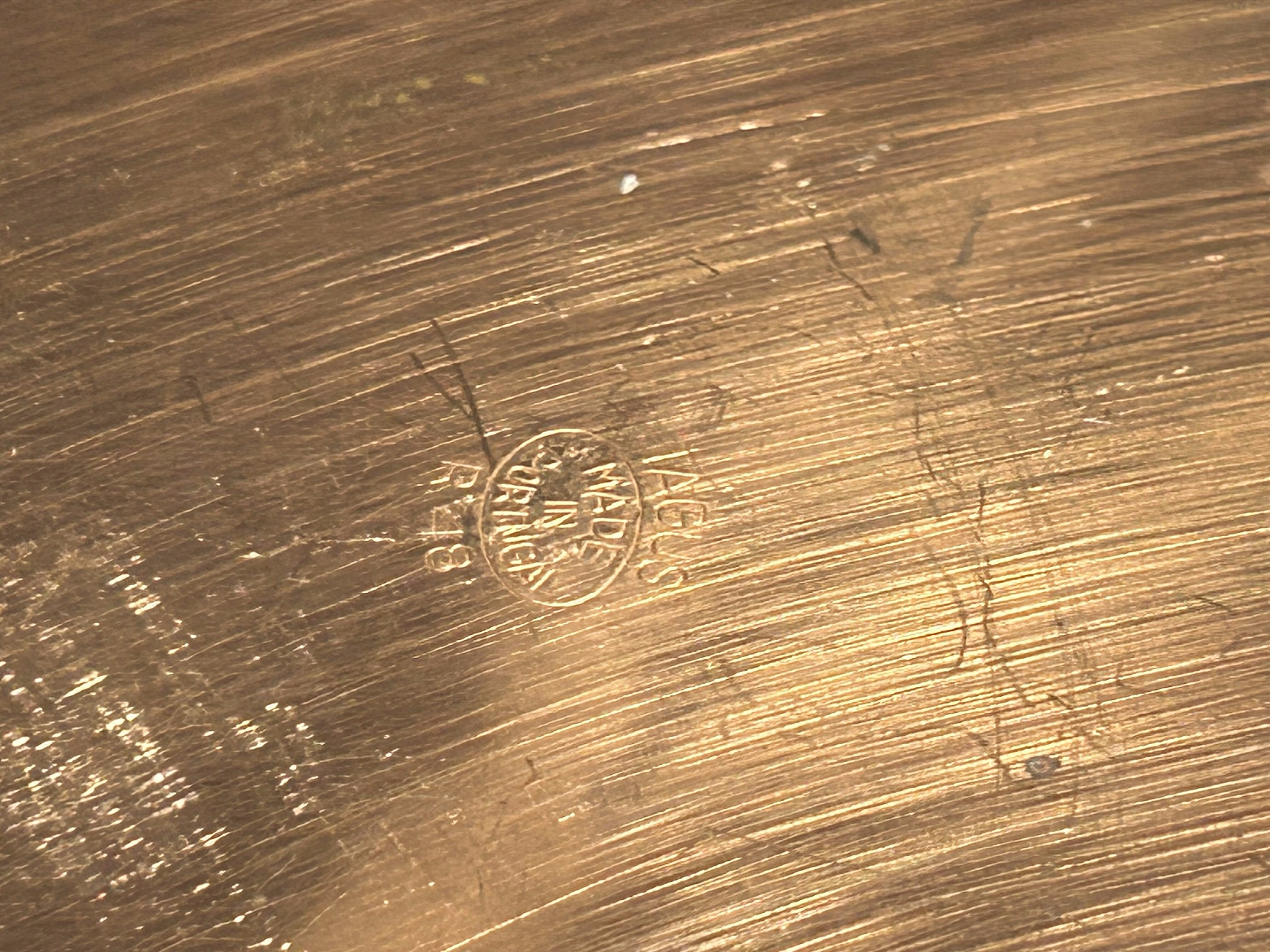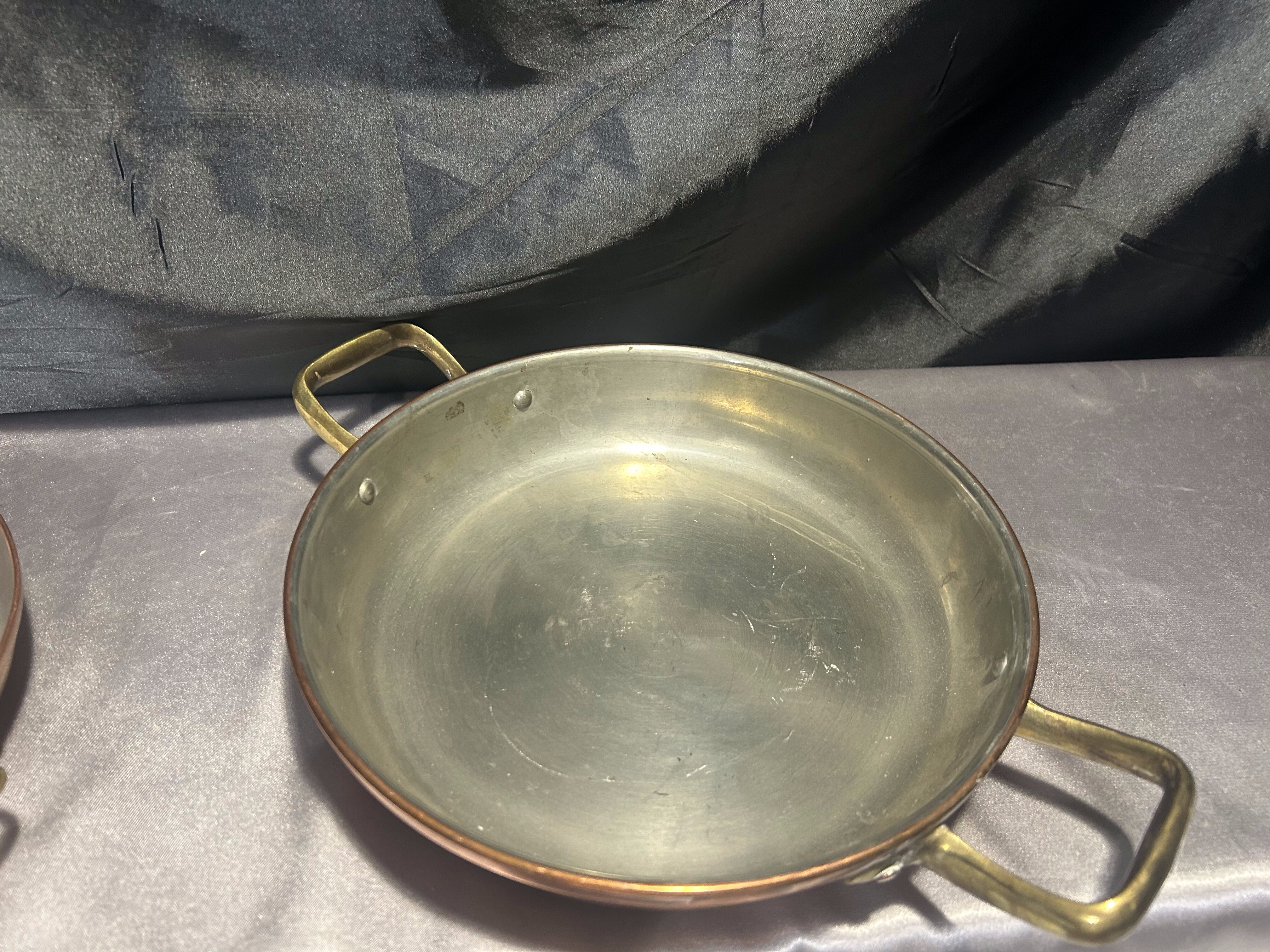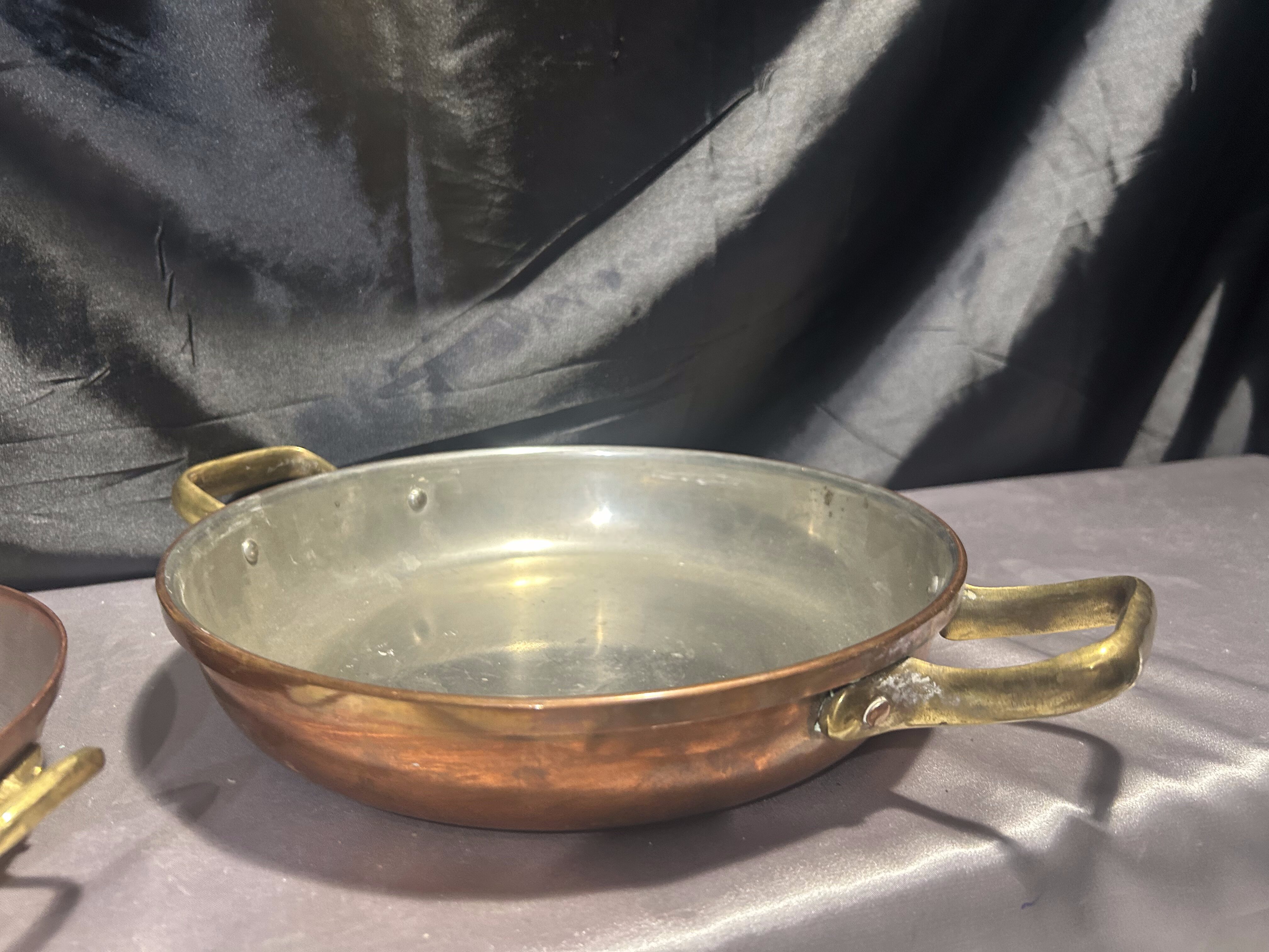 Elegancki zestaw dwóch sygnowanych miedzianych patelni, każda z mosiężnymi rączkami, doskonałych zarówno do użytku, jak i jako stylowa ozdoba kuchni. Większa patelnia stanowi główny element zestawu, natomiast mniejsza, również sygnowana patelnia, dodawana jest gratis. Całość to unikatowy komplet dla miłośników miedzianych naczyń i pięknych przedmiotów.
