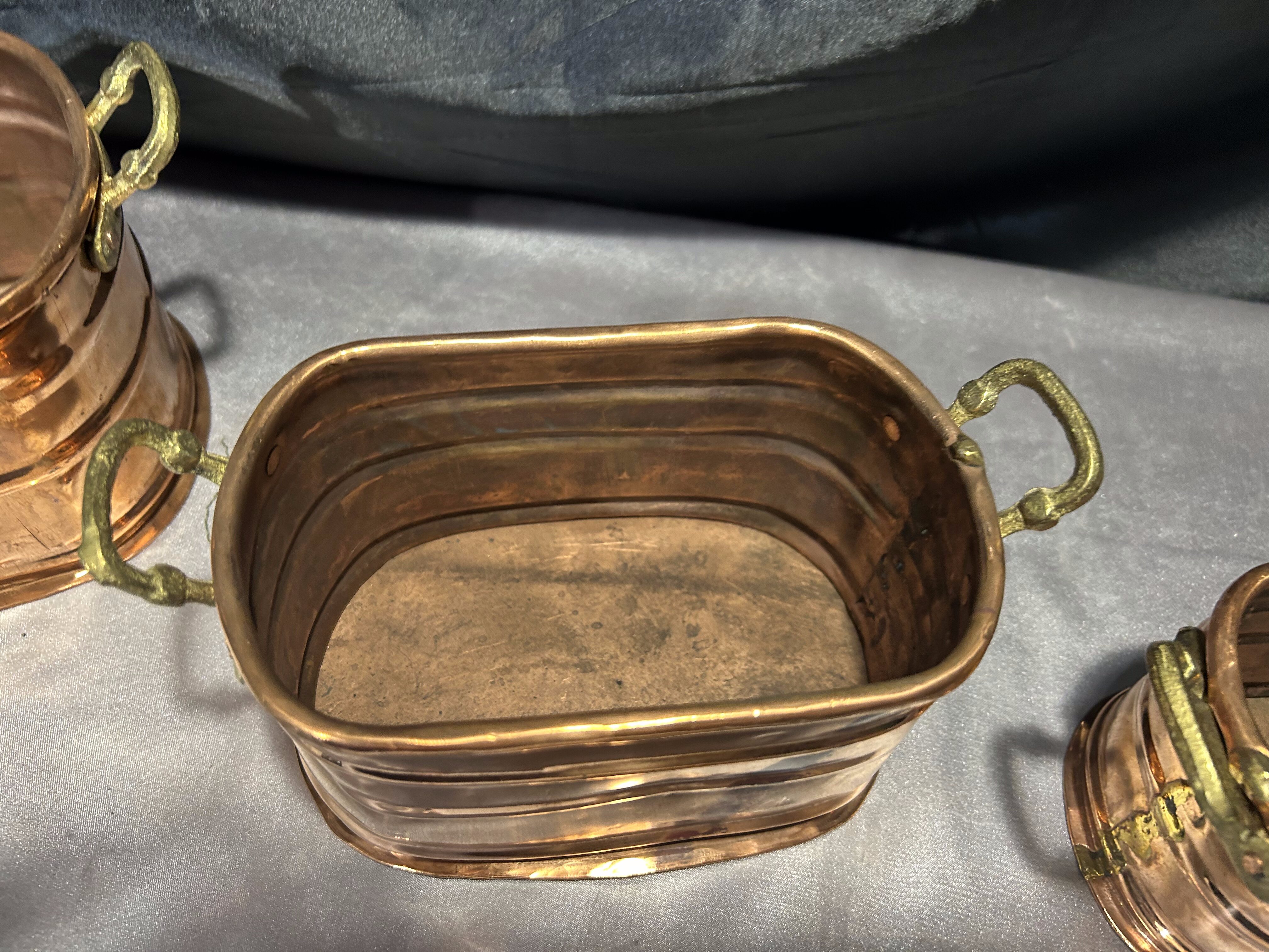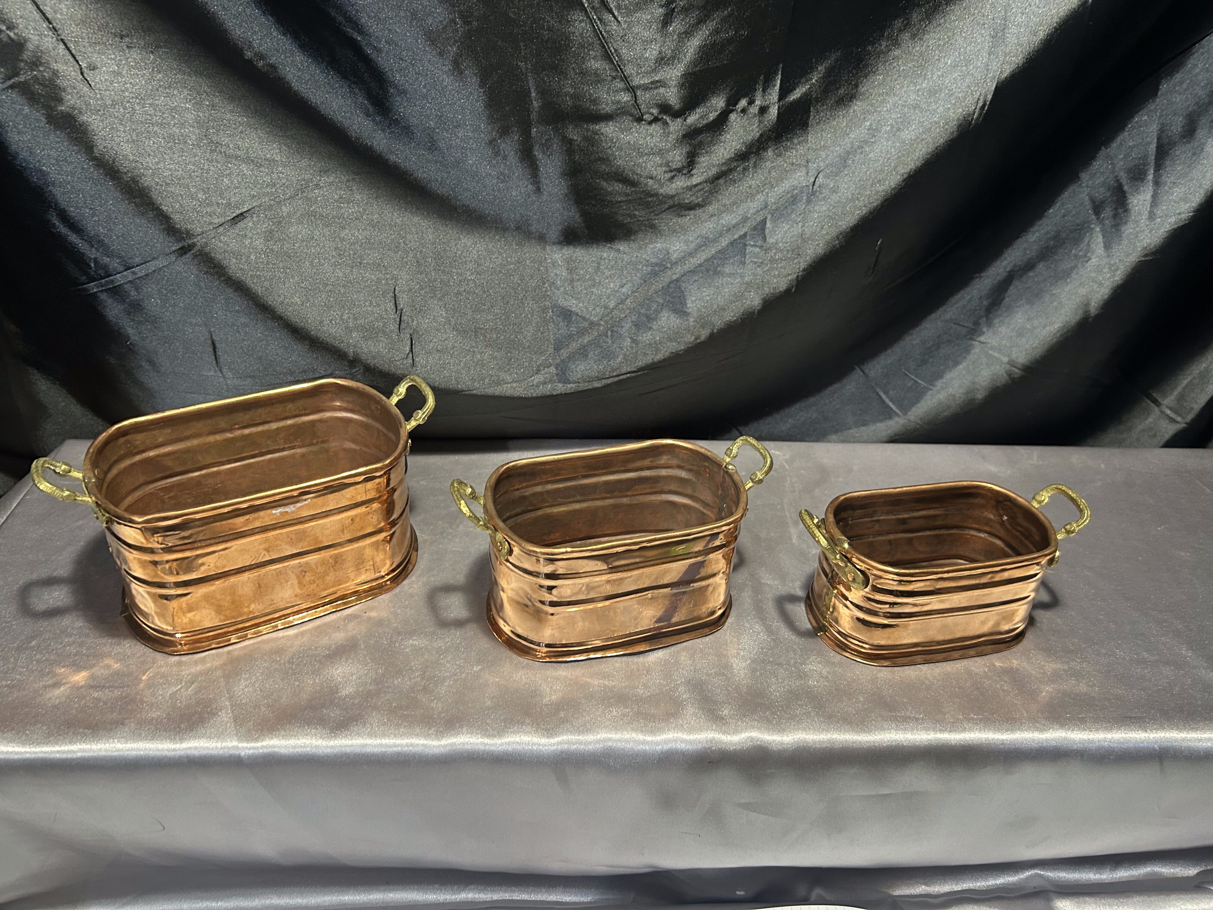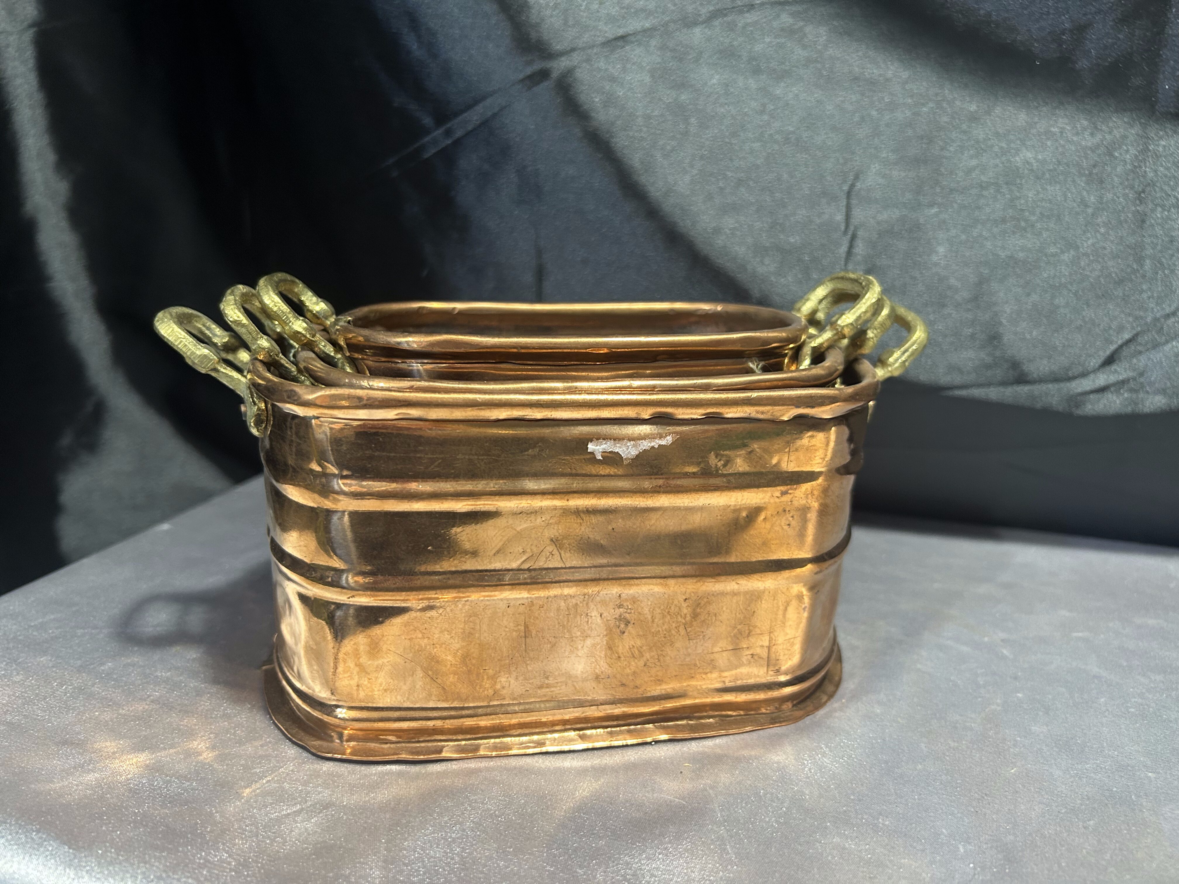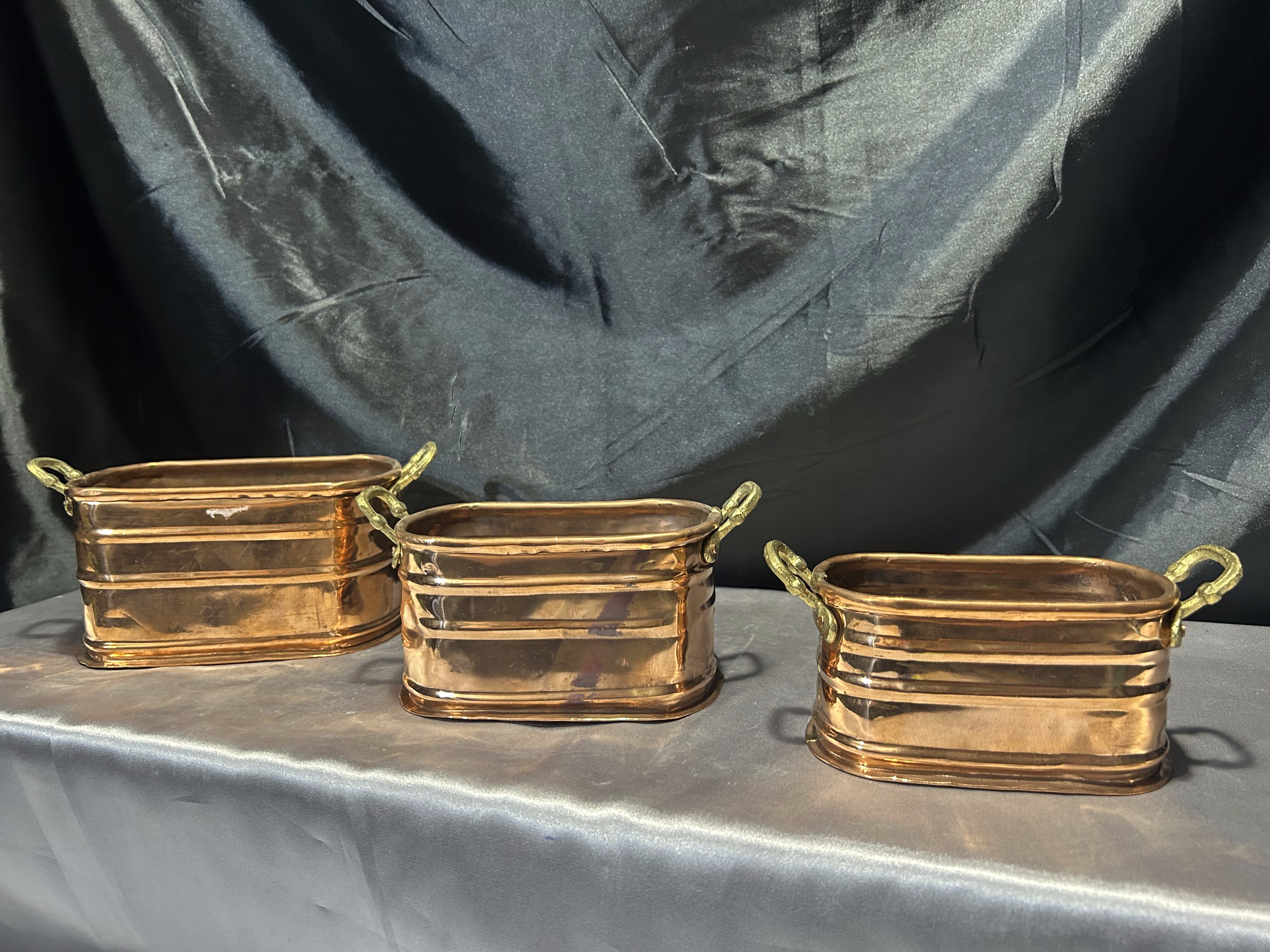 Zestaw 3 Miedzianych Kwietników – Prostokątne, z Mosiężnymi Rączkami – Styl Vintage