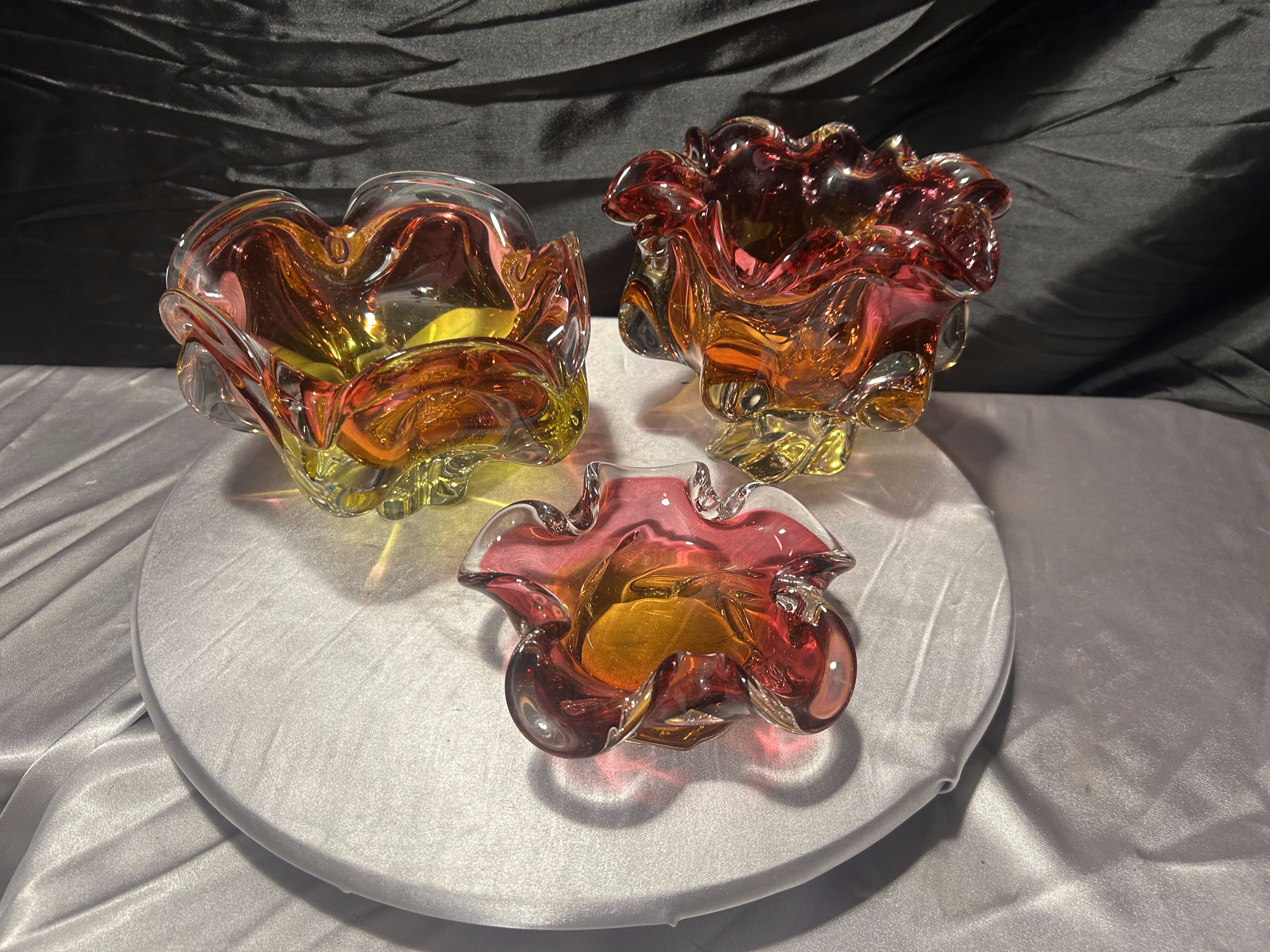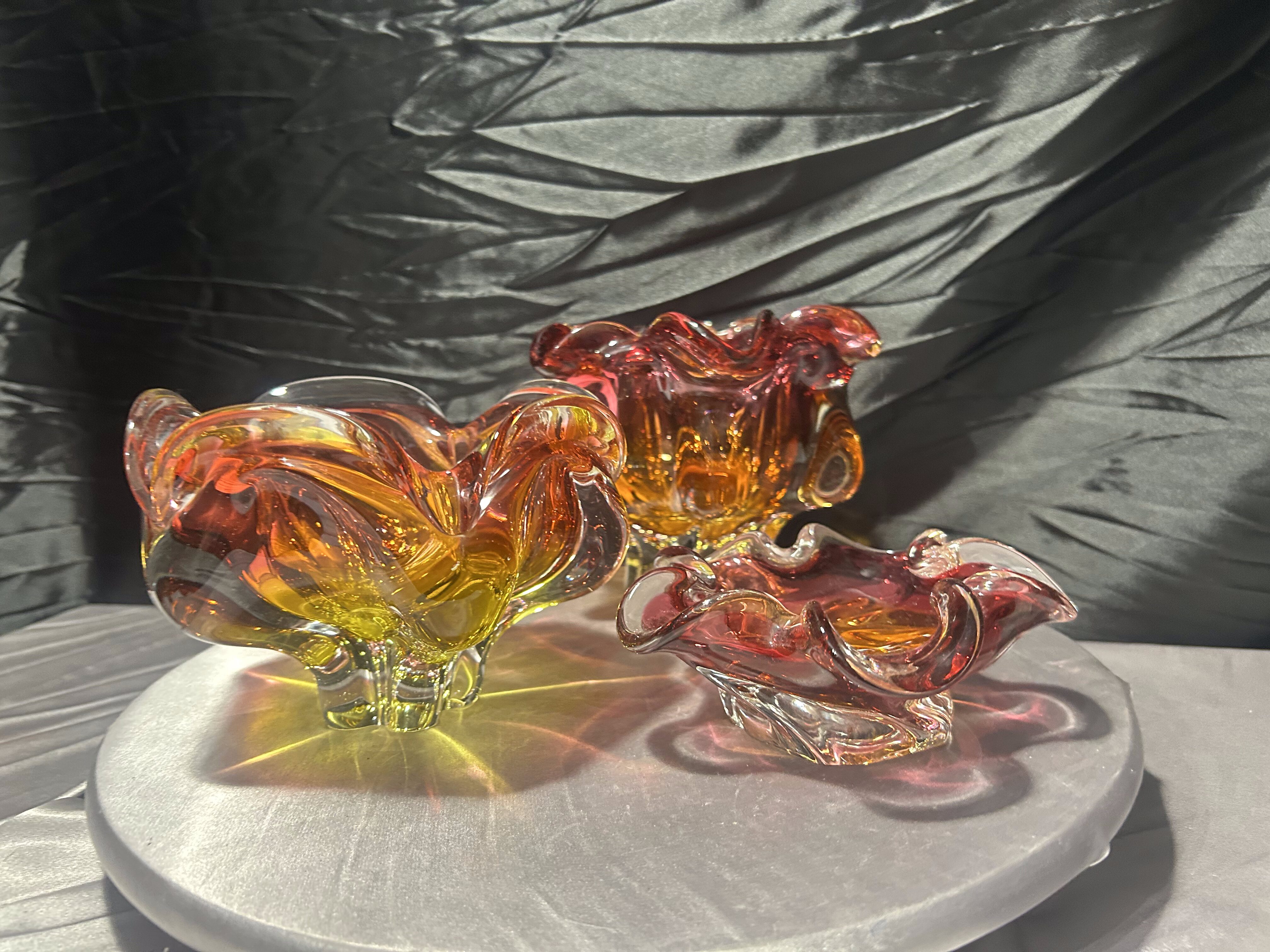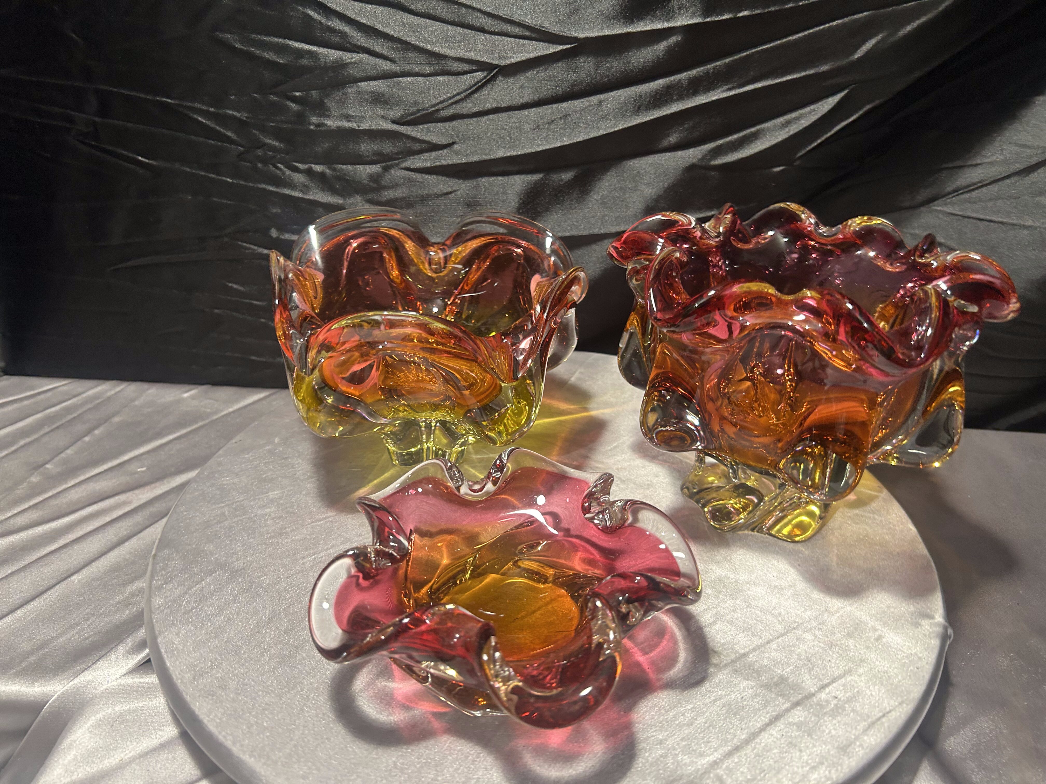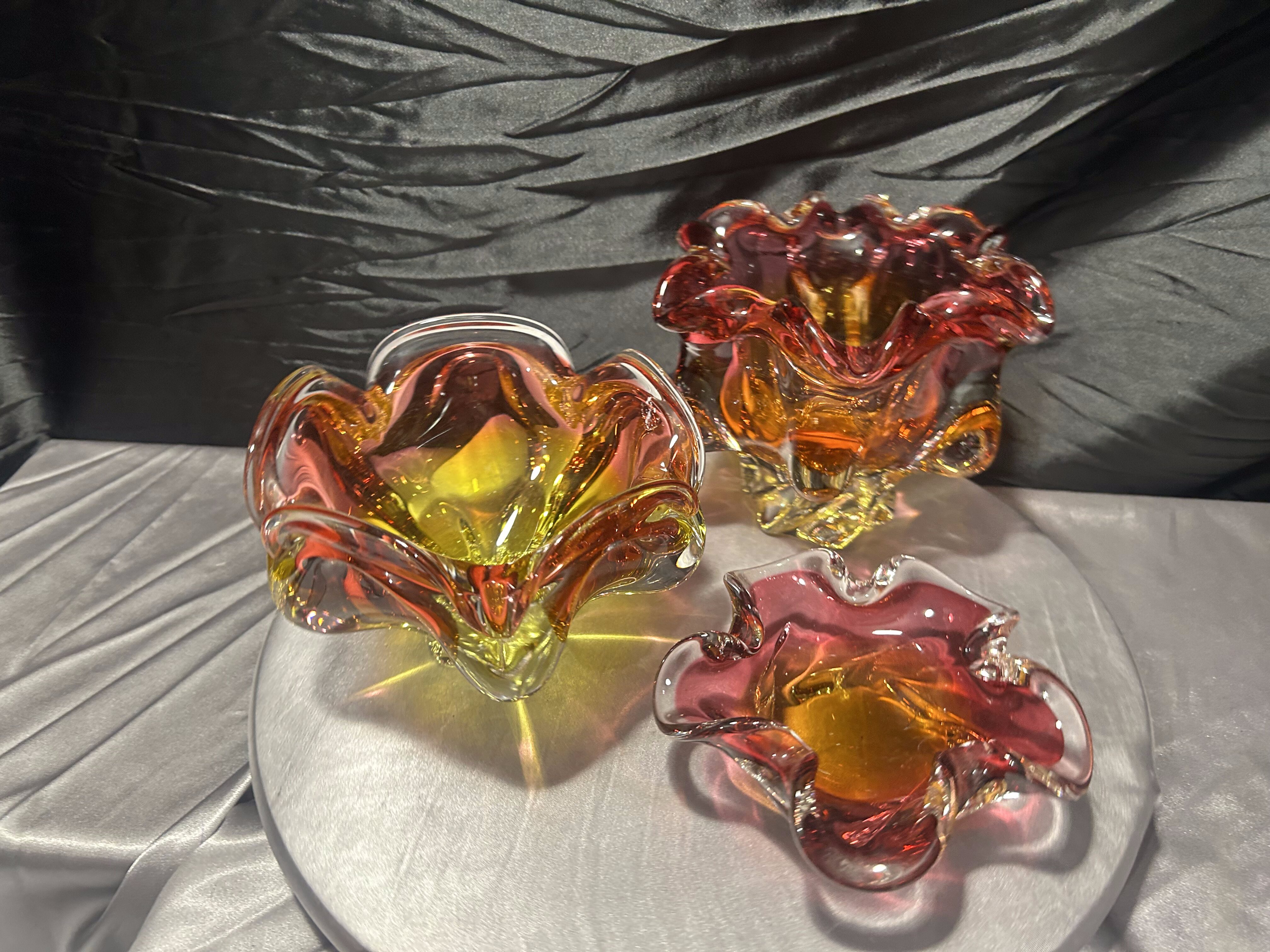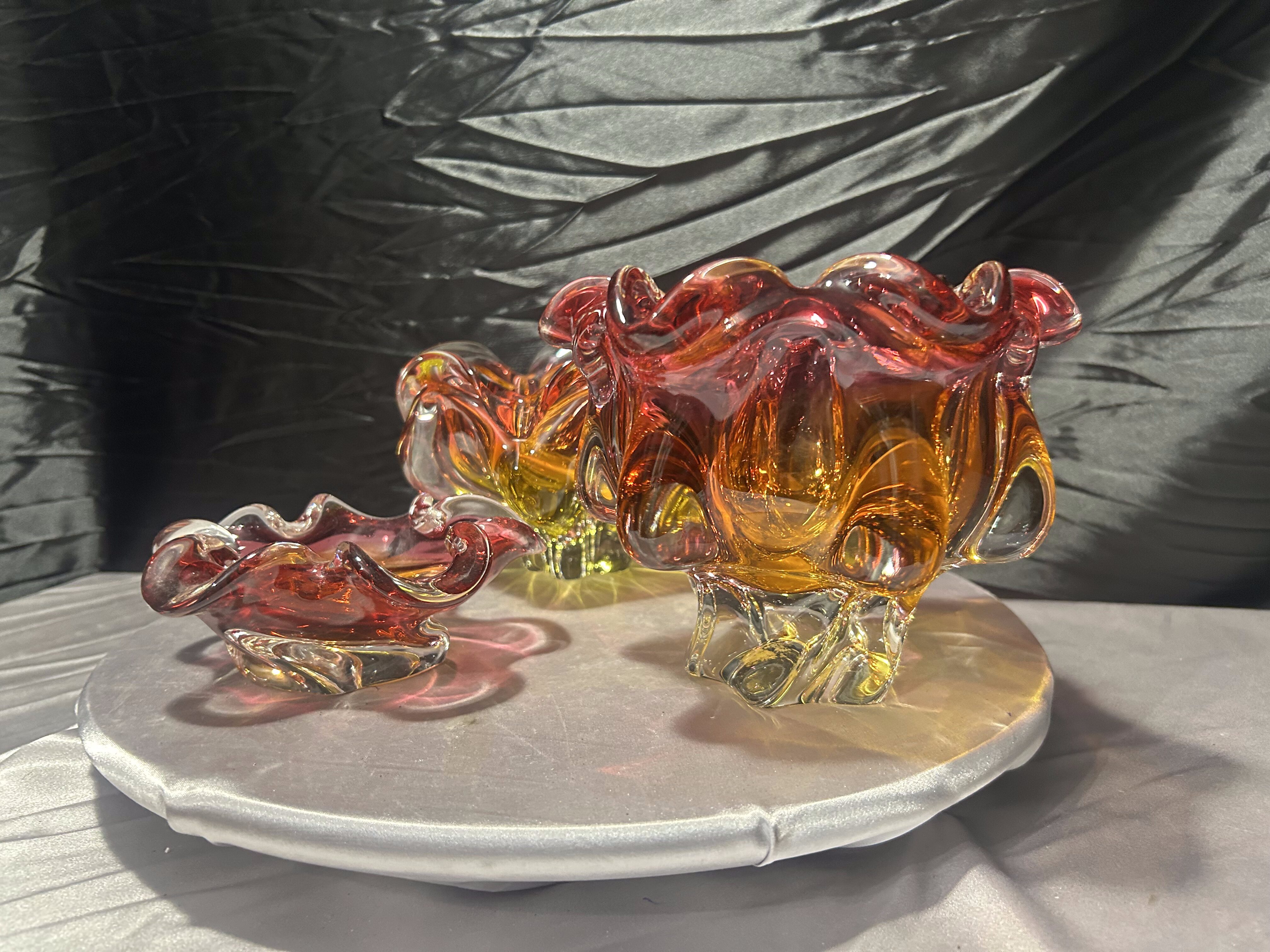 Wyjątkowy komplet trzech mis ze szkła artystycznego Bohemia, zaprojektowanych przez Józefa Hospodkę – jednego z najbardziej rozpoznawalnych twórców czeskiego szkła XX wieku.