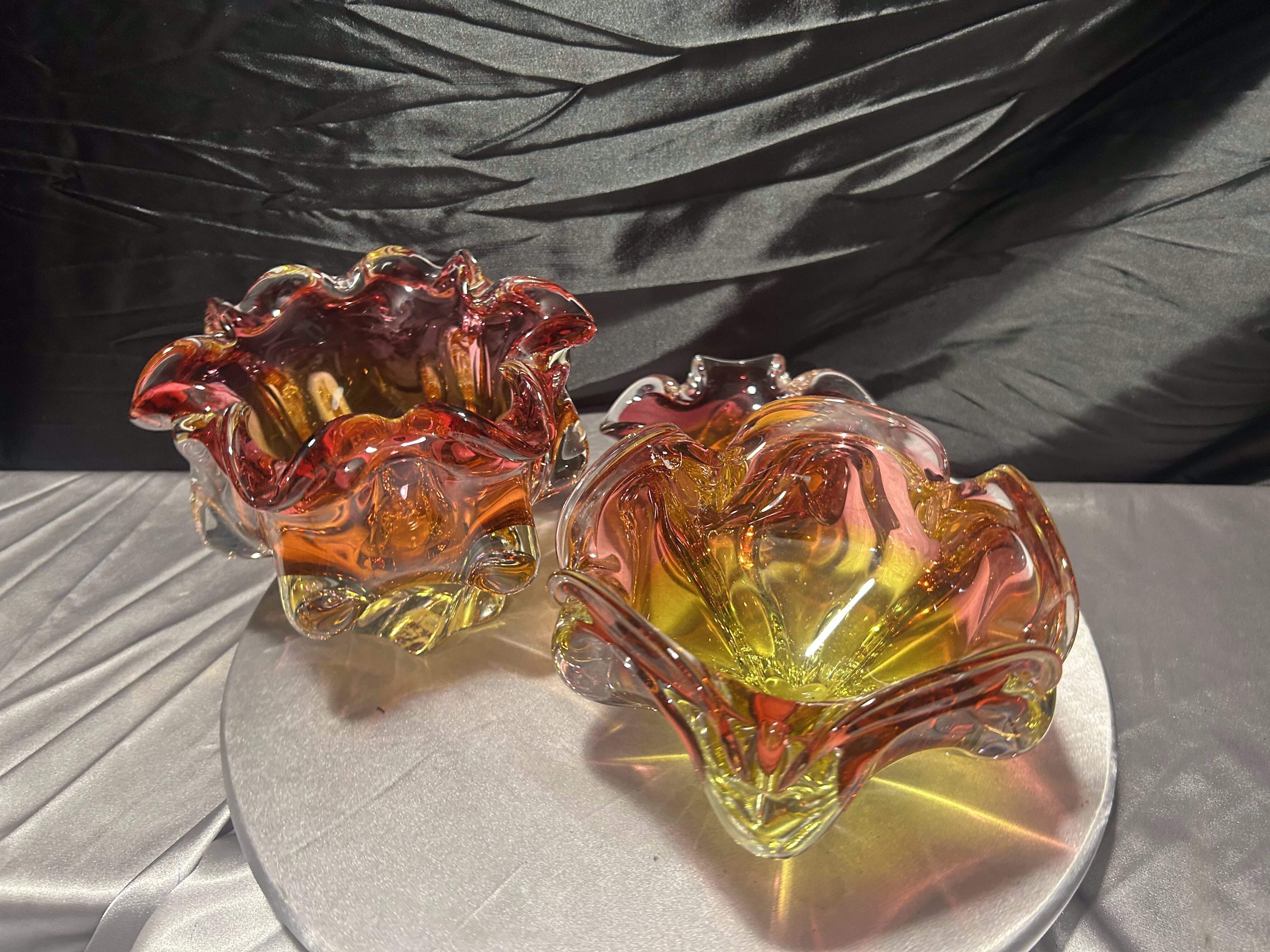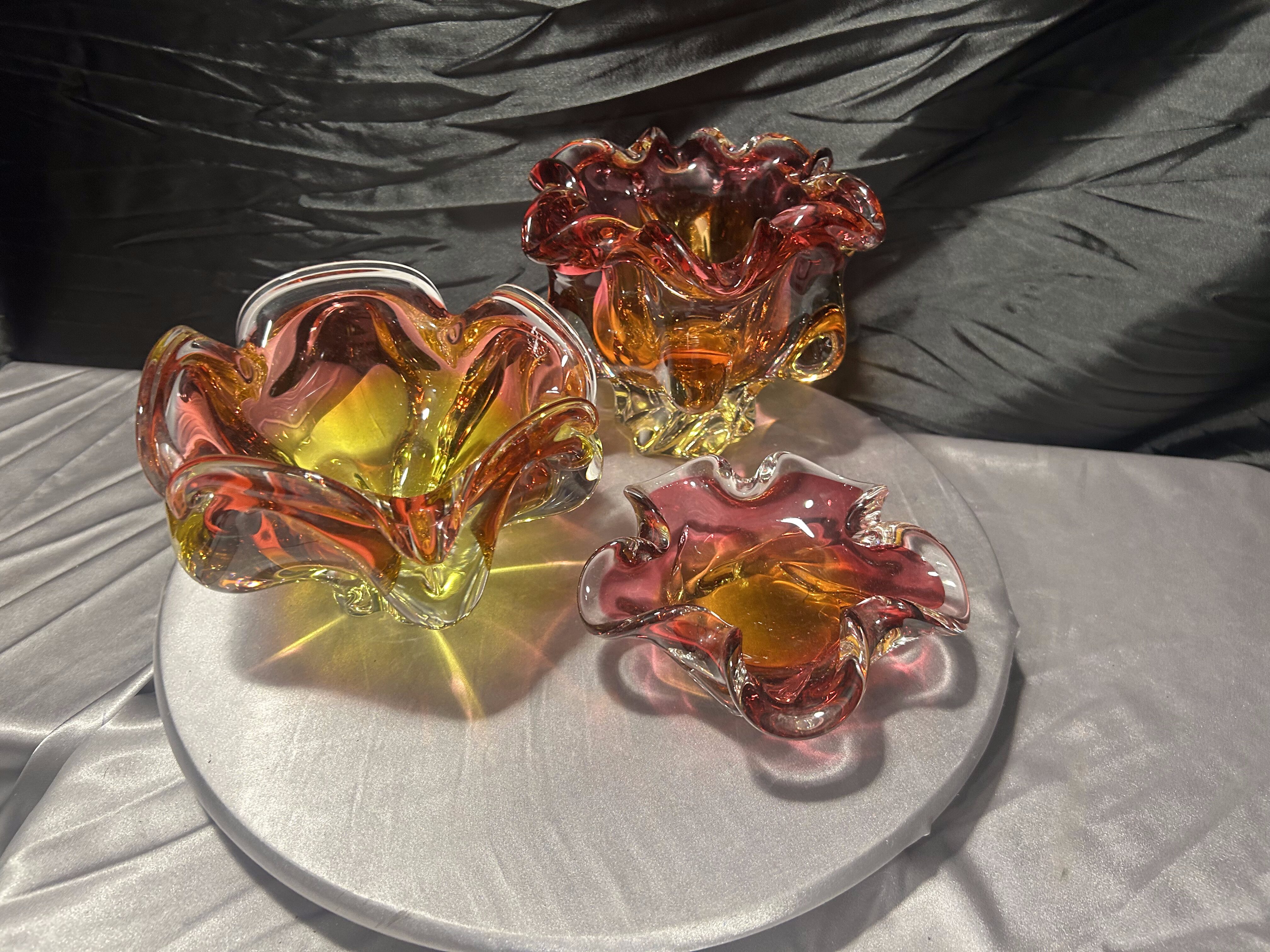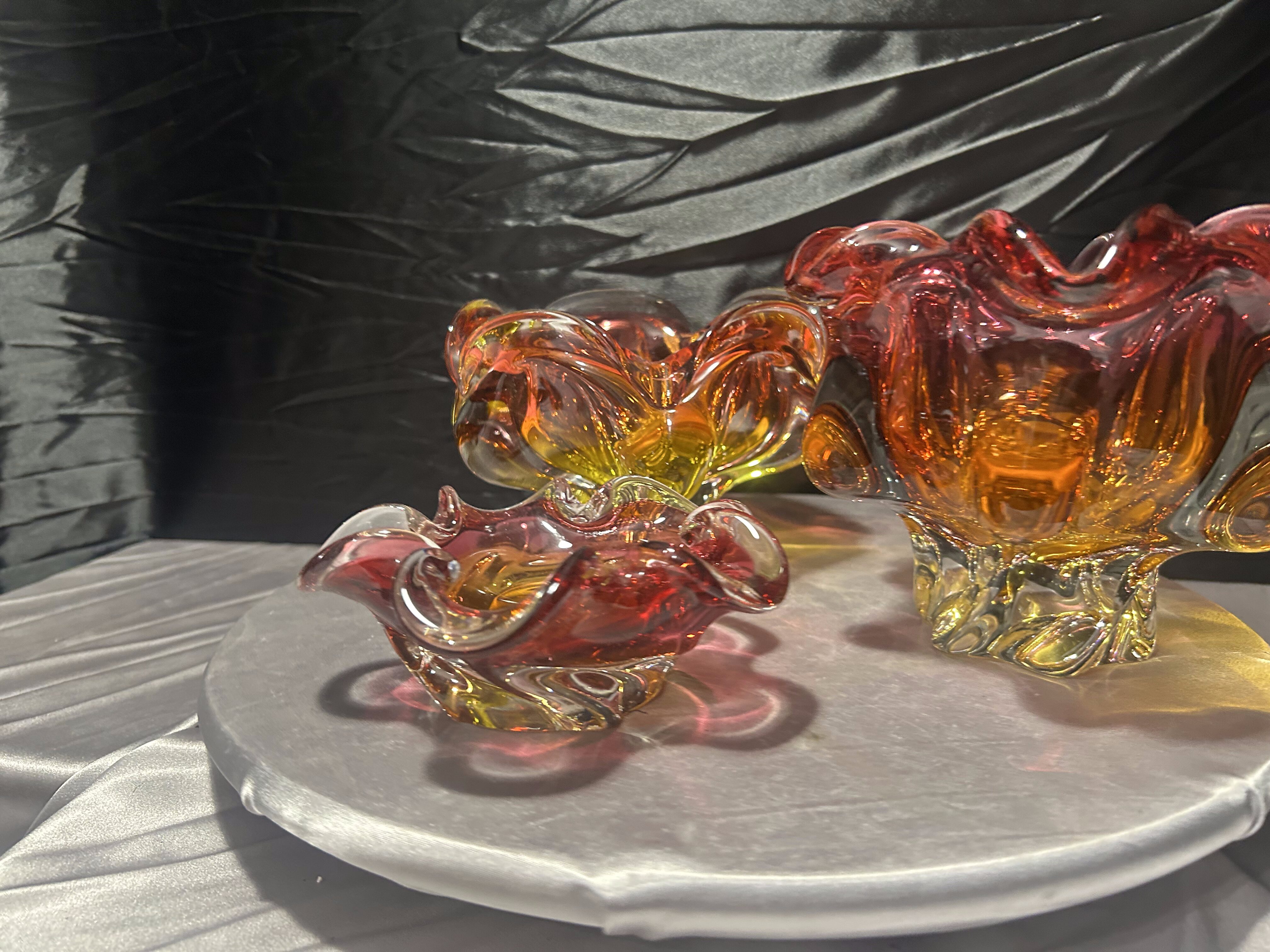 To niepowtarzalny zestaw dla miłośników czeskiego szkła artystycznego. Połączenie dynamicznej formy, intensywnej kolorystyki i ciężkiego wykonania sprawia, że misy stanowią wyrazisty akcent aranżacyjny oraz cenny element kolekcji.