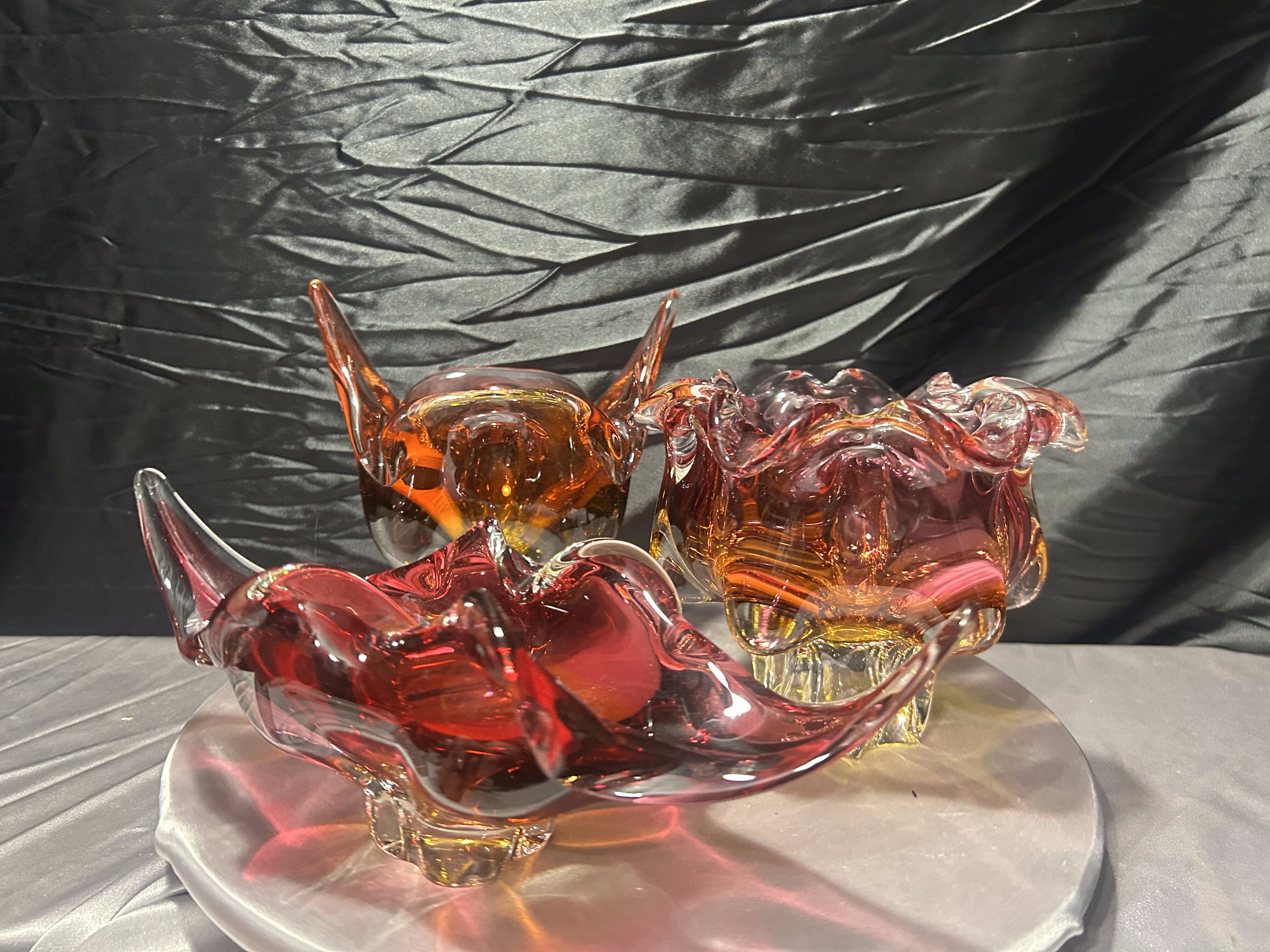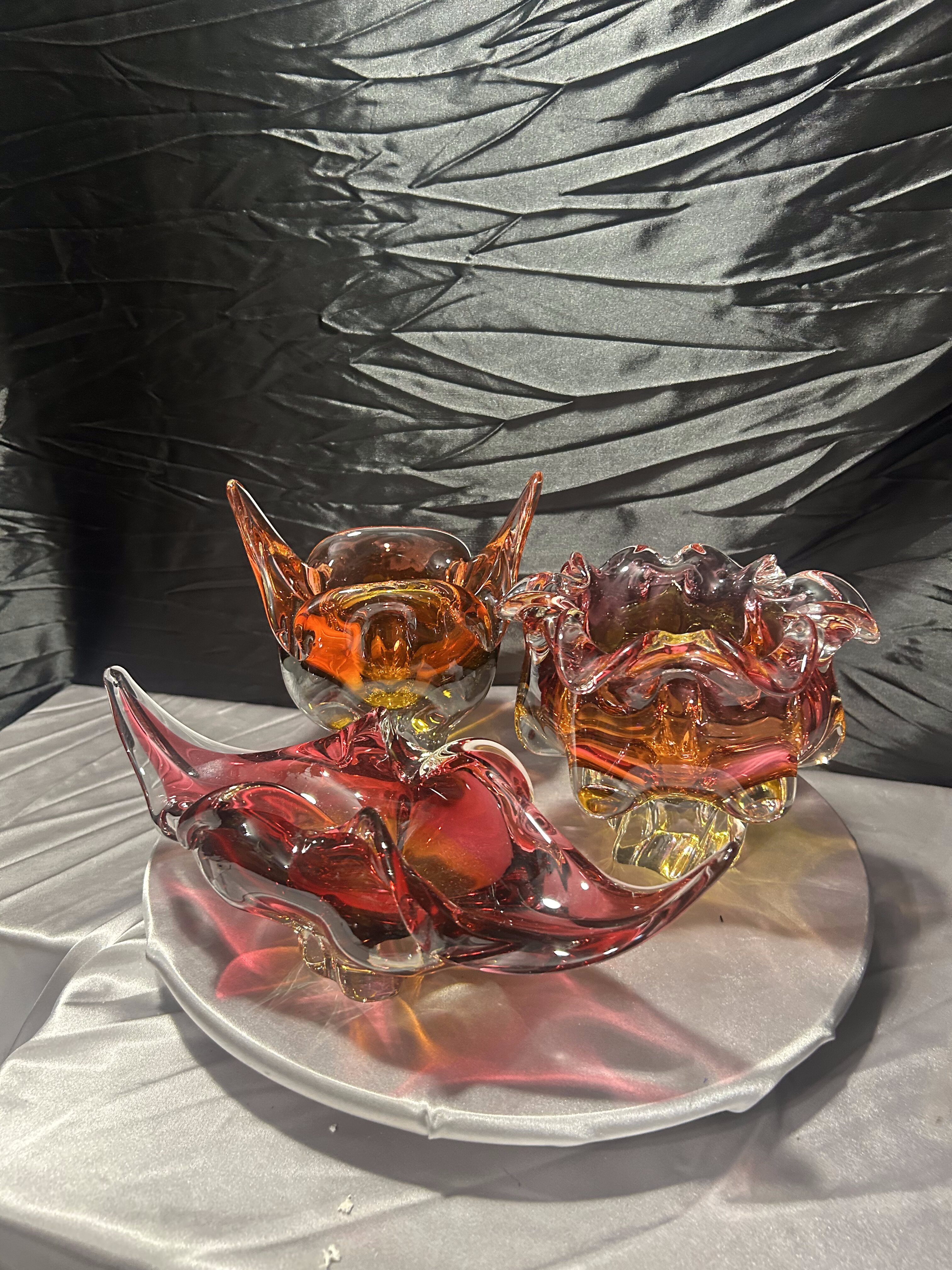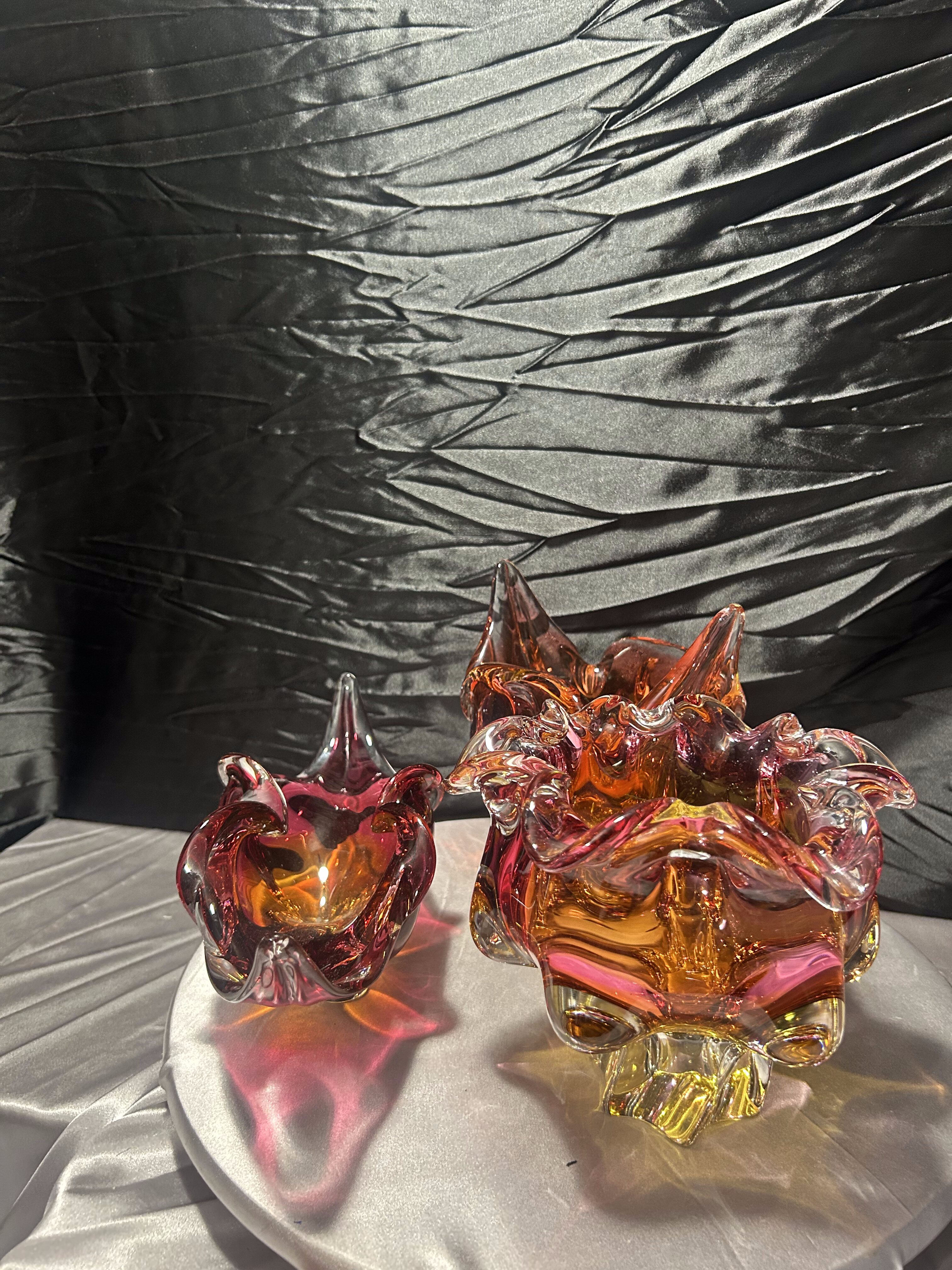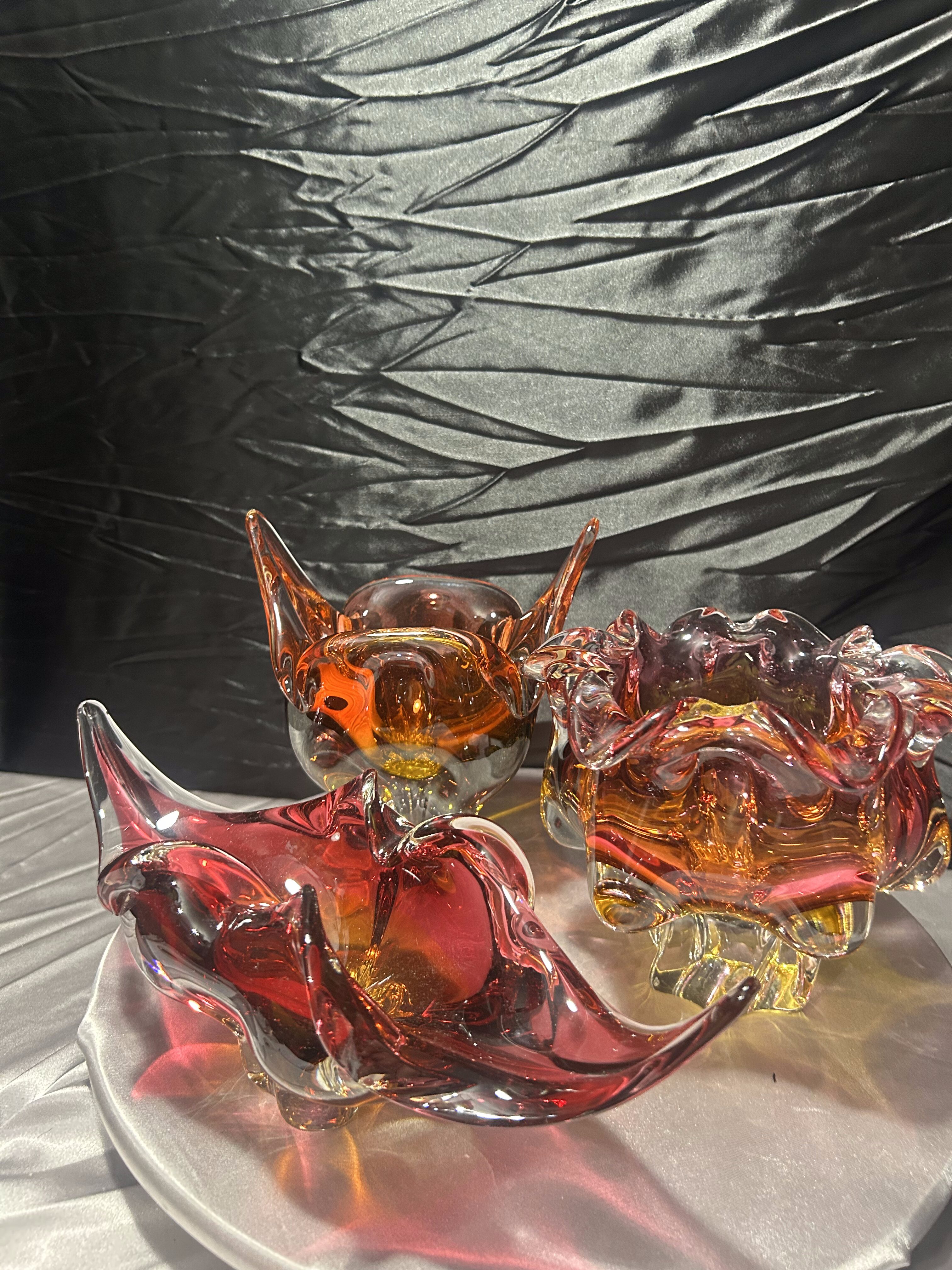 Każda misa posiada dynamiczną, rzeźbiarską formę z charakterystycznymi, falującymi i wyciągniętymi ramionami. Intensywne przejścia kolorystyczne – od czerwieni i rubinu, przez bursztyn, po pomarańcz – tworzą efektowną, świetlistą kompozycję. W strukturze widoczne szkło tłuczone, które daje głębię i wyjątkową grę światła.