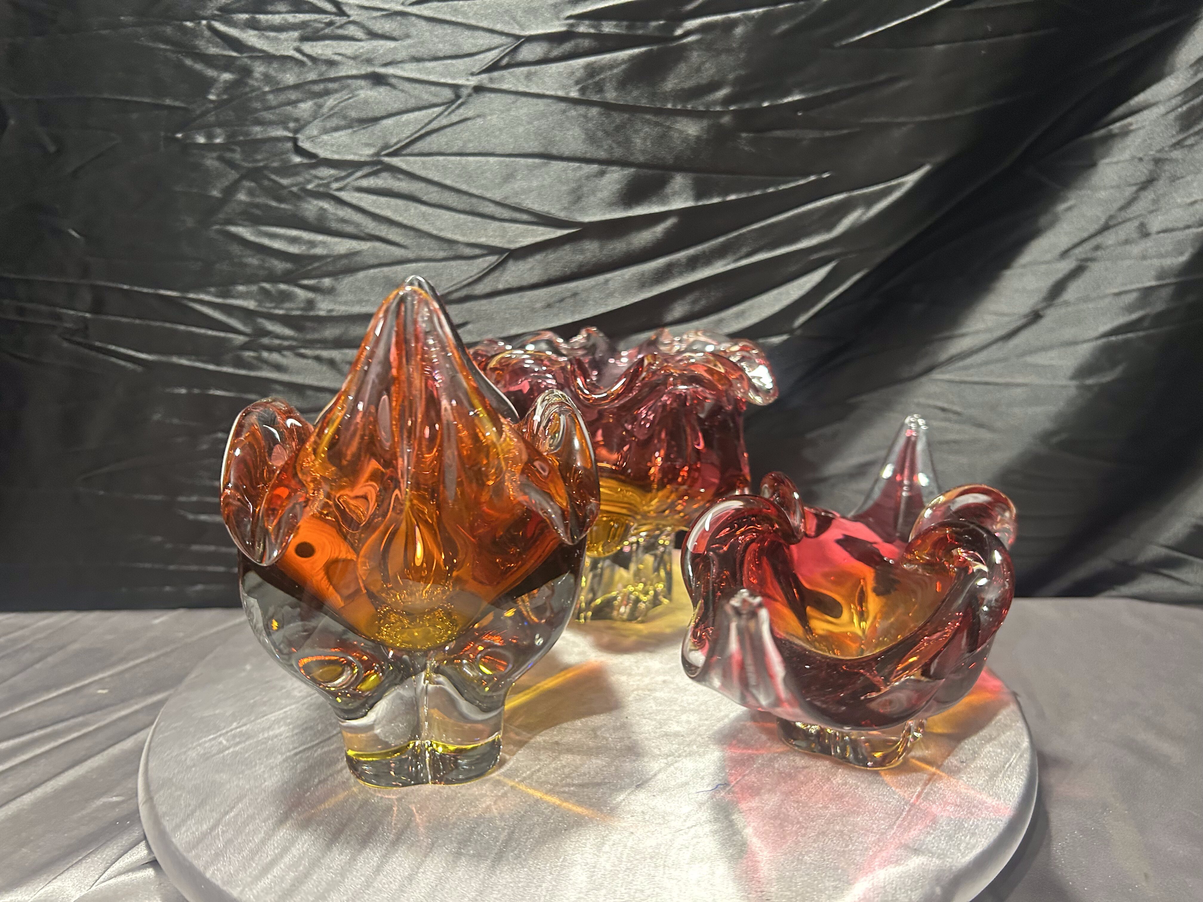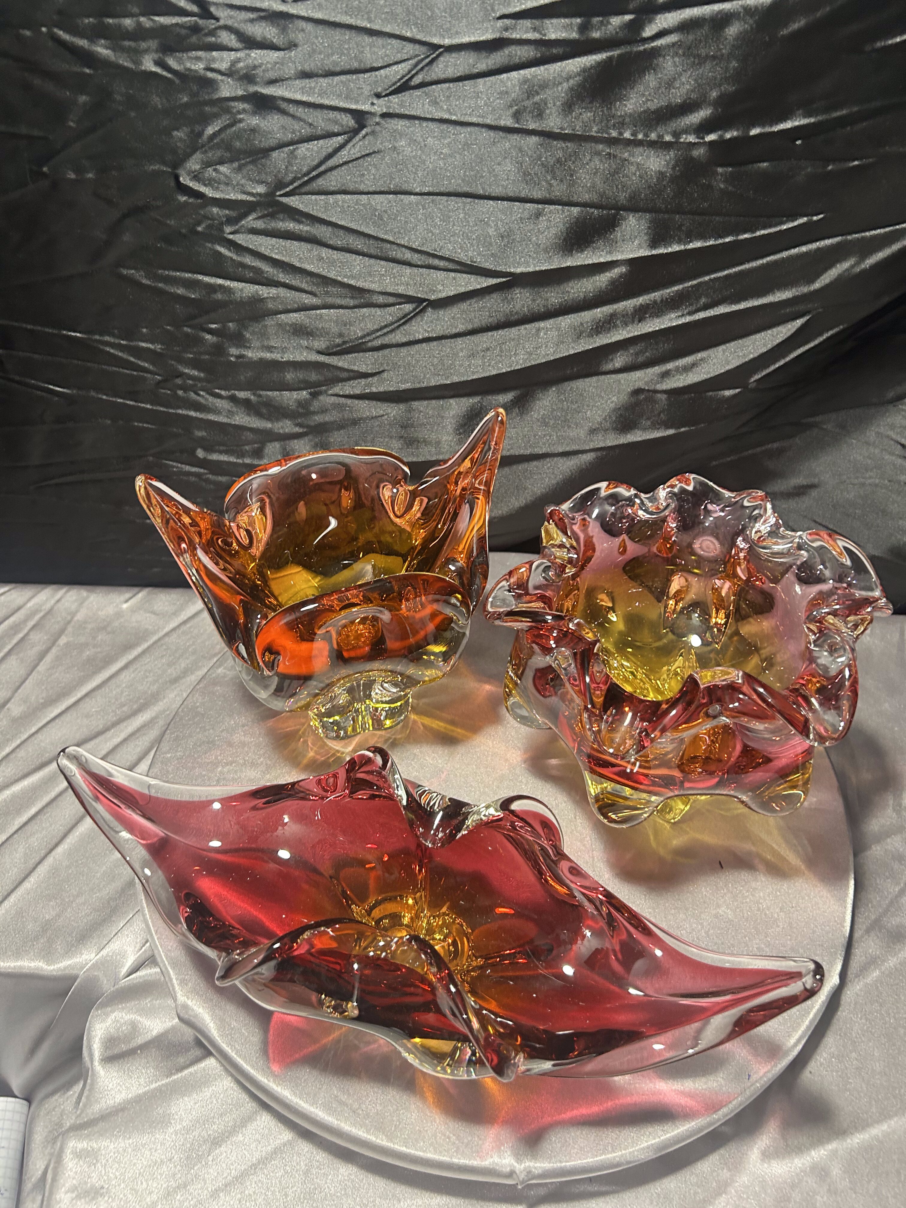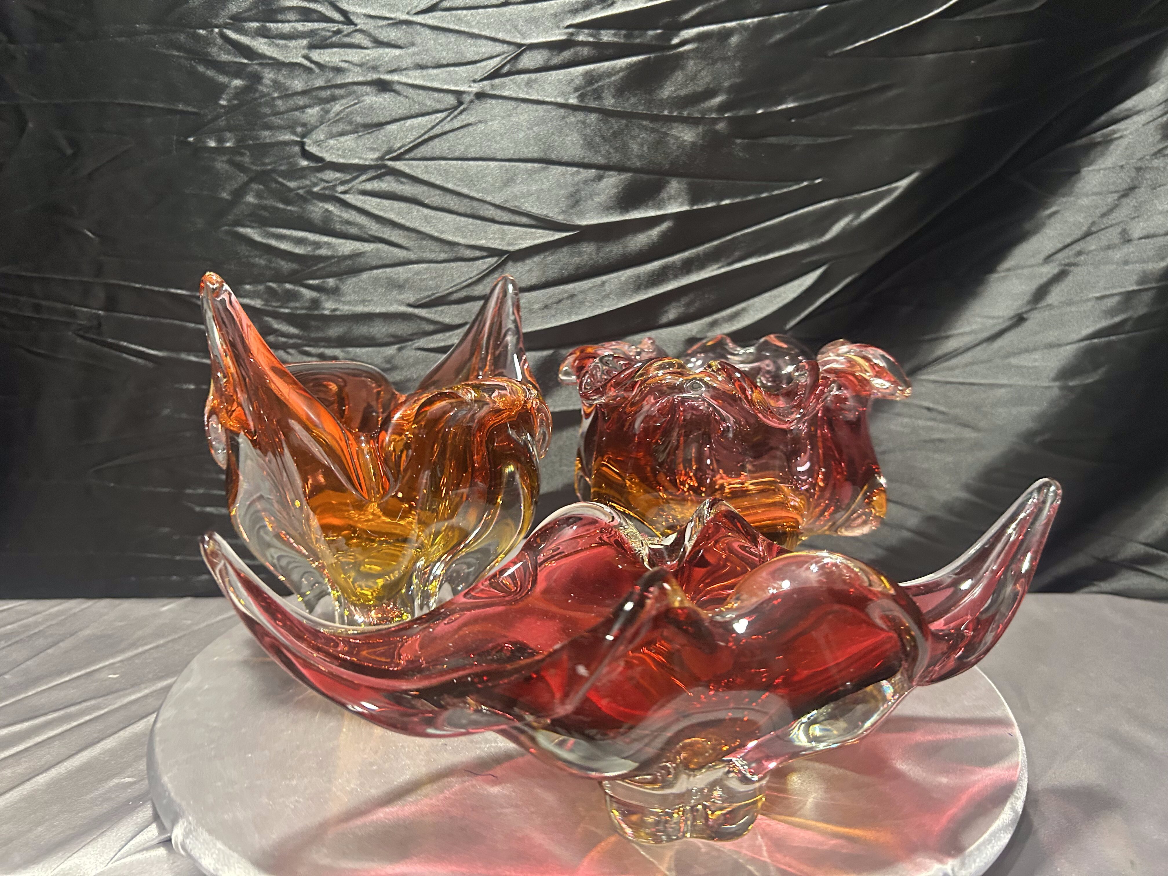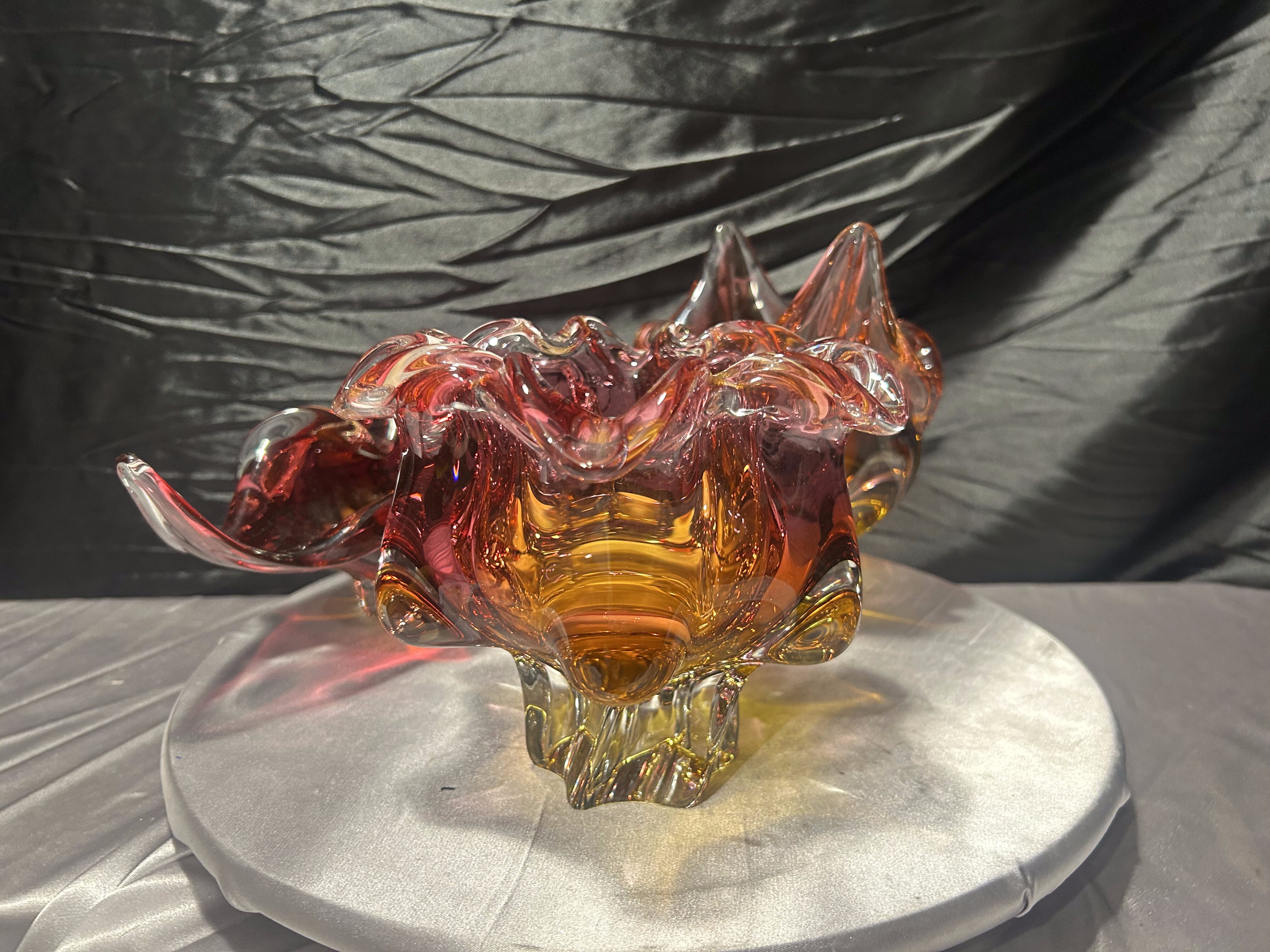 Każda misa posiada dynamiczną, rzeźbiarską formę z charakterystycznymi, falującymi i wyciągniętymi ramionami. Intensywne przejścia kolorystyczne – od czerwieni i rubinu, przez bursztyn, po pomarańcz – tworzą efektowną, świetlistą kompozycję. W strukturze widoczne szkło tłuczone, które daje głębię i wyjątkową grę światła.