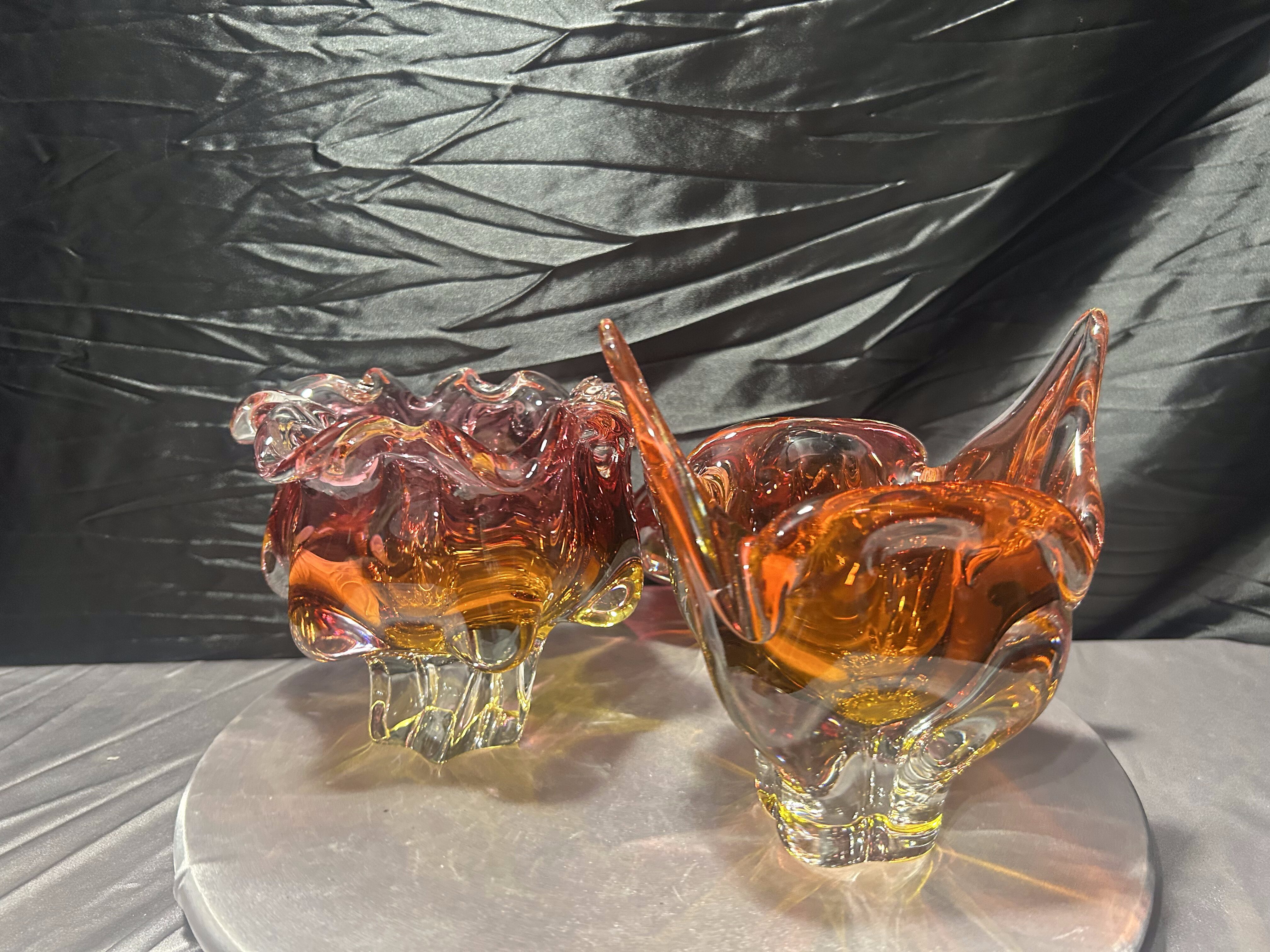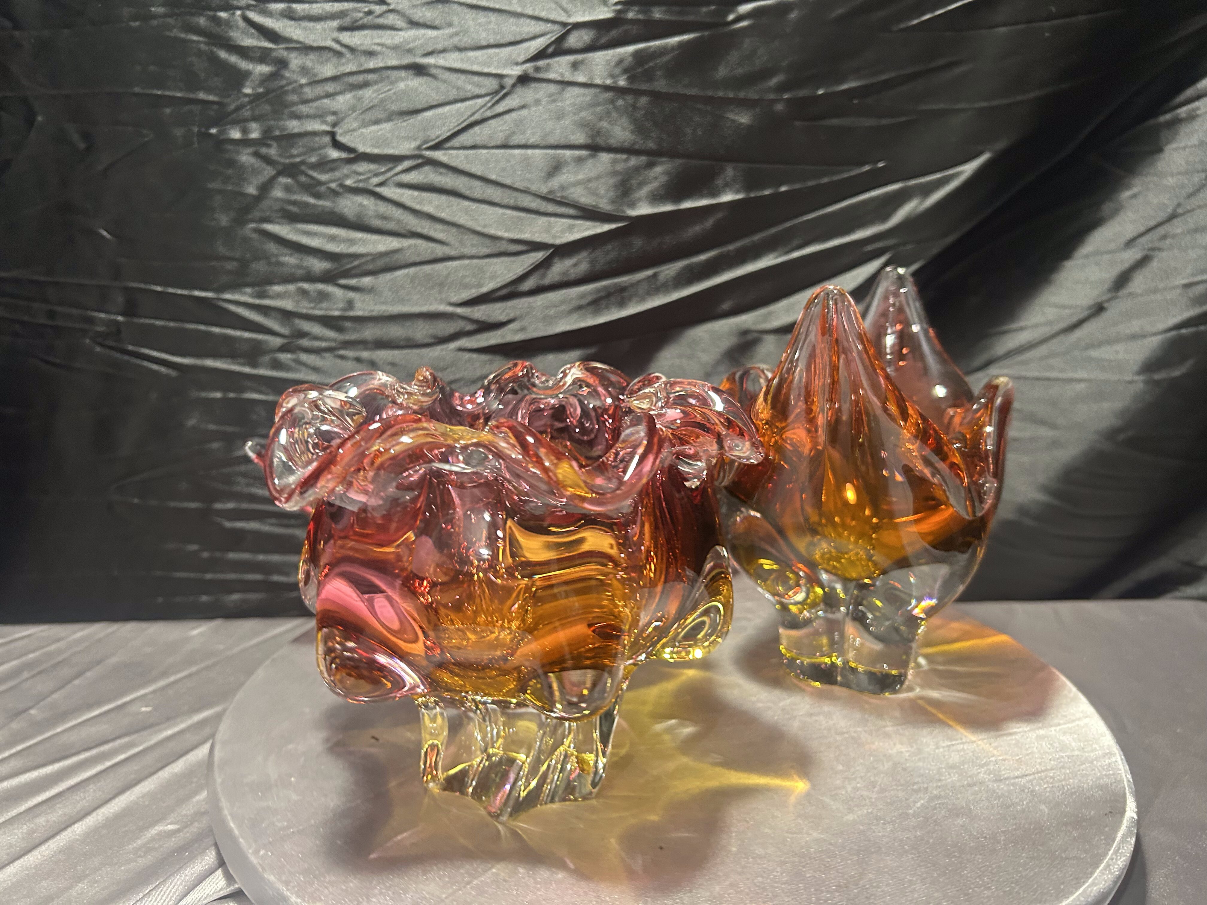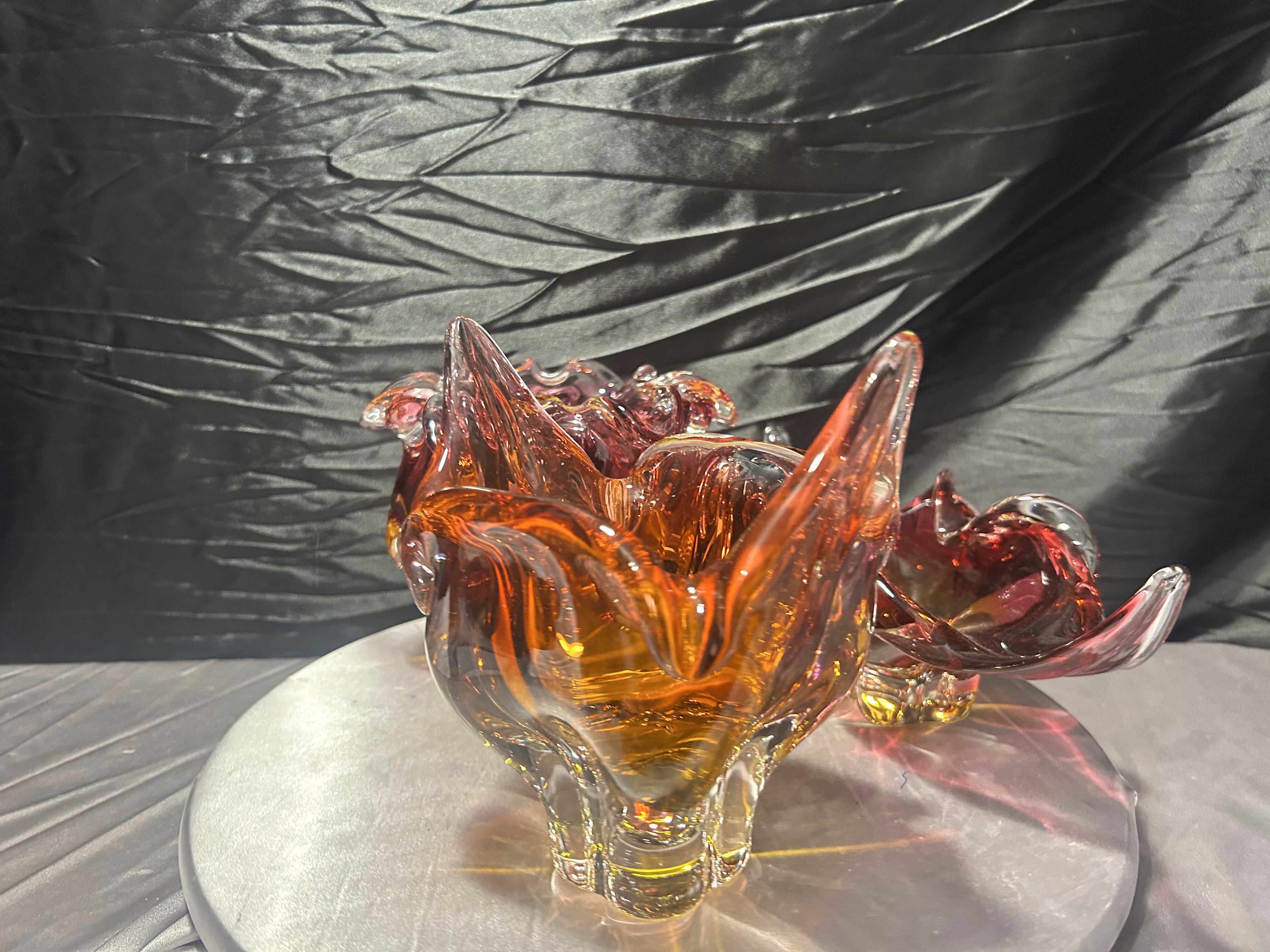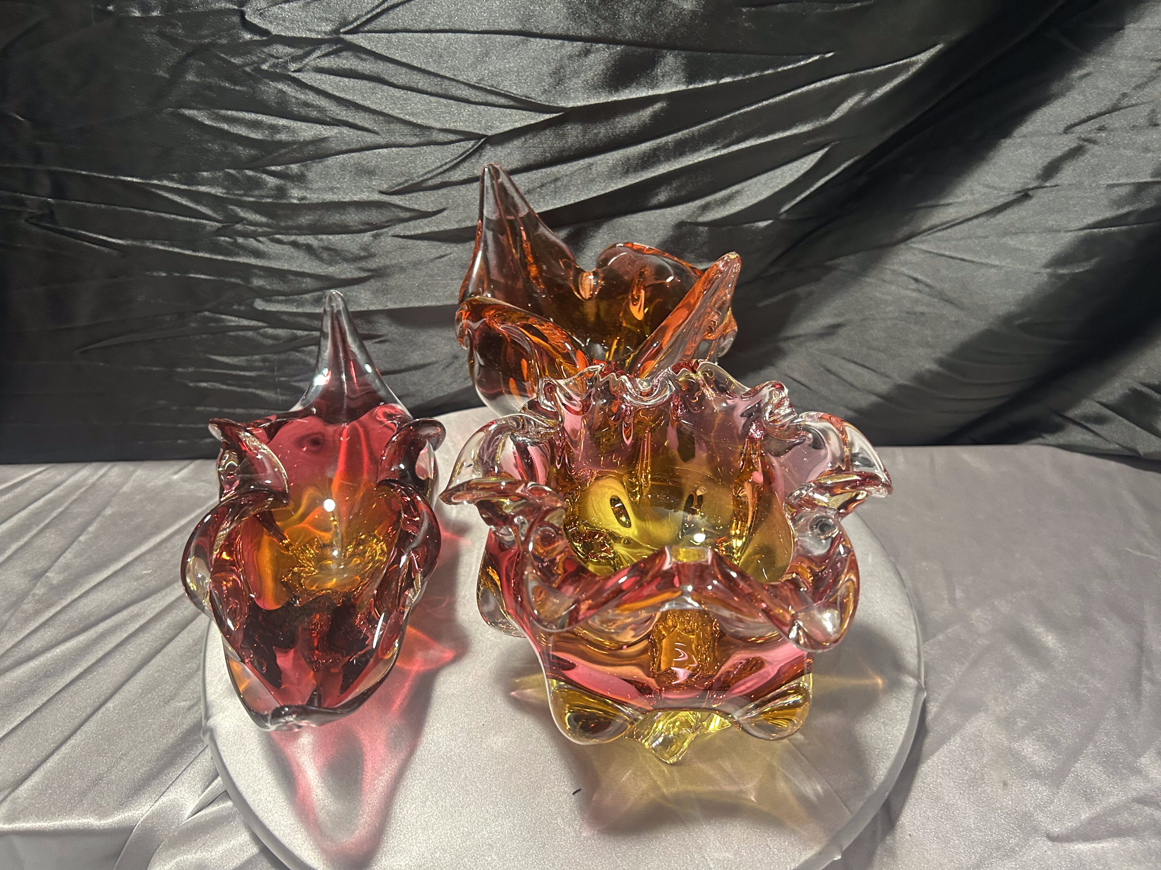 Każda misa posiada dynamiczną, rzeźbiarską formę z charakterystycznymi, falującymi i wyciągniętymi ramionami. Intensywne przejścia kolorystyczne – od czerwieni i rubinu, przez bursztyn, po pomarańcz – tworzą efektowną, świetlistą kompozycję. W strukturze widoczne szkło tłuczone, które daje głębię i wyjątkową grę światła.