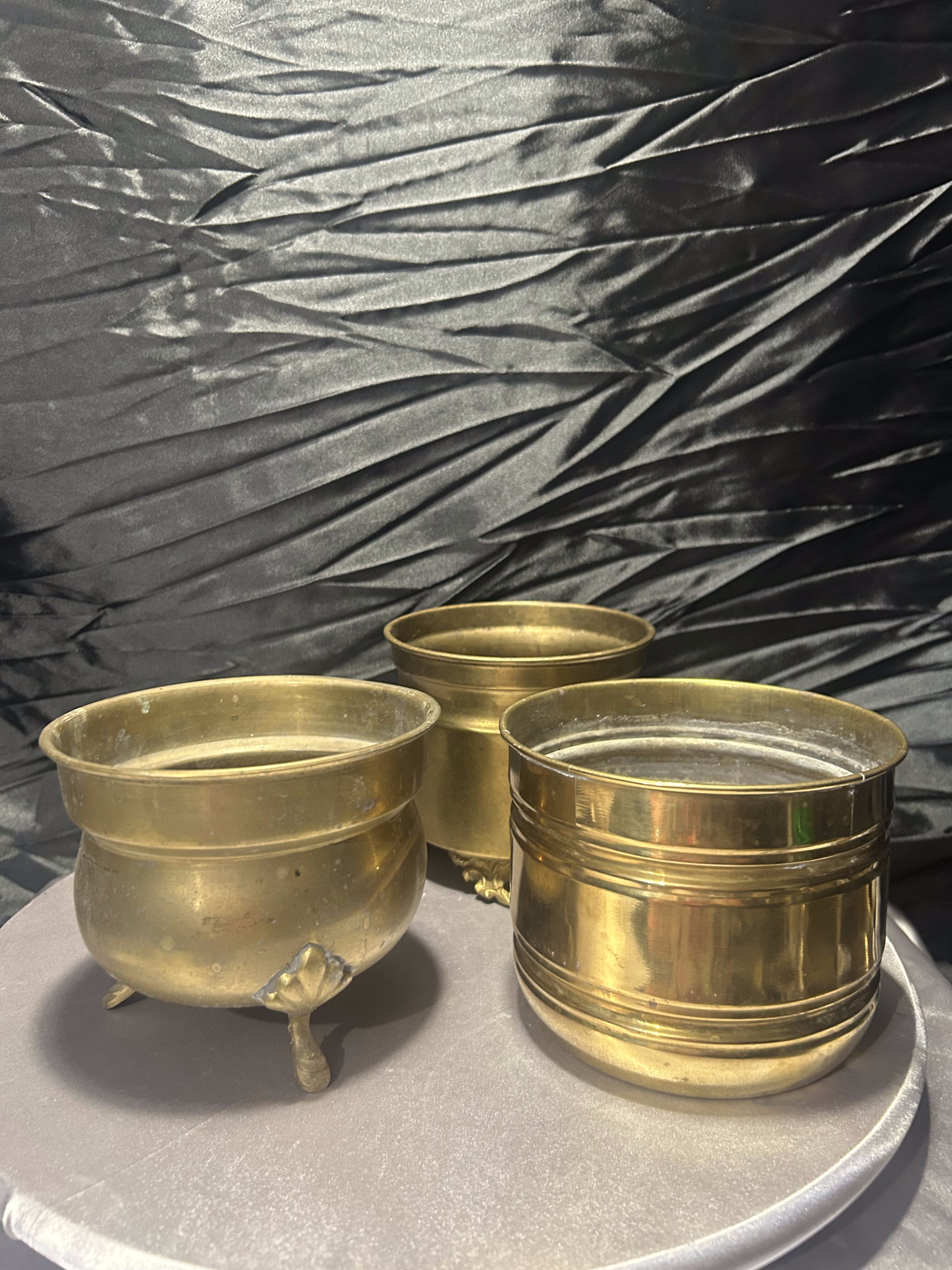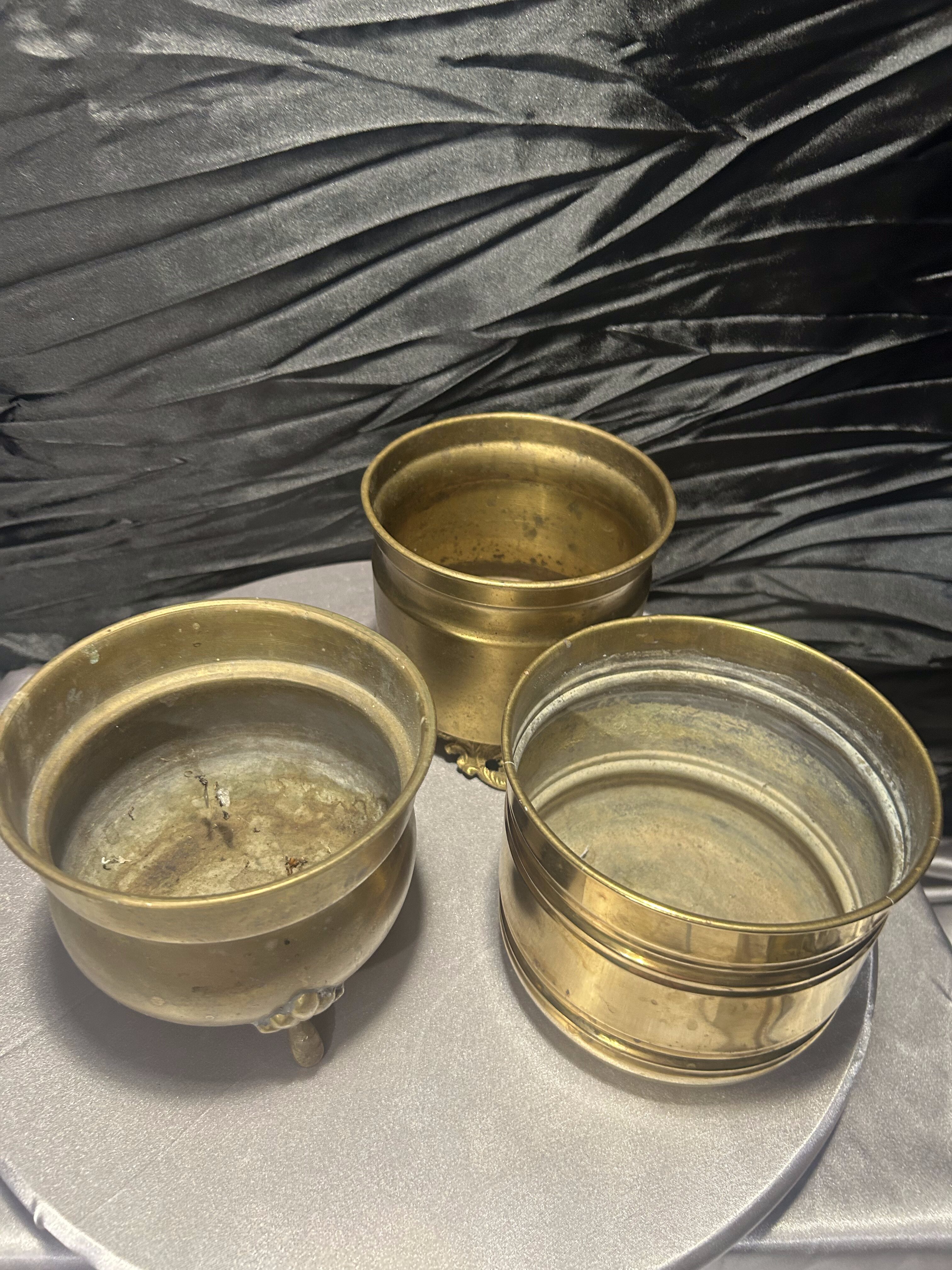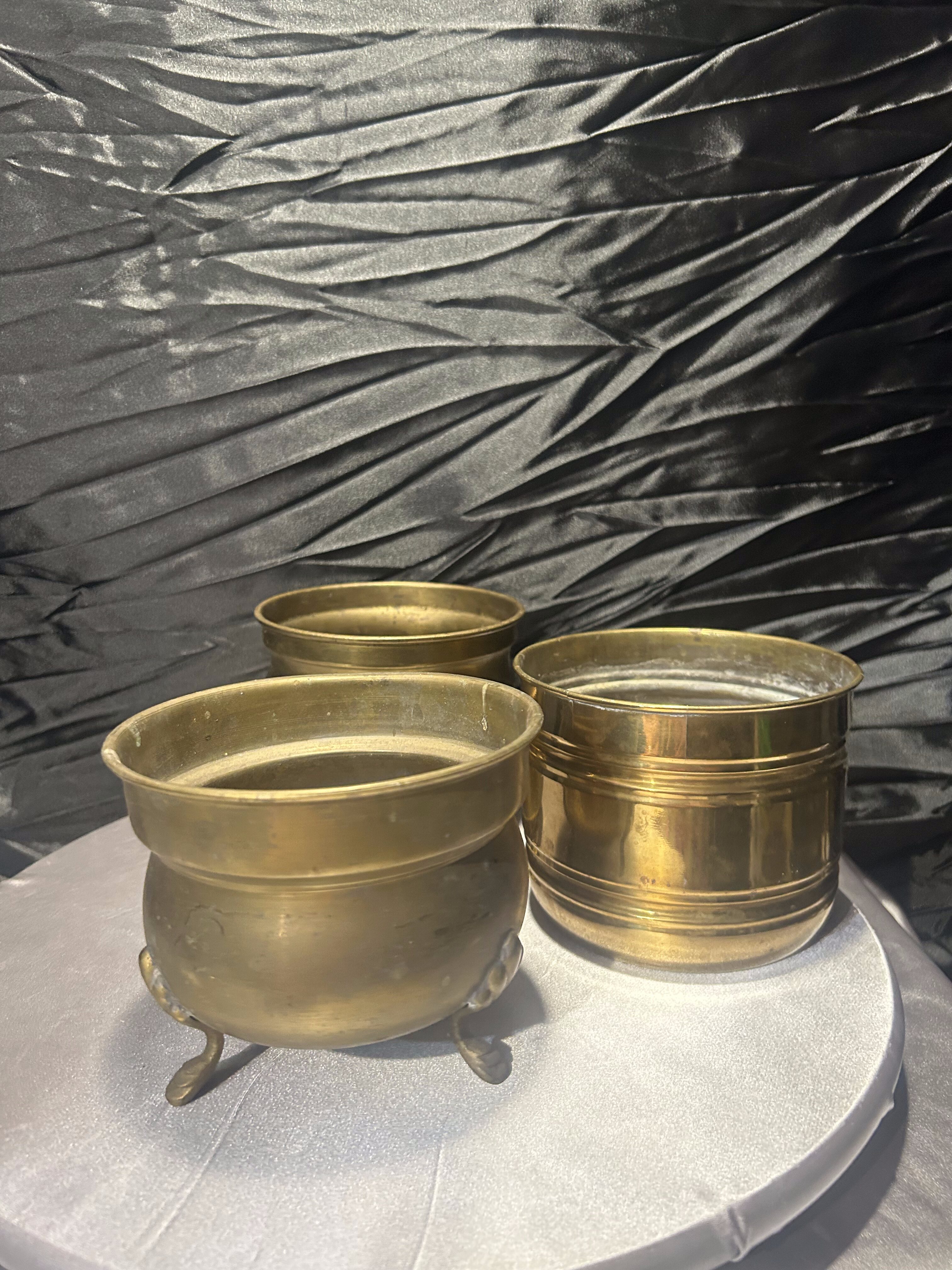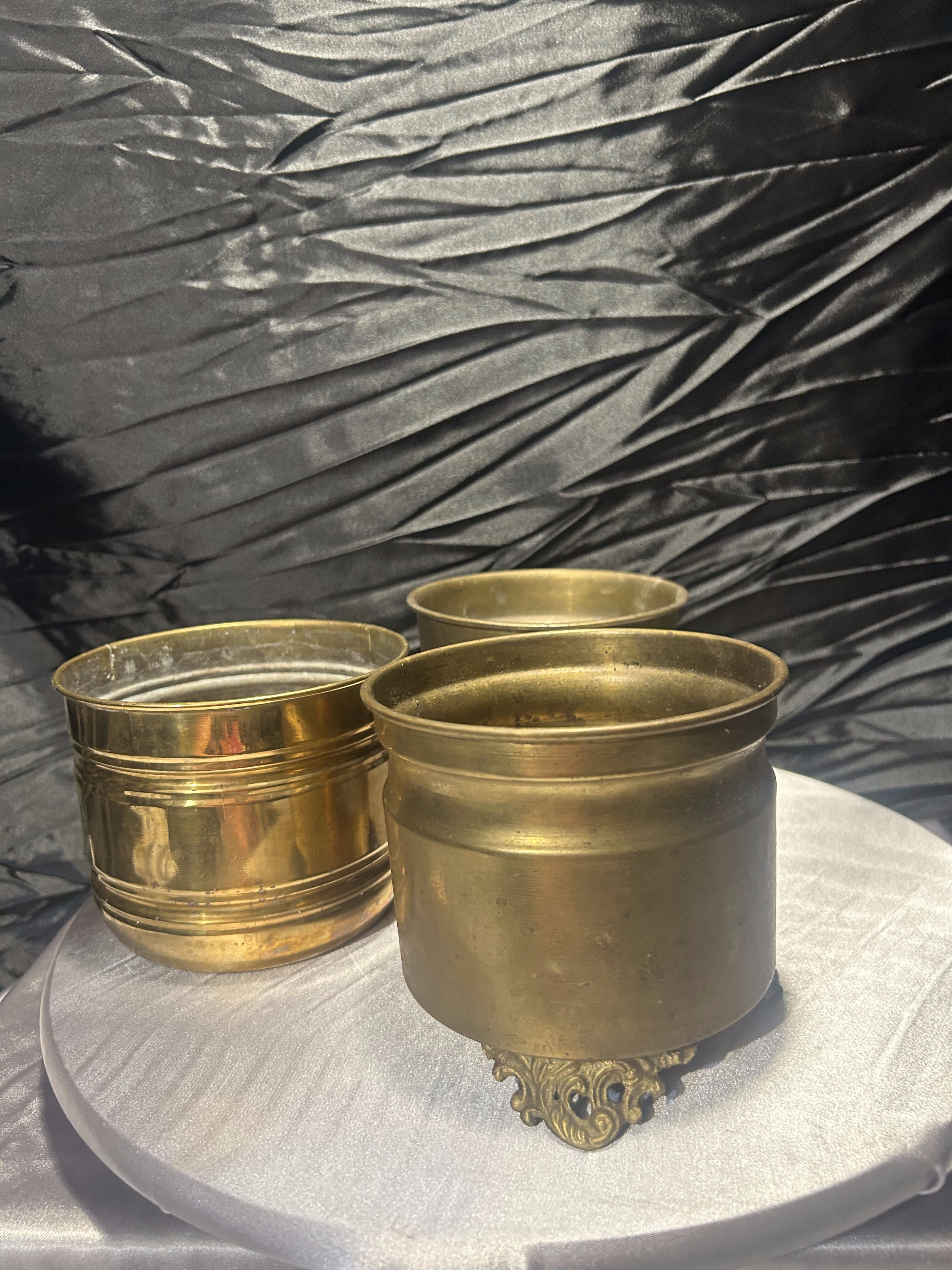 Zestaw trzech dekoracyjnych kwietników wykonanych w całości z mosiądzu. Każdy z nich ma nieco inny kształt, ale wszystkie zachowane są w tej samej, eleganckiej tonacji – to piękna kompozycja w duchu klasycznym. Delikatne różnice w wykończeniu oraz formie nadają im unikalny charakter. Idealne jako doniczki ozdobne, osłonki lub pojemniki w stylu vintage.