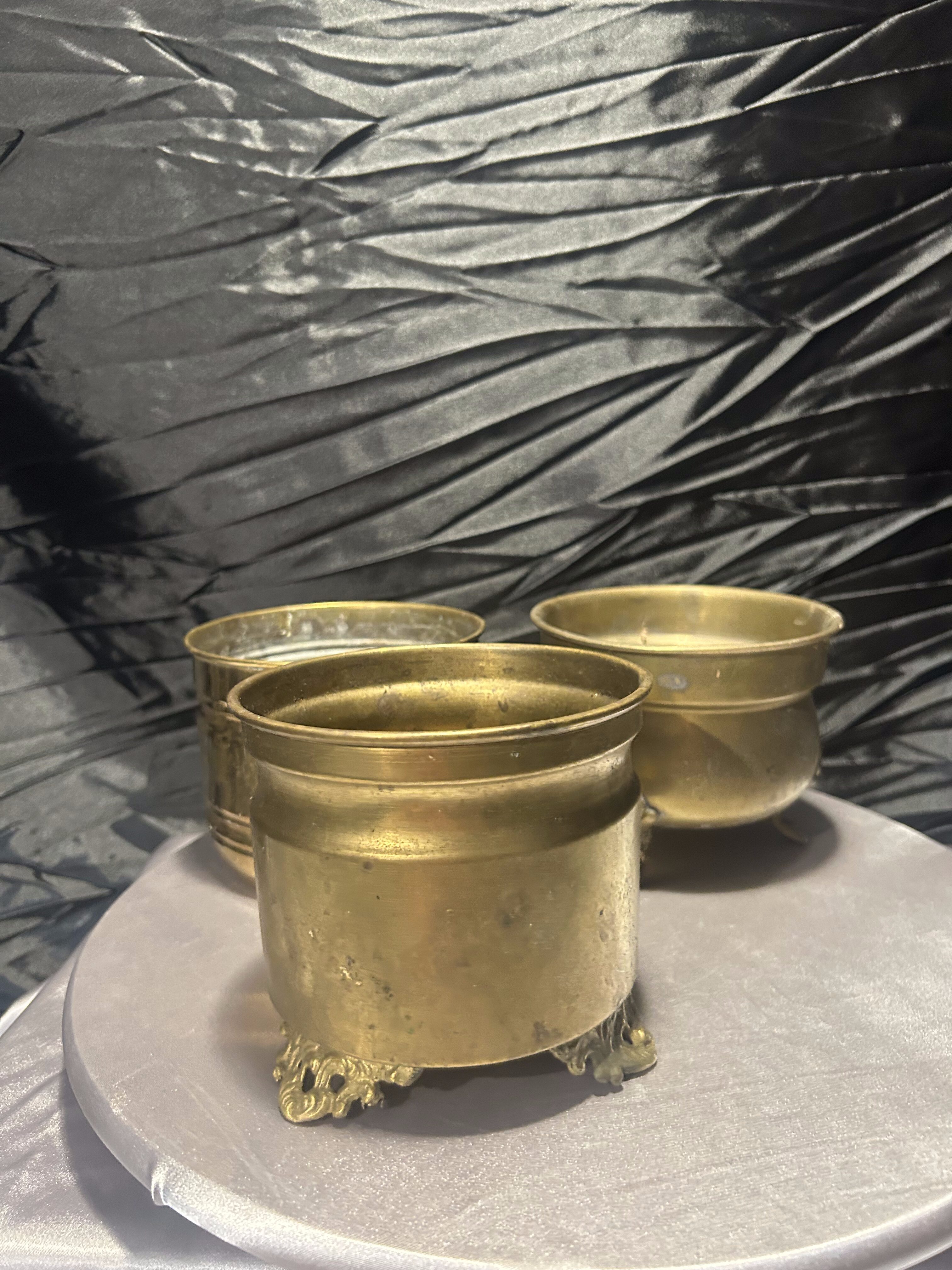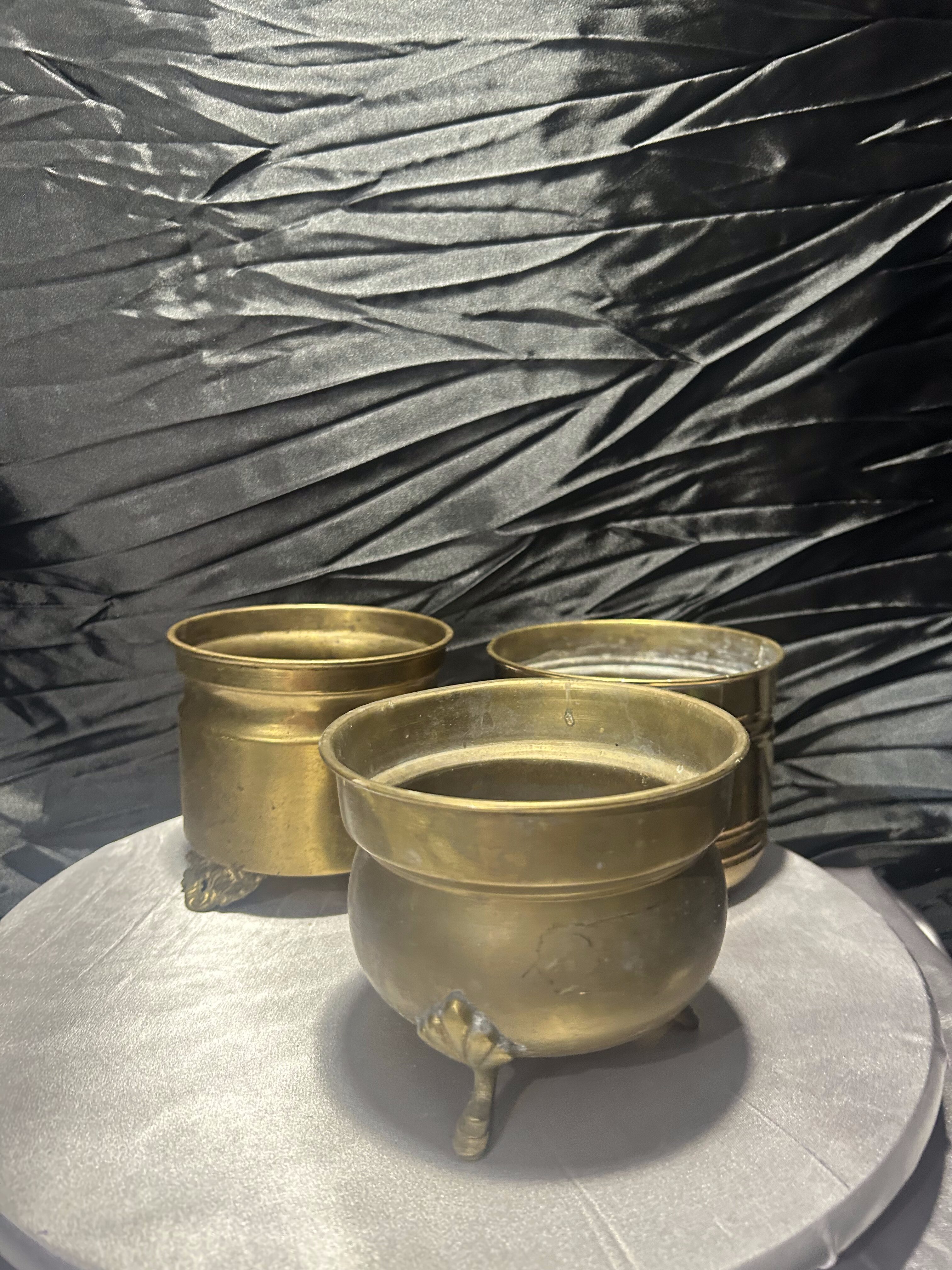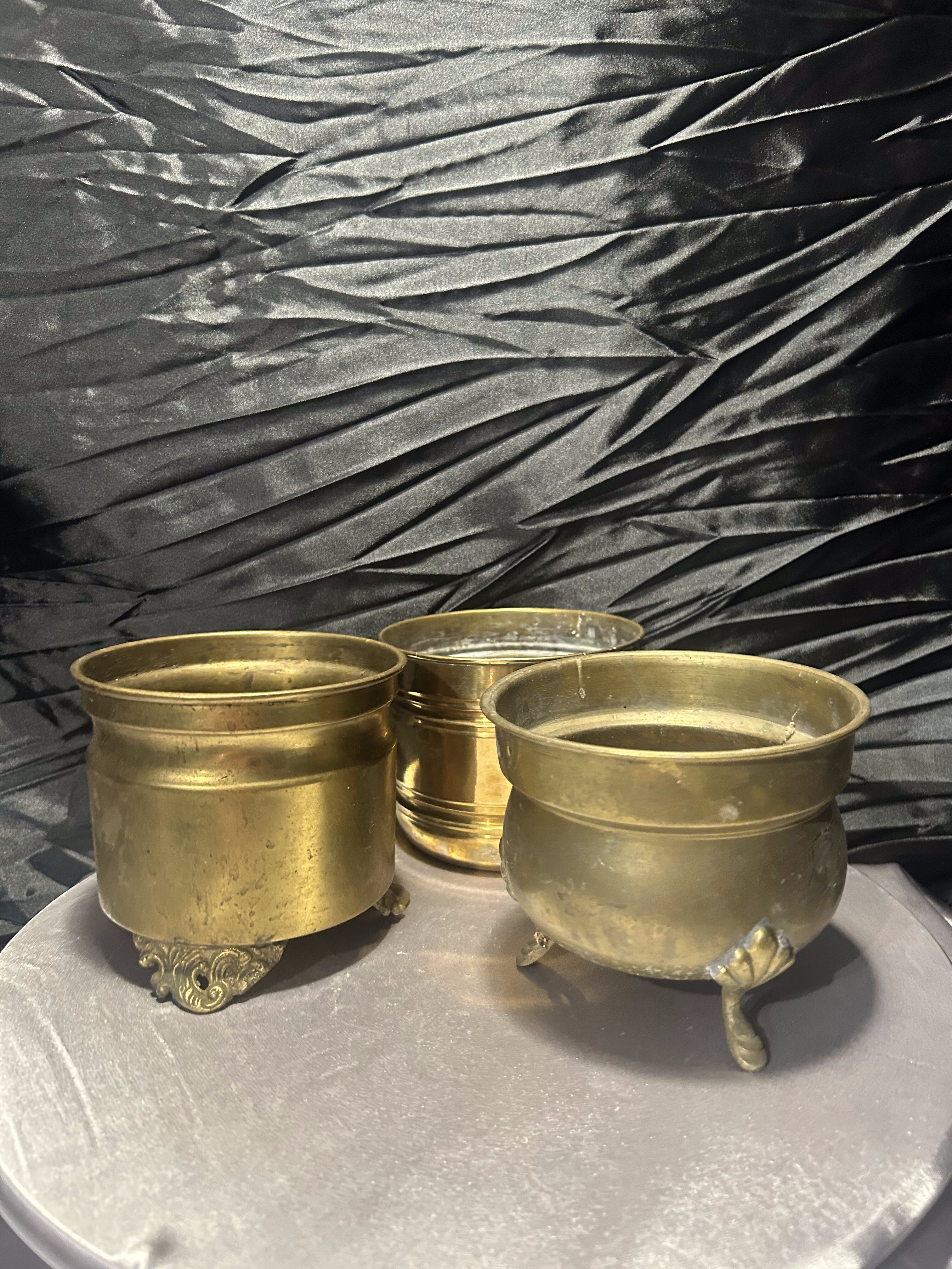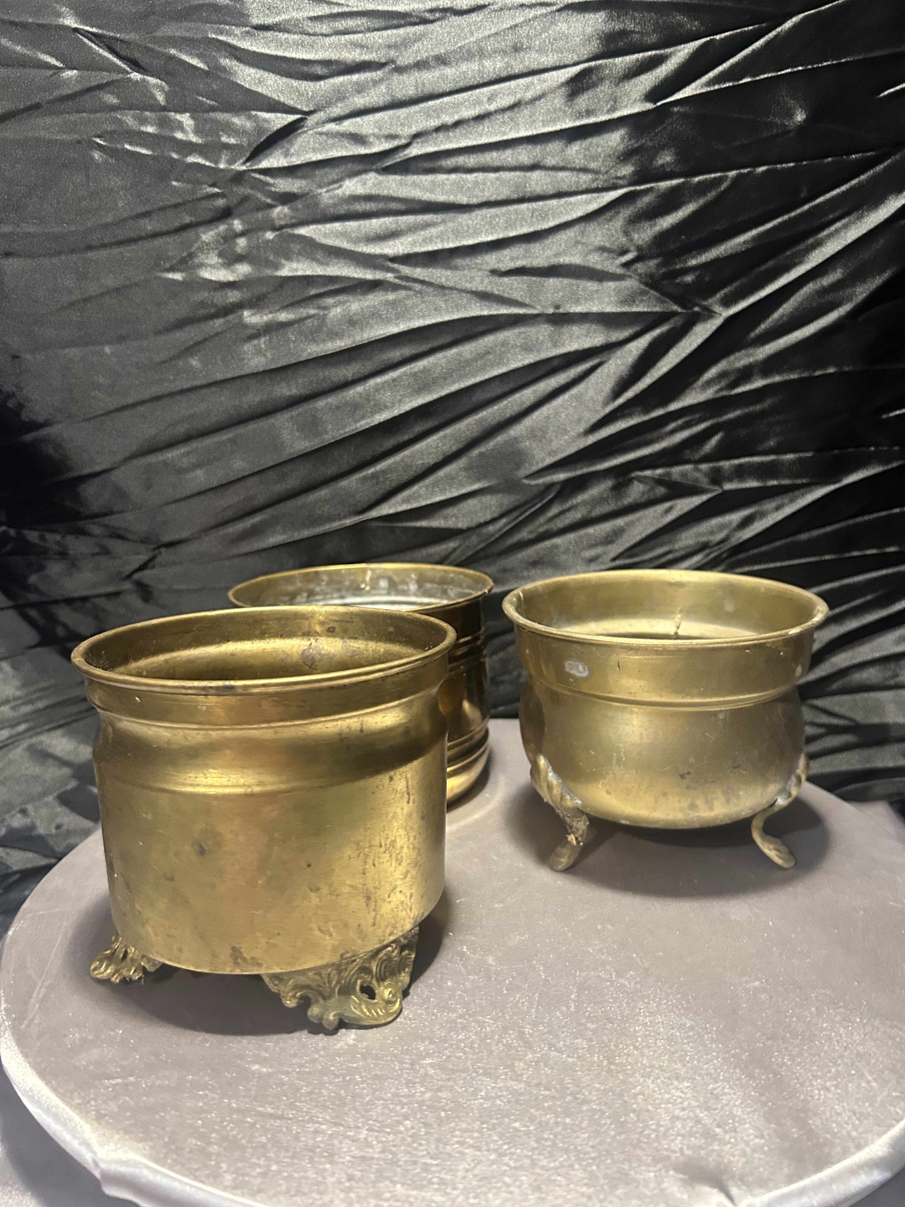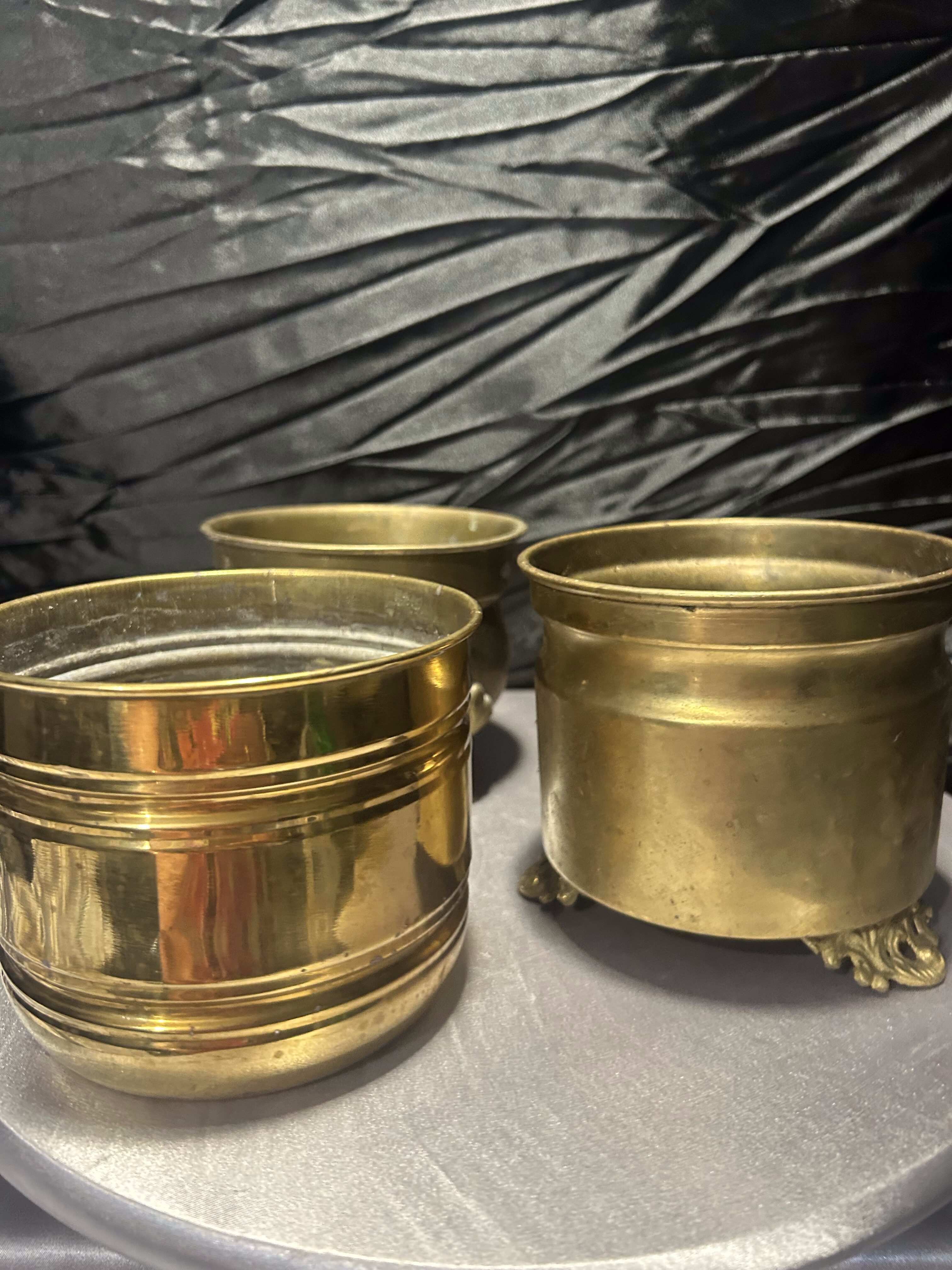 Zestaw trzech dekoracyjnych kwietników wykonanych w całości z mosiądzu. Każdy z nich ma nieco inny kształt, ale wszystkie zachowane są w tej samej, eleganckiej tonacji – to piękna kompozycja w duchu klasycznym. Delikatne różnice w wykończeniu oraz formie nadają im unikalny charakter. Idealne jako doniczki ozdobne, osłonki lub pojemniki w stylu vintage.
