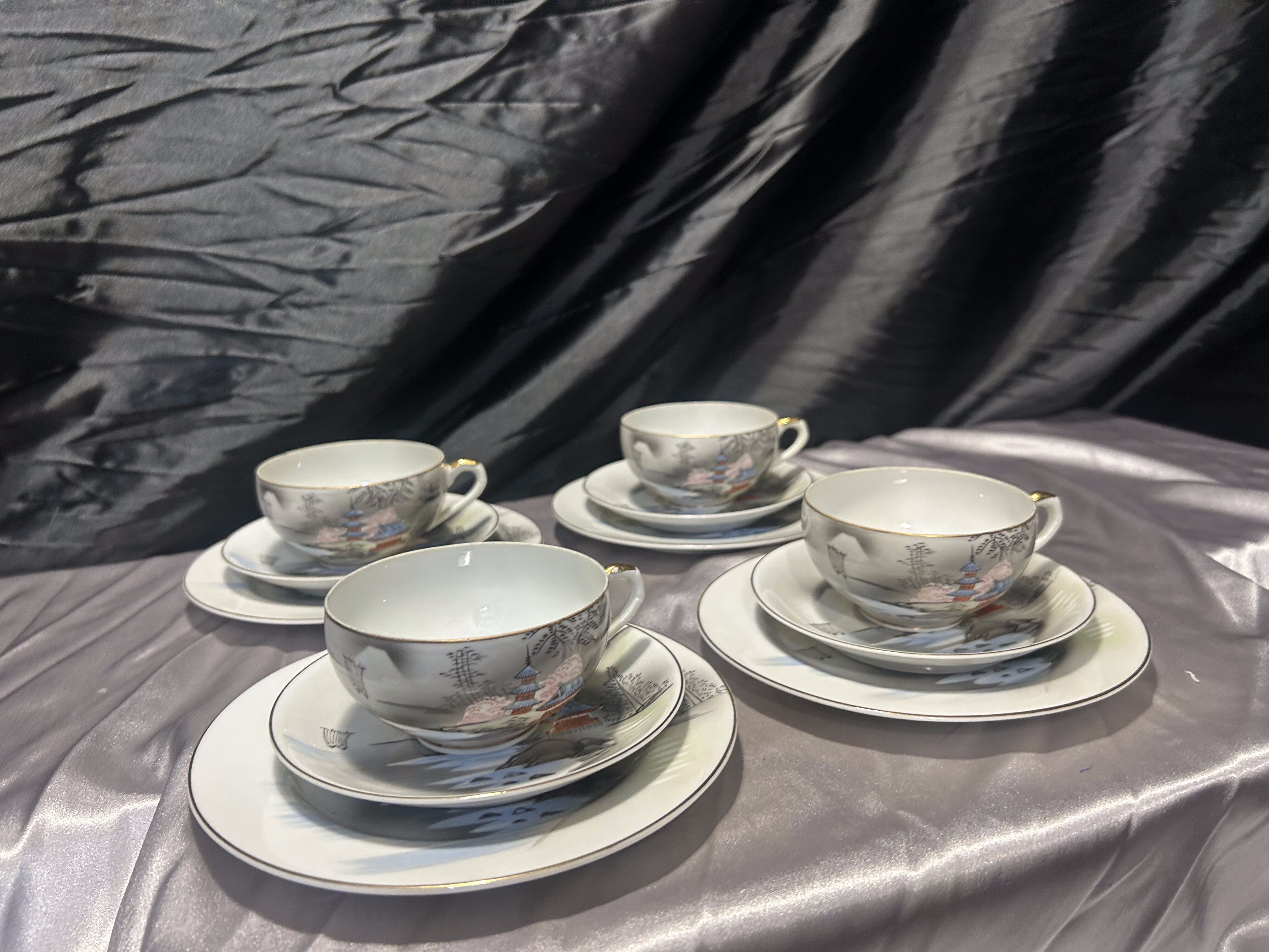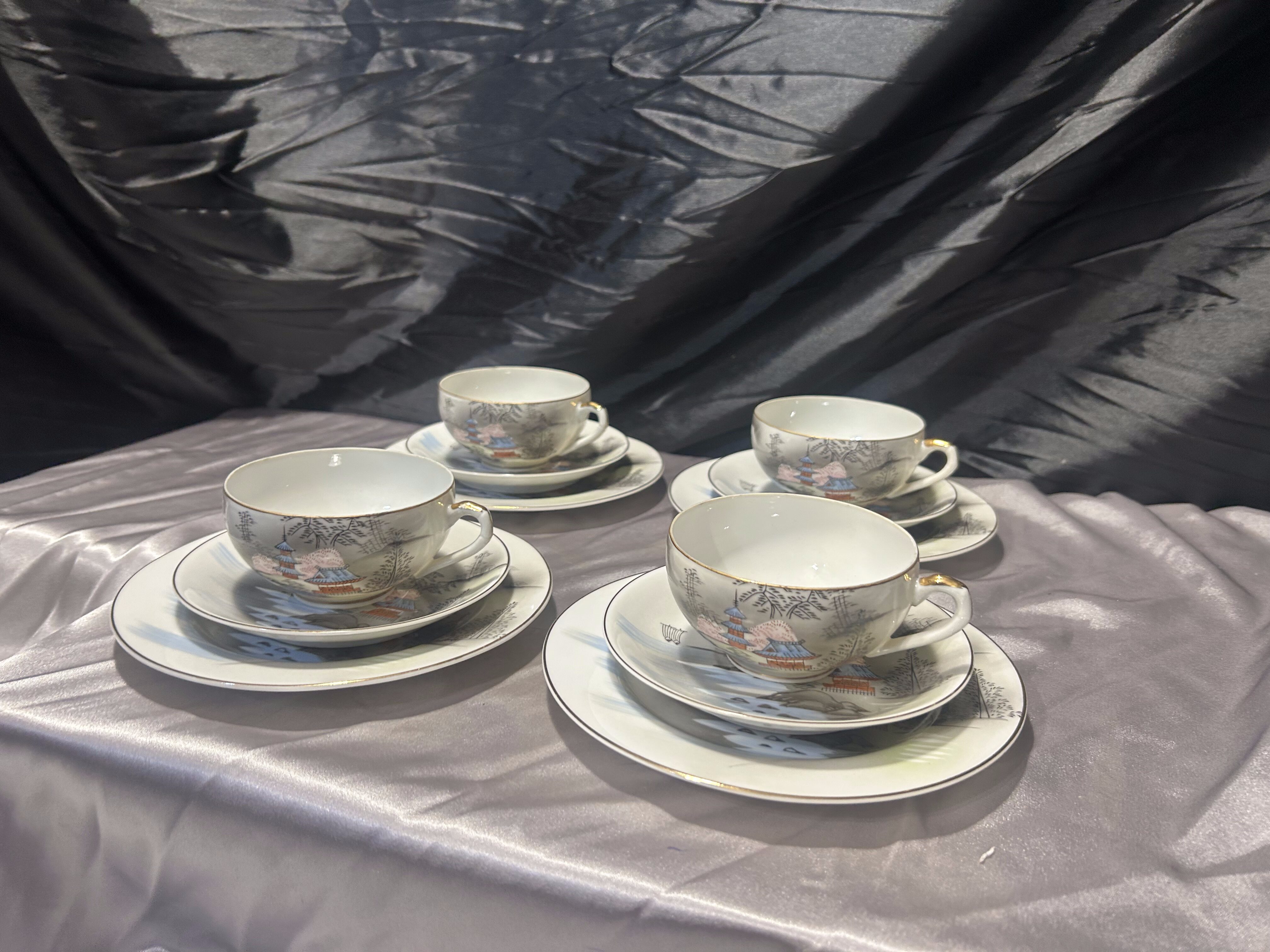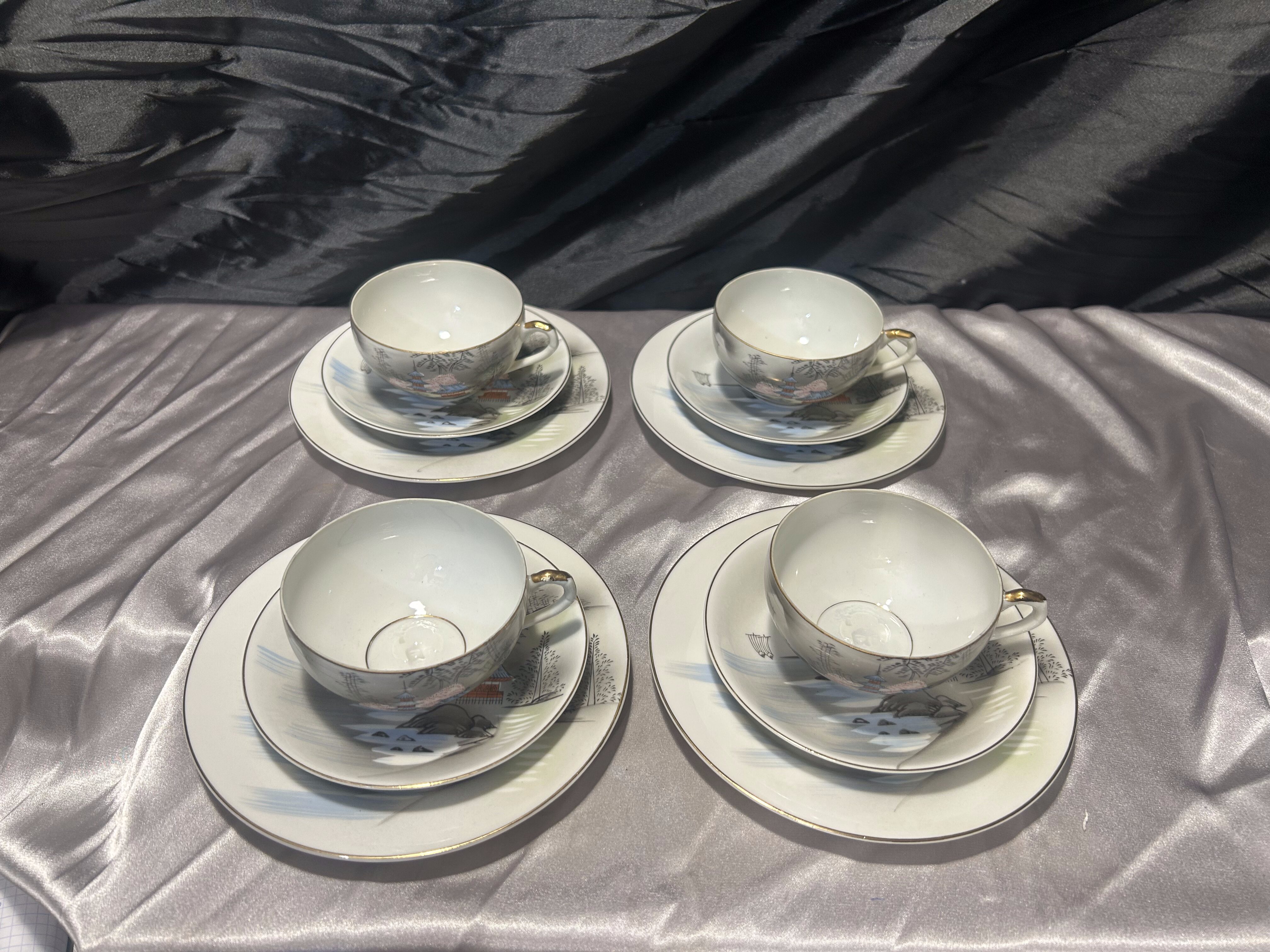 Zestaw 4 filiżanek trio – Kutani – japońska porcelana z wizerunkiem gejszy