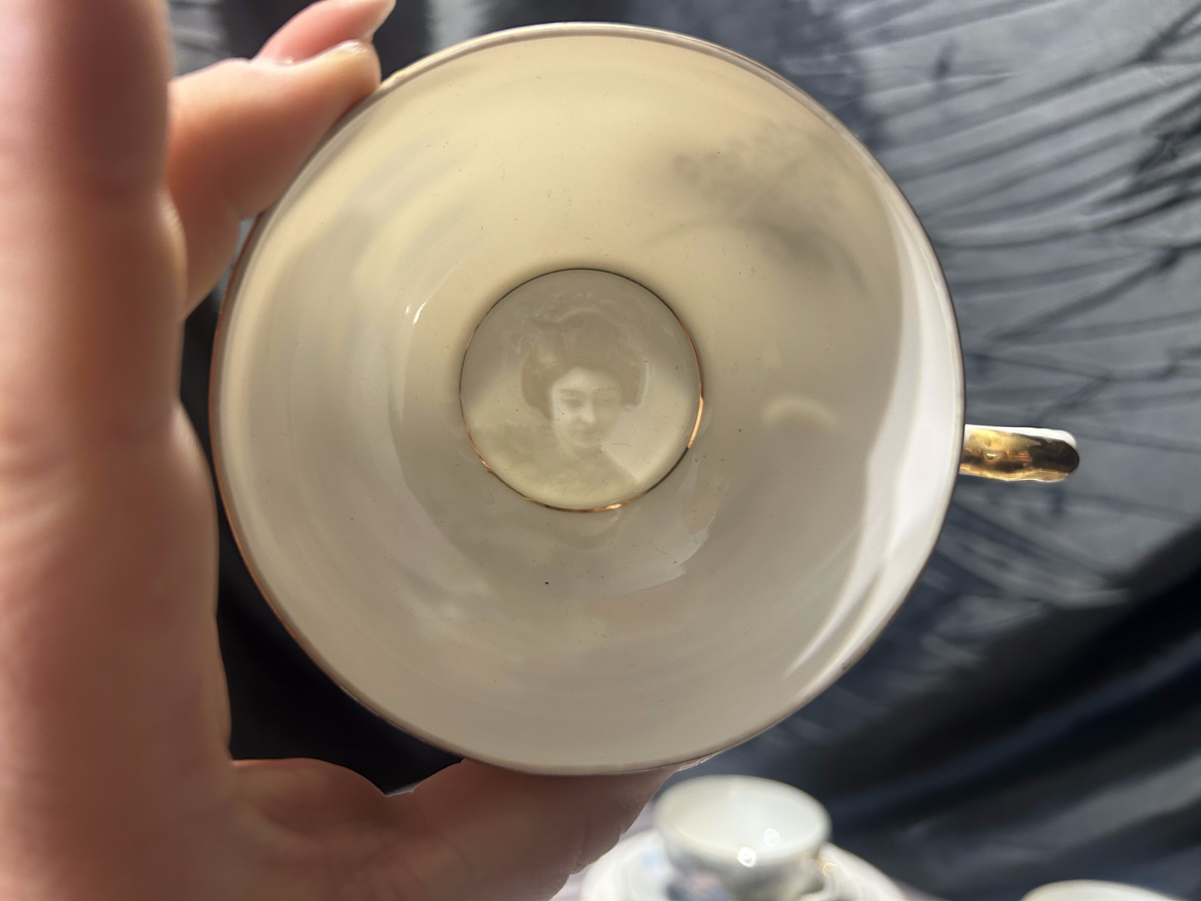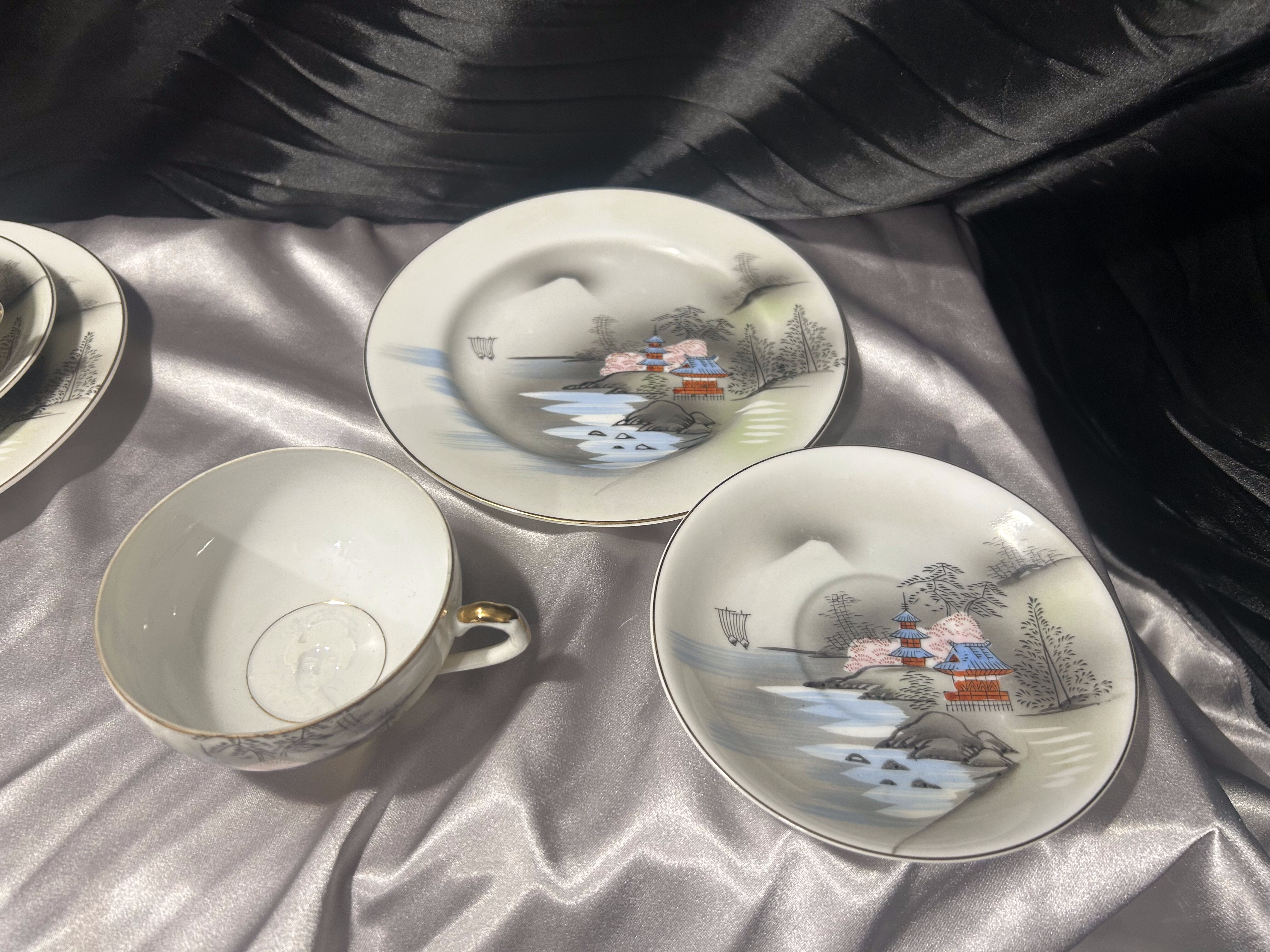 Najbardziej wyjątkową cechą tego zestawu jest wizerunek gejszy widoczny pod światło wewnątrz każdej filiżanki. To popularna w połowie XX wieku technika nazywana „geisha lithophane”, stosowana w wysokiej jakości japońskich filiżankach – polegająca na cienkim modelowaniu porcelany tak, aby przy świetle ukazywała się delikatna twarz kobiety. Zestaw ten jest zatem nie tylko praktyczny, lecz także posiada szczególną wartość kolekcjonerską.