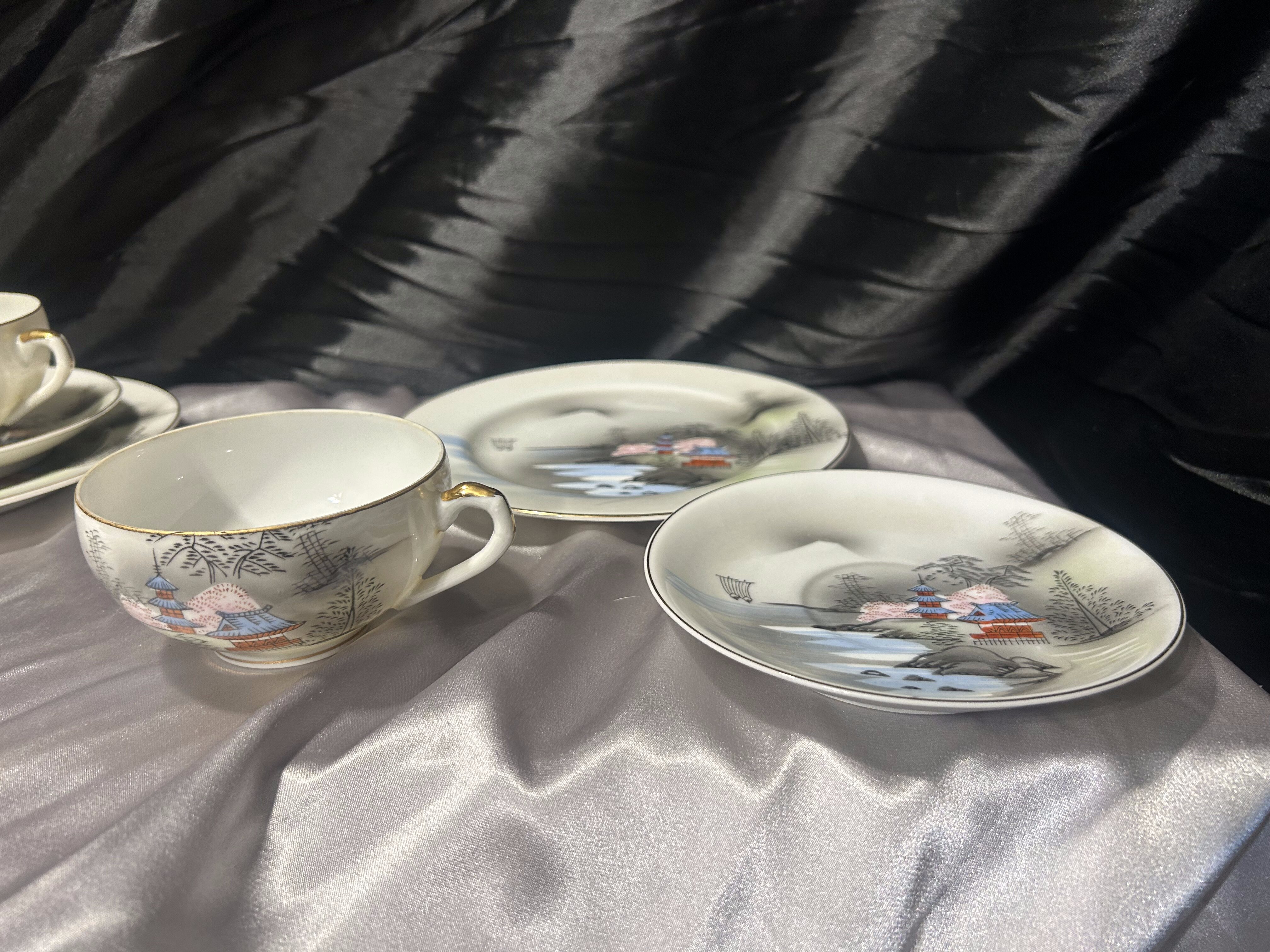Wyjątkowy, kolekcjonerski komplet czterech zestawów trio (filiżanka, spodek i talerzyk) sygnowany Kutani – jedną z najbardziej znanych i cenionych japońskich tradycji ceramicznych. Porcelana Kutani wywodzi się z prefektury Ishikawa i słynie z bogatych, ręcznie nakładanych zdobień, często przedstawiających krajobrazy, pawilony, florę oraz sceny inspirowane japońską kulturą. Produkcja w stylu współczesnym pojawiła się na przełomie XIX i XX wieku, a jej charakterystyczne czerwone i złote sygnatury, takie jak ta widoczna na spodzie talerzyka, były stosowane głównie w porcelanie dekoracyjnej i eksportowej.