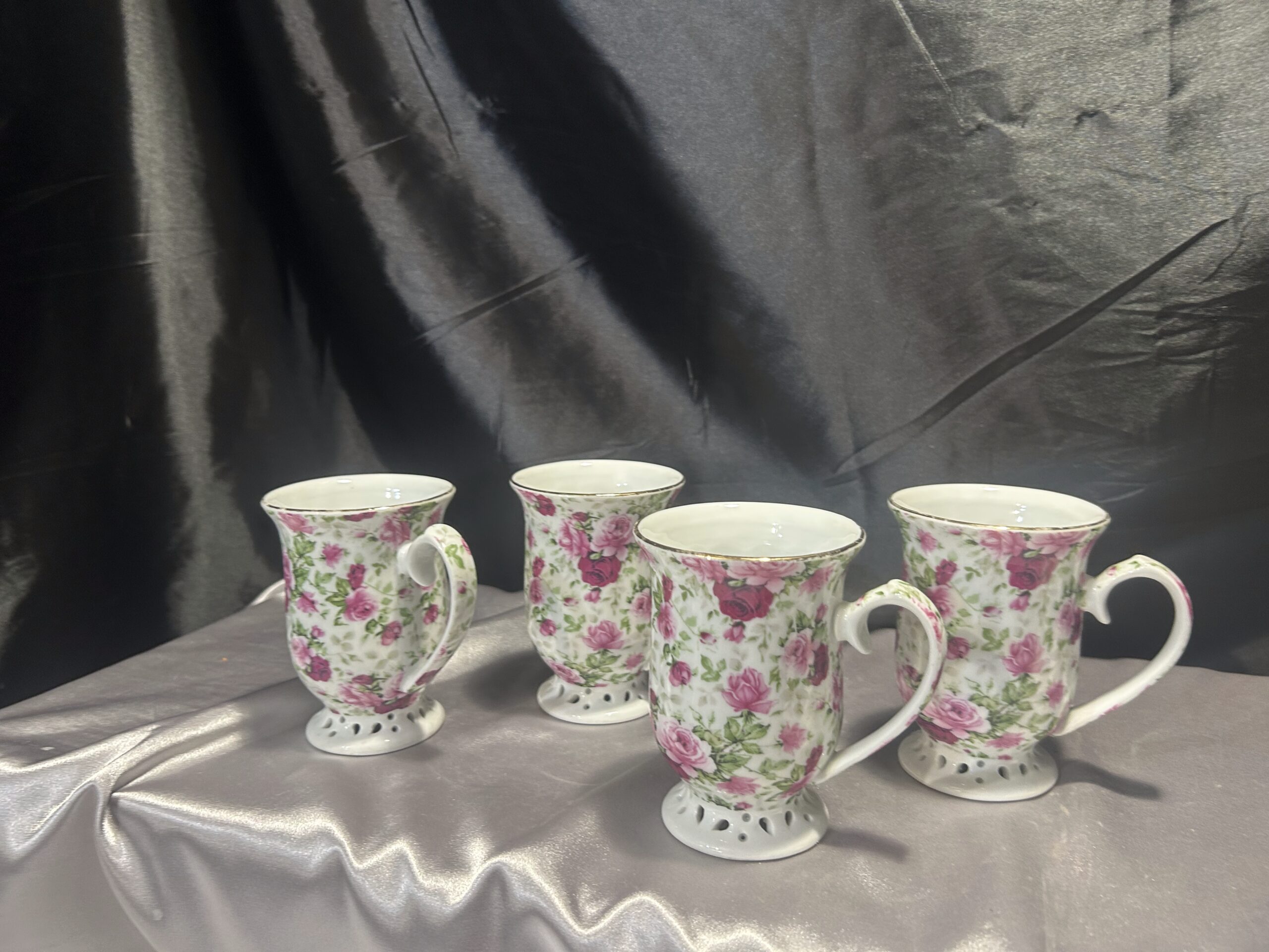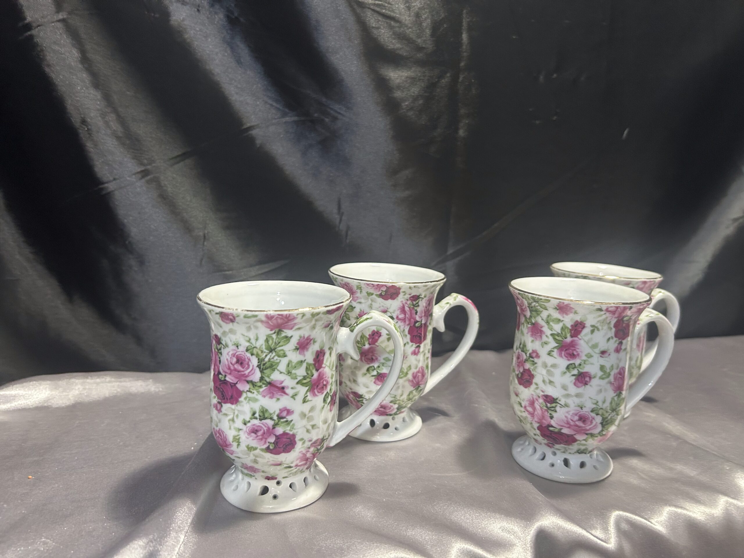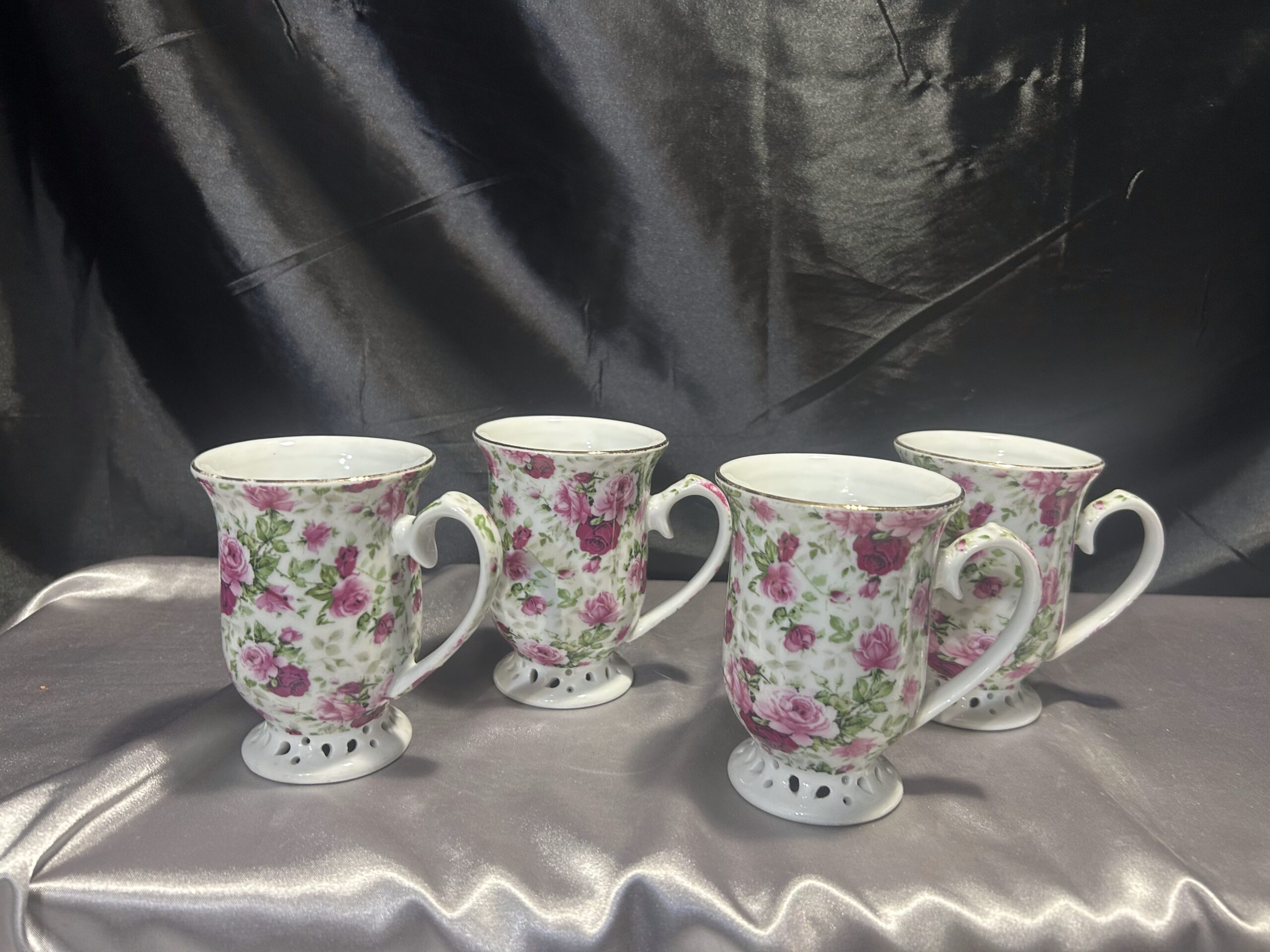 Przedstawiamy niezwykle elegancki zestaw 4 kubków, który zachwyci miłośników finezji i subtelnych detali. Kubki wykonane z cienkiego materiału, przypominającego porcelanę lub ceramikę, prezentują się wyjątkowo stylowo. Ich delikatna konstrukcja została podkreślona przez ażurowe nogi, nadające lekkości i finezji każdemu egzemplarzowi.