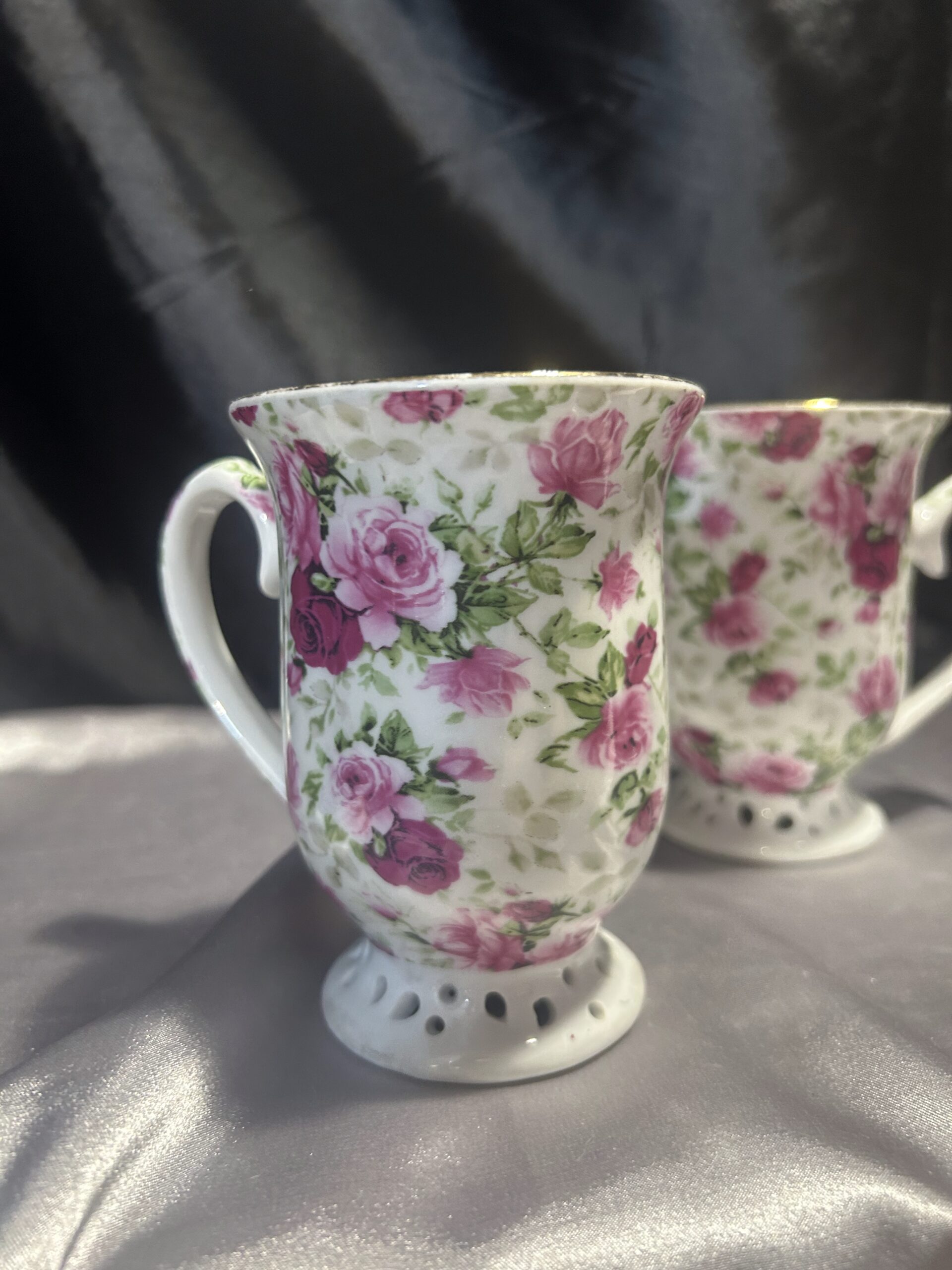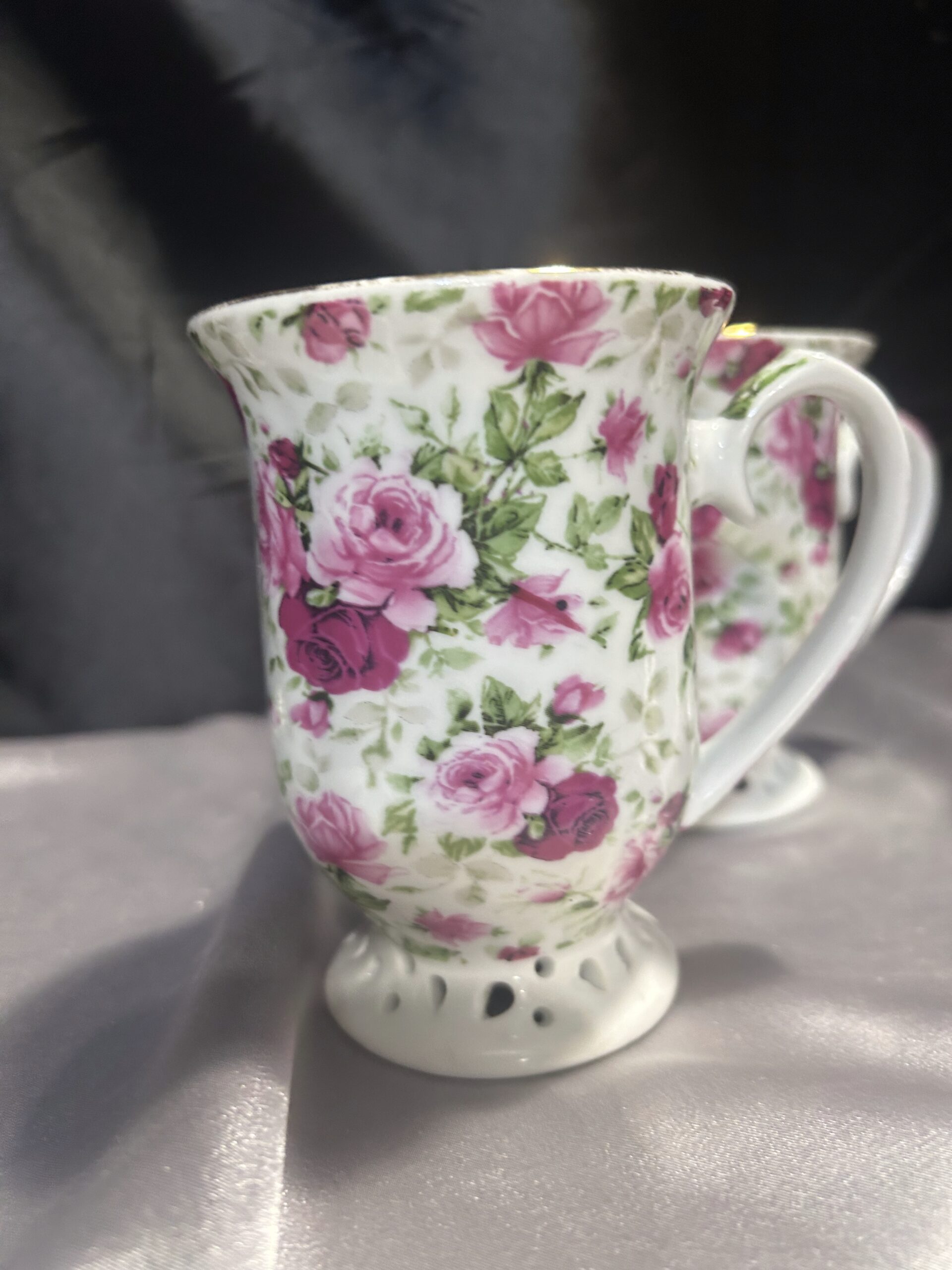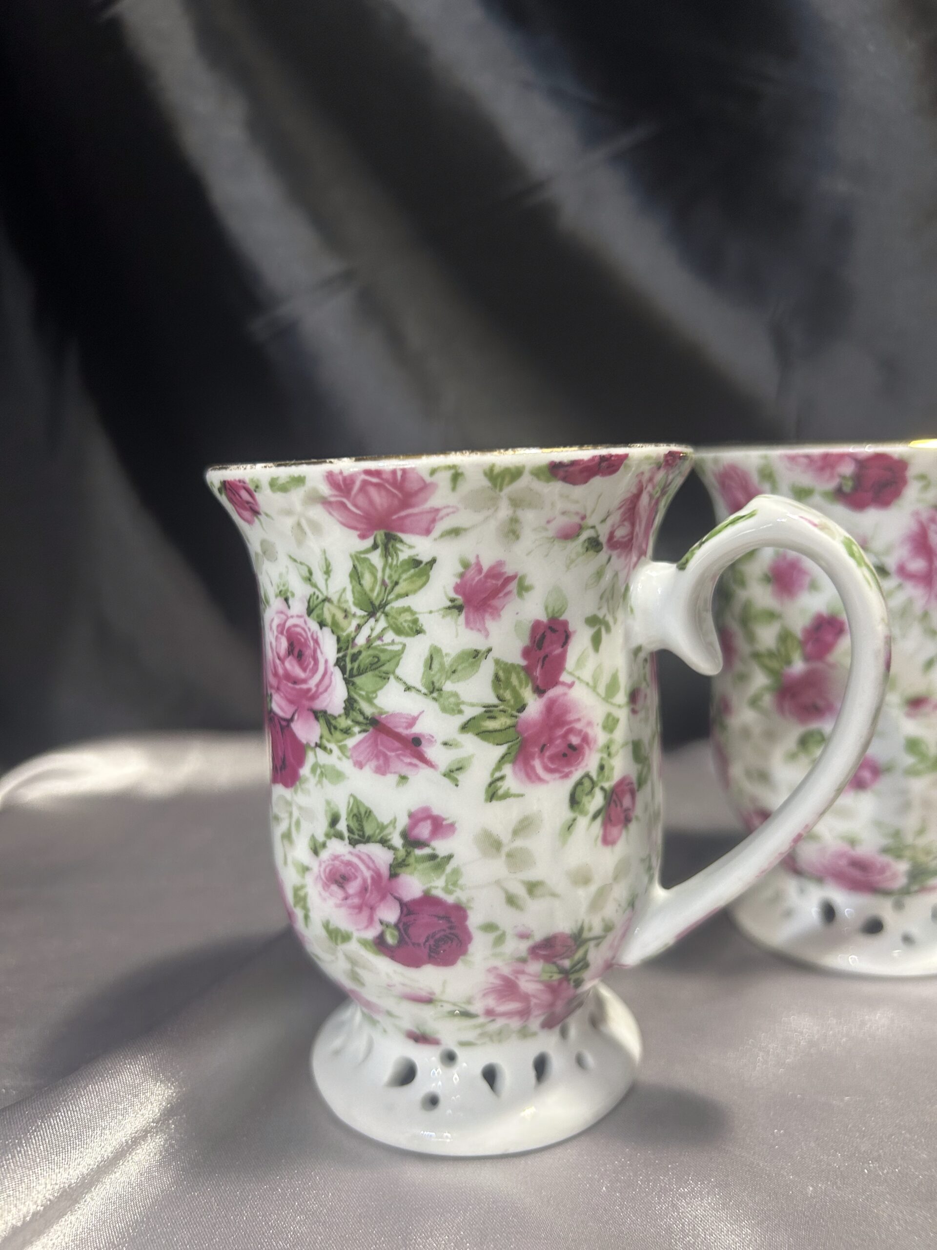 Ten zestaw kubków to doskonały wybór dla osób ceniących sobie elegancję i wysoką jakość wykonania. Delikatne, ażurowe detale oraz wyrafinowane zdobienia w postaci różowych kwiatów i złotych obramówek nadają im wyjątkowego charakteru. Kubki sprawdzą się idealnie zarówno podczas codziennych chwil relaksu, jak i przy specjalnych okazjach, stanowiąc doskonały akcent dekoracyjny w każdym wnętrzu.