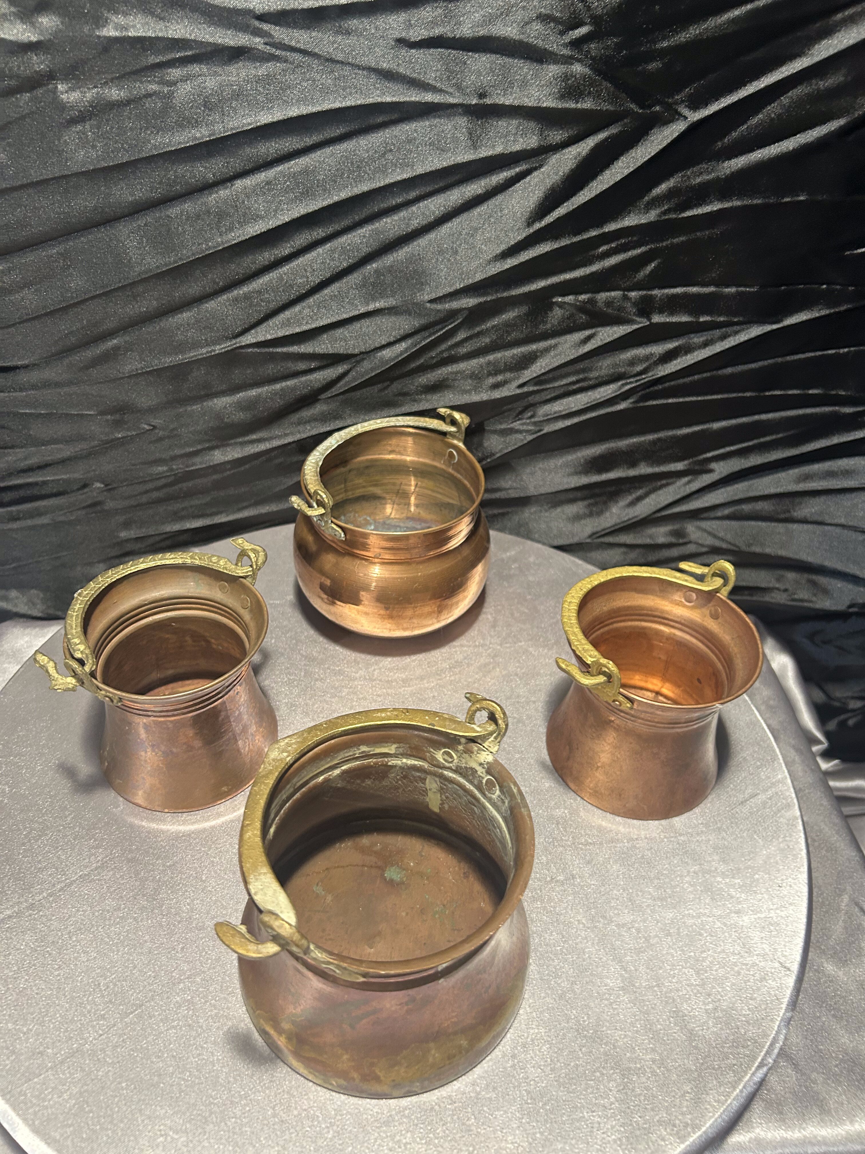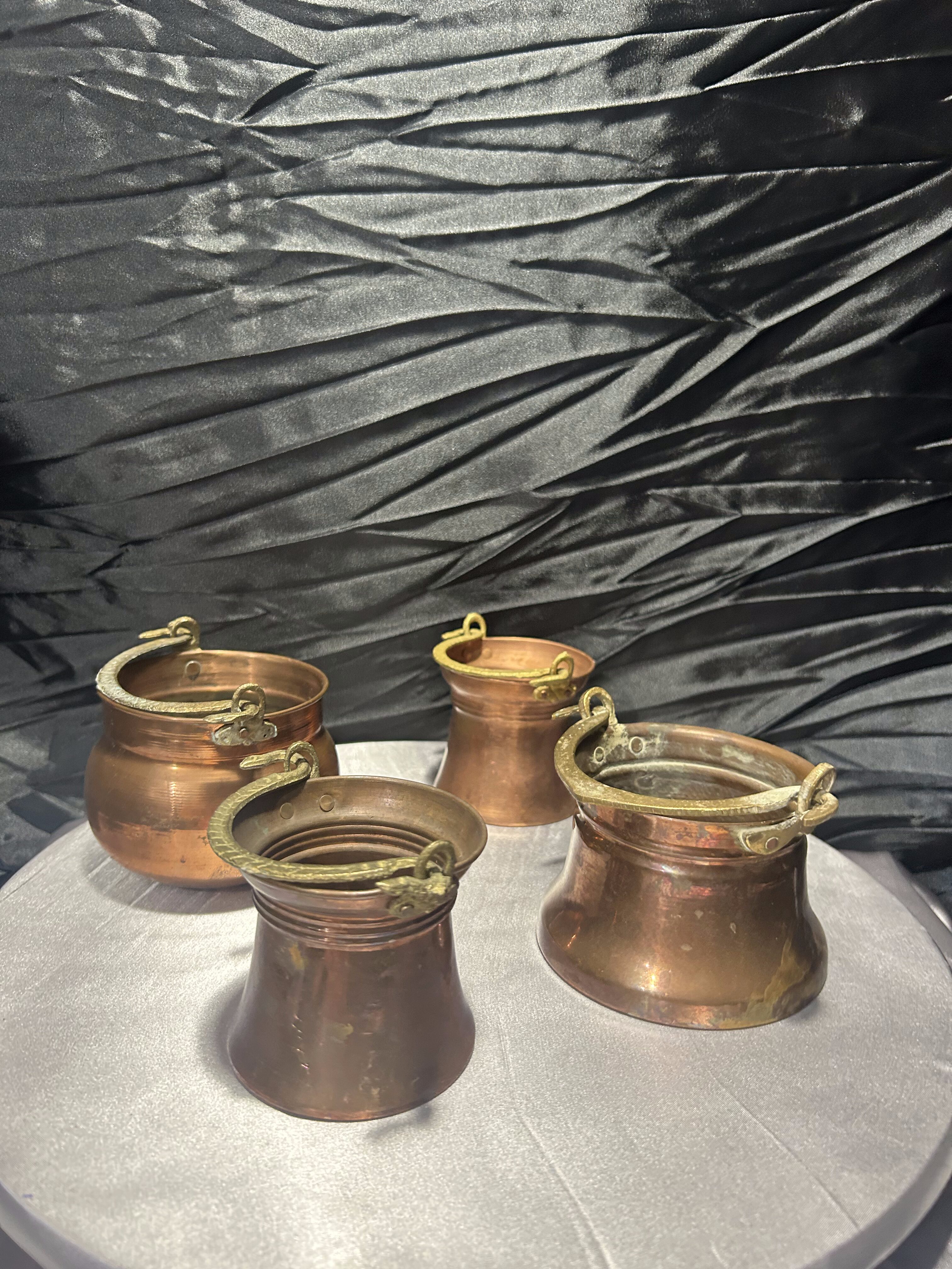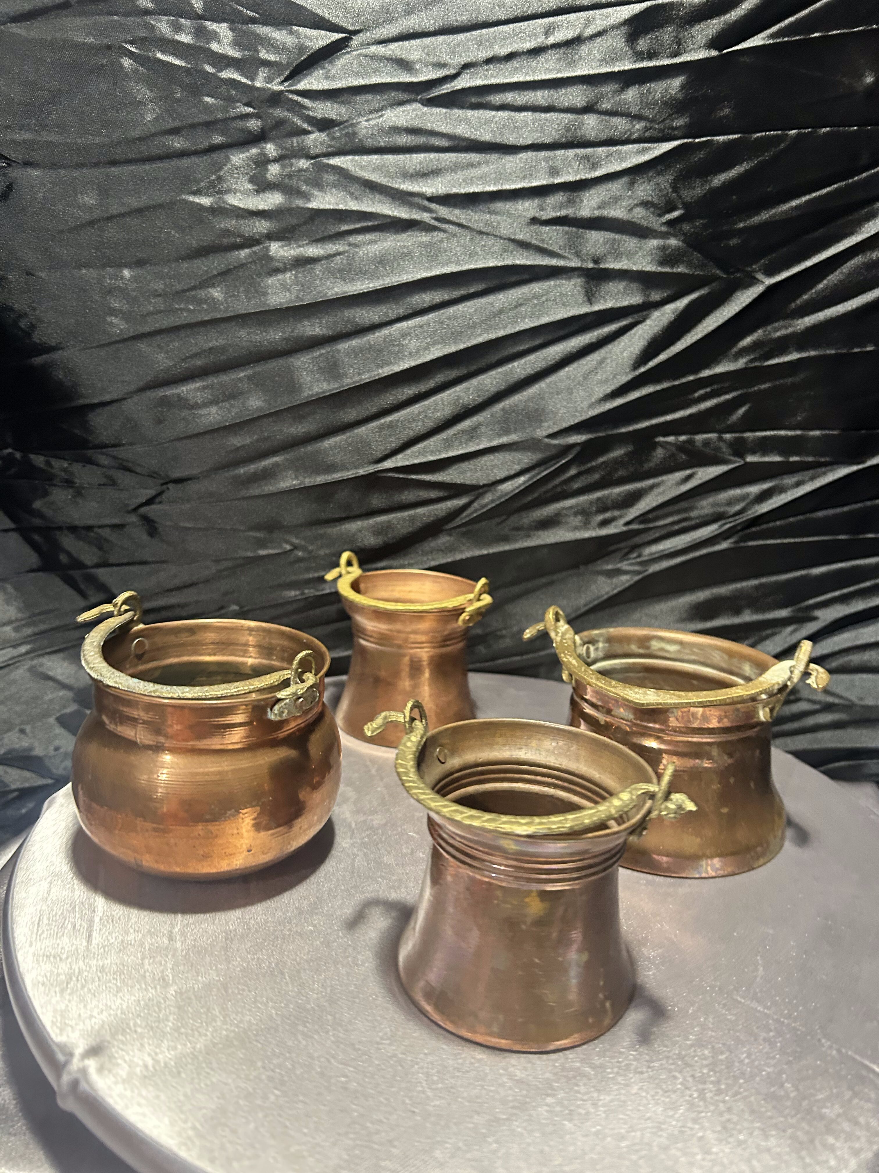 Zestaw czterech urokliwych miedzianych kwietników w formie miniaturowych wiaderek, wyposażonych w dekoracyjne uchwyty z mosiądzu. Każdy z egzemplarzy różni się nieco kształtem i rozmiarem, co tylko podkreśla ich rękodzielniczy charakter. Doskonale sprawdzą się jako osłonki na drobne rośliny, zioła lub elementy dekoracyjne w kuchni, na parapecie czy w ogrodzie zimowym.