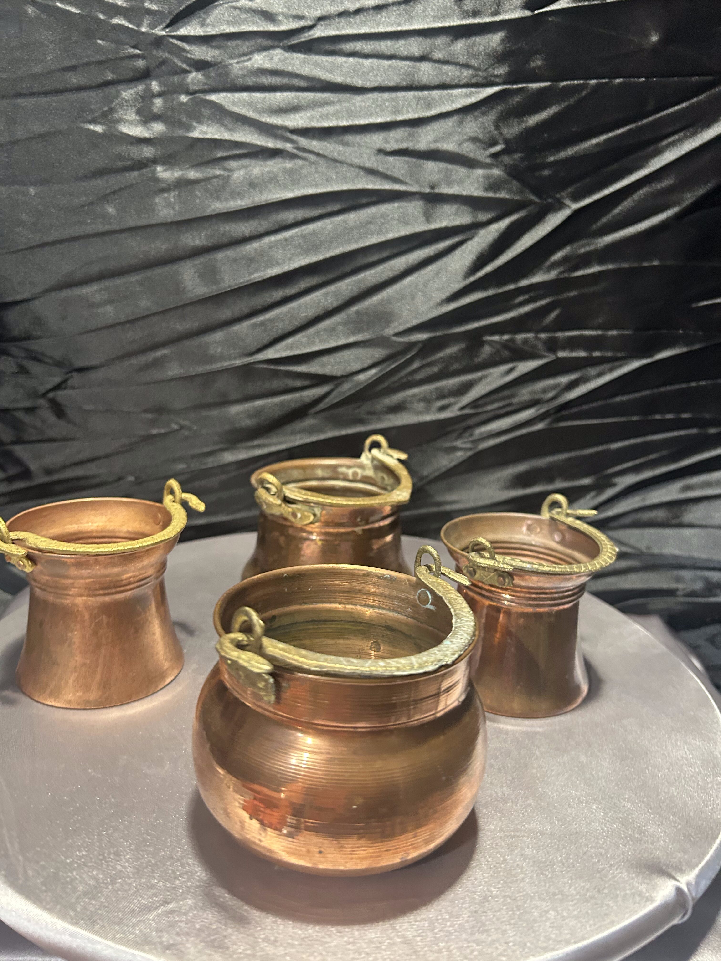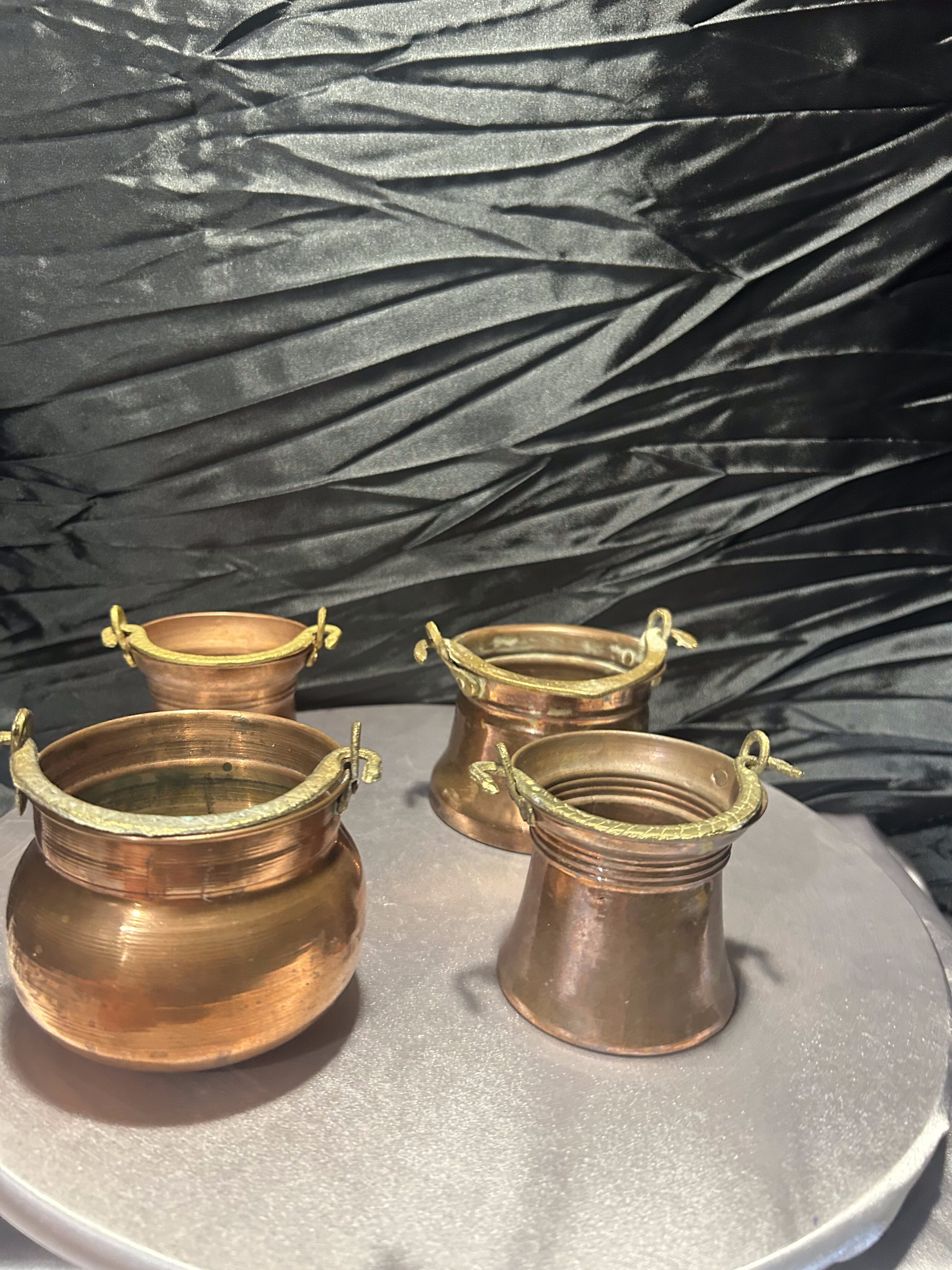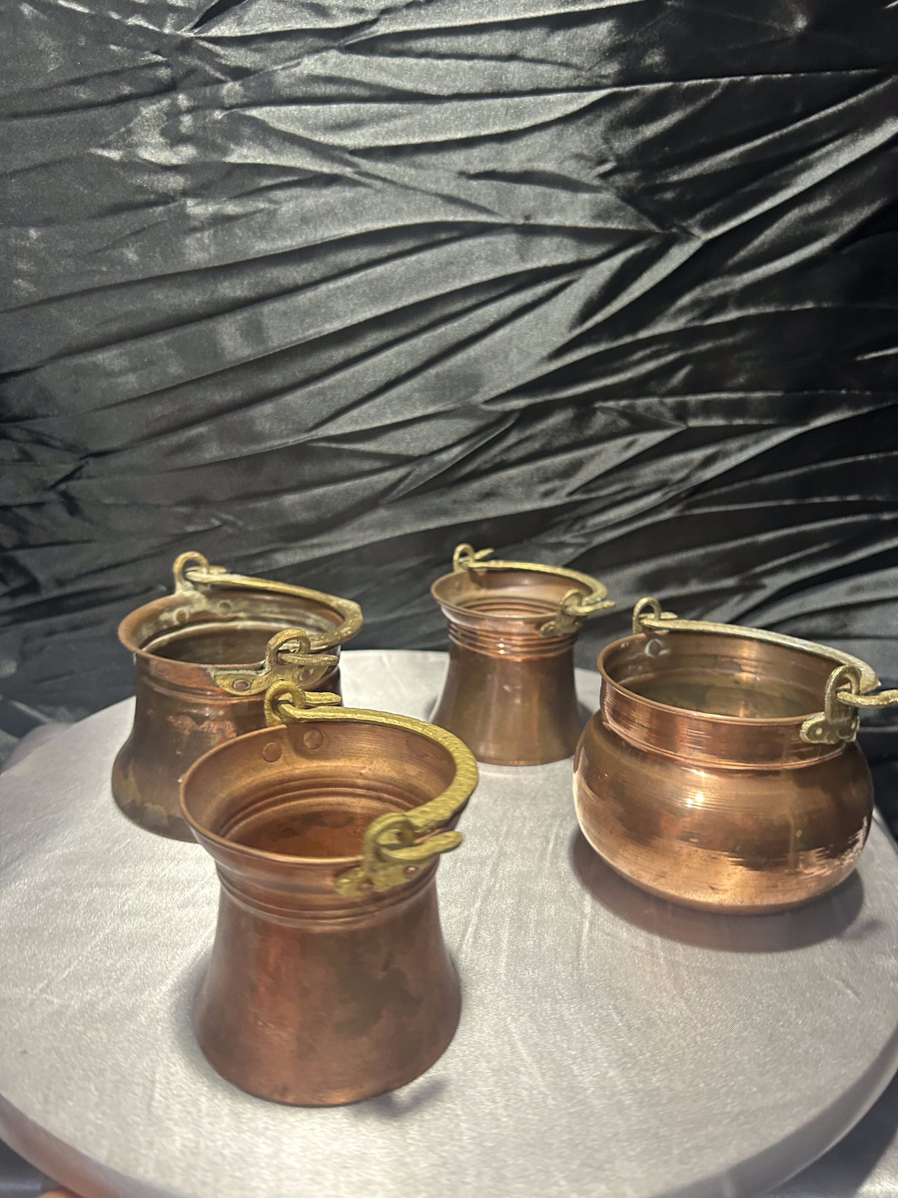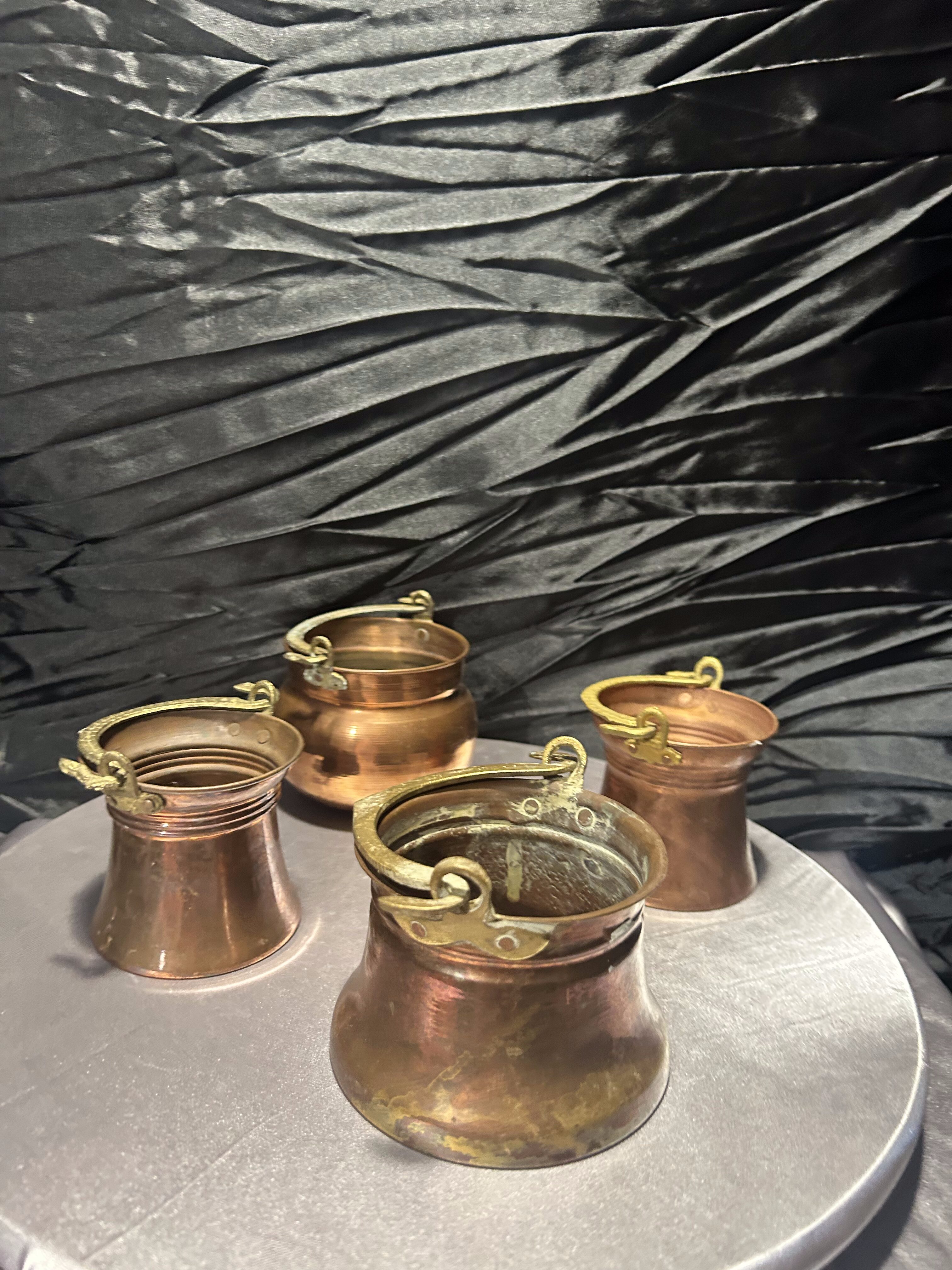 Zestaw czterech urokliwych miedzianych kwietników w formie miniaturowych wiaderek, wyposażonych w dekoracyjne uchwyty z mosiądzu. Każdy z egzemplarzy różni się nieco kształtem i rozmiarem, co tylko podkreśla ich rękodzielniczy charakter. Doskonale sprawdzą się jako osłonki na drobne rośliny, zioła lub elementy dekoracyjne w kuchni, na parapecie czy w ogrodzie zimowym.