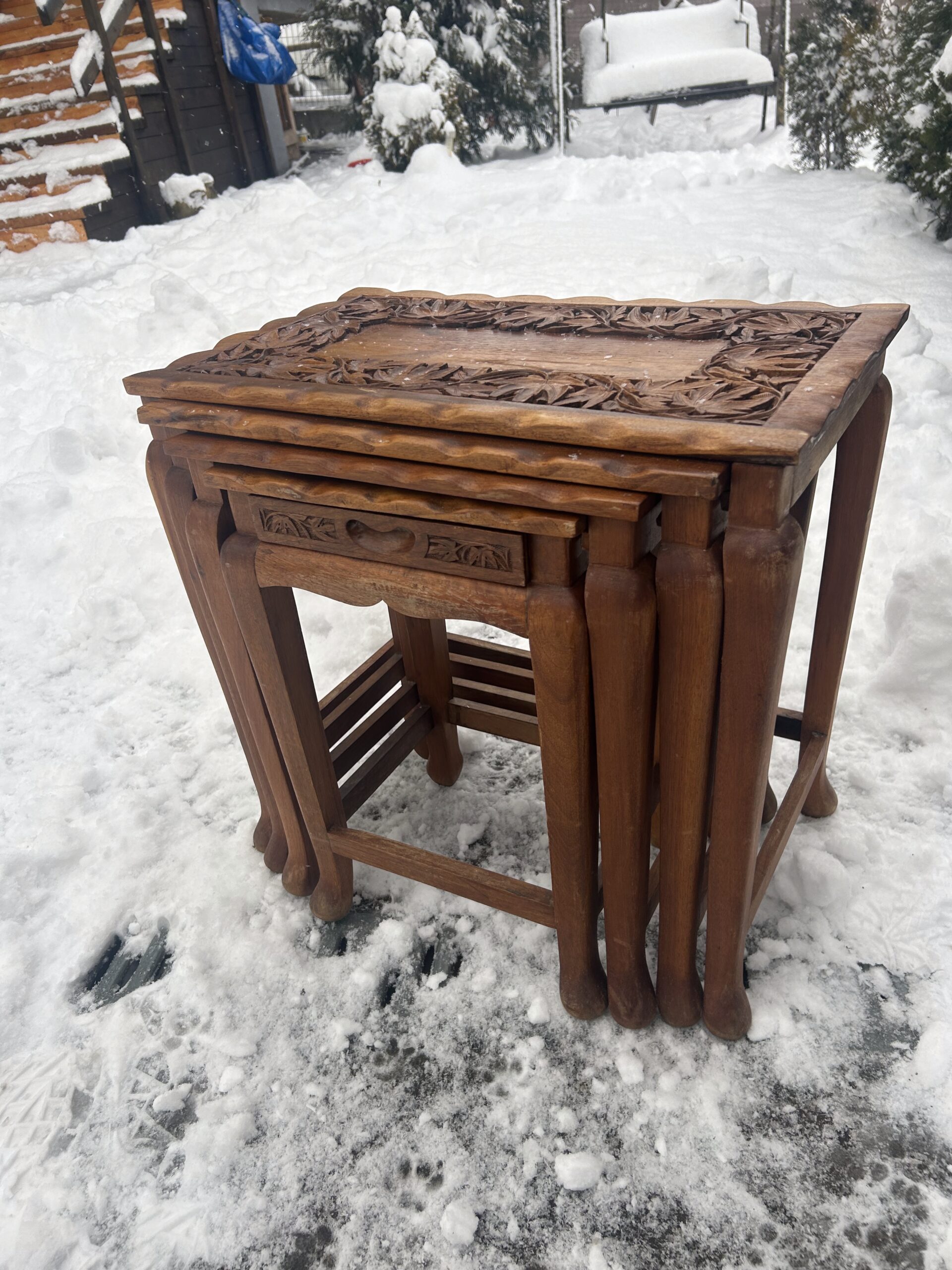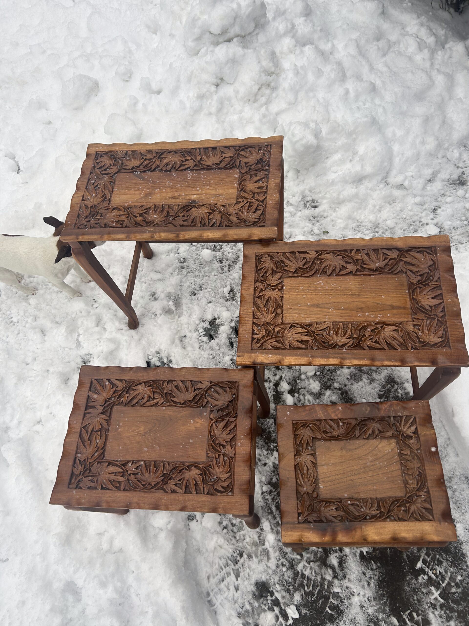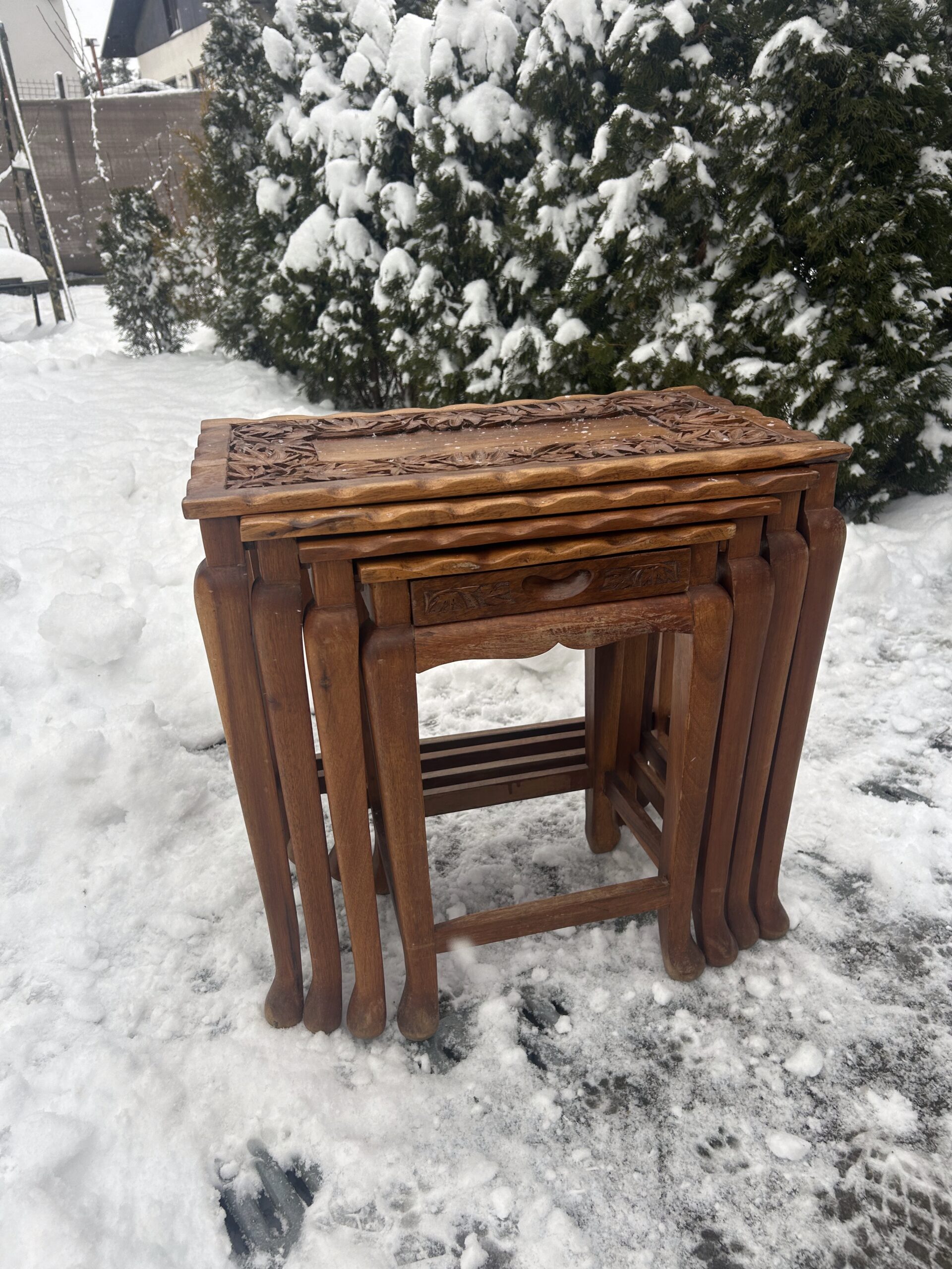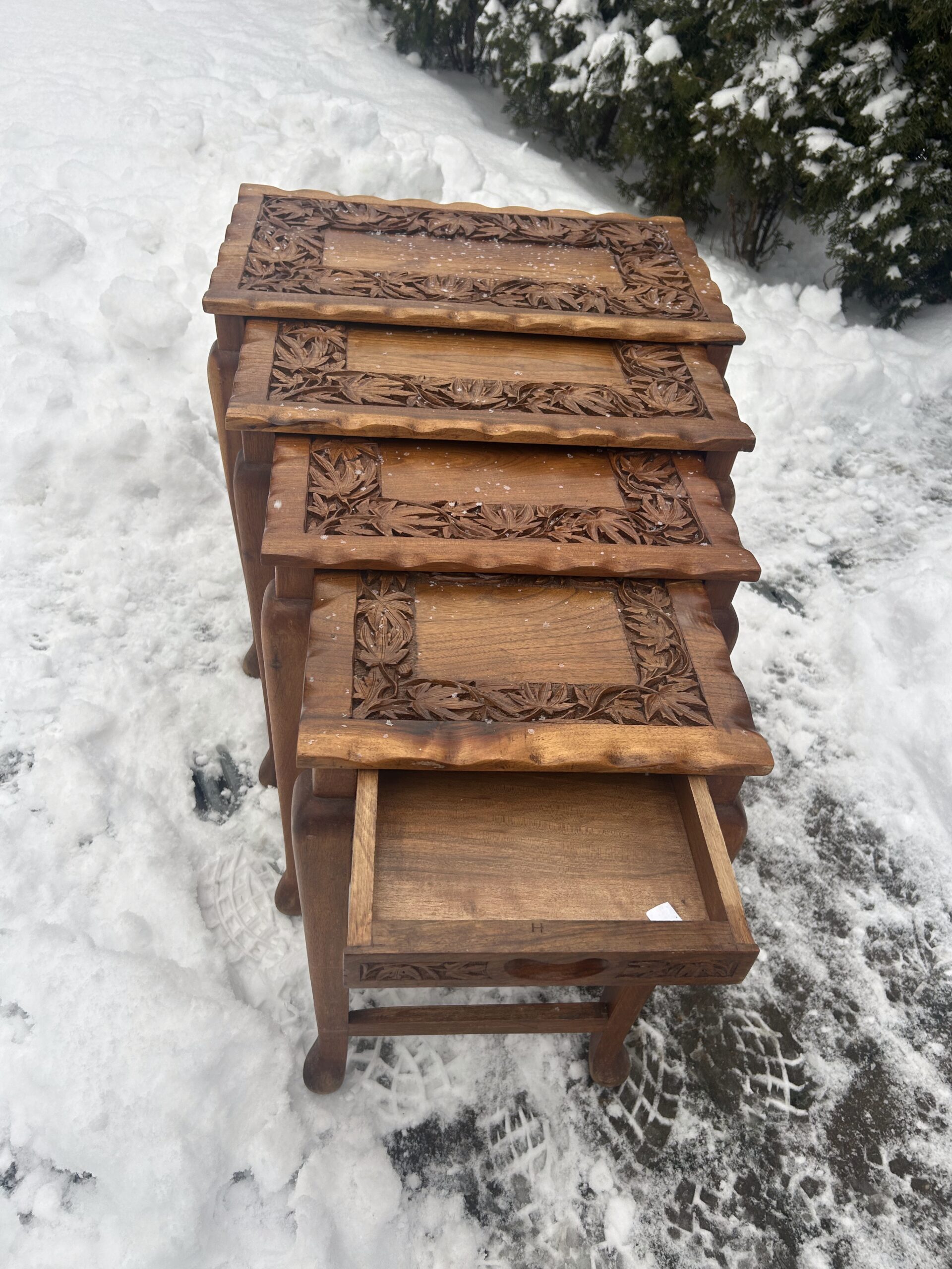Wyjątkowy zestaw czterech drewnianych stoliczków, które można wsunąć jeden w drugi, tworząc praktyczny komplet oszczędzający miejsce. Każdy stoliczek posiada pięknie rzeźbiony blat z motywem liści, a najmniejszy dodatkowo wyposażony jest w funkcjonalną szufladkę. Ten zestaw to połączenie funkcjonalności i estetyki, które świetnie sprawdzi się w każdym wnętrzu.