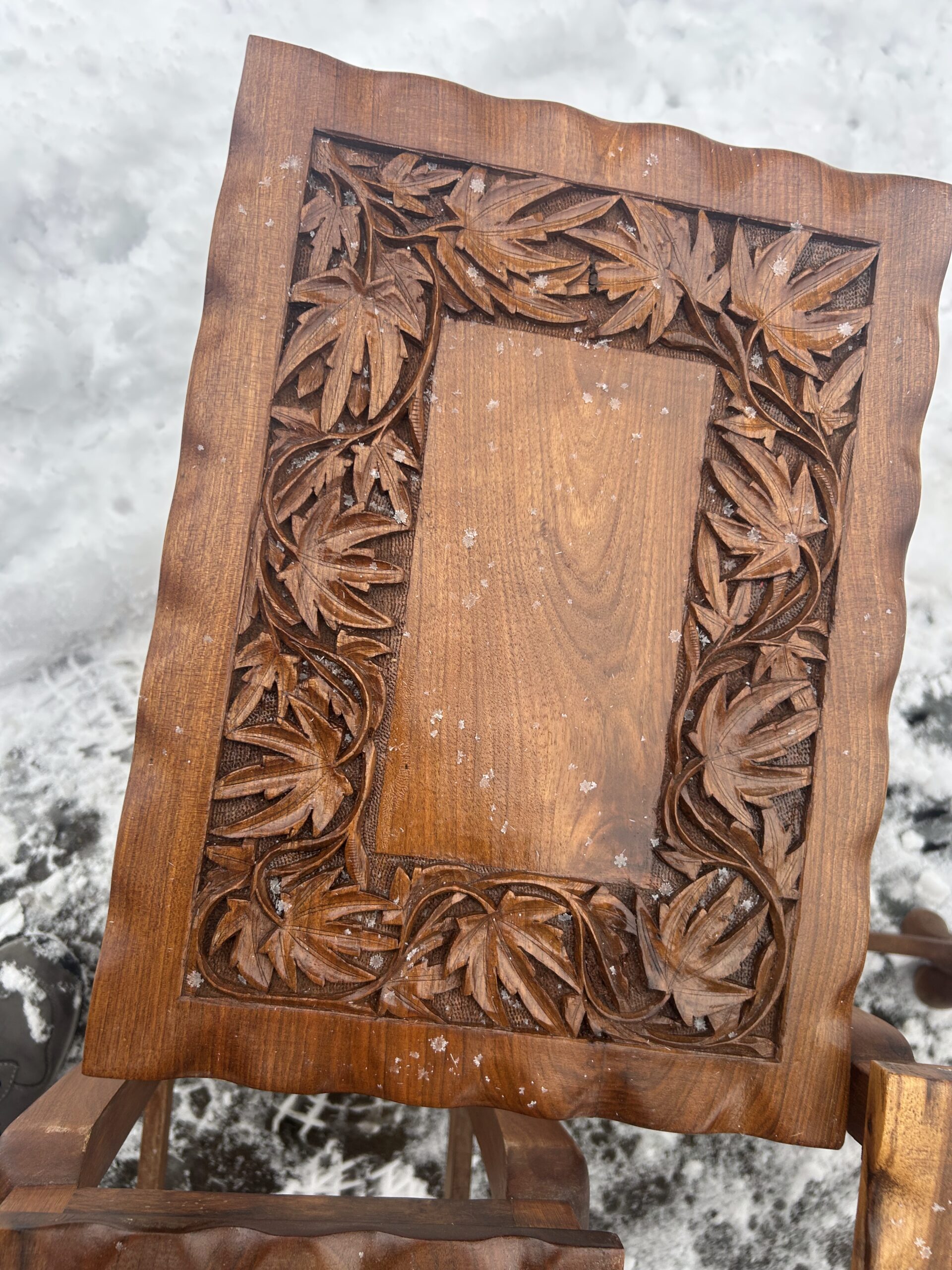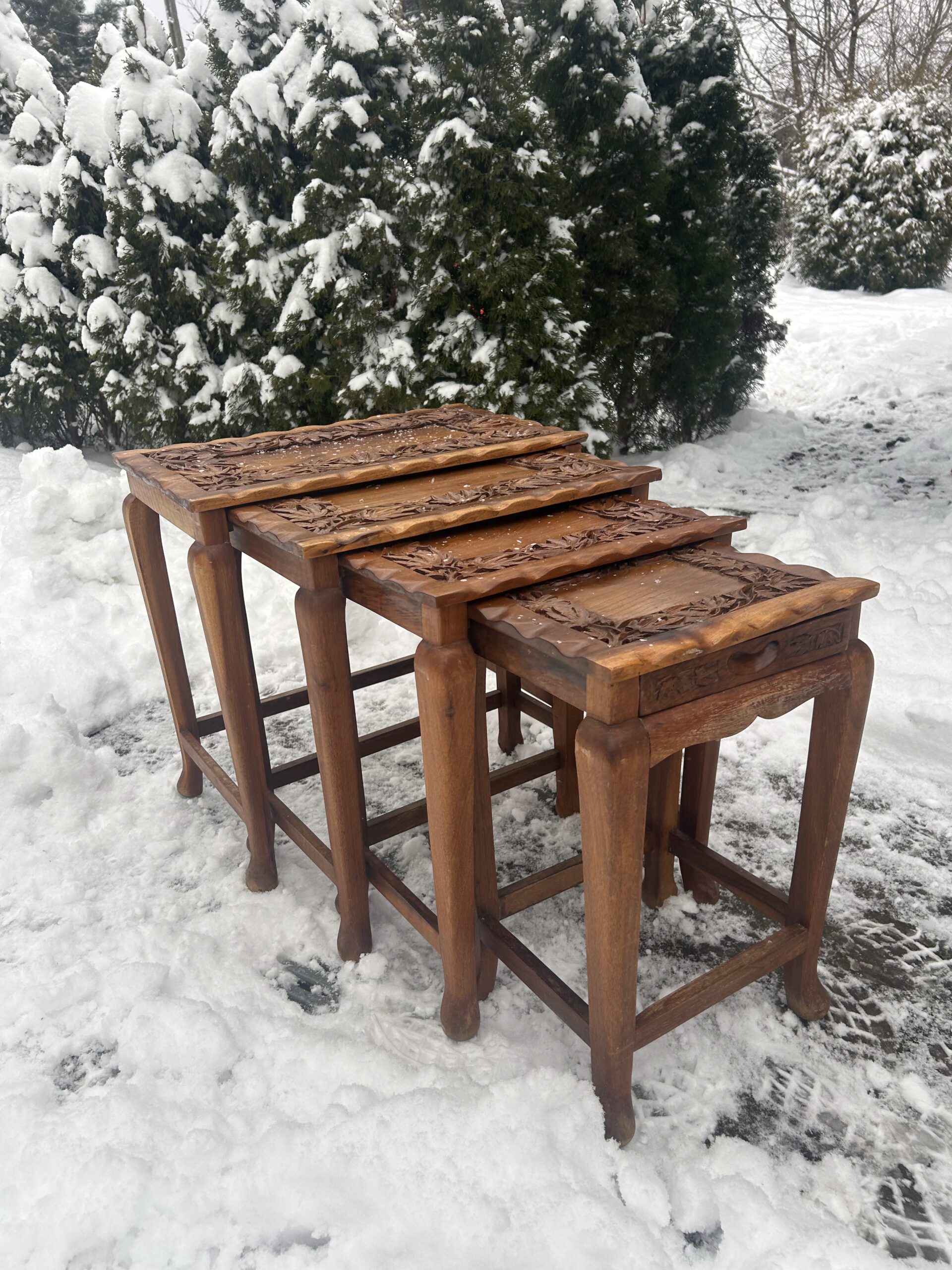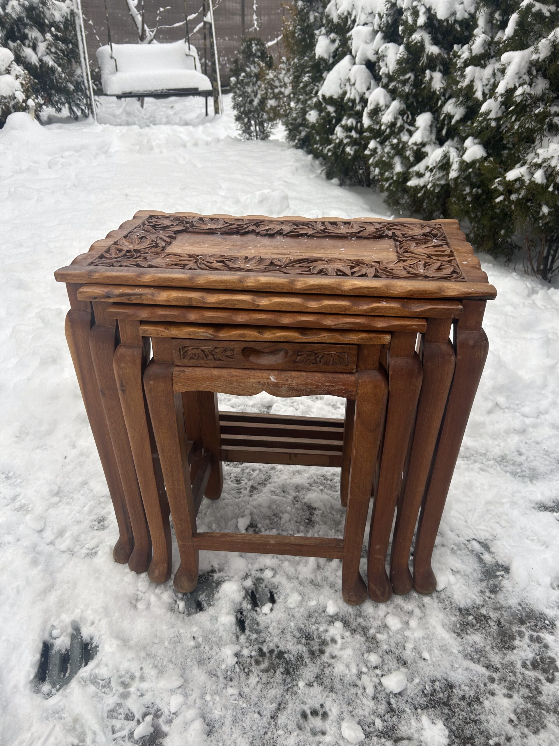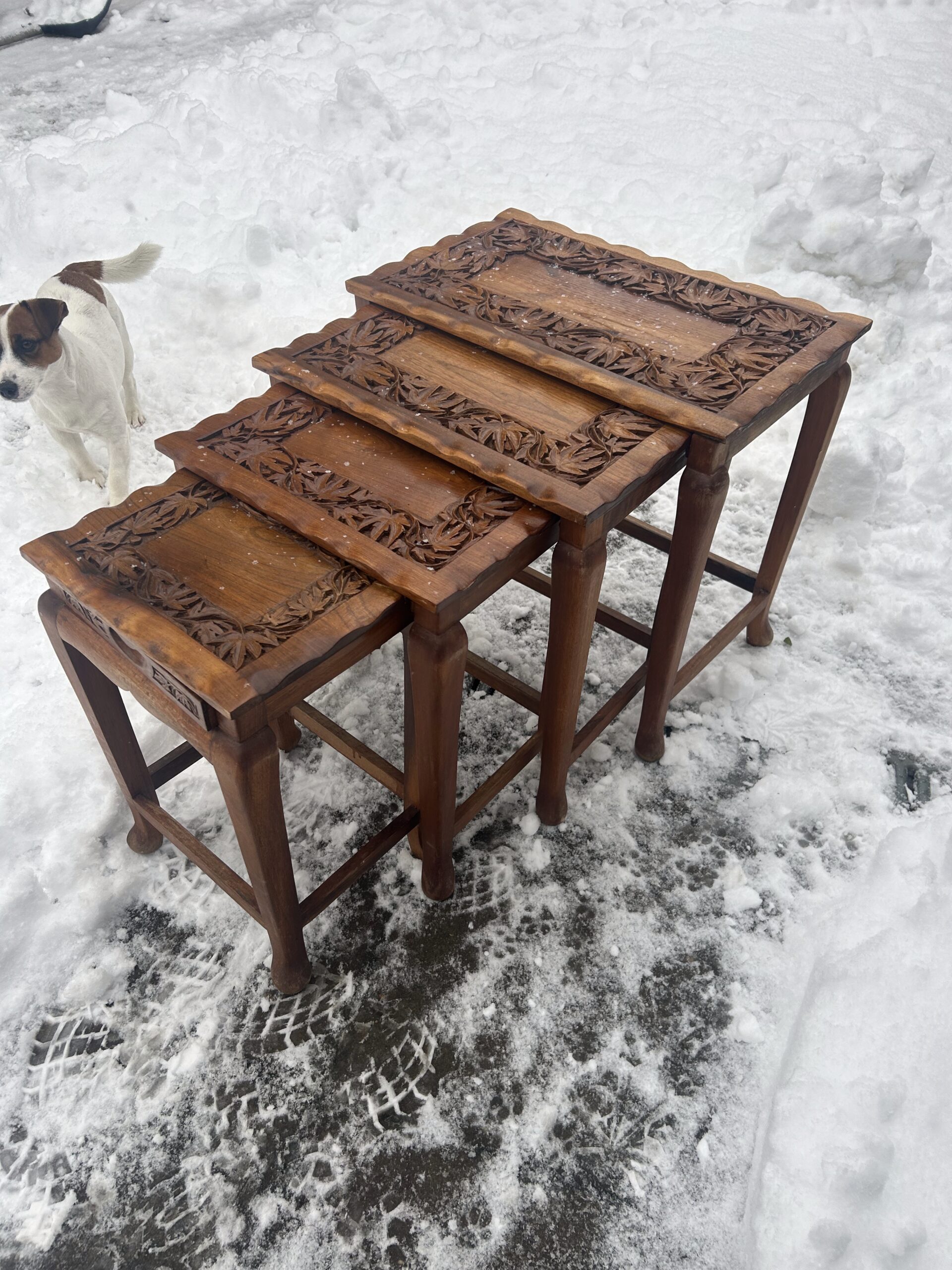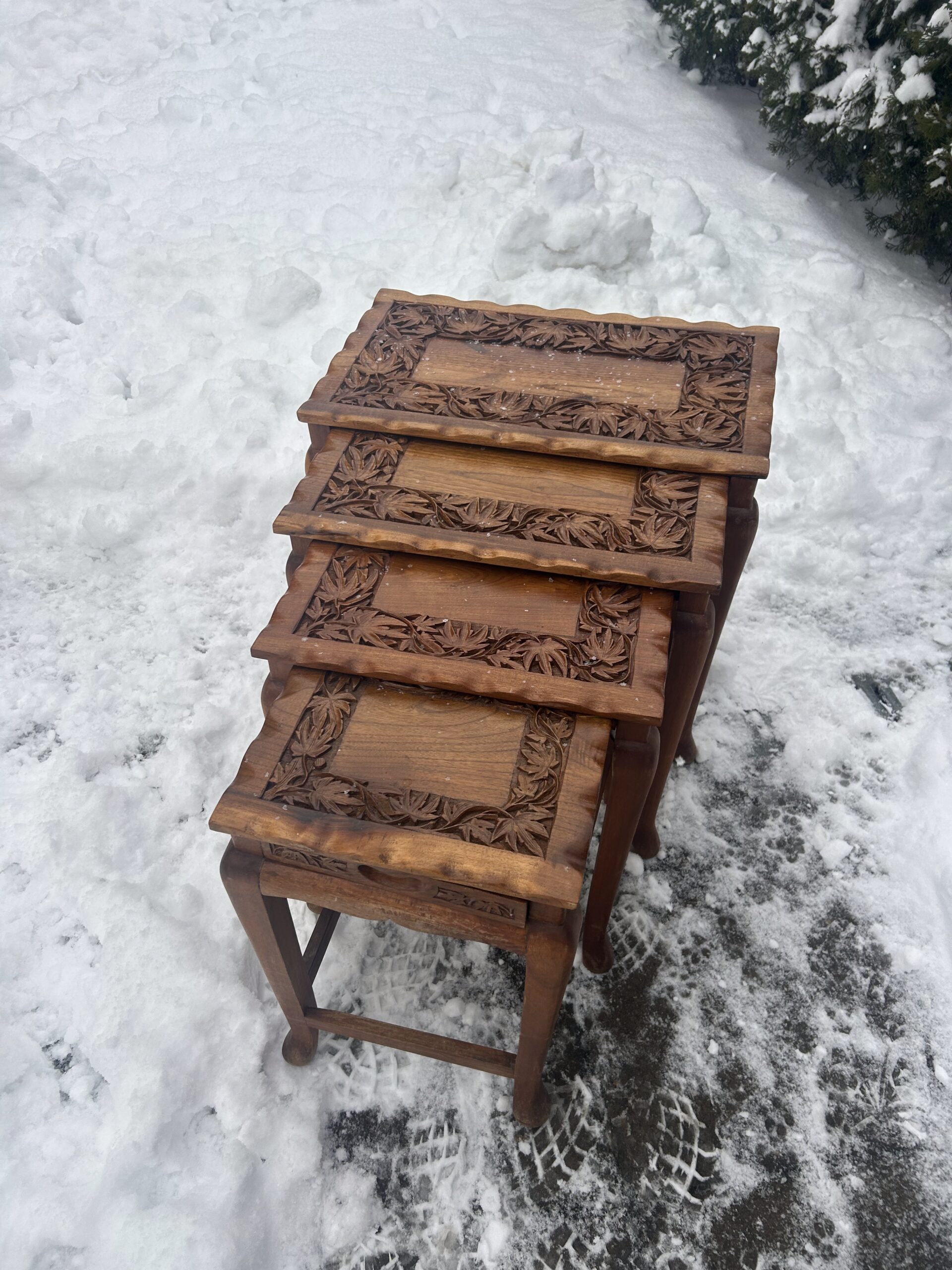 Wyjątkowy zestaw czterech drewnianych stoliczków, które można wsunąć jeden w drugi, tworząc praktyczny komplet oszczędzający miejsce. Każdy stoliczek posiada pięknie rzeźbiony blat z motywem liści, a najmniejszy dodatkowo wyposażony jest w funkcjonalną szufladkę. Ten zestaw to połączenie funkcjonalności i estetyki, które świetnie sprawdzi się w każdym wnętrzu.