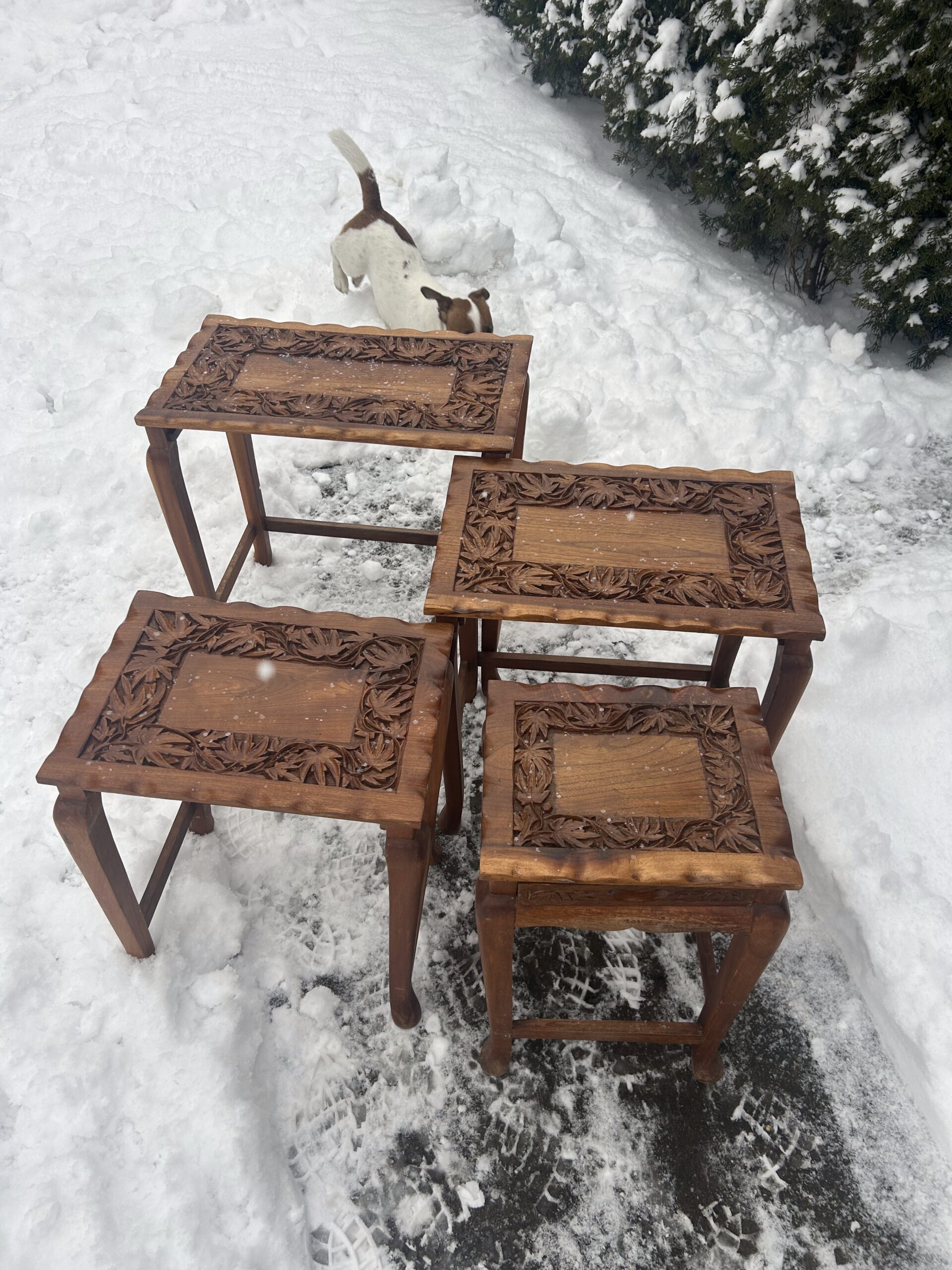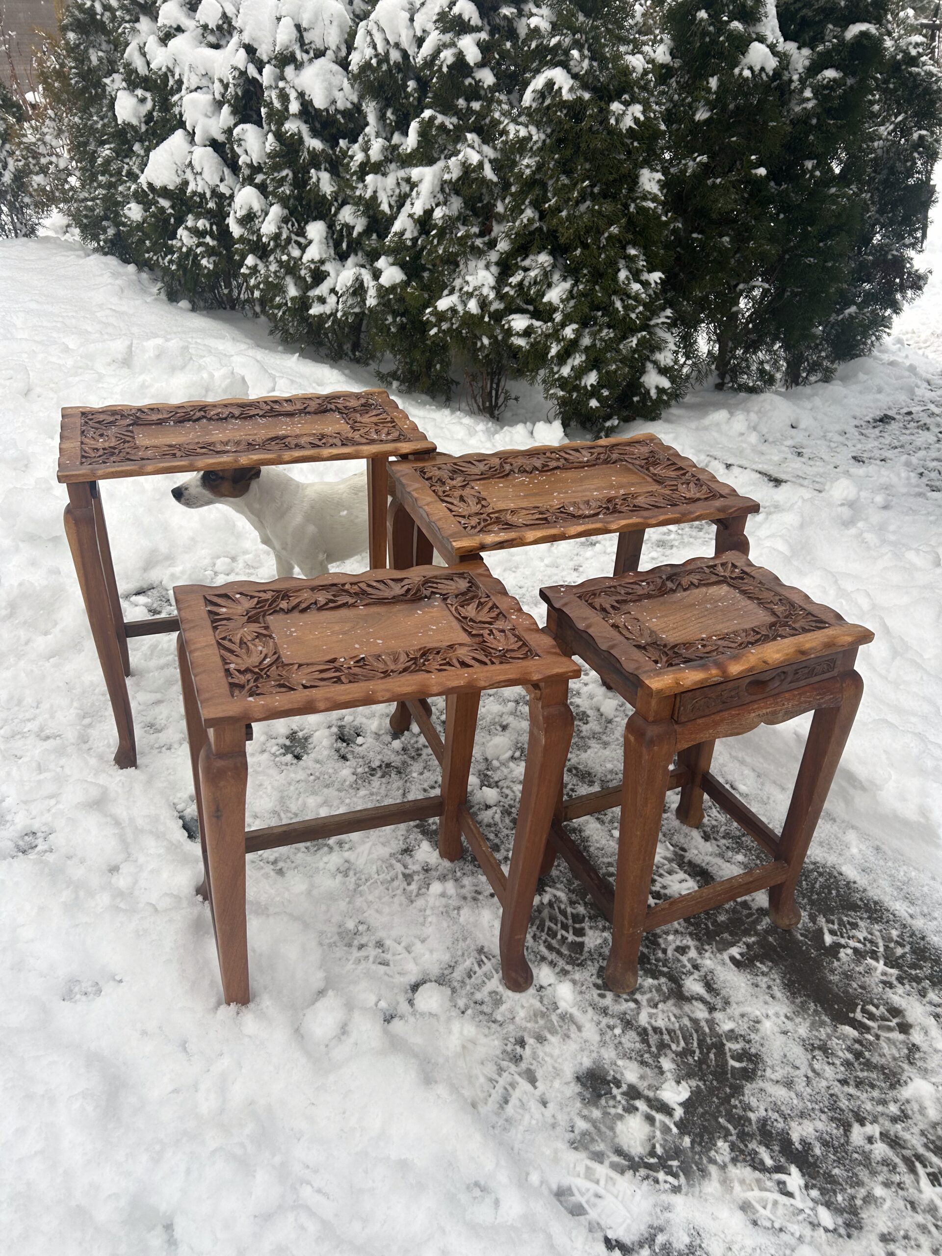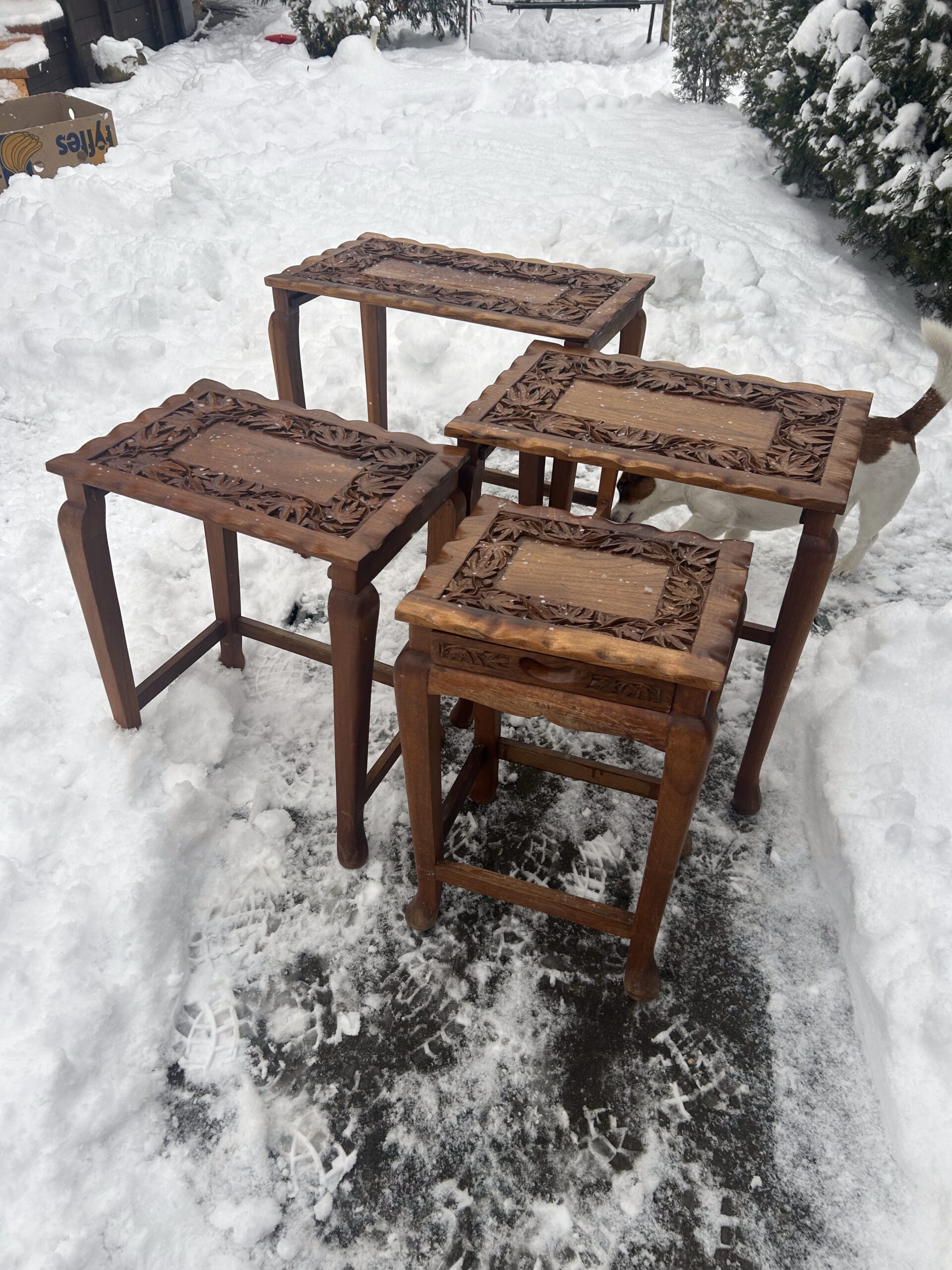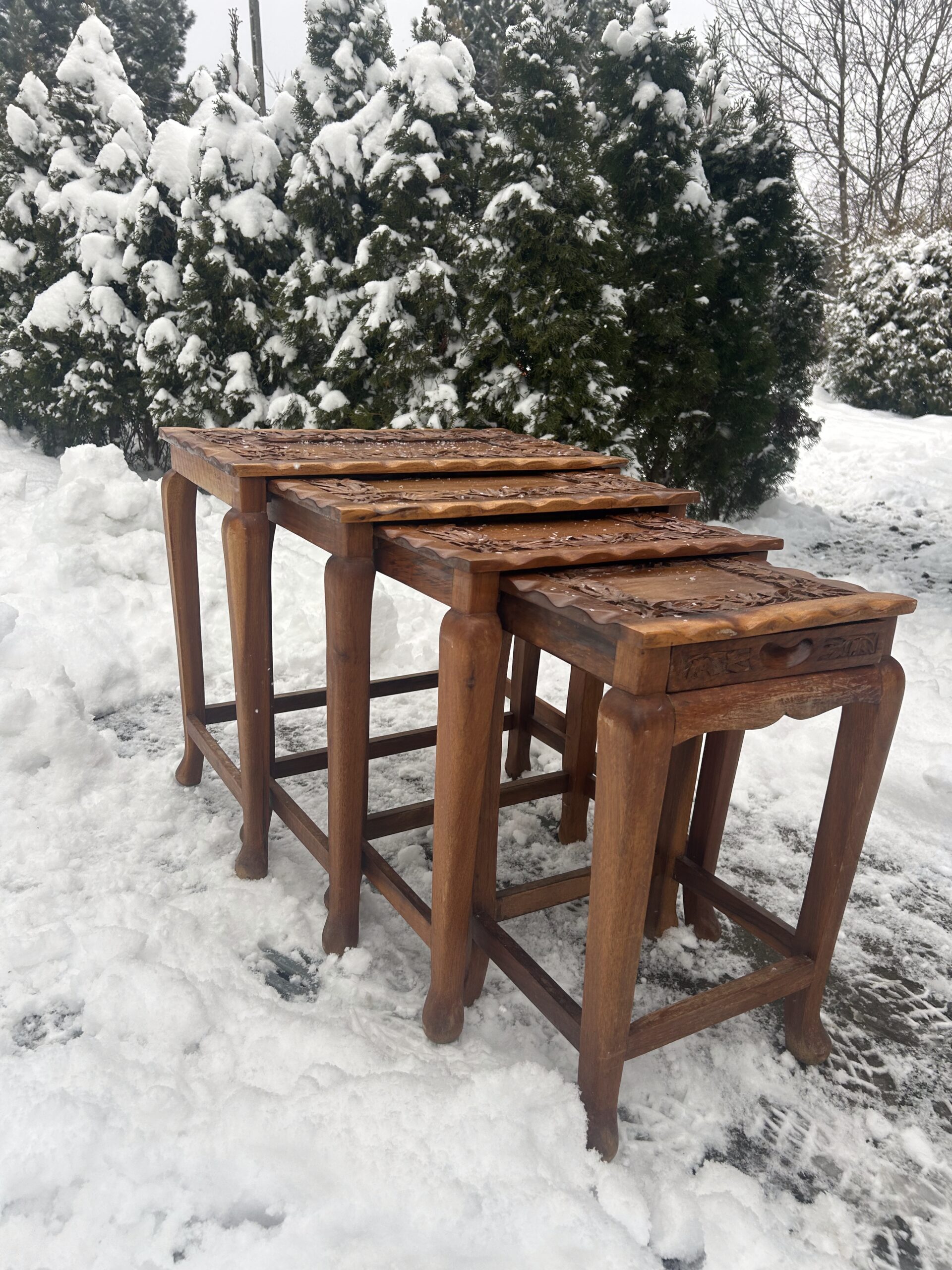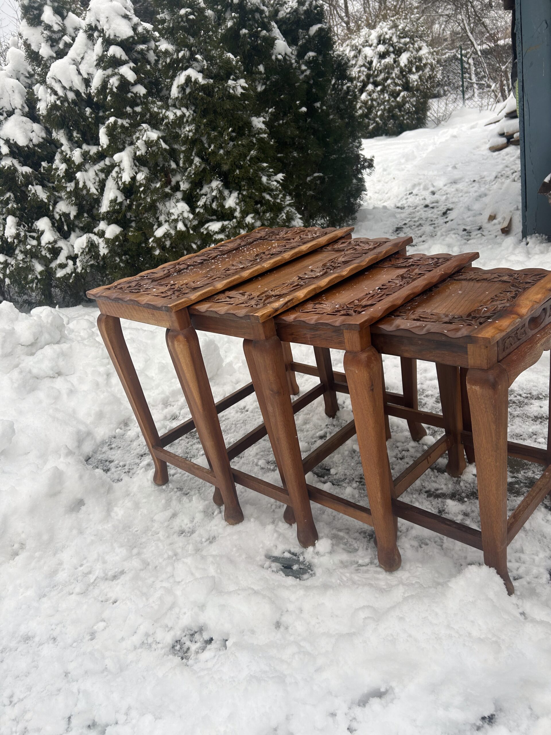 Zestaw 4 Rzeźbionych Stoliczków – Praktyczne i Dekoracyjne
