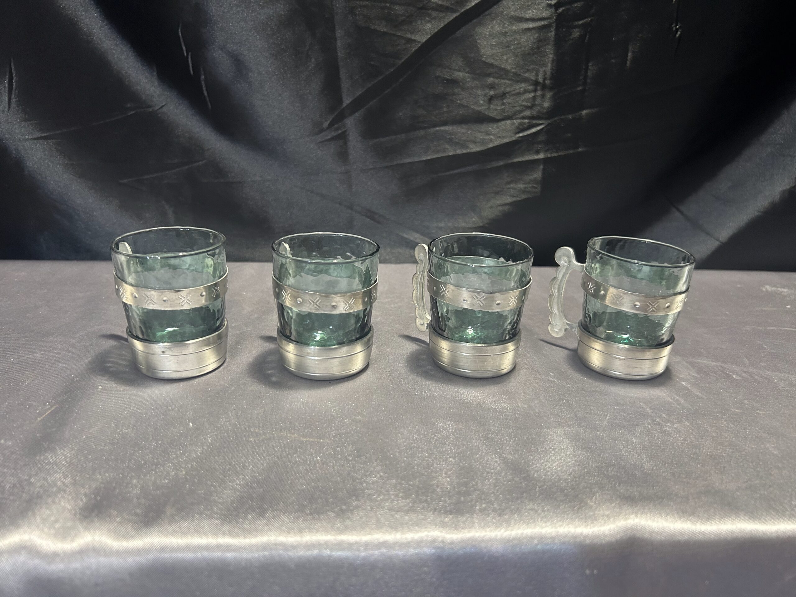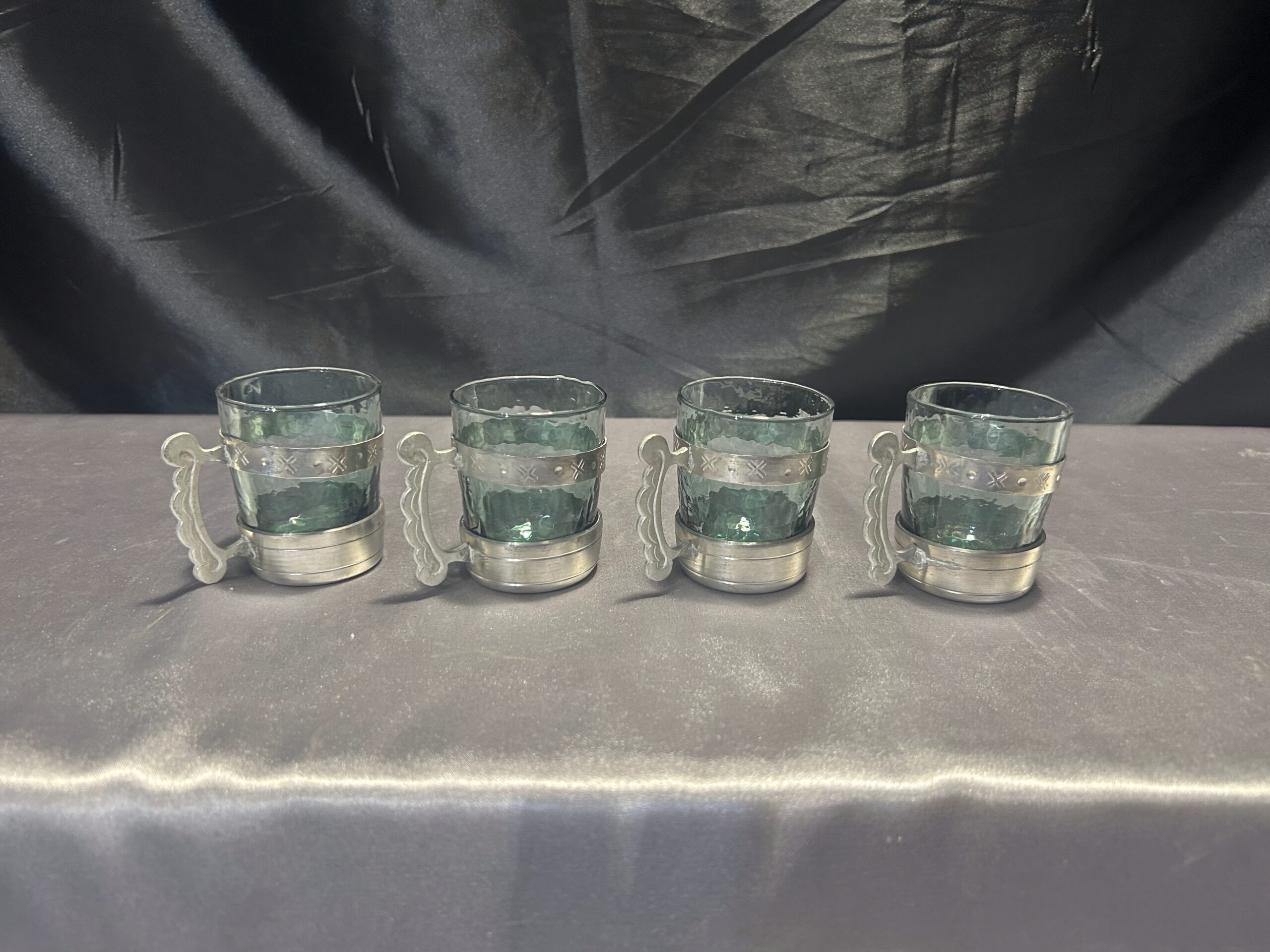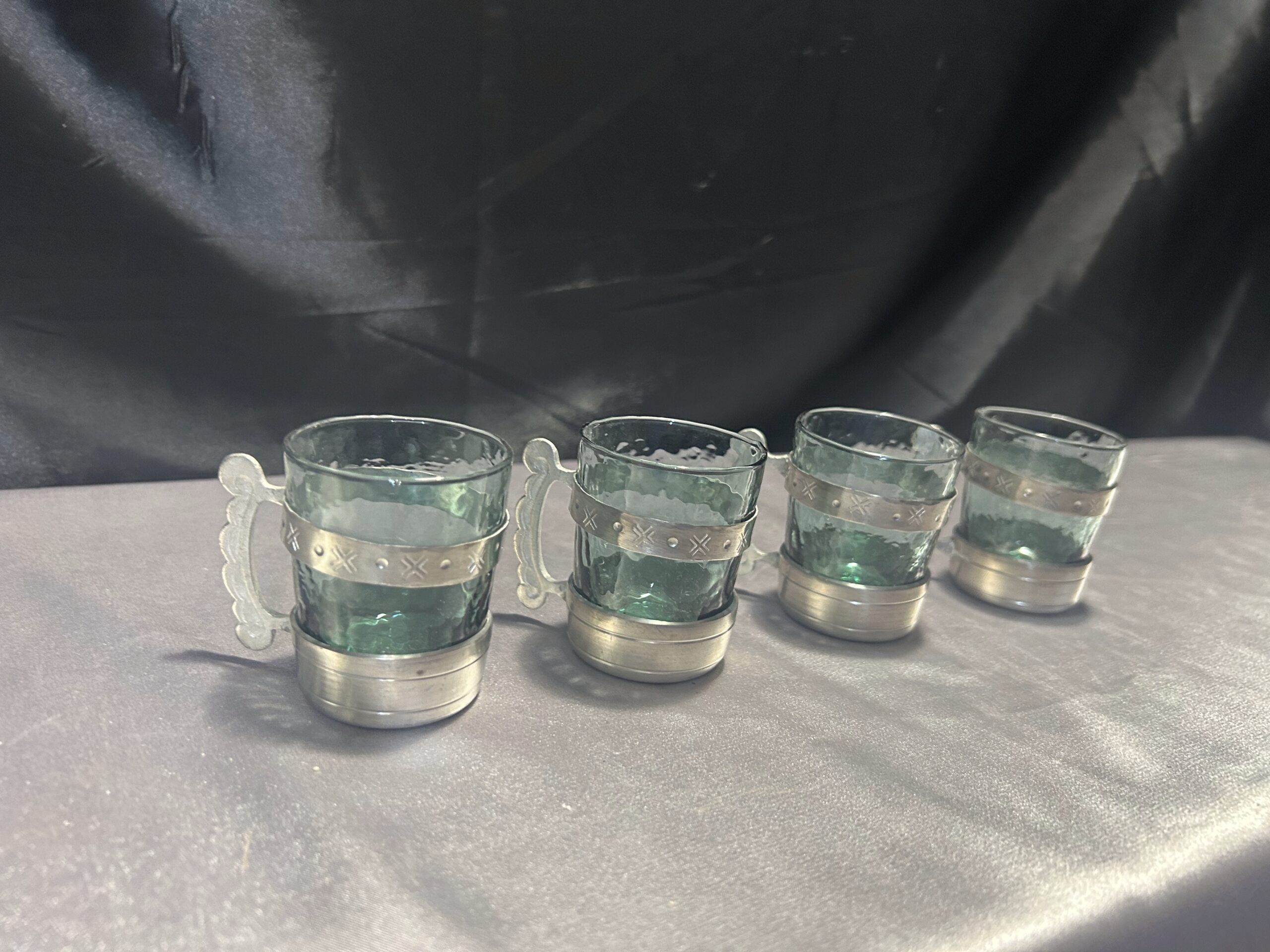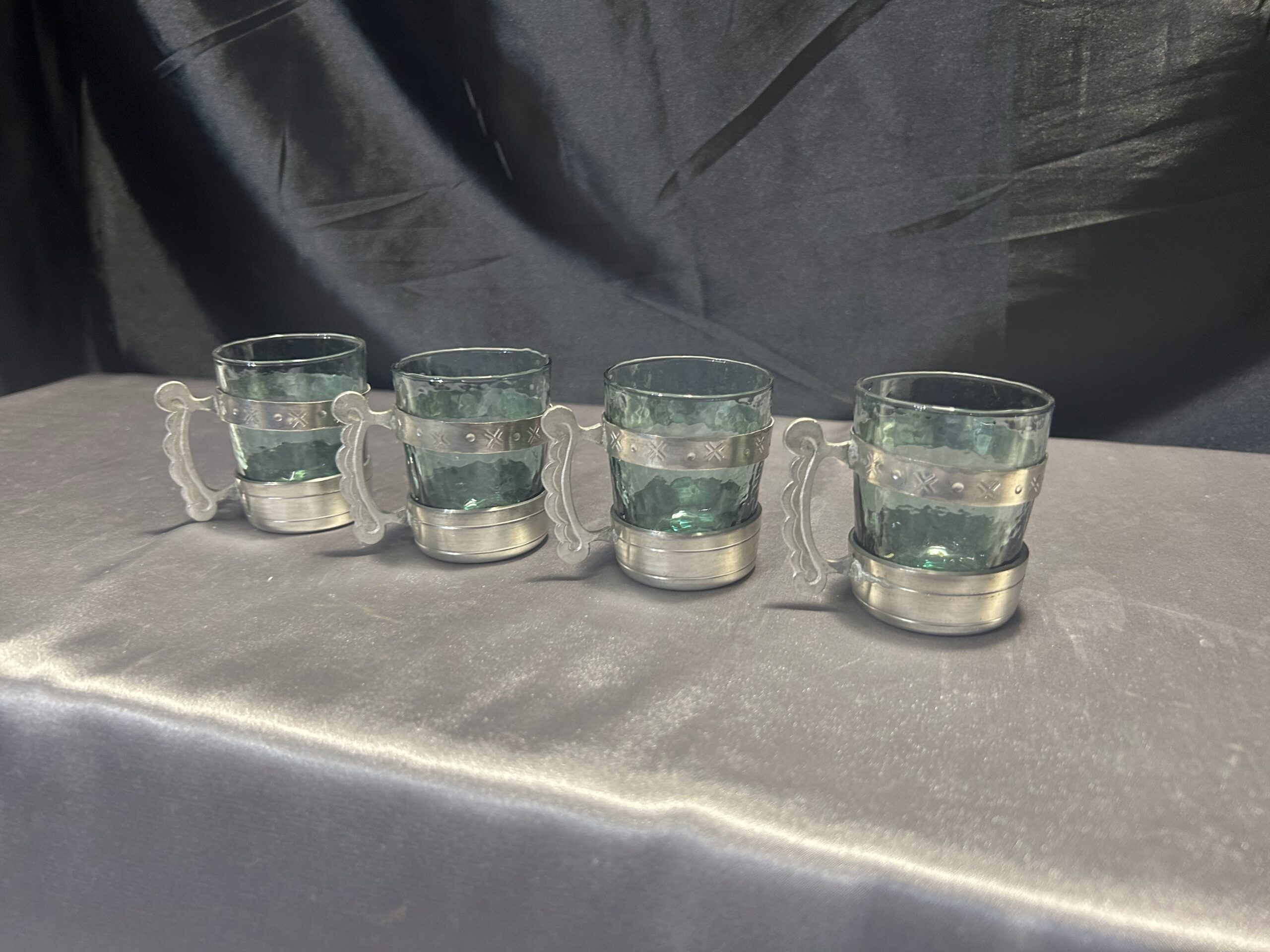 Zestaw 4 Szklaneczek w Cynowym Stelażu z Uchem
