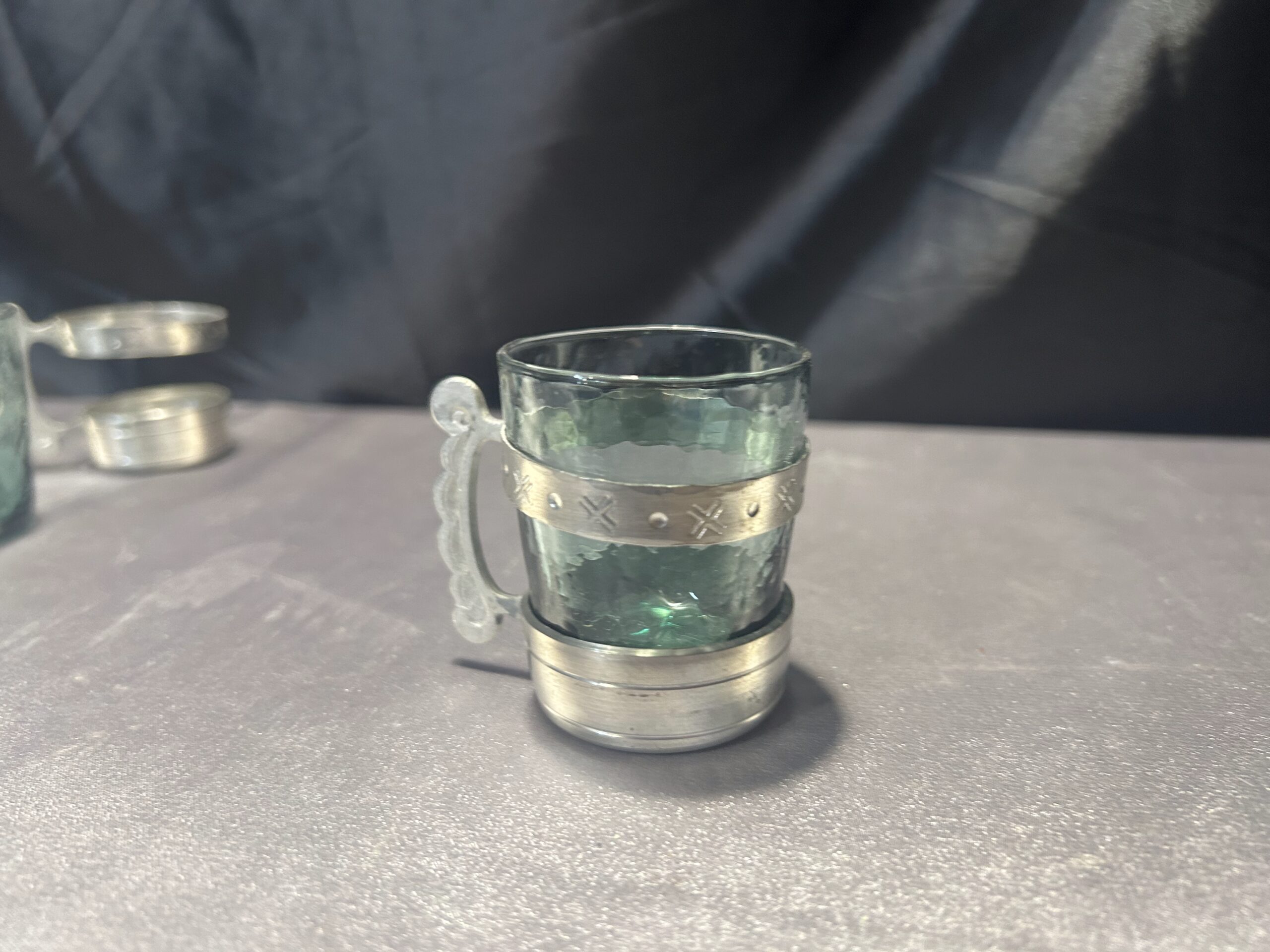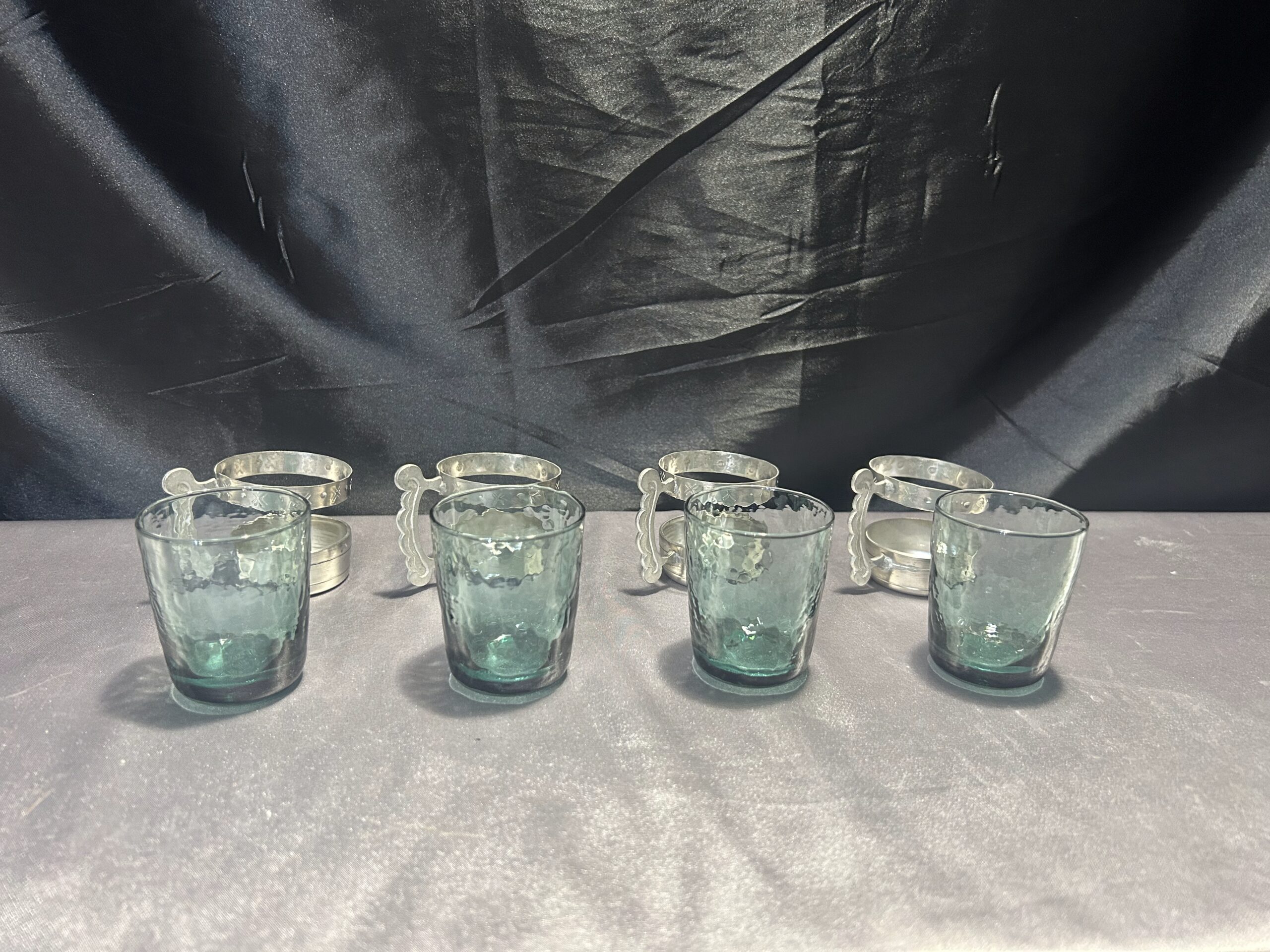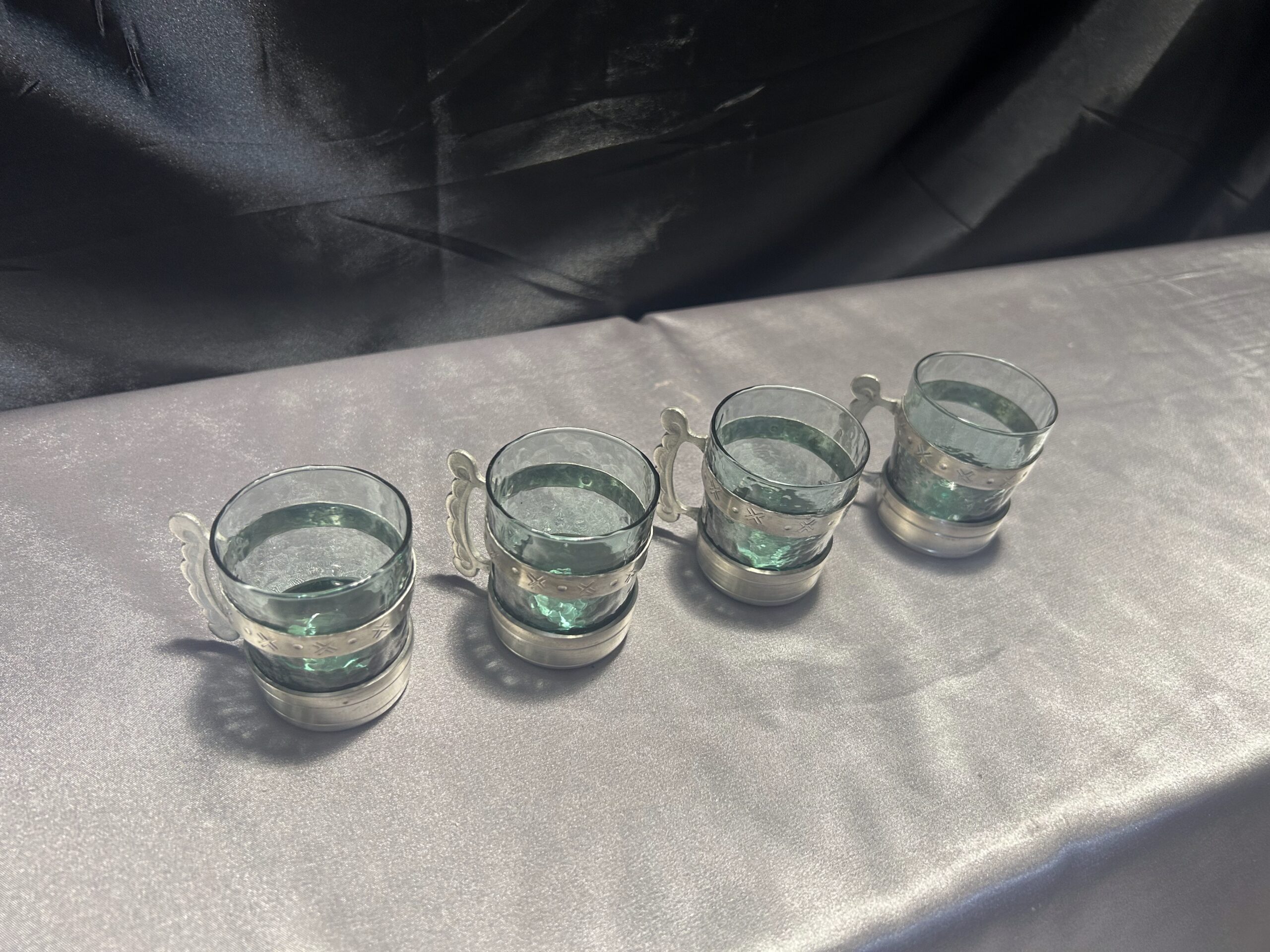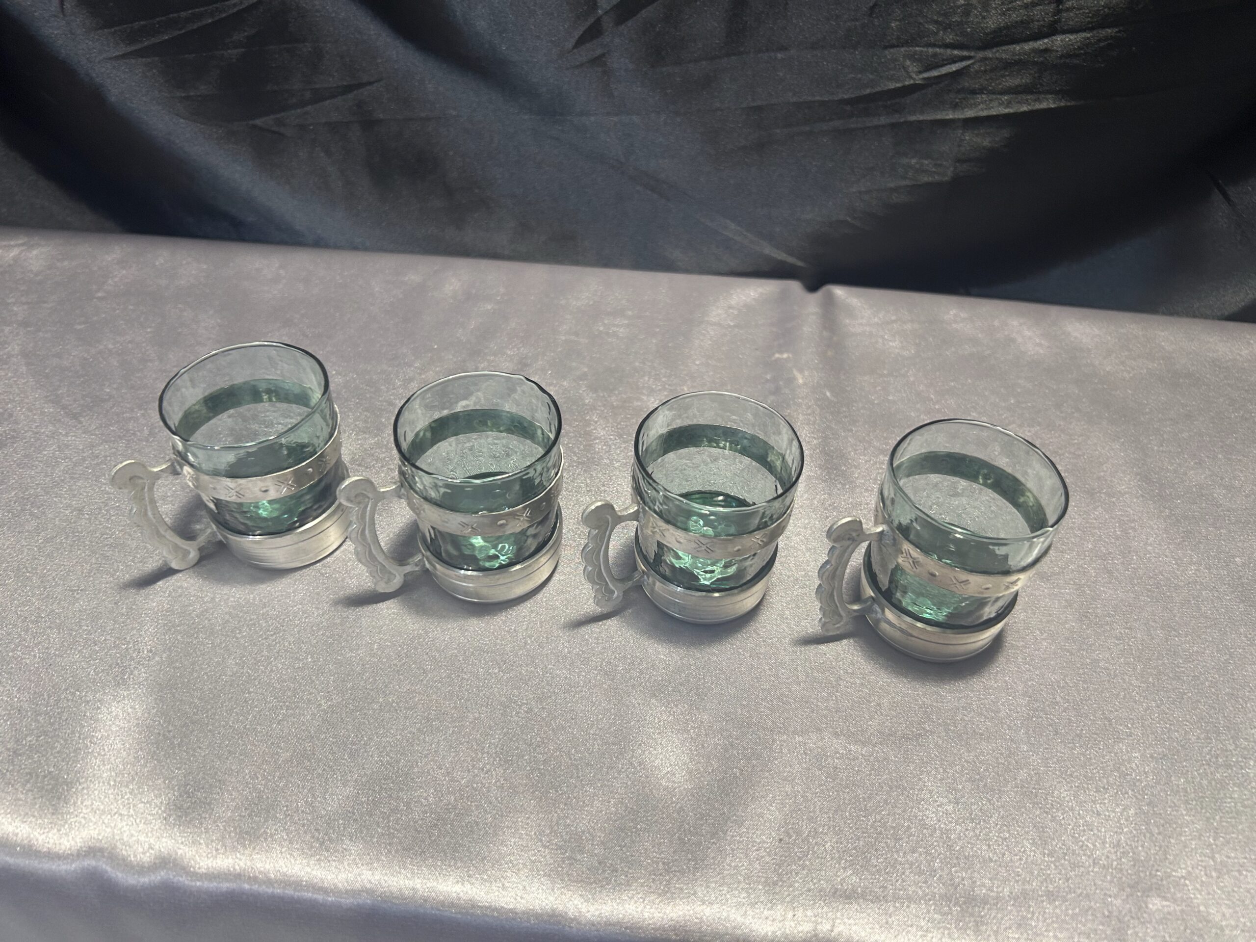 Elegancki zestaw 4 szklaneczek wykonanych z zielonkawego szkła, osadzonych w ozdobnym cynowym stelażu z wygodnym uchem do trzymania. Pięknie zdobione, idealne jako element dekoracyjny lub funkcjonalny dodatek do herbaty czy innych napojów.