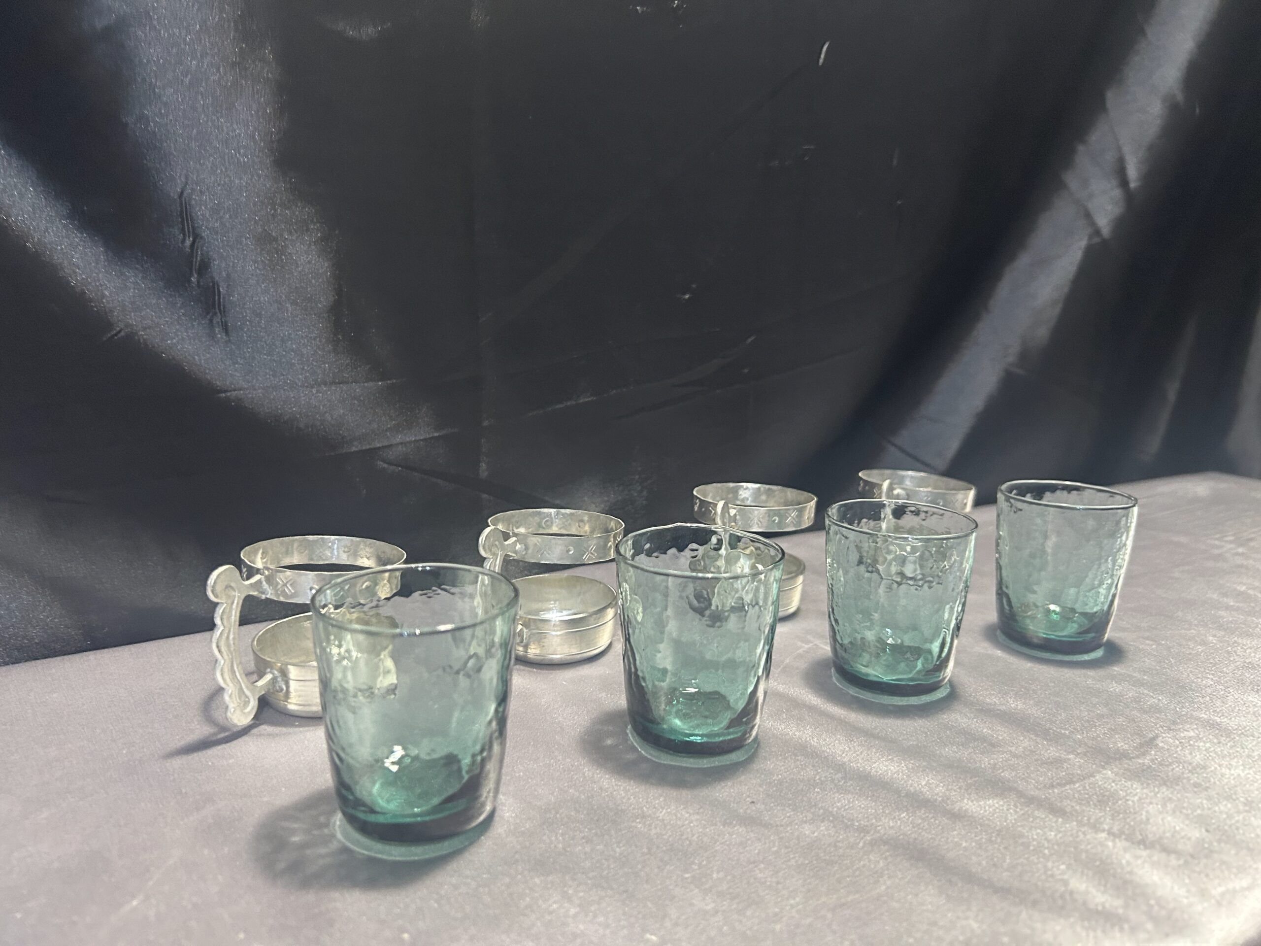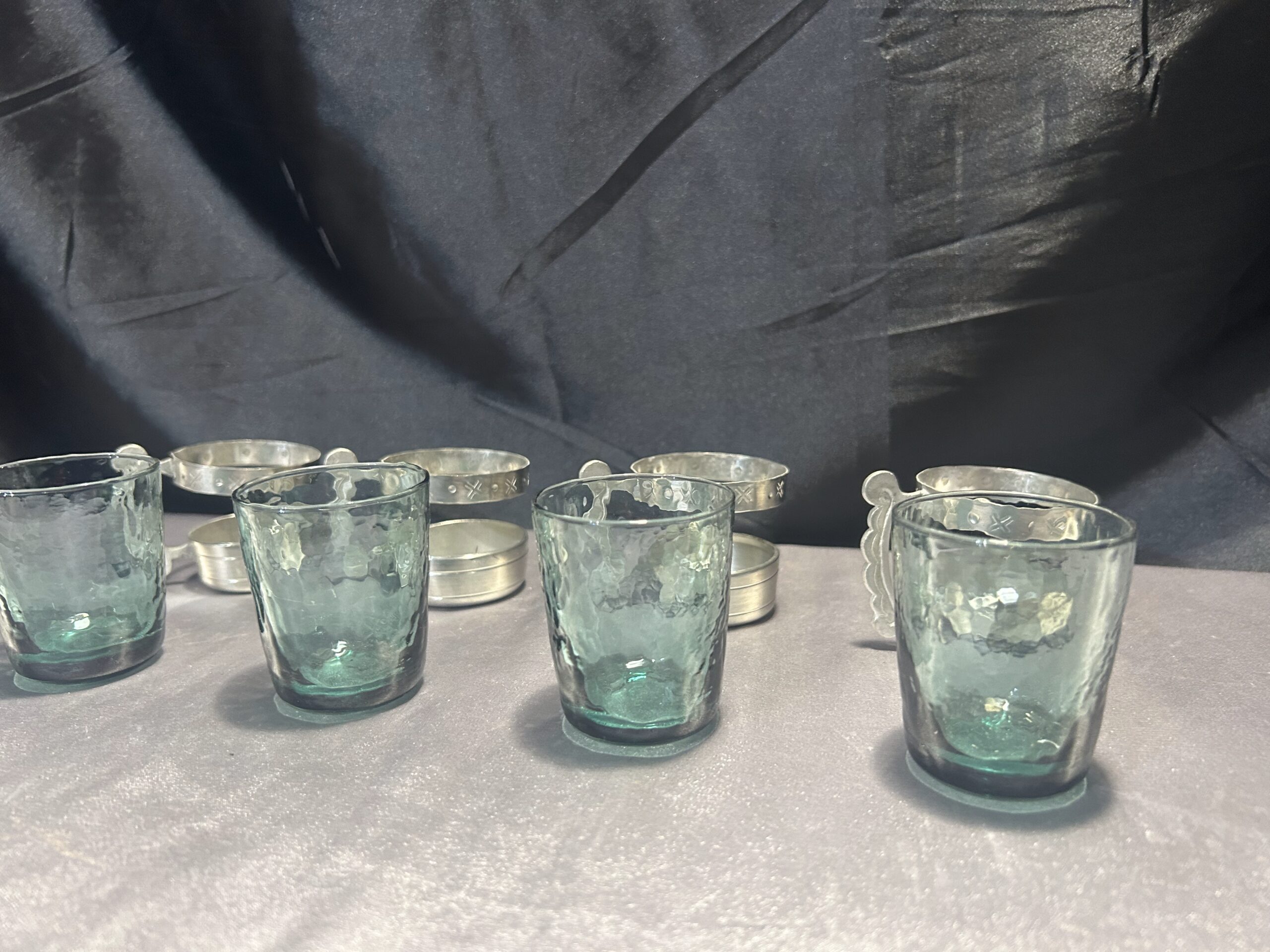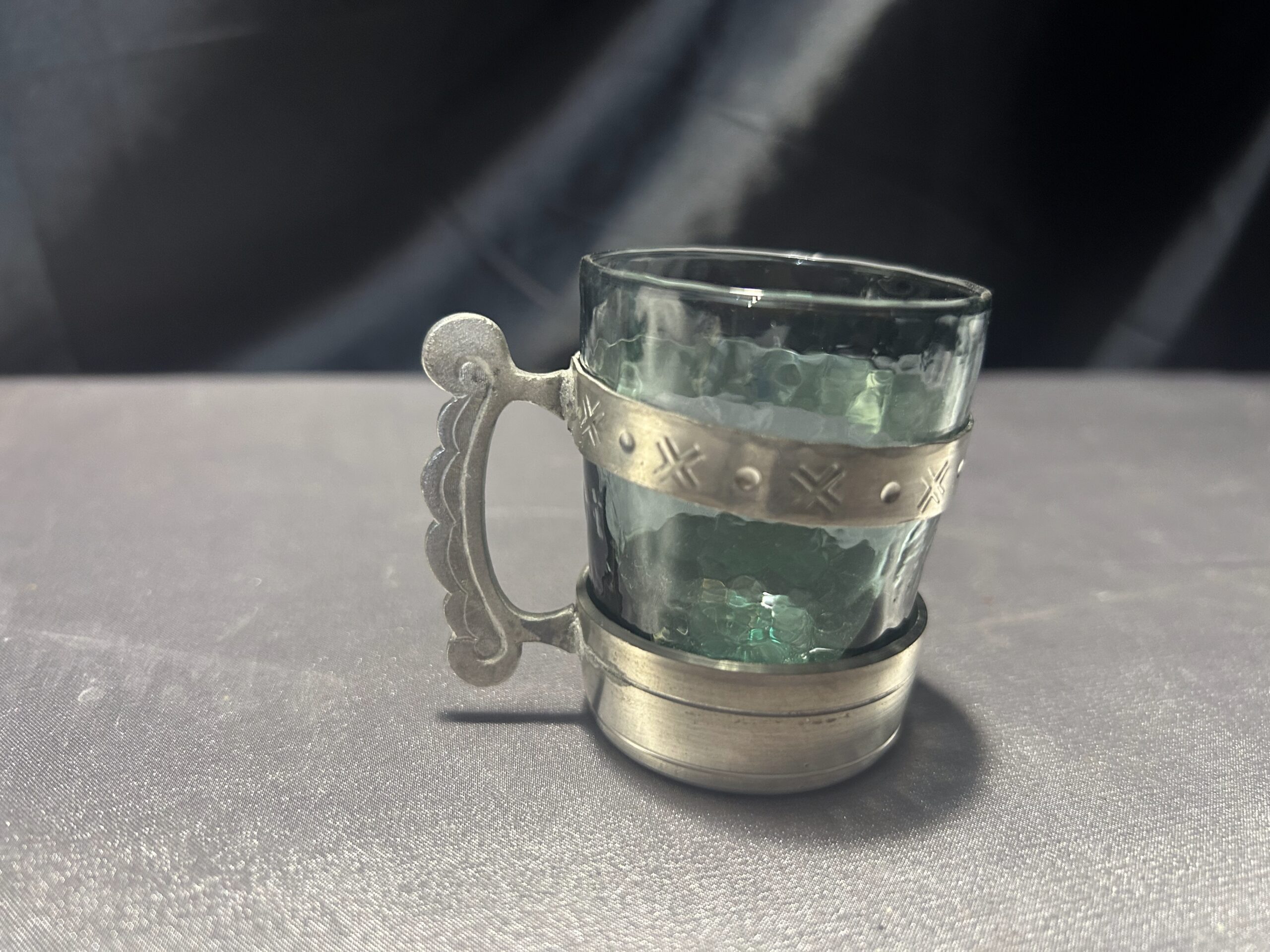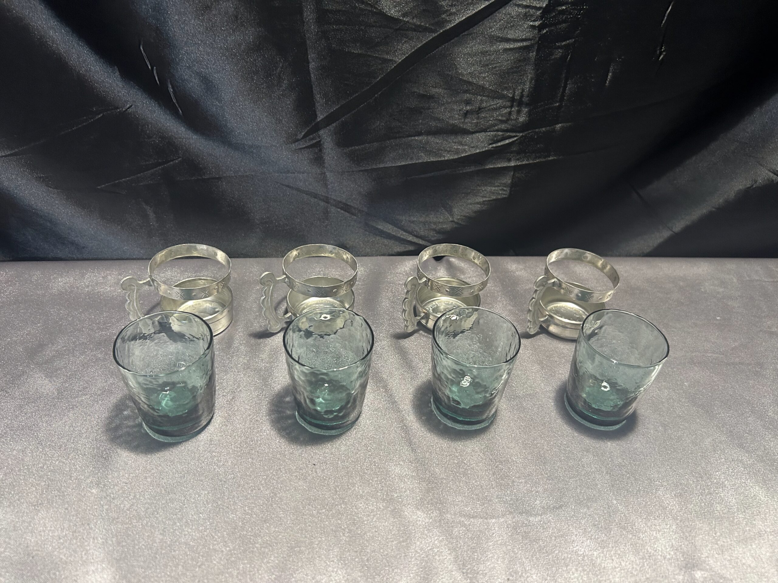 Elegancki zestaw 4 szklaneczek wykonanych z zielonkawego szkła, osadzonych w ozdobnym cynowym stelażu z wygodnym uchem do trzymania. Pięknie zdobione, idealne jako element dekoracyjny lub funkcjonalny dodatek do herbaty czy innych napojów.