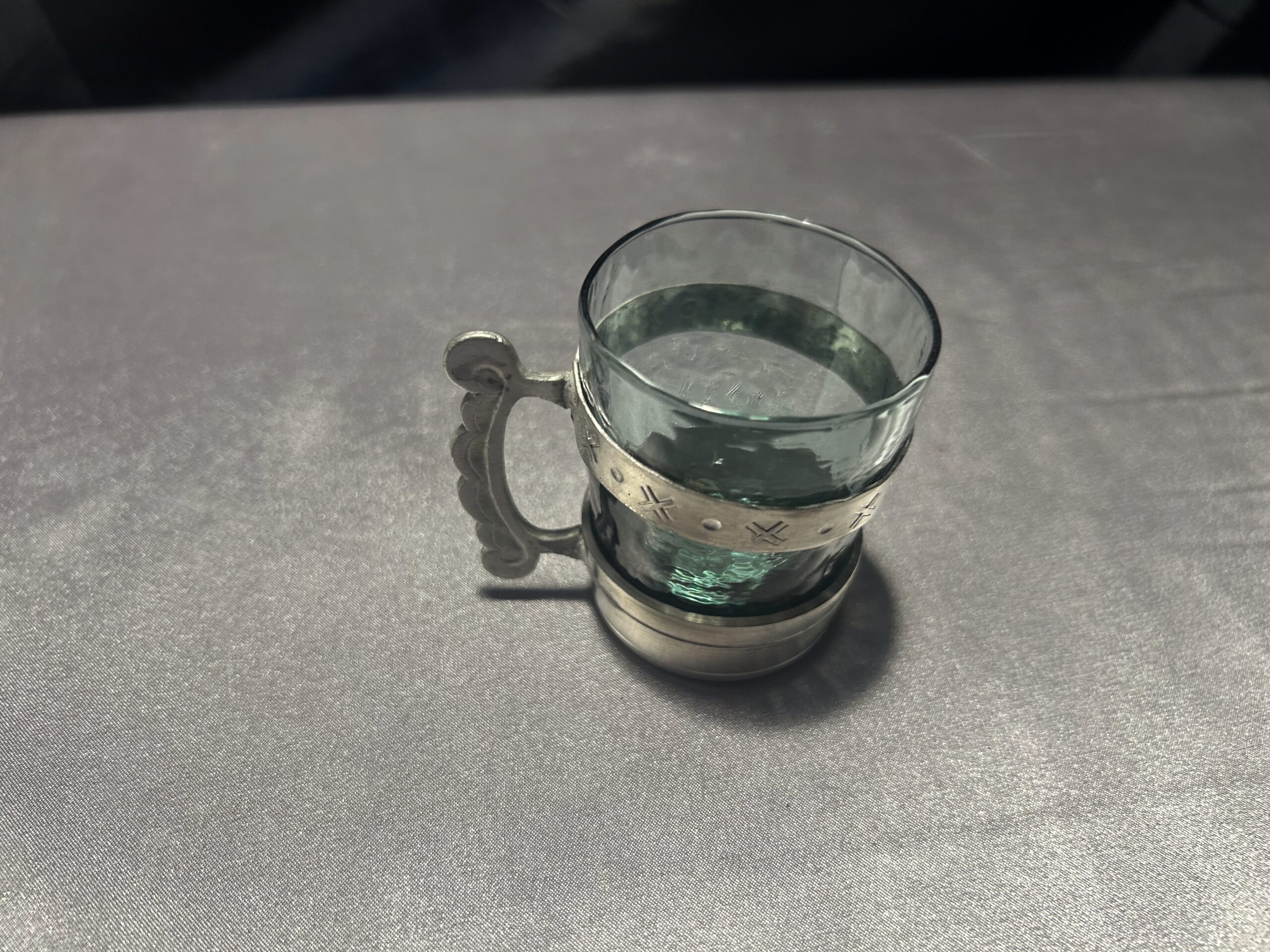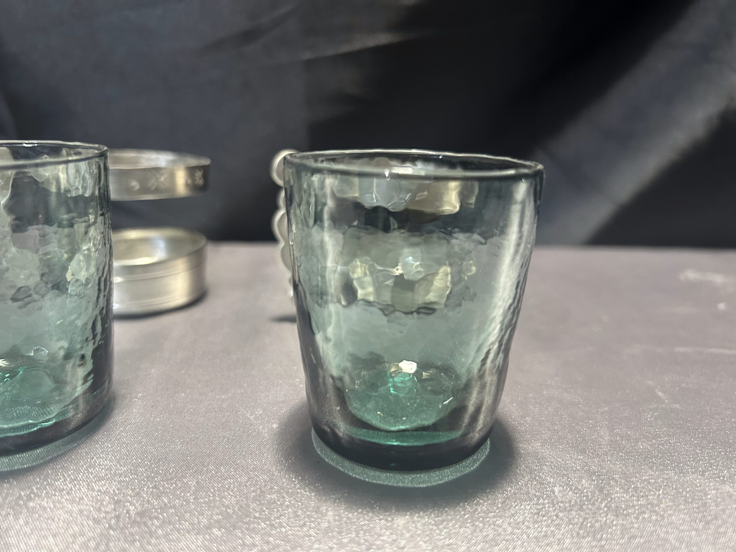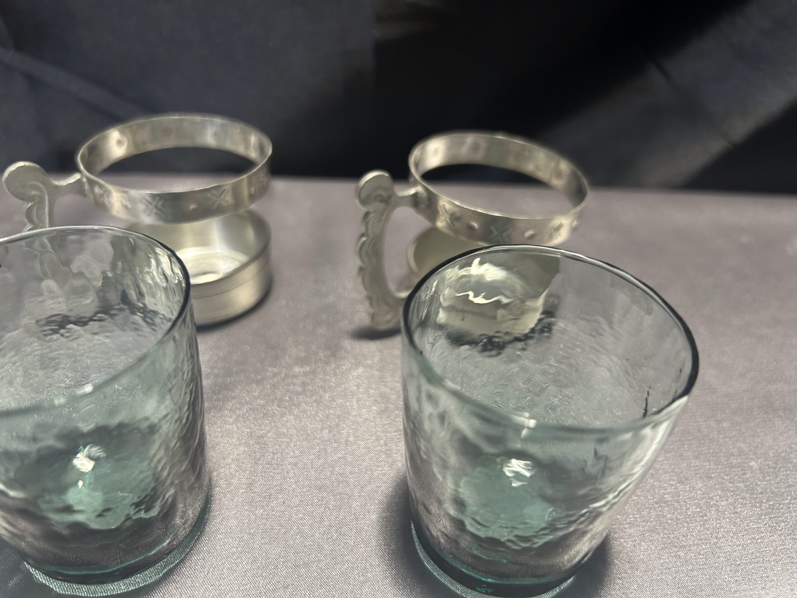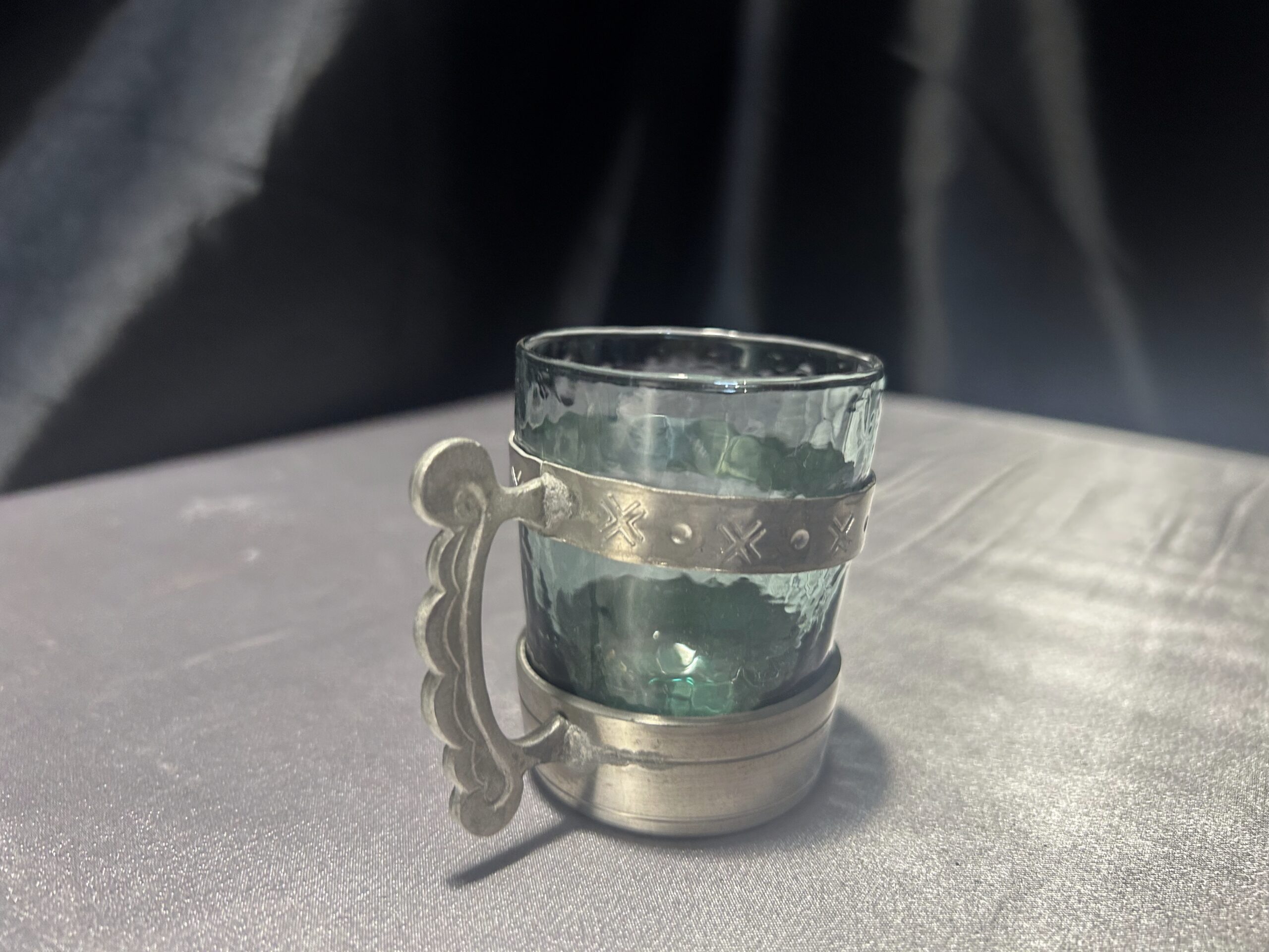 Elegancki zestaw 4 szklaneczek wykonanych z zielonkawego szkła, osadzonych w ozdobnym cynowym stelażu z wygodnym uchem do trzymania. Pięknie zdobione, idealne jako element dekoracyjny lub funkcjonalny dodatek do herbaty czy innych napojów.