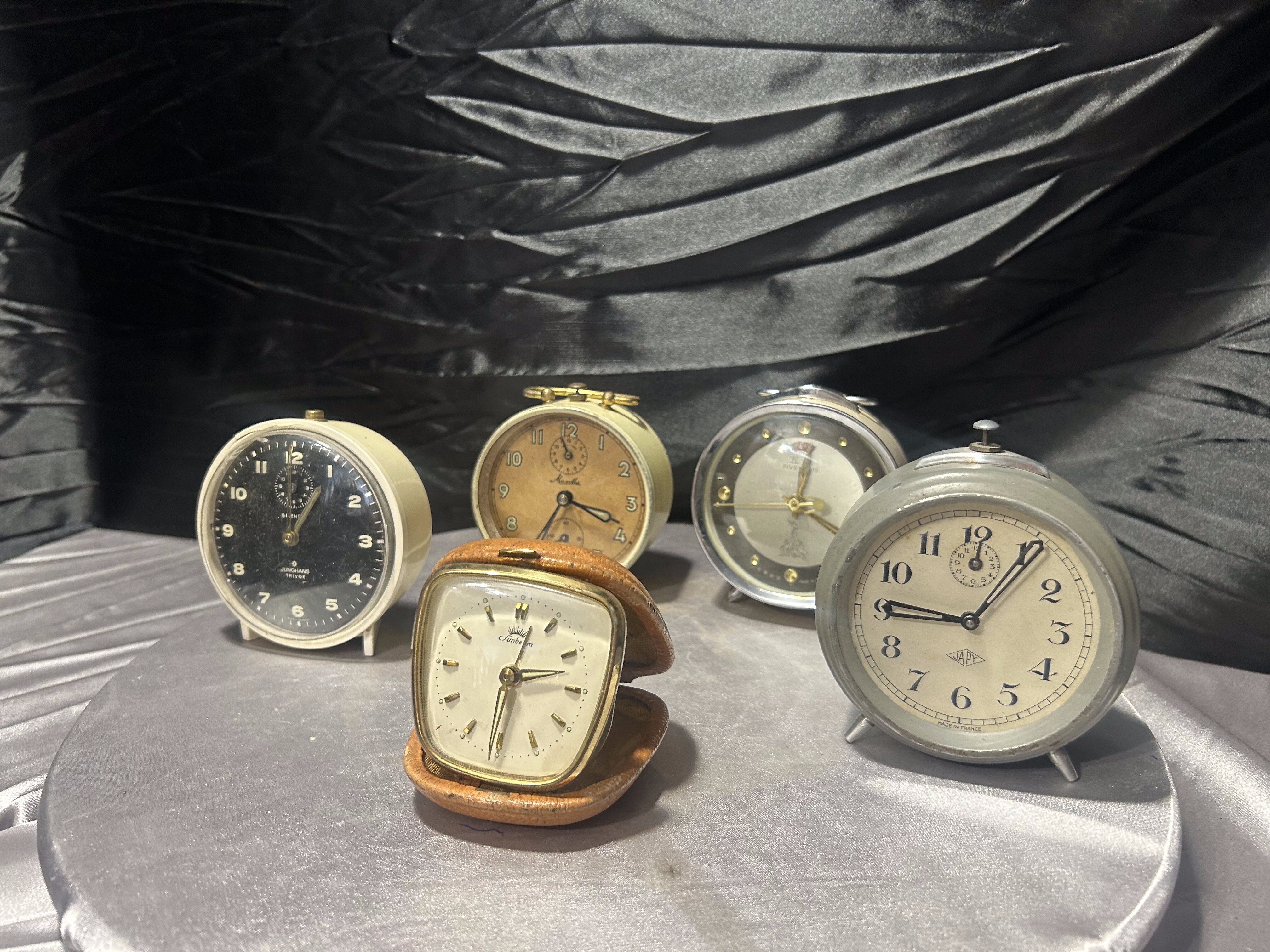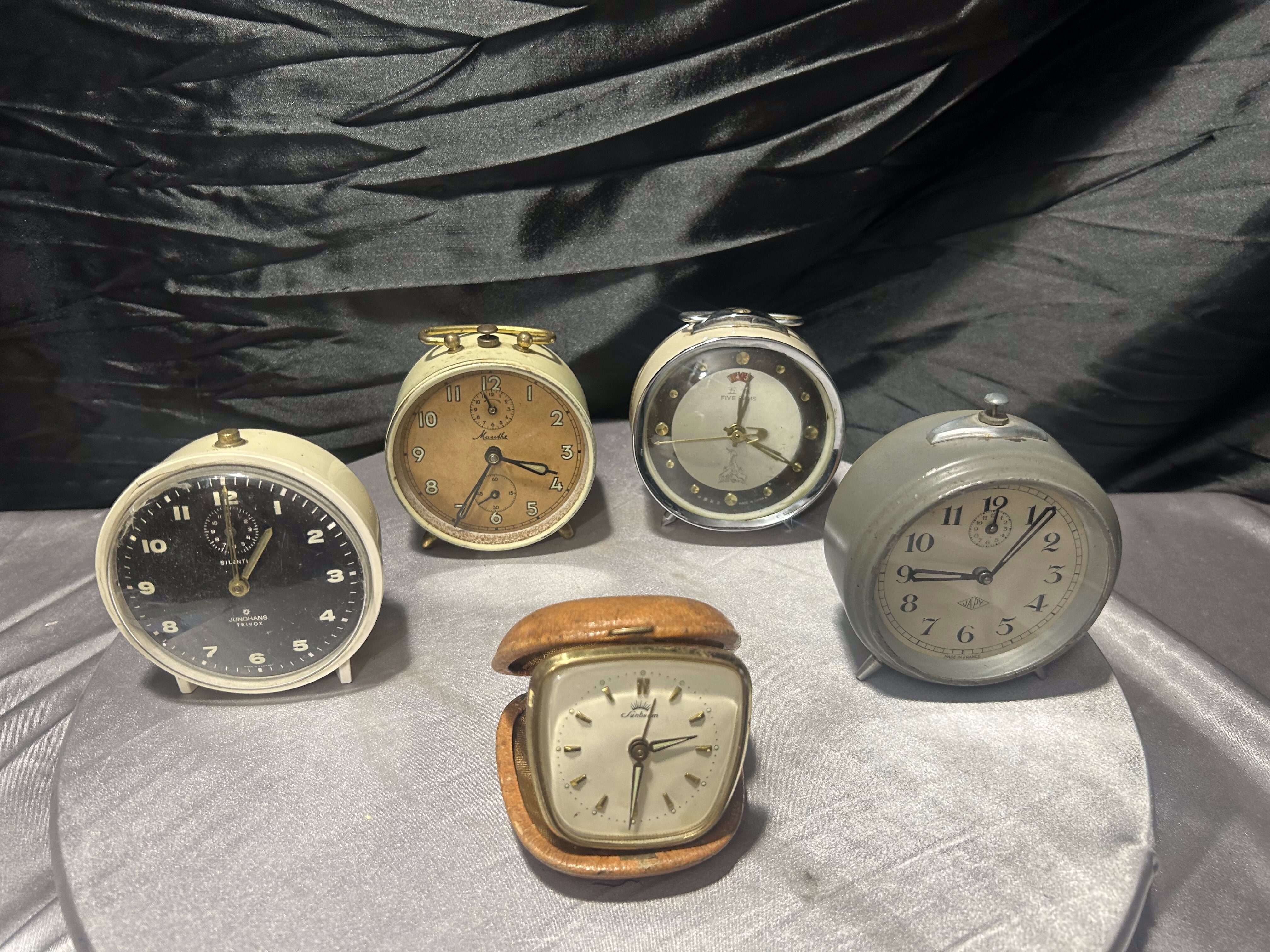 Zestaw 5 budzików vintage – Junghans Trivox, Monthe, Five Gams, Japy, Sunberm – kolekcjonerskie zegary