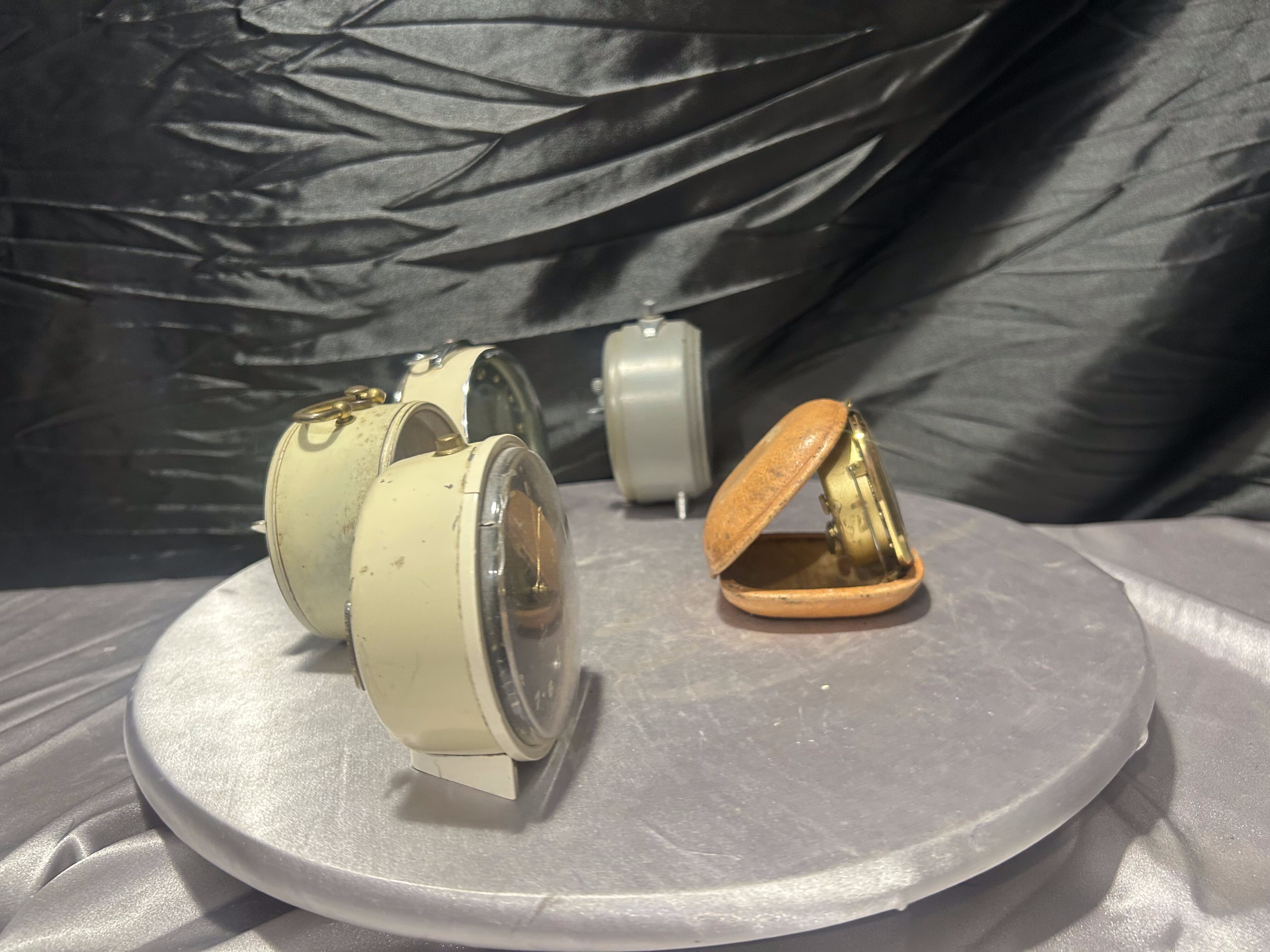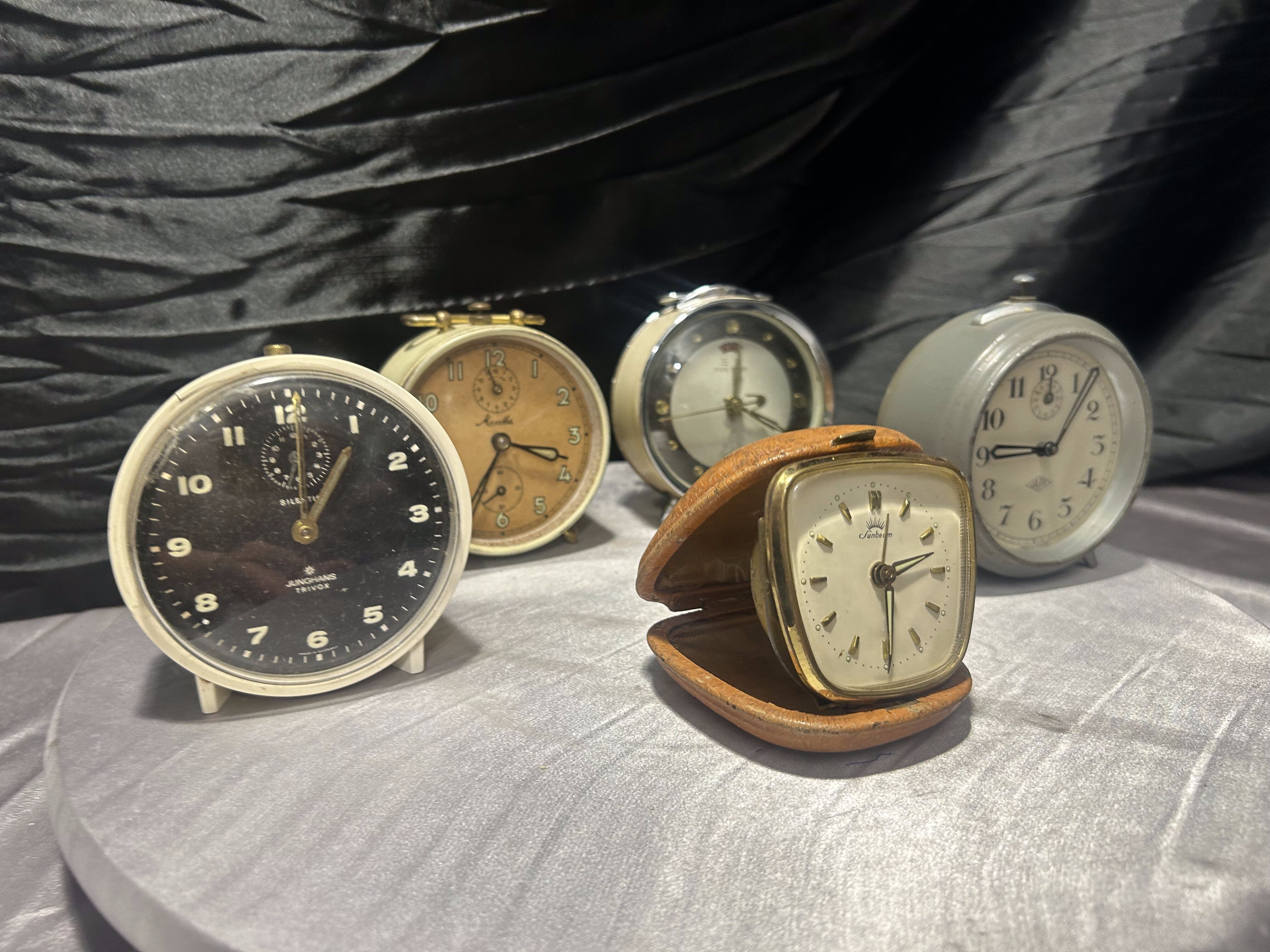 Zestaw pięciu klasycznych budzików mechanicznych pochodzących od znanych europejskich producentów zegarów. Każdy egzemplarz reprezentuje nieco inny styl wzornictwa charakterystyczny dla połowy XX wieku – od minimalistycznych form użytkowych po bardziej dekoracyjne modele z metalowymi obudowami i czytelnymi tarczami.