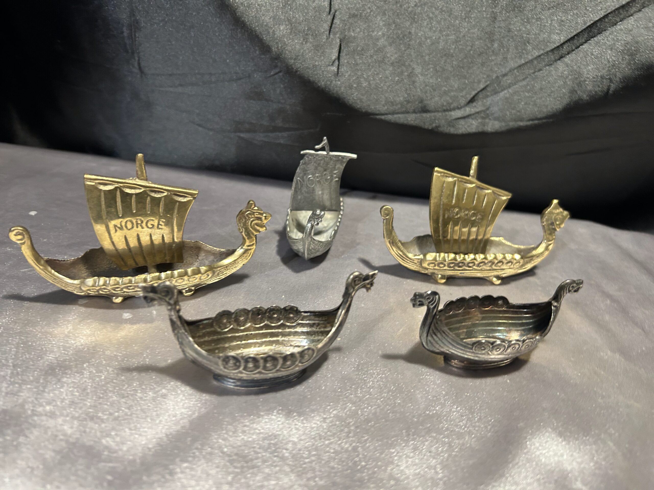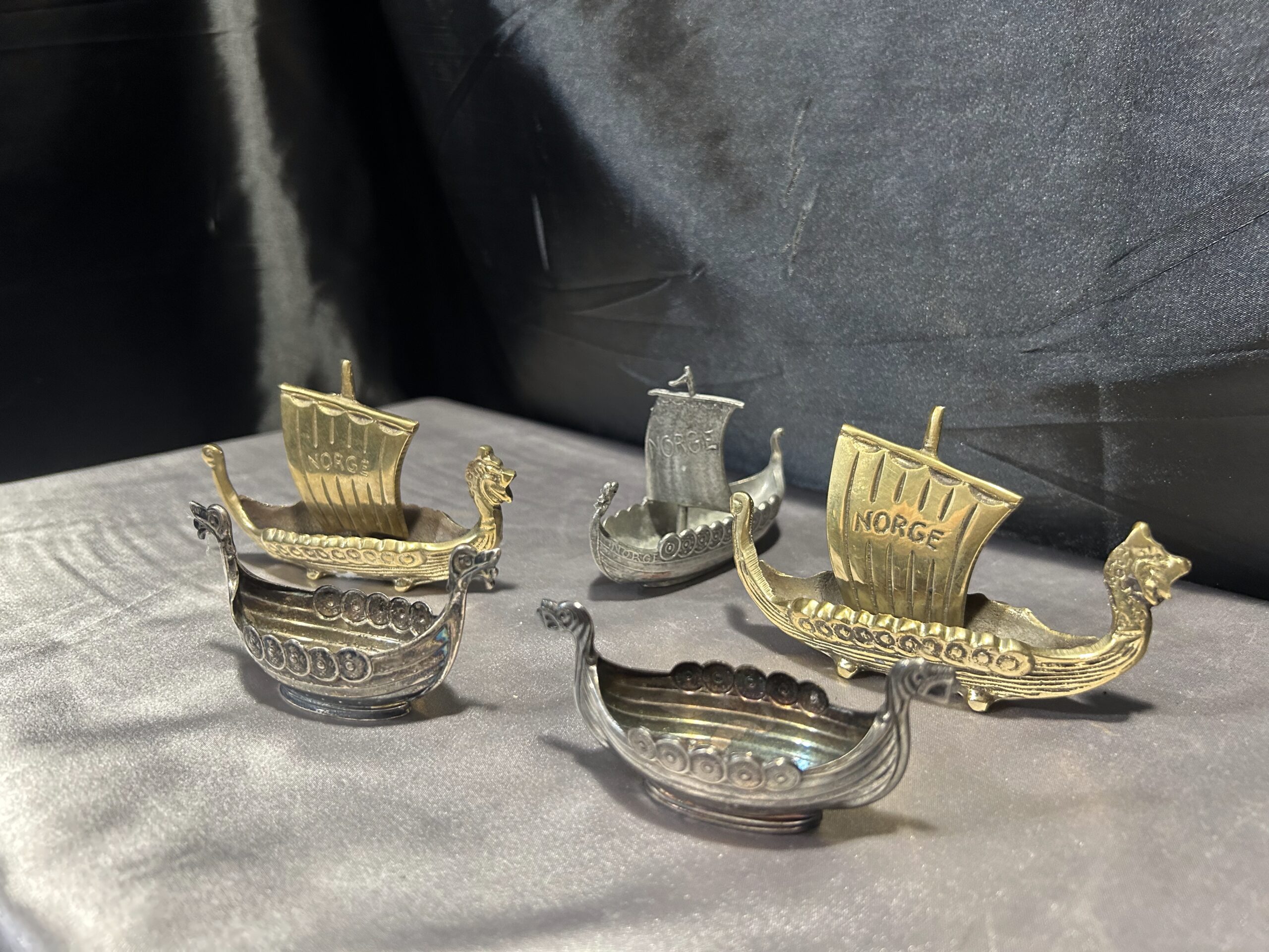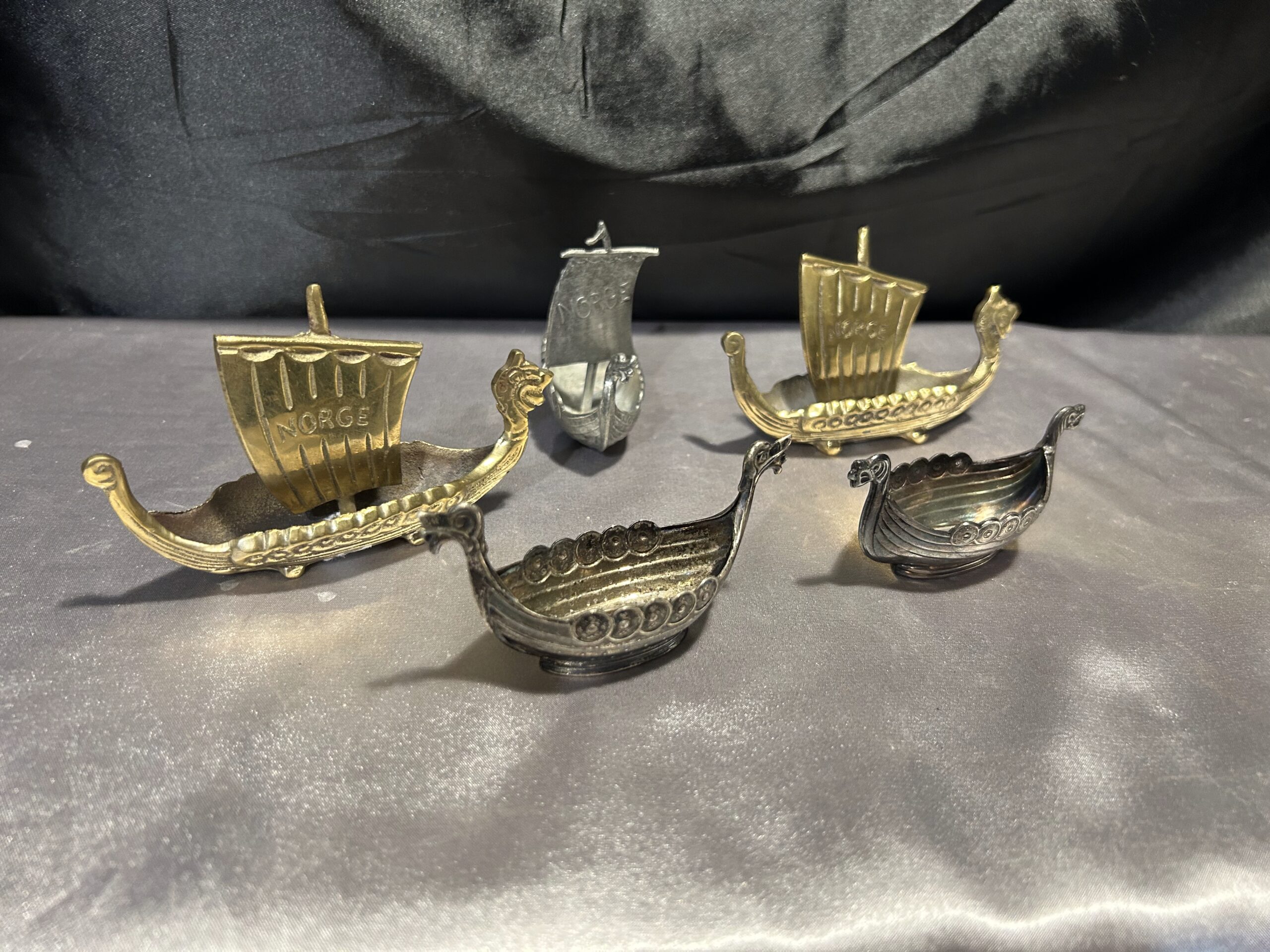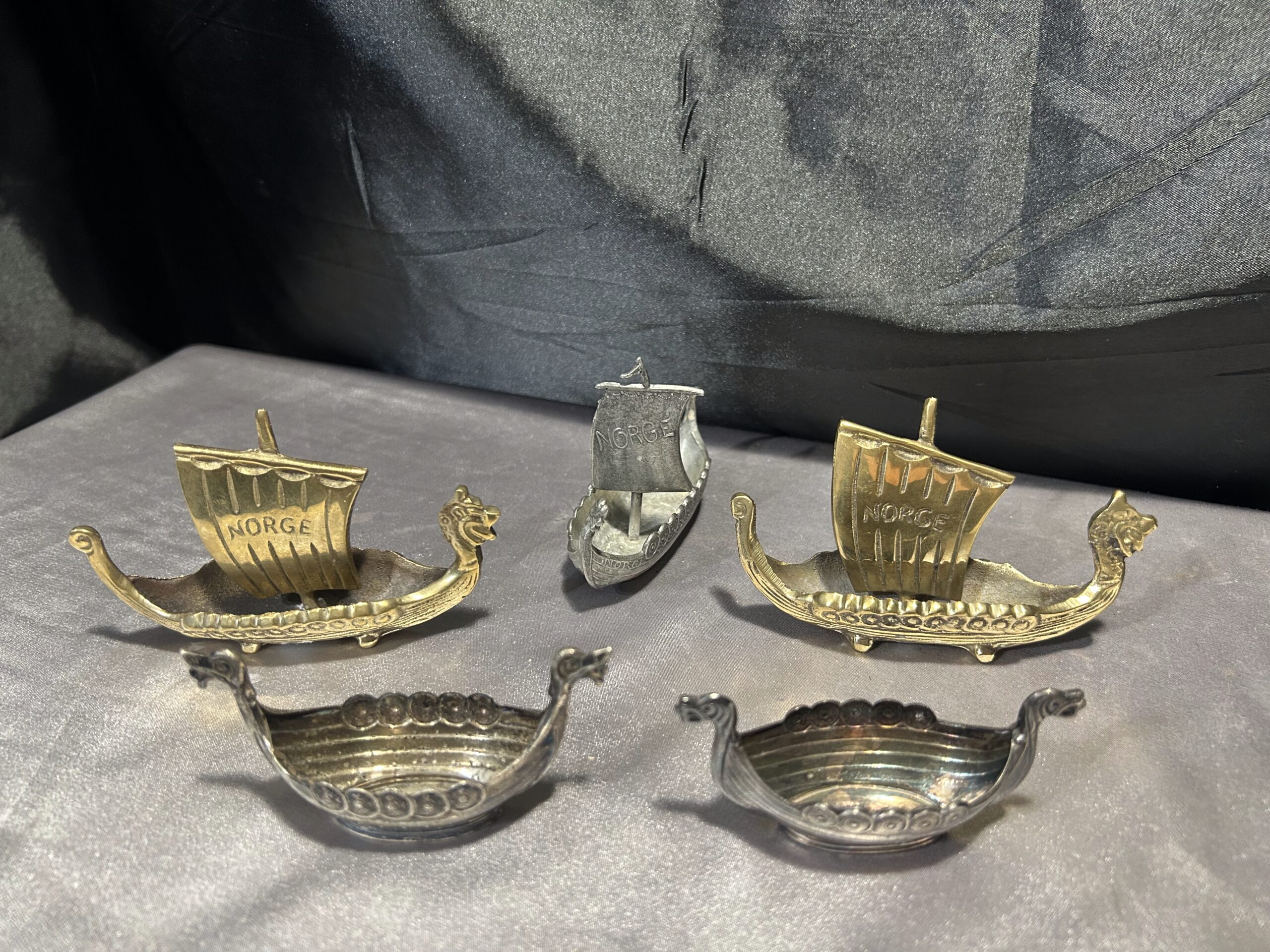 Zestaw 5 statków wikingów – mosiądz i cyna, z napisem NORGE