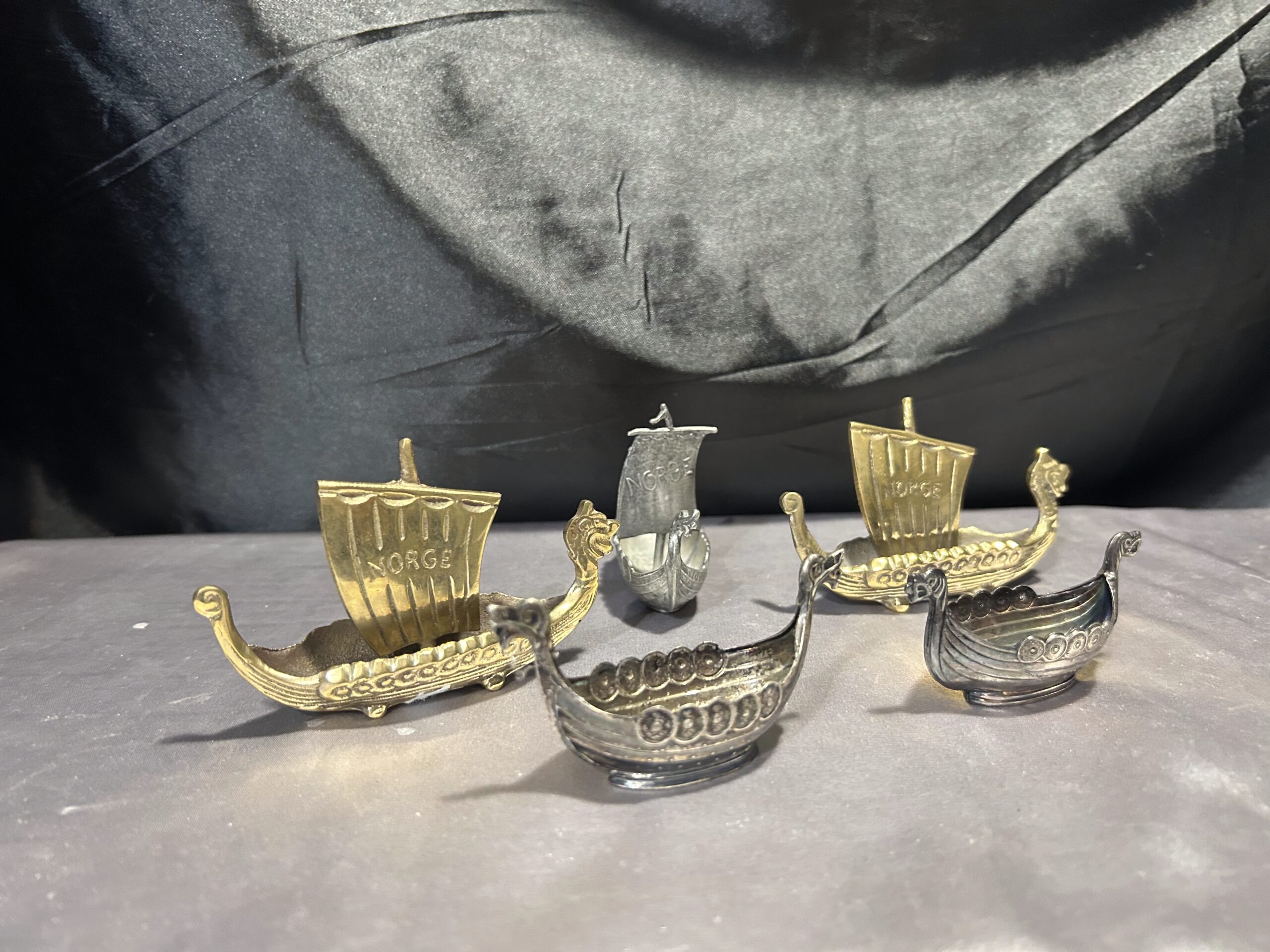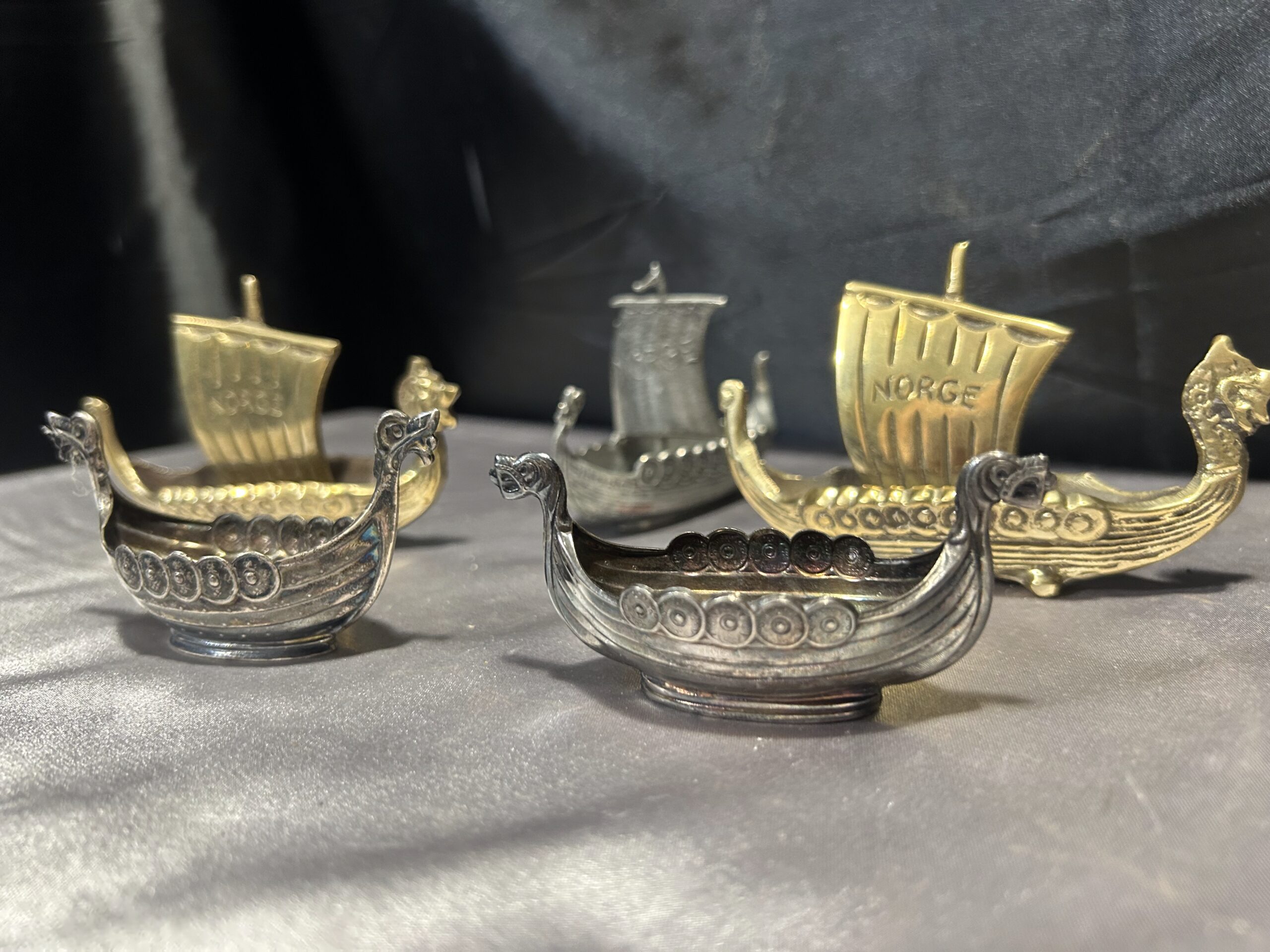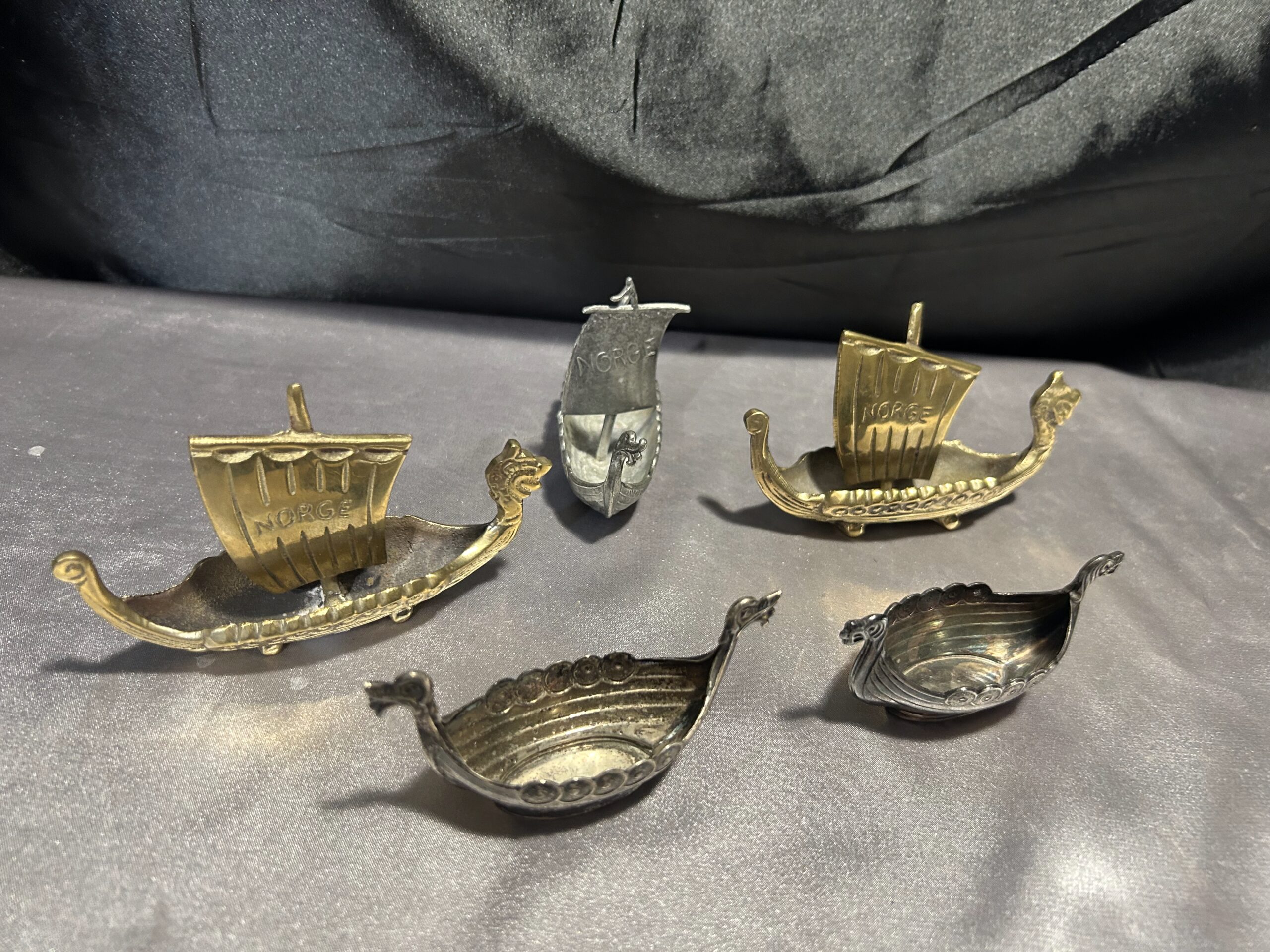 Zestaw 5 statków wikingów – mosiądz i cyna, z napisem NORGE